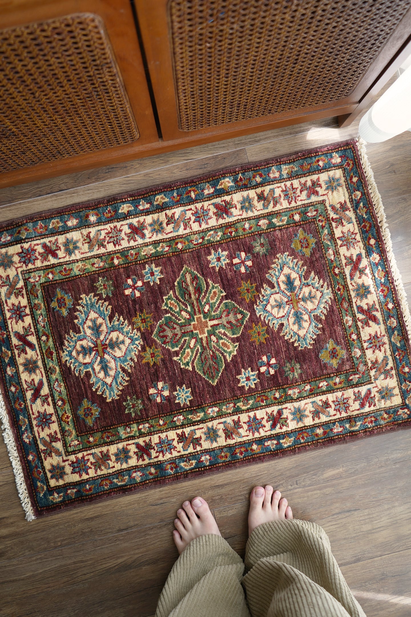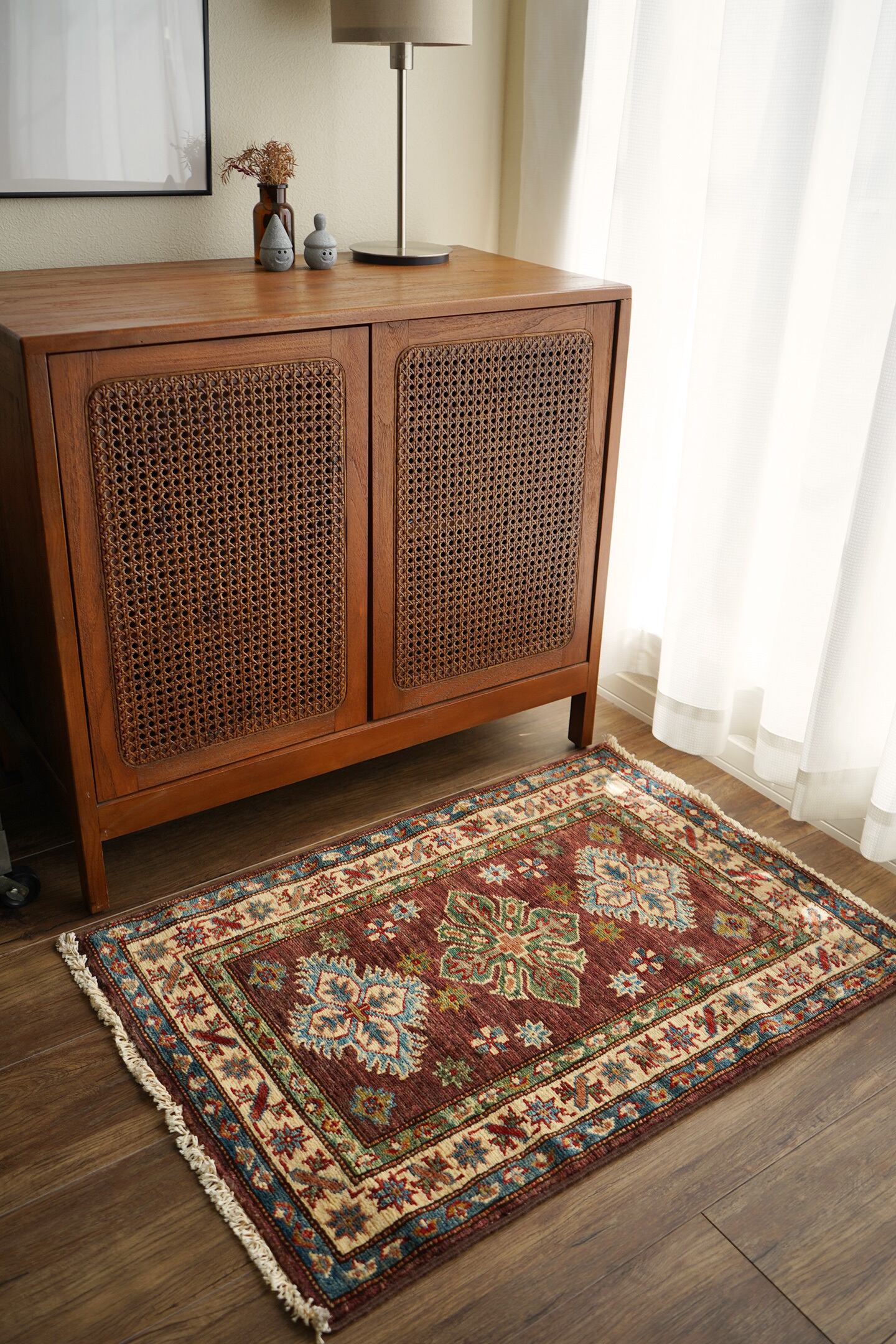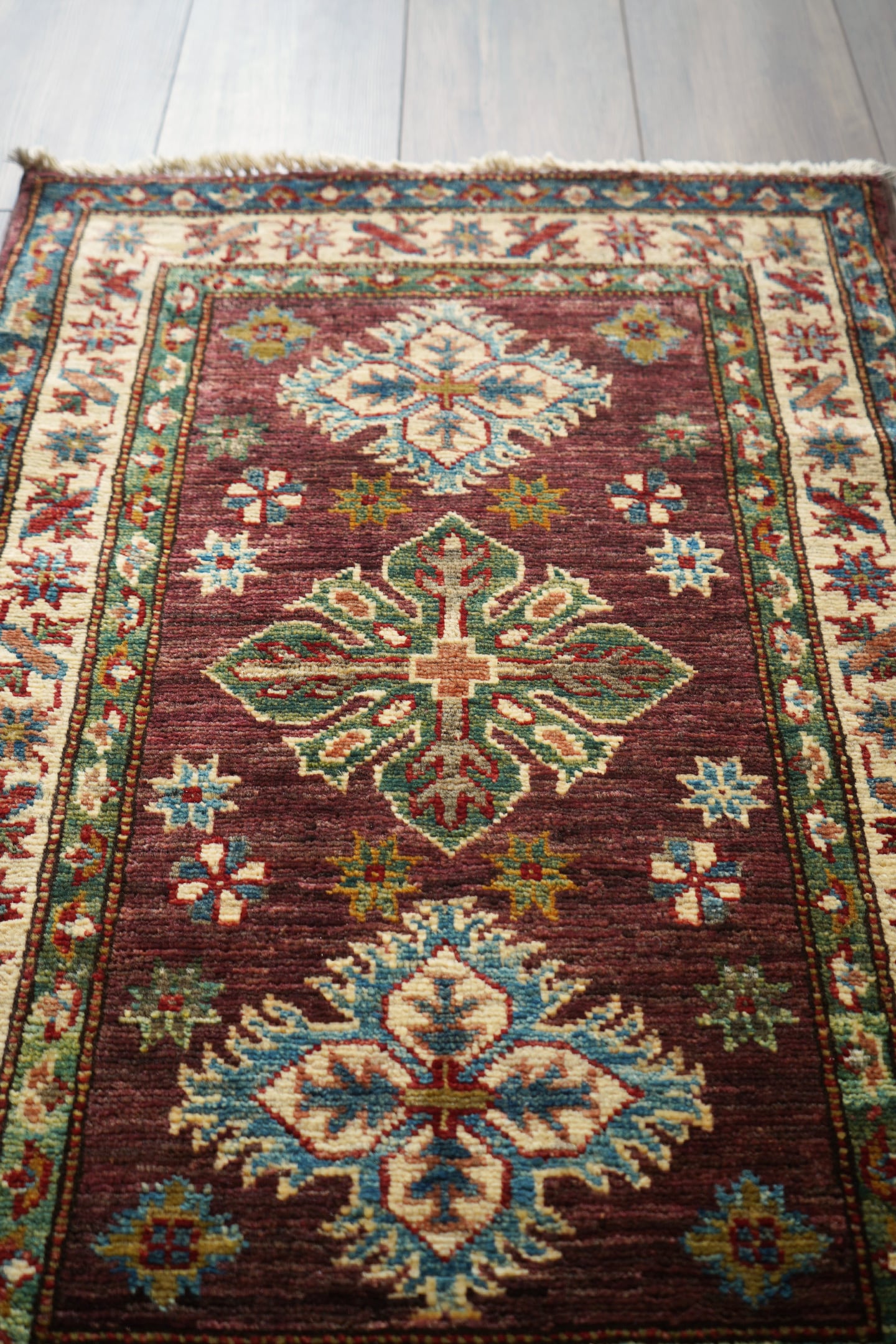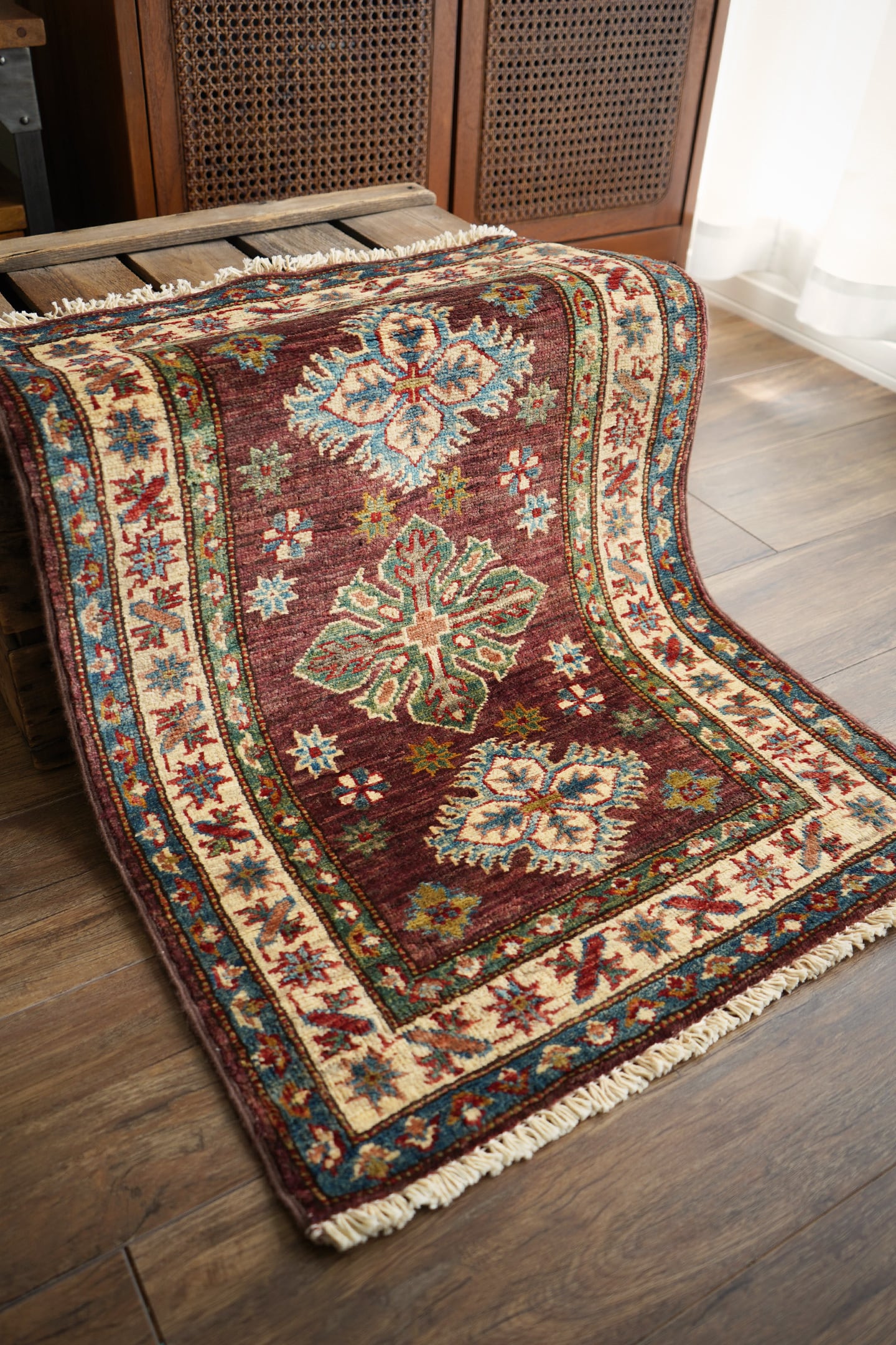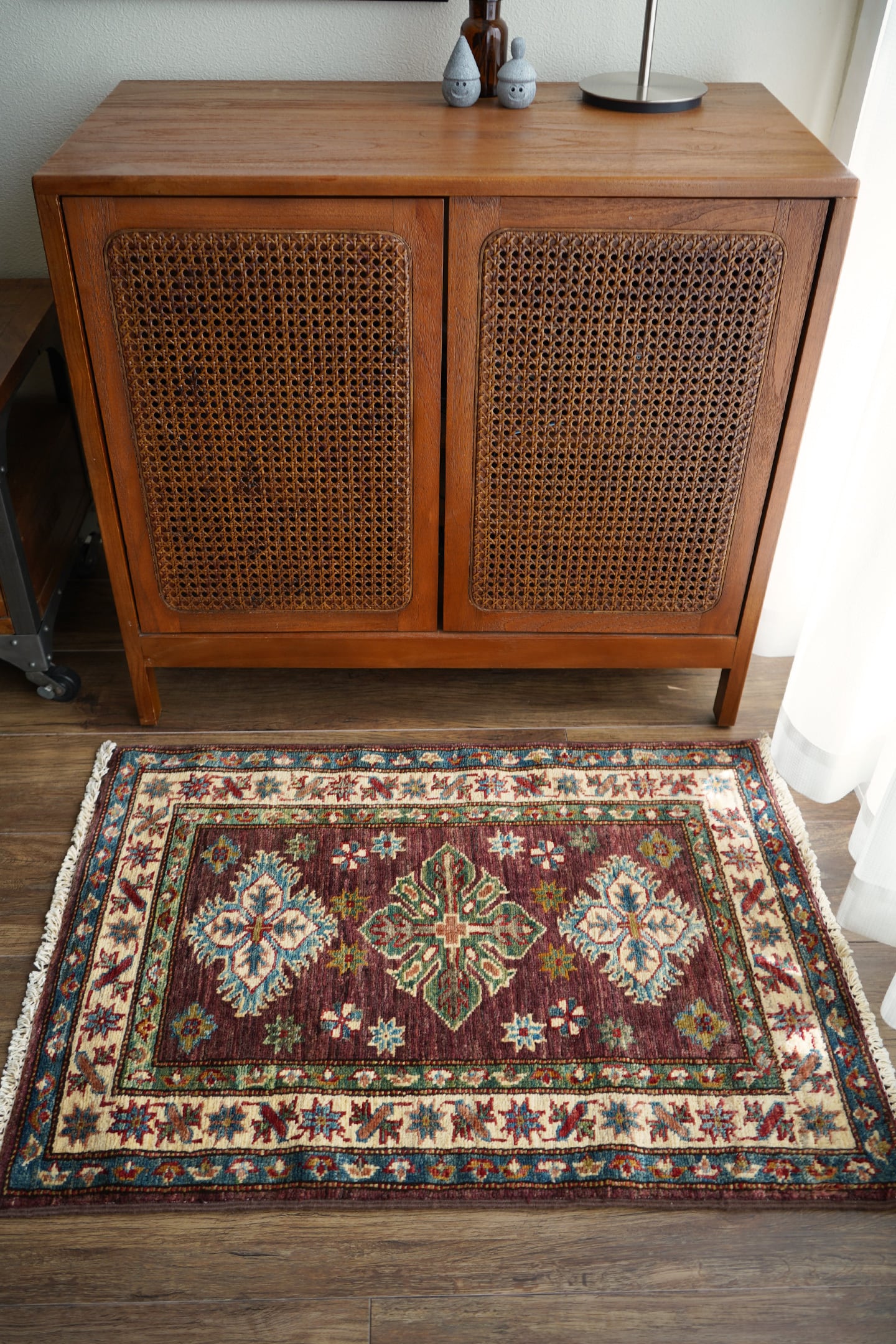 経年約20年のアフガニスタン産ラグ。幾何学模様が特徴的なコーカサス地方のカザックラグを模したデザインで、配色は小豆色、コバルトグリーン、ライトブルー、ベージュの組み合わせ。渋めの配色でご家庭のインテリアともコーディネートしやすいかと思います。厚みは6mm〜7mm程度で、表面はふわサラッとした肌触りです。パーフェクトなコンディション。玄関をはじめ、キャビネットやラックの前などお好きなスペースに。
