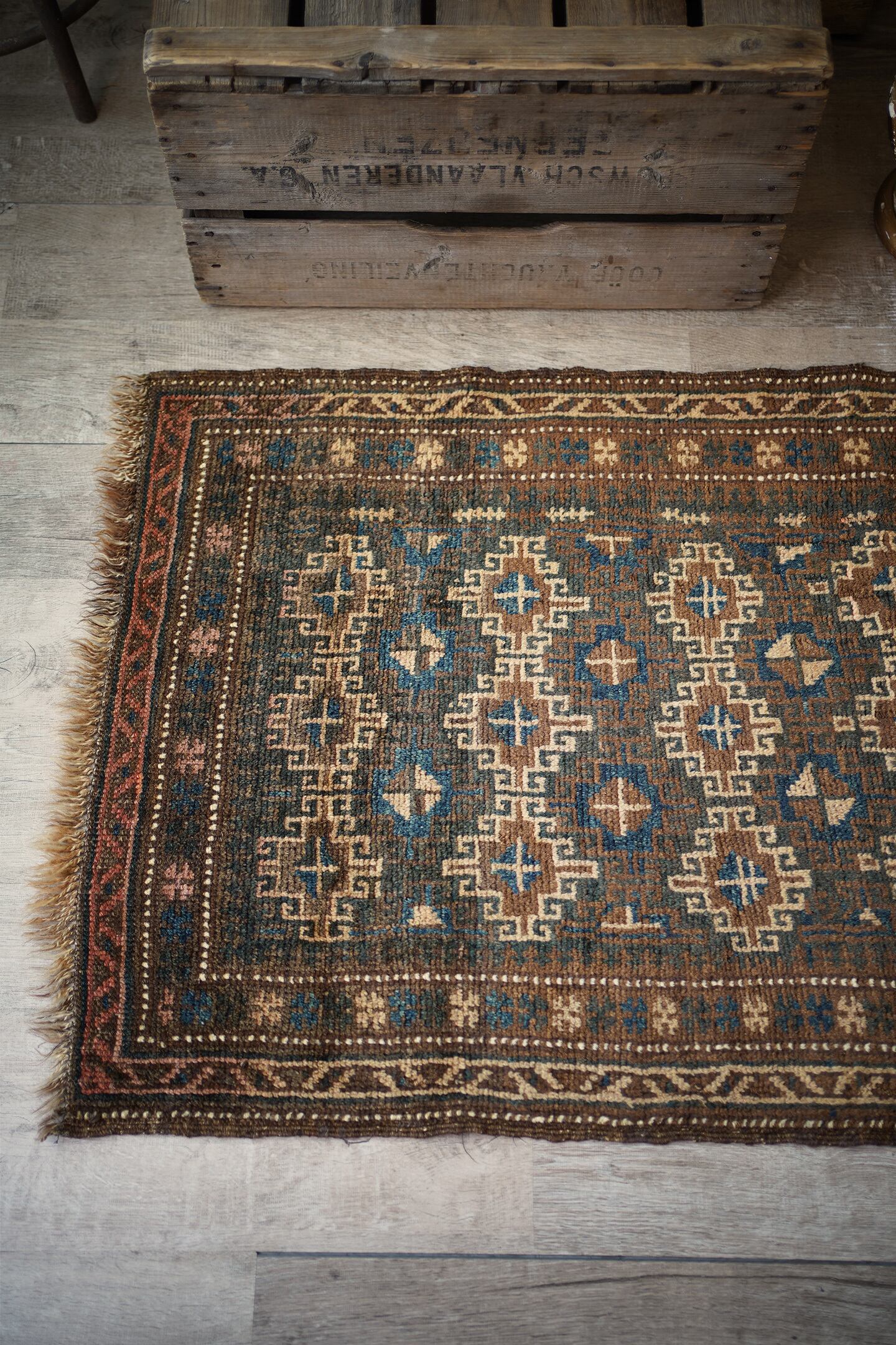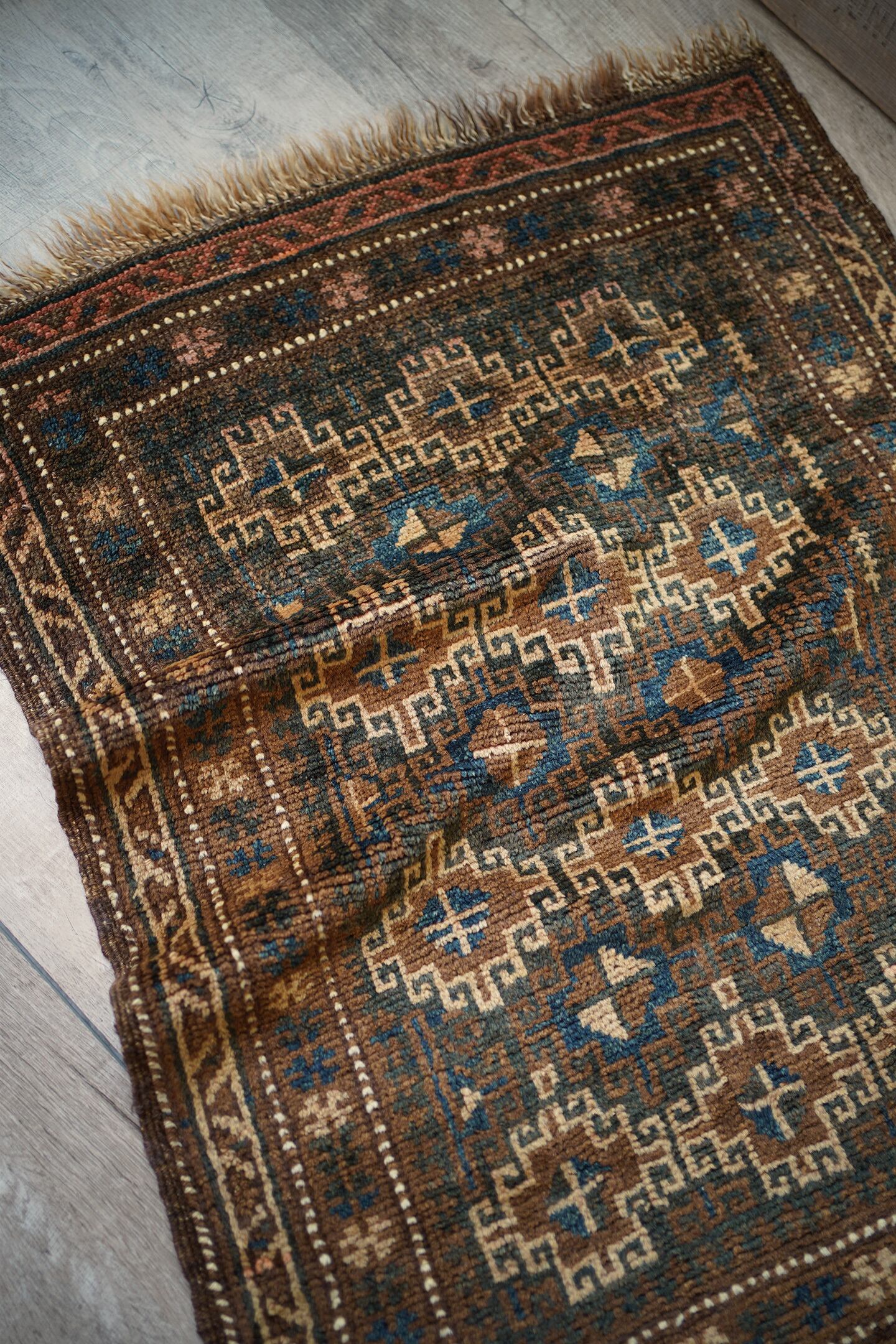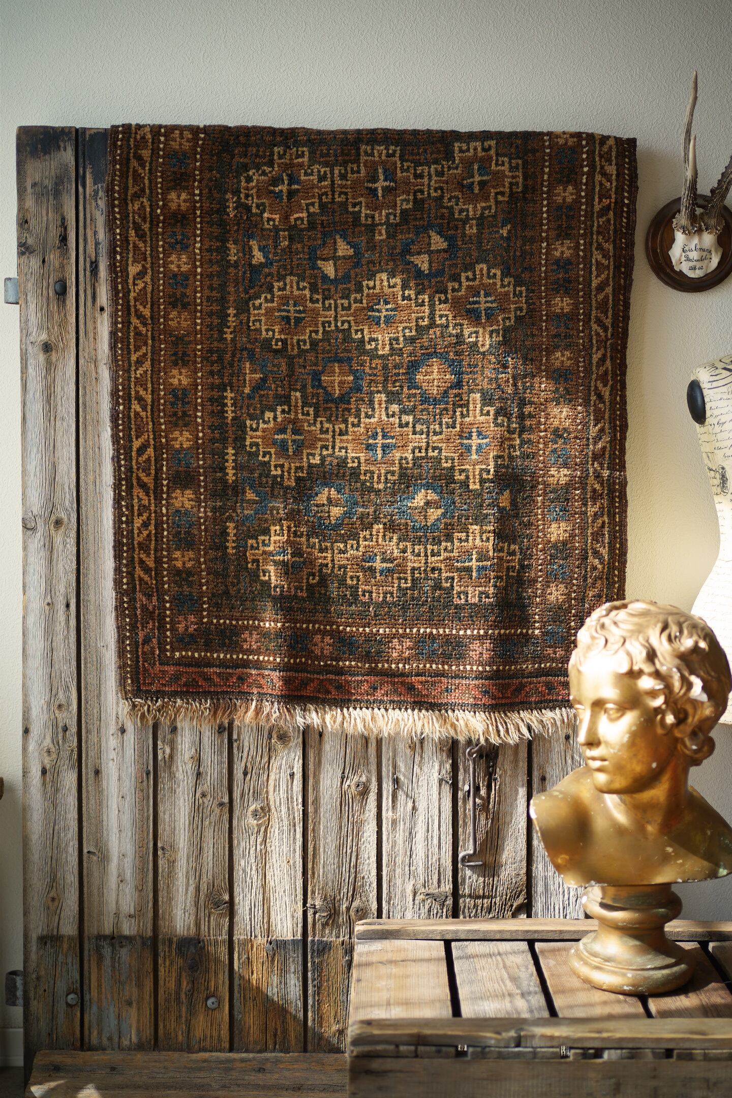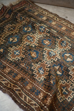 約80年前にアフガニスタン北西部に居住するタイマニ族によって織られたセミアンティークラグ。統一感のあるブラウンベースの渋い配色とバランスの取れたデザインに一目惚れして仕入れを決めました。何よりアクセントカラーの暗めのブルーグリーンがとても美しいです。色味と風合い含め、アンティークの木製家具との相性も良く、コーディネートもしやすいかと思います。表面はふわサラッとした肌触りで、厚みは5mm程度。コンディションも良好です。コレクションとして持っておきたいほど素敵なラグ、ピンと来た方はお早めにどうぞ♫