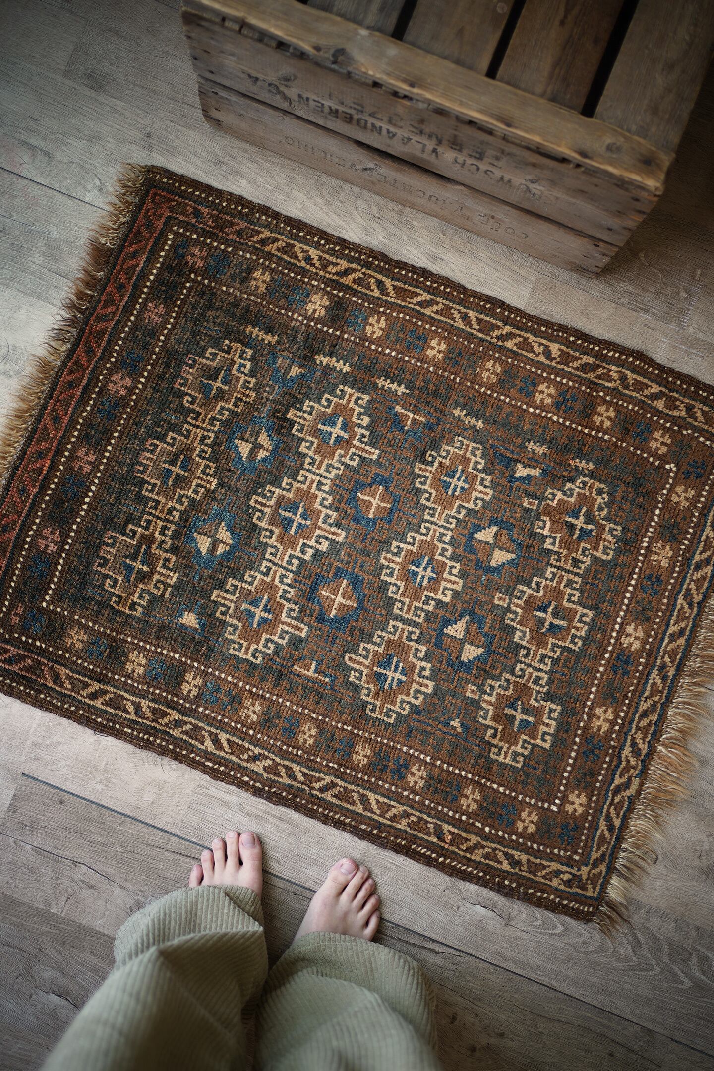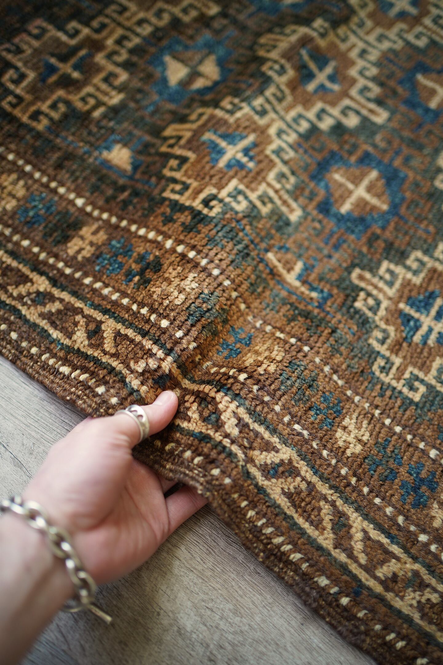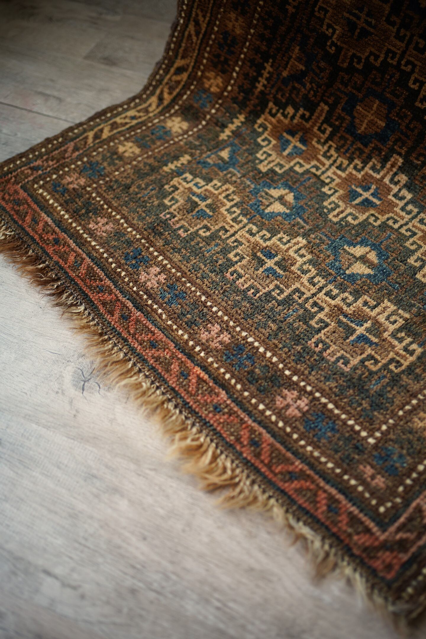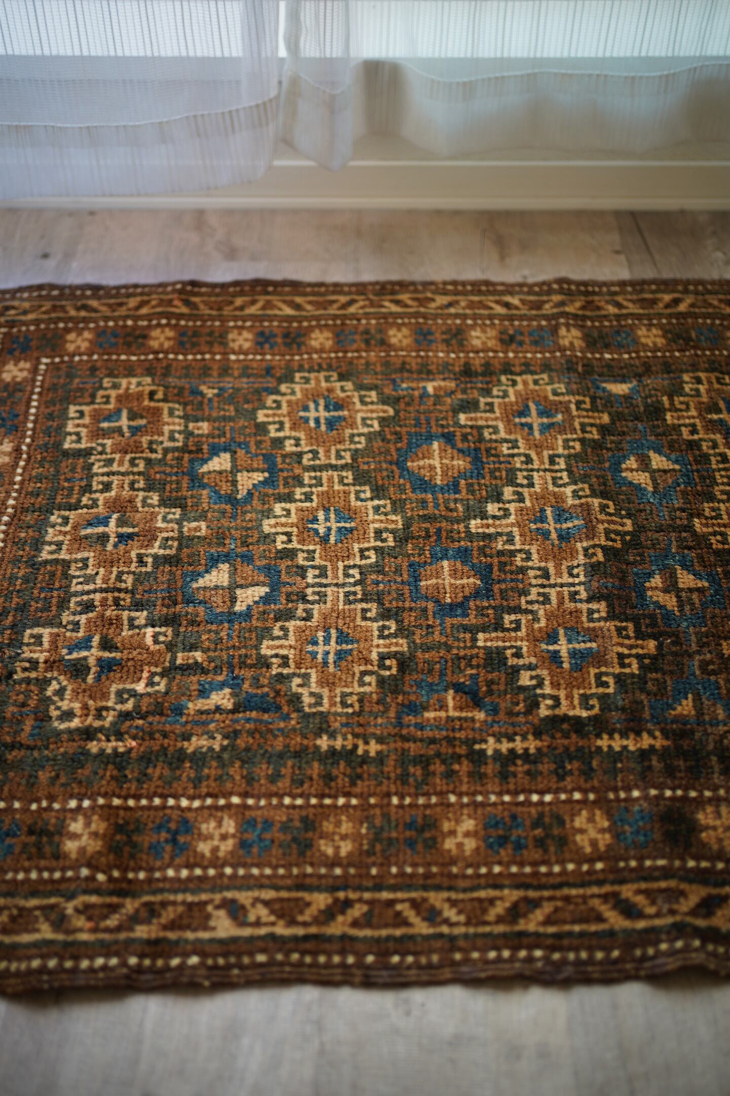 約80年前にアフガニスタン北西部に居住するタイマニ族によって織られたセミアンティークラグ。統一感のあるブラウンベースの渋い配色とバランスの取れたデザインに一目惚れして仕入れを決めました。何よりアクセントカラーの暗めのブルーグリーンがとても美しいです。色味と風合い含め、アンティークの木製家具との相性も良く、コーディネートもしやすいかと思います。表面はふわサラッとした肌触りで、厚みは5mm程度。コンディションも良好です。コレクションとして持っておきたいほど素敵なラグ、ピンと来た方はお早めにどうぞ♫