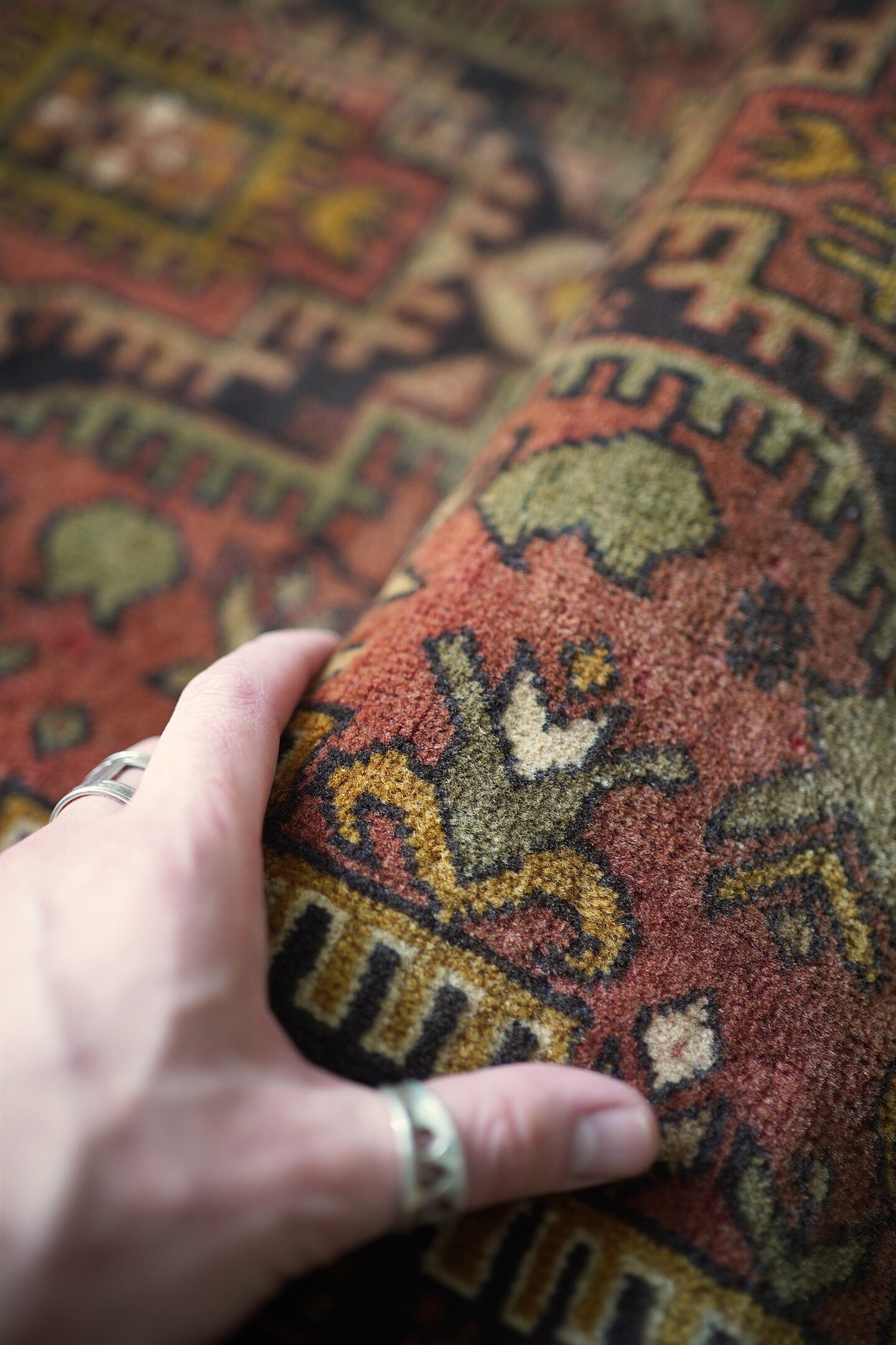 約50年ほど前にトルクメン族によって織られたアリホジャラグ。チューリップのような形の可愛いフォルムの花モチーフに、アリホジャ特有の細かい織りで表現された繊細な紋様デザインと配色バランスが素晴らしい一枚。テラコッタカラー、薄い黒、キャメル、黄土色などが使われた落ち着いた色合いで、お部屋に取り入れやすい落ち着いた雰囲気が魅力的です。表面はサラッとしつつも柔らかい肌触りで、厚みは5mm程度。目立ったダメージなども見受けられずグッドコンディション。パーソナルチェアと合わせたり、ちょっとしたスペースのアクセントにオススメ♫