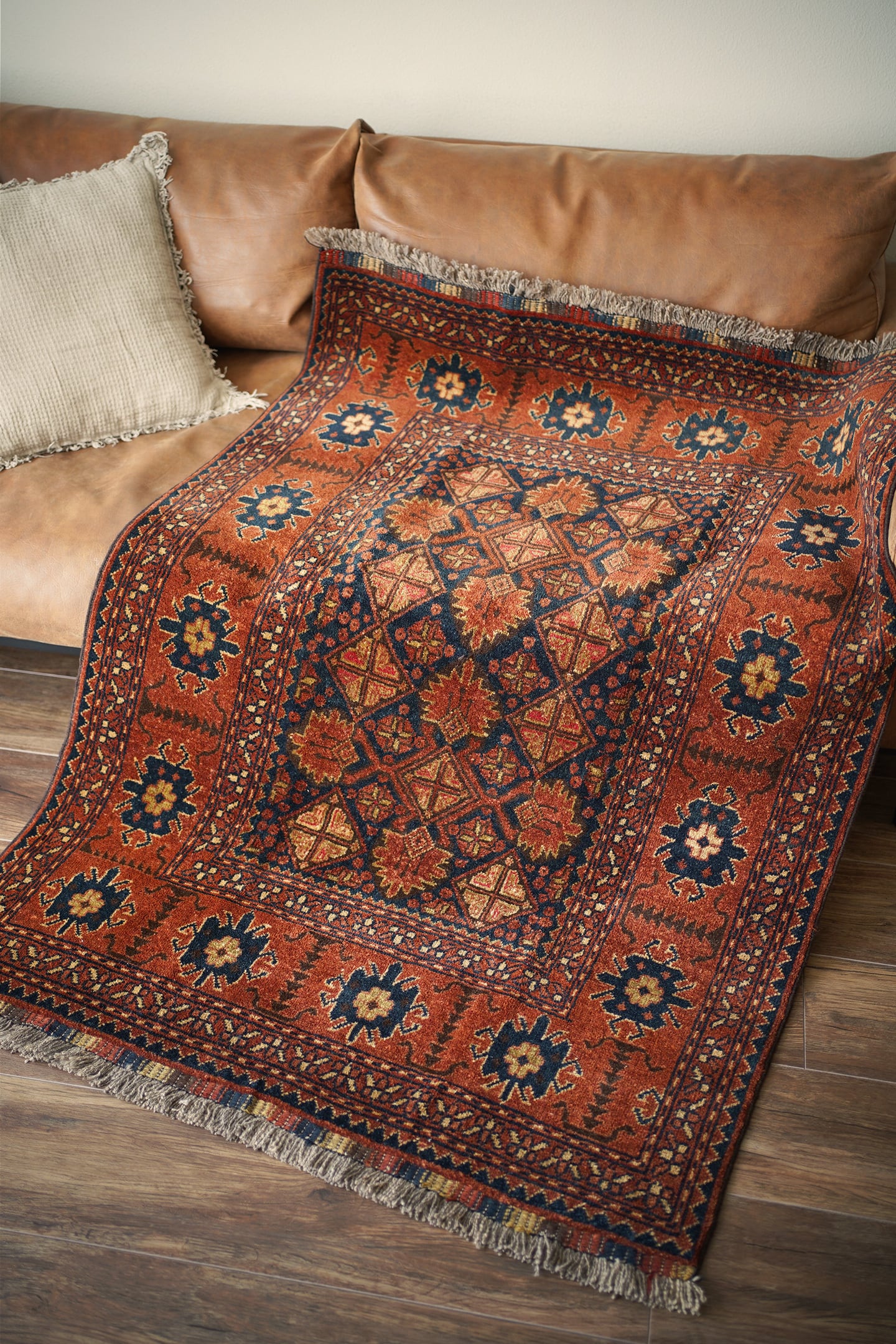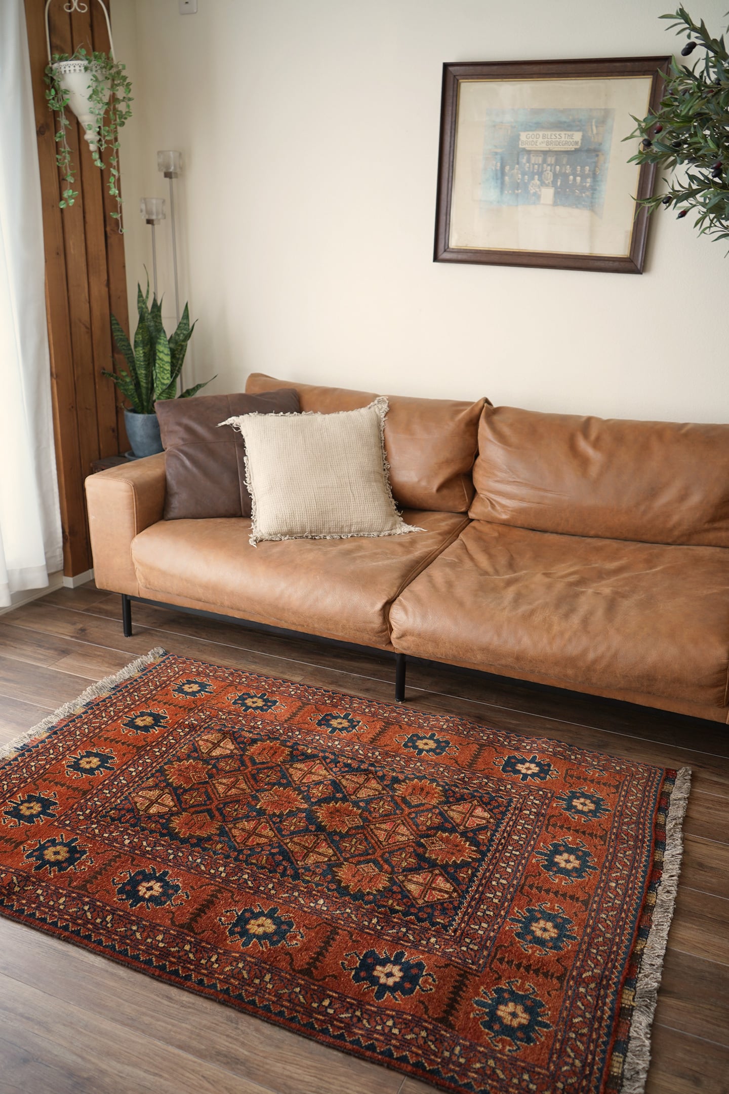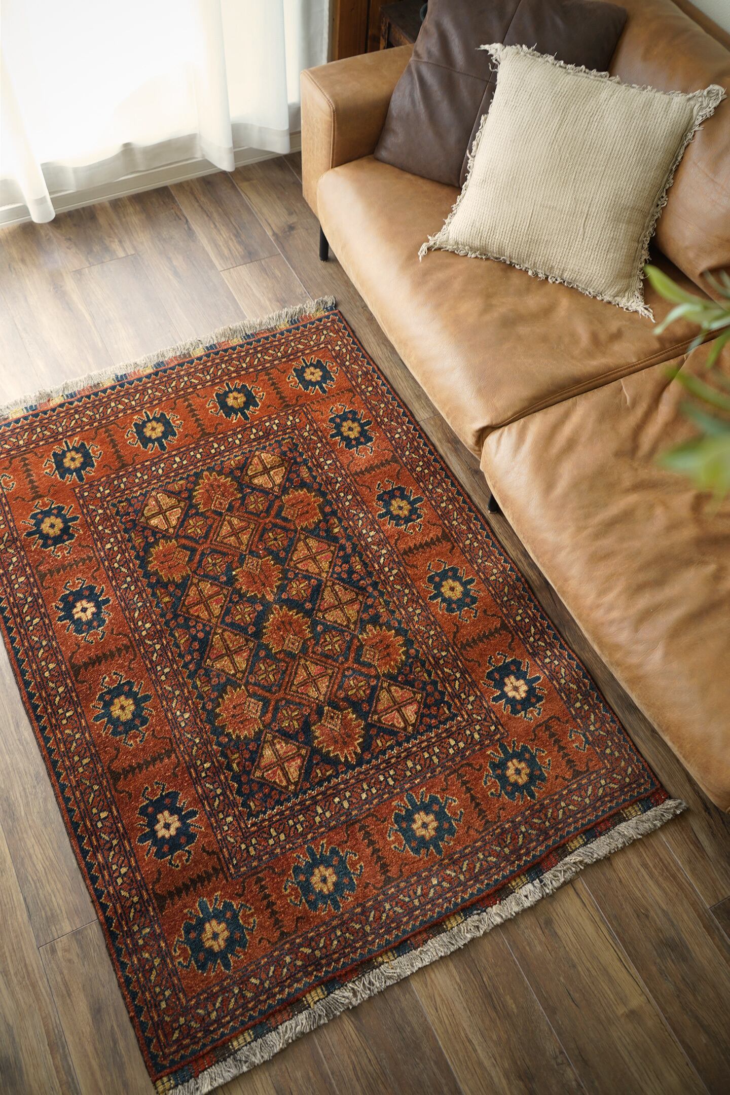 アフガニスタンでおよそ50年前にトルクメン族によって織られたヴィンテージラグです。温かみのあるテラコッタカラーを基調に、深みのある濃紺を組み合わせた色彩が印象的で、空間に重厚さと華やかさをもたらします。中央のフィールドには、交差する幾何学文様と花のような意匠がリズミカルに配置され、ラグ全体に品格ある存在感を与えています。周囲のボーダーには繊細なフラワーモチーフが連なり、細部にまでこだわりが感じられるデザインです。厚みは7mmで、しっかりとした織りと密度のあるウールの質感からは、トルクメンラグならではの堅牢さがうかがえ、50年という歳月を経てもなお、日常使いに耐えうる丈夫さを保っています。表面の毛並みはふんわりとした柔らかく使い心地の良い肌触りです。目立ったダメージはなく、コンディションも非常に良好。リビングや書斎など、落ち着いた空間のアクセントとして最適かと思います。