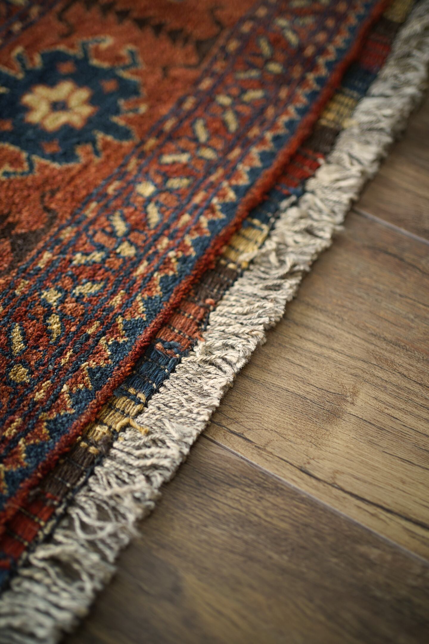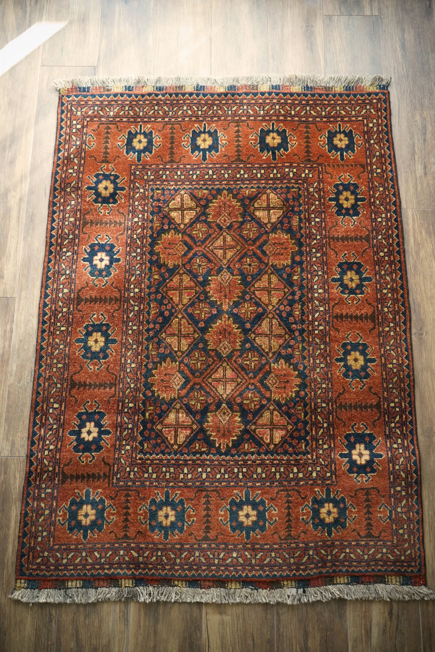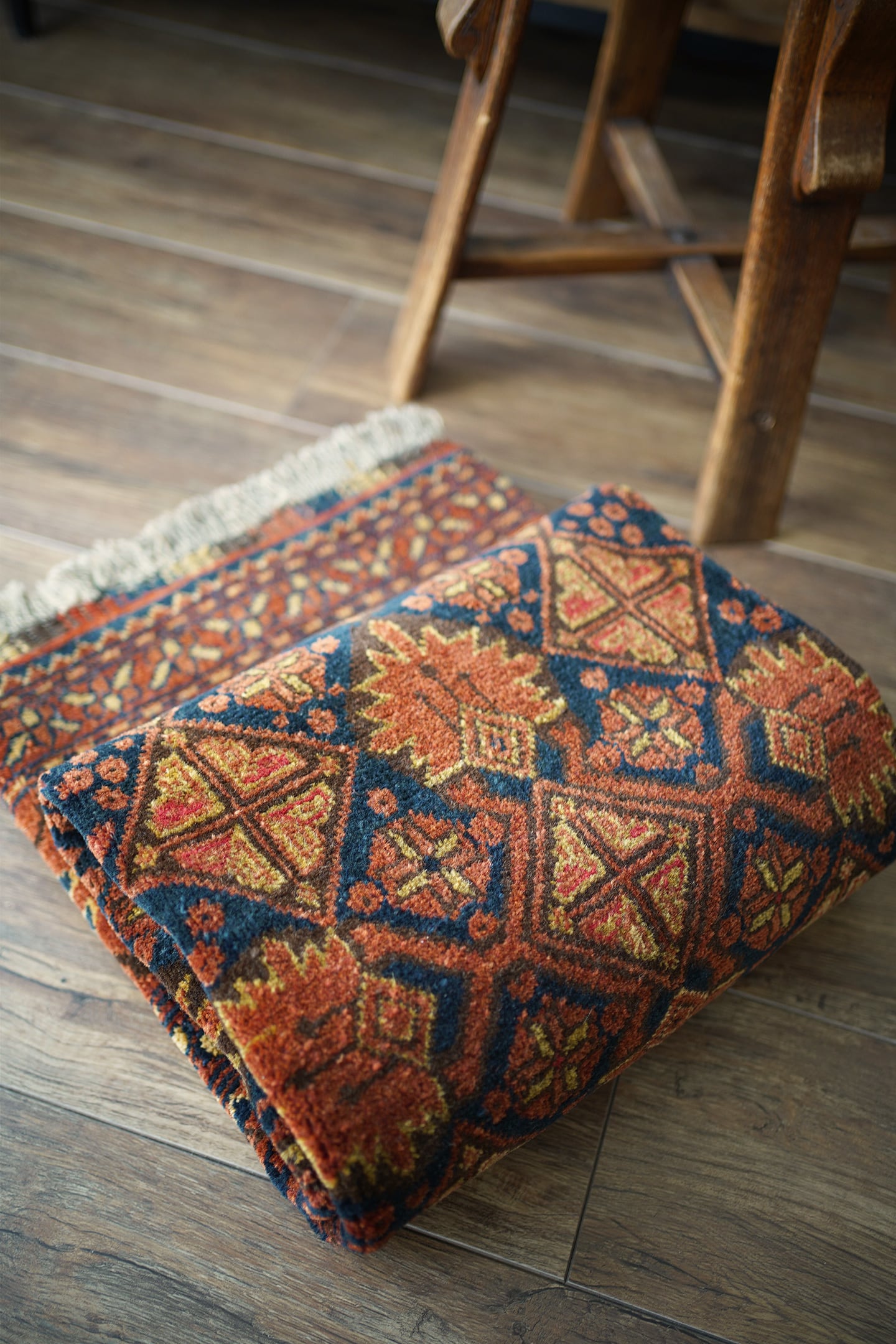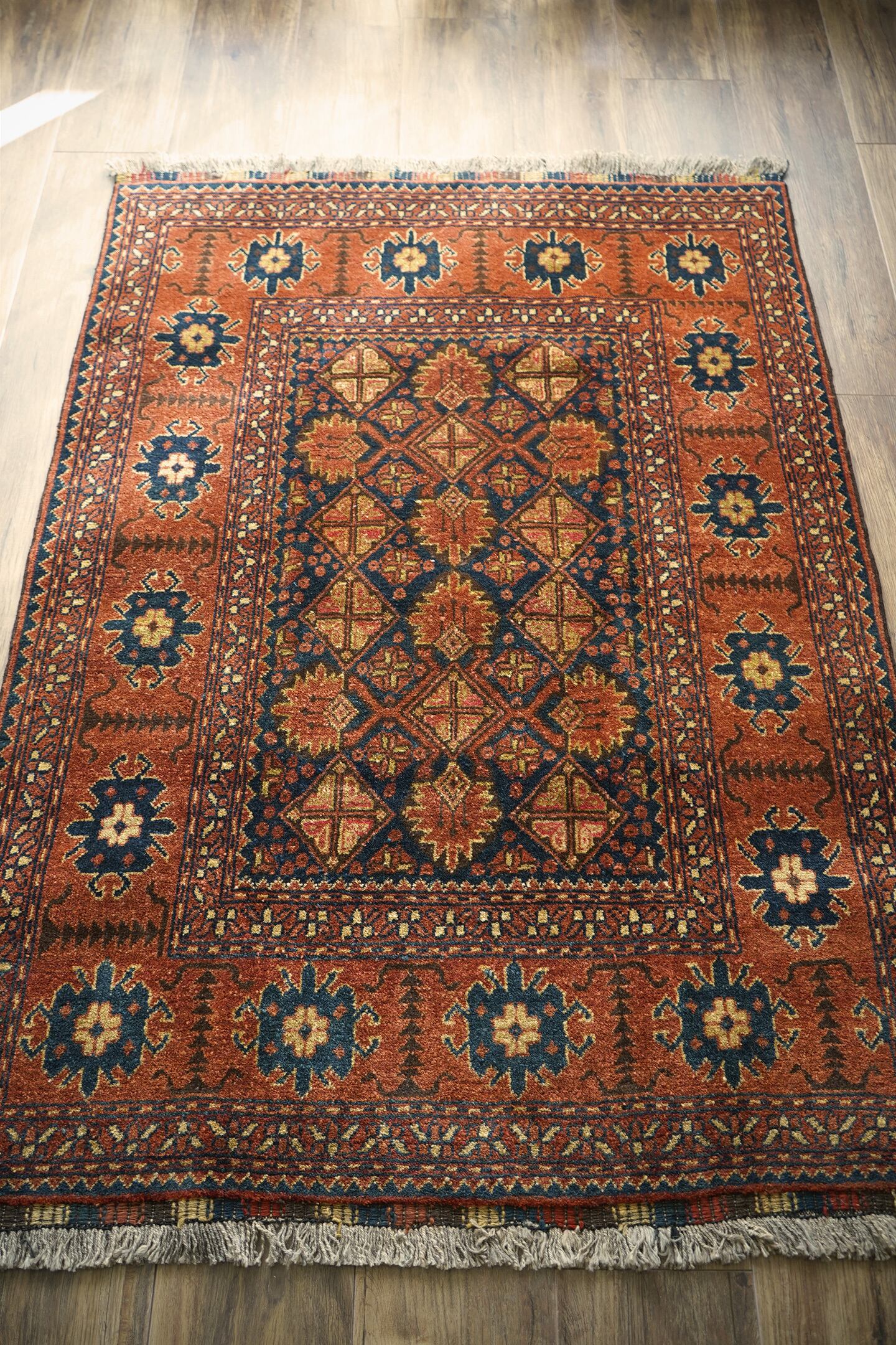 アフガニスタンでおよそ50年前にトルクメン族によって織られたヴィンテージラグです。温かみのあるテラコッタカラーを基調に、深みのある濃紺を組み合わせた色彩が印象的で、空間に重厚さと華やかさをもたらします。中央のフィールドには、交差する幾何学文様と花のような意匠がリズミカルに配置され、ラグ全体に品格ある存在感を与えています。周囲のボーダーには繊細なフラワーモチーフが連なり、細部にまでこだわりが感じられるデザインです。厚みは7mmで、しっかりとした織りと密度のあるウールの質感からは、トルクメンラグならではの堅牢さがうかがえ、50年という歳月を経てもなお、日常使いに耐えうる丈夫さを保っています。表面の毛並みはふんわりとした柔らかく使い心地の良い肌触りです。目立ったダメージはなく、コンディションも非常に良好。リビングや書斎など、落ち着いた空間のアクセントとして最適かと思います。