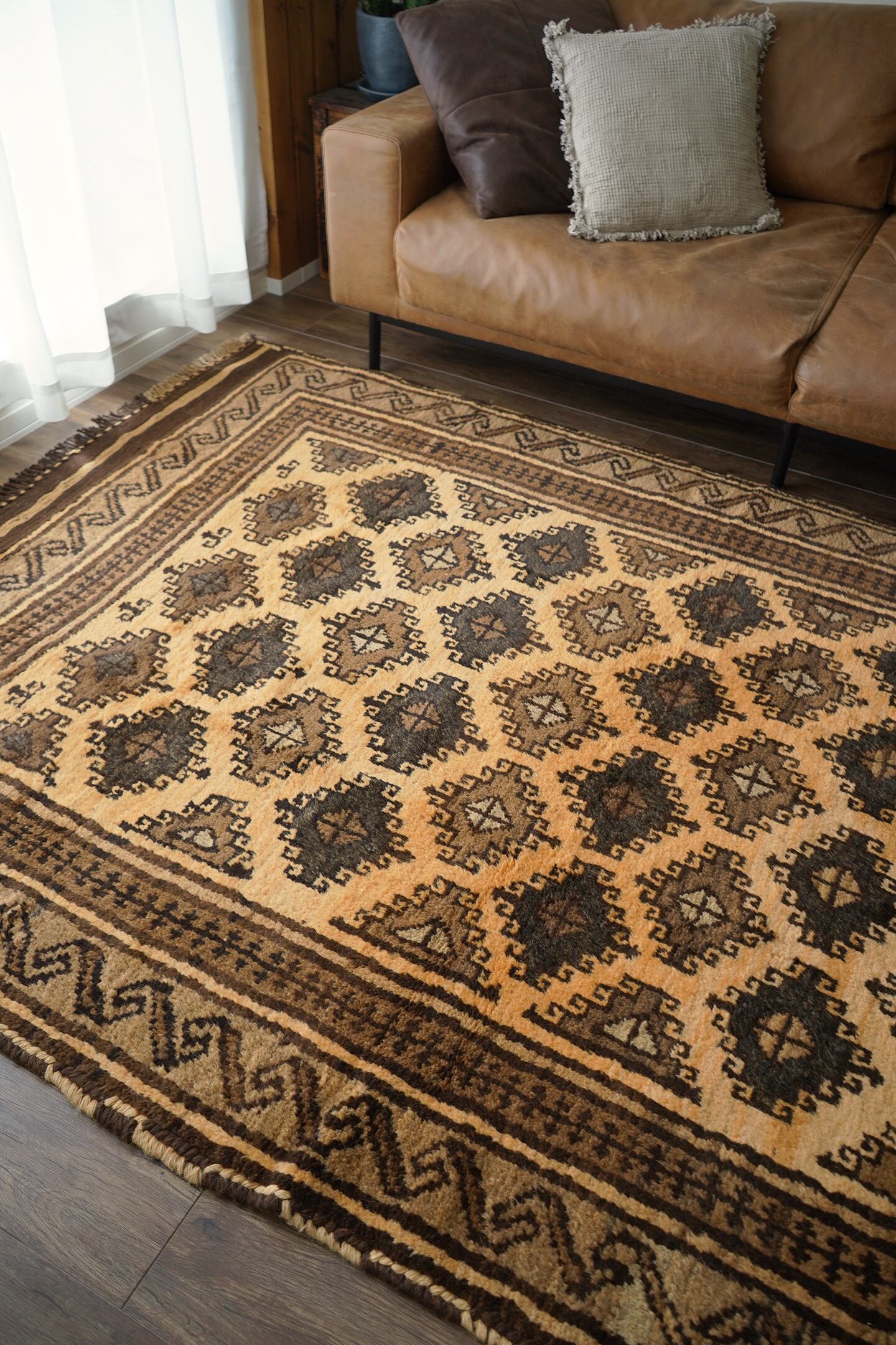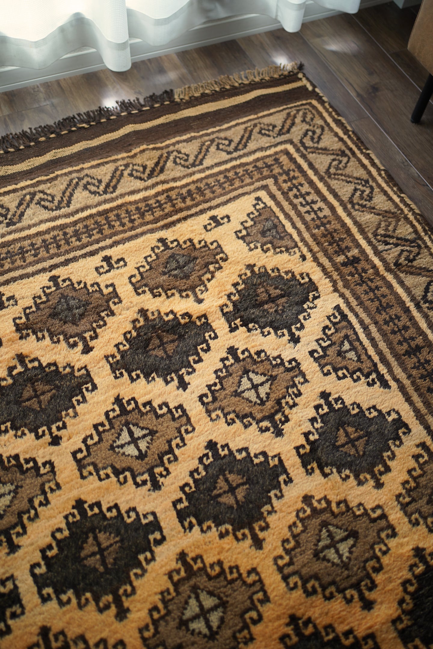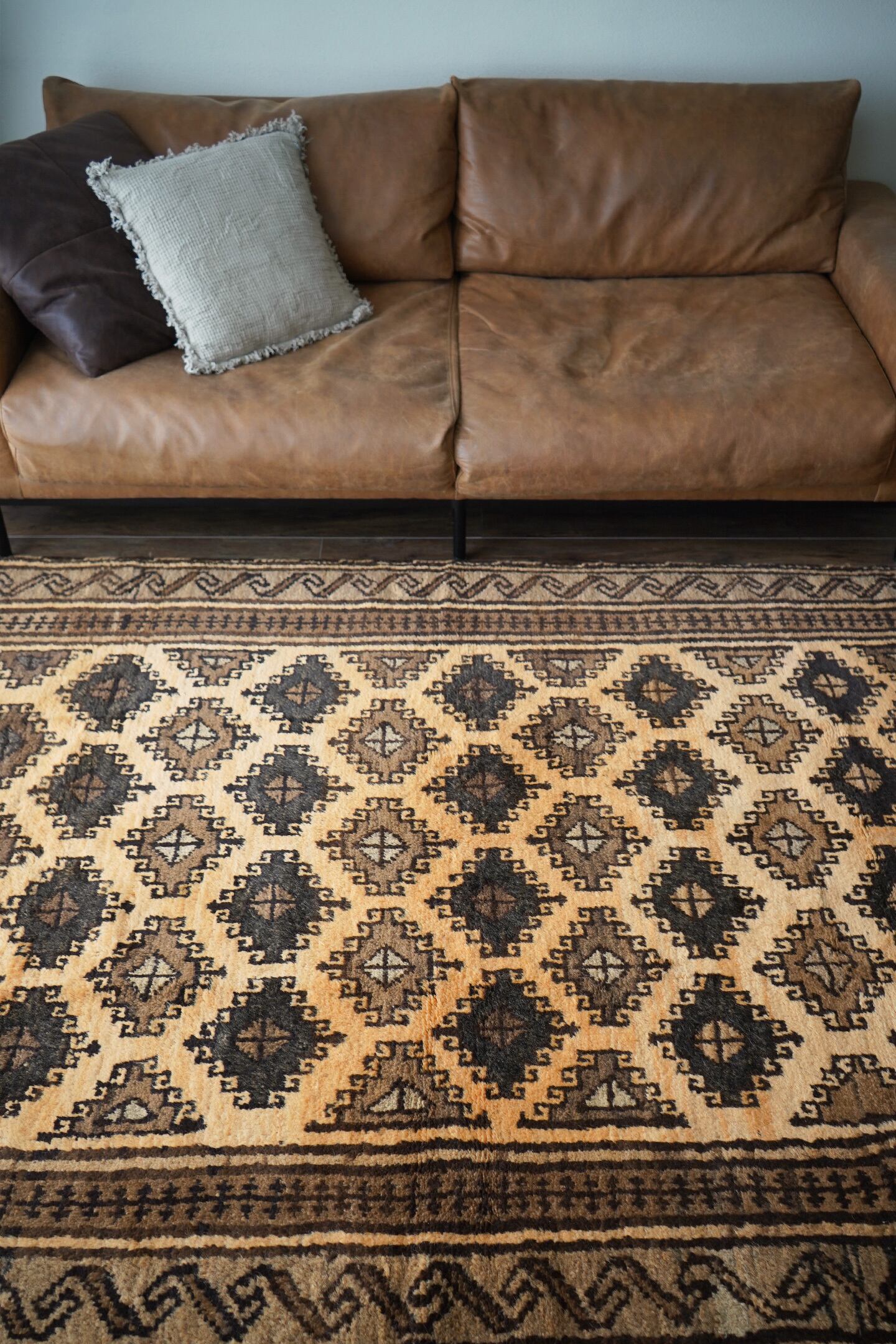 約50年前にアフガニスタン北西部に居住するタイマニ族によって織られたヴィンテージラグです。オレンジがかったベージュをベースに、フィールドにはチャコールグレーとブラウンの幾何学模様がバランスよく織り込まれています。ボーダーには、チェーンのような連続模様がデザインされています。天然染料によるやさしい色合いが、空間に温かみと深みをもたらします。厚みは約1cm程度で、ふわっと柔らかく、優しい肌触りが特徴です。目立ったダメージはなく、コンディションは非常に良好です。大判サイズなので、ソファ前でゆったりと寛ぐシーンや、ダイニングテーブルの下にもおすすめです♫