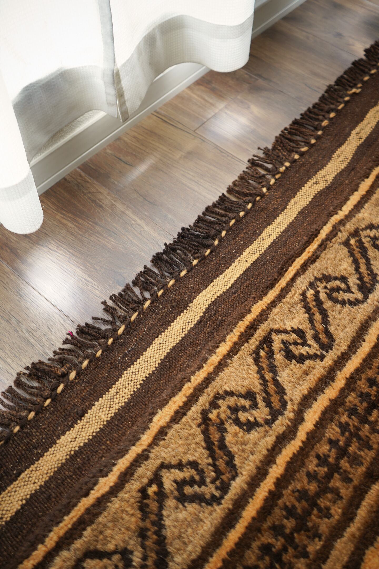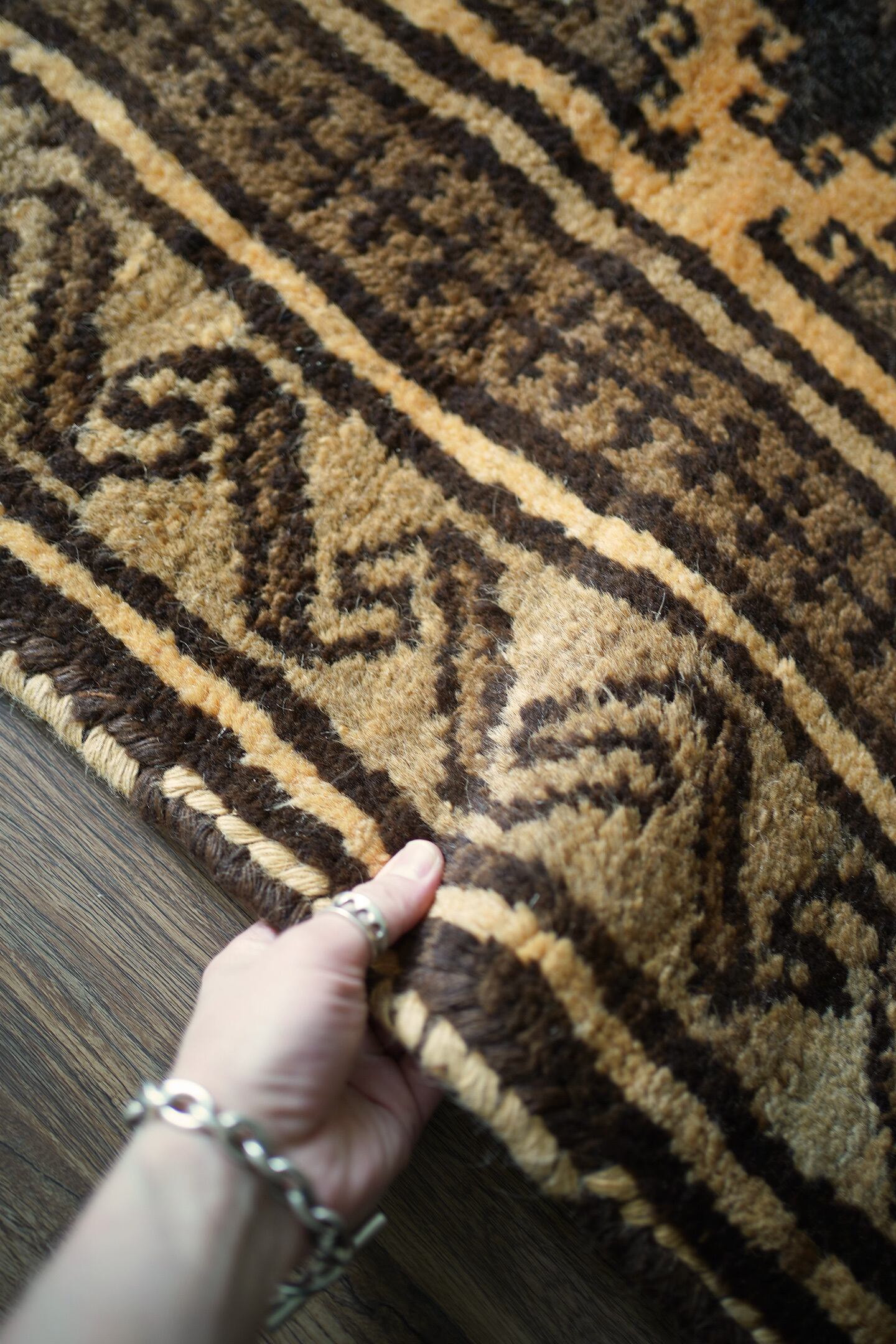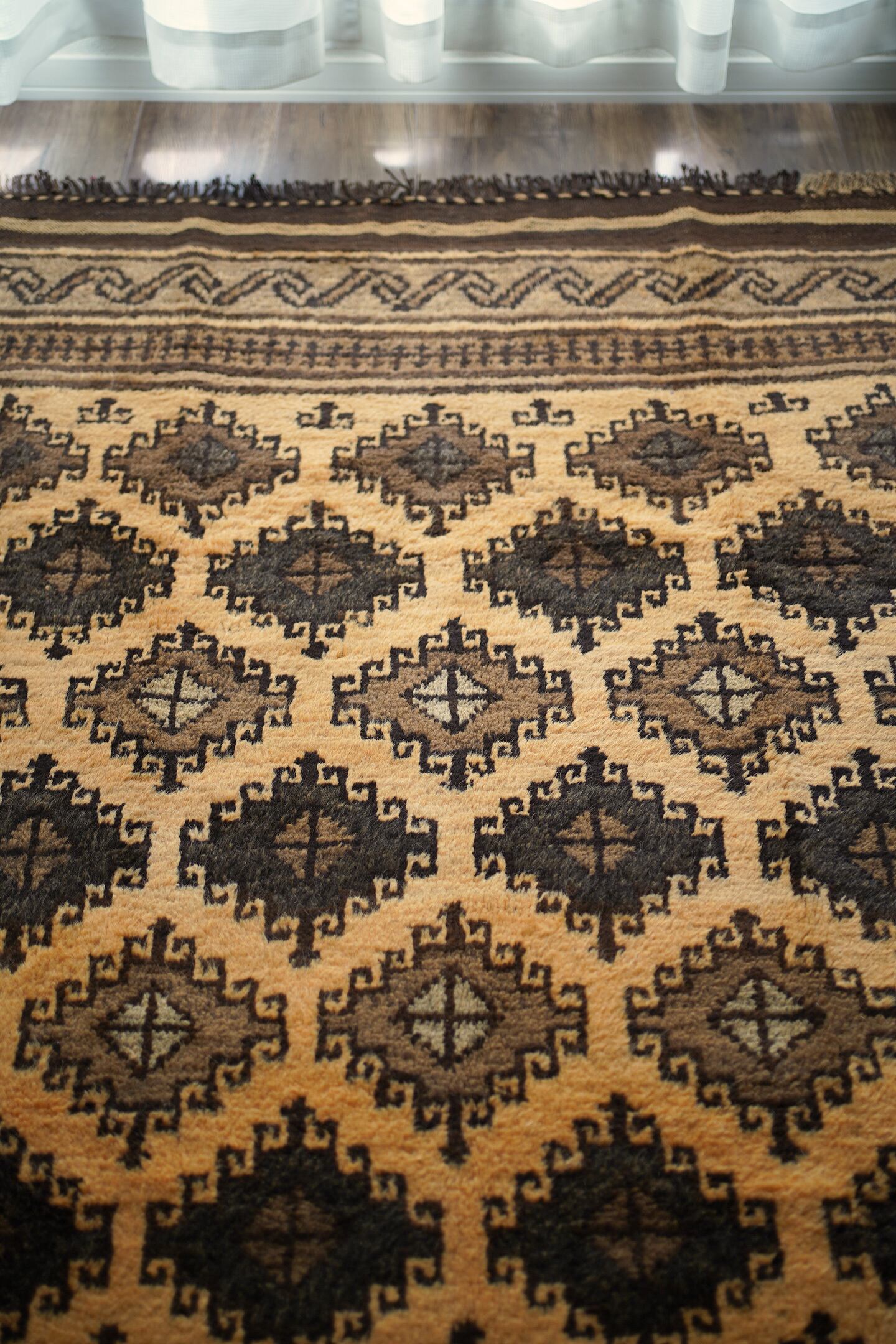 約50年前にアフガニスタン北西部に居住するタイマニ族によって織られたヴィンテージラグです。オレンジがかったベージュをベースに、フィールドにはチャコールグレーとブラウンの幾何学模様がバランスよく織り込まれています。ボーダーには、チェーンのような連続模様がデザインされています。天然染料によるやさしい色合いが、空間に温かみと深みをもたらします。厚みは約1cm程度で、ふわっと柔らかく、優しい肌触りが特徴です。目立ったダメージはなく、コンディションは非常に良好です。大判サイズなので、ソファ前でゆったりと寛ぐシーンや、ダイニングテーブルの下にもおすすめです♫
