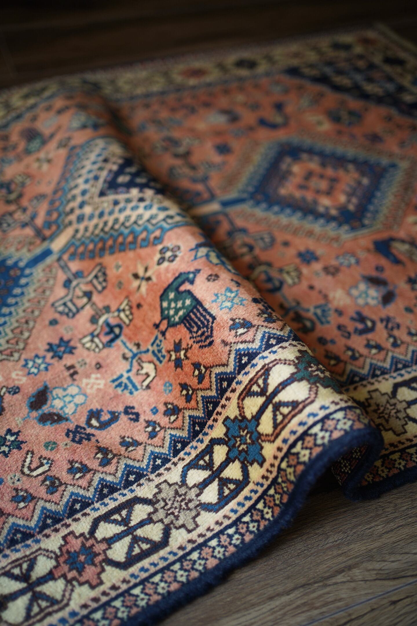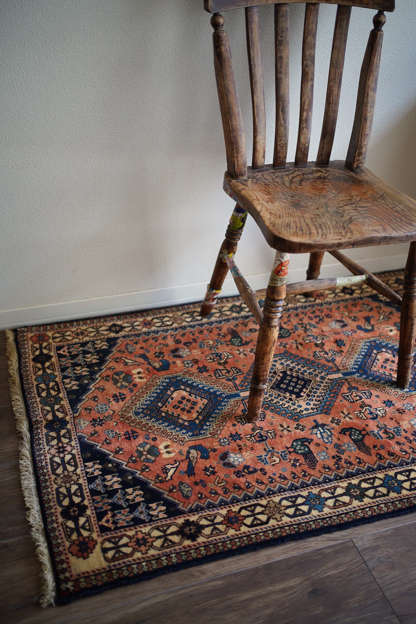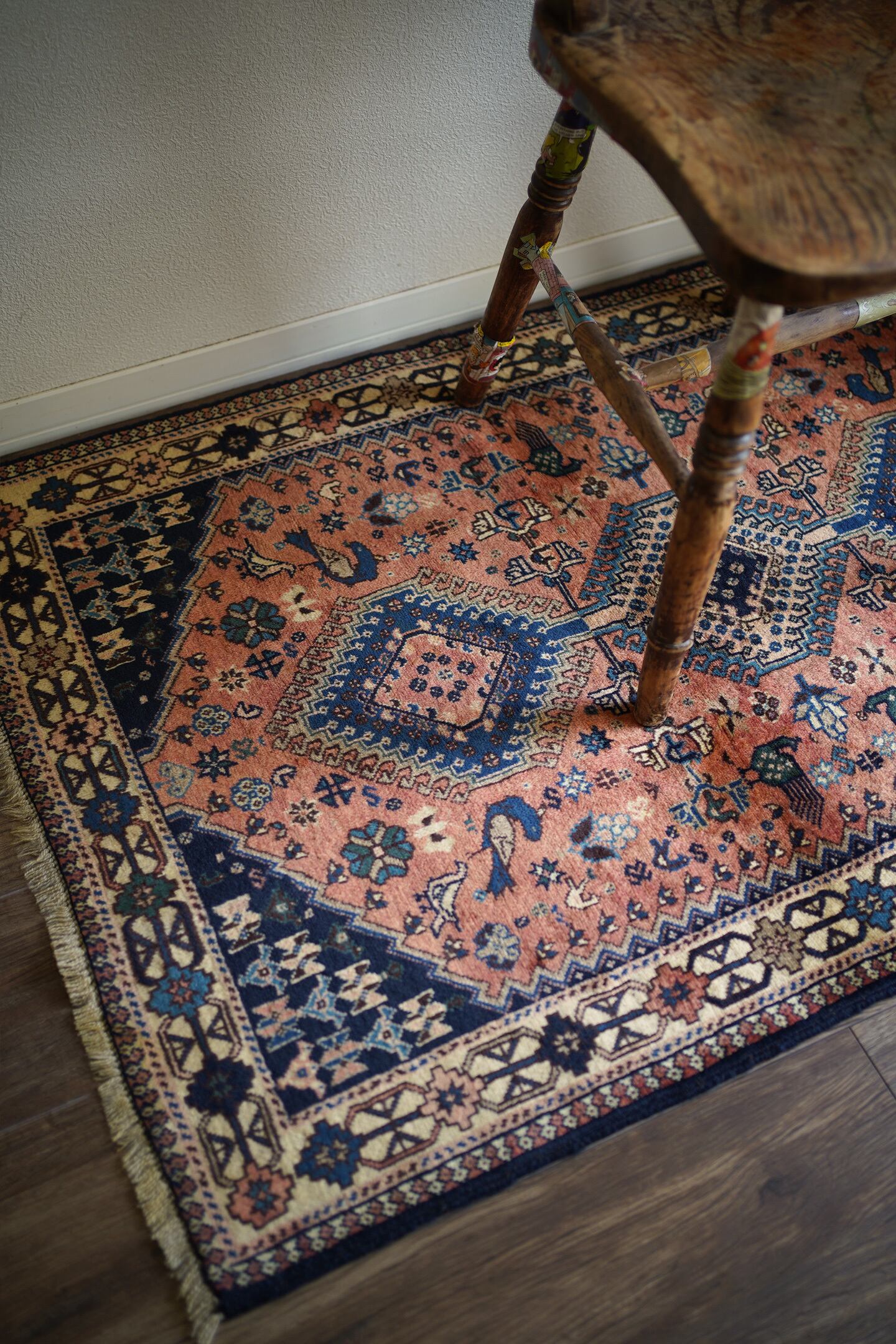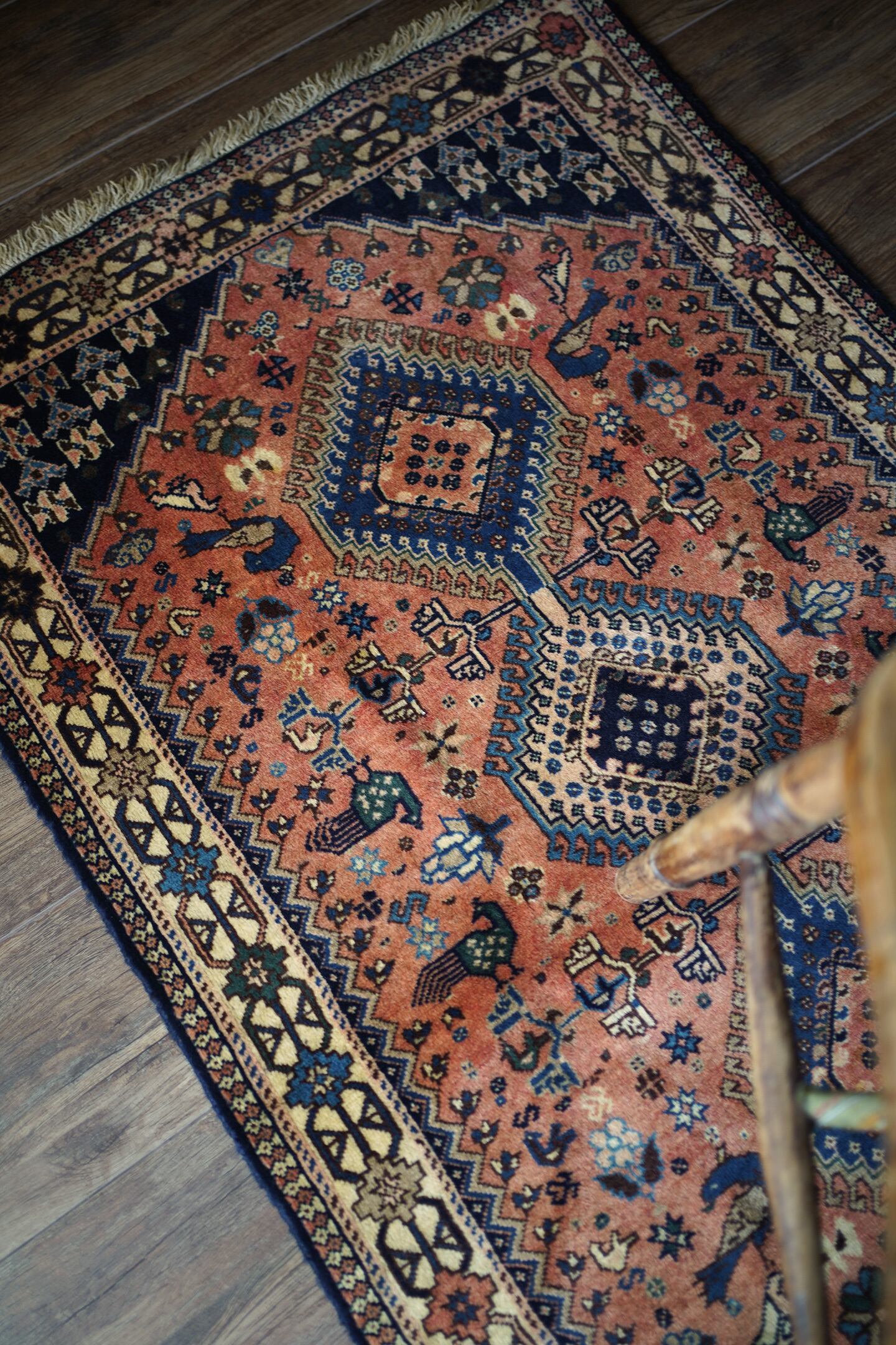 経年50年ほどのイラン・ヤラメ産のペルシャラグ。ヤラメ特有のフックドメダリオンの周りには可愛らしい鳥の紋様や美しい花模様などが織り込まれています。よく見ると鳥も様々なフォルムのタイプがおり、眺めているだけでワクワクしてくる素敵な一枚です。褪せたオレンジ色が渋い雰囲気で、味のあるヴィンテージ感を醸し出しています。またパイルには経年変化による艶も感じられます。毛並みはふわっと滑らかな気持ちの良い肌触りで、厚みは8mm程度。目立ったダメージもなく大変良好なコンディション。玄関スペースや洗面スペース、デスク下に敷いたりと使い勝手の良いサイズ感です♫