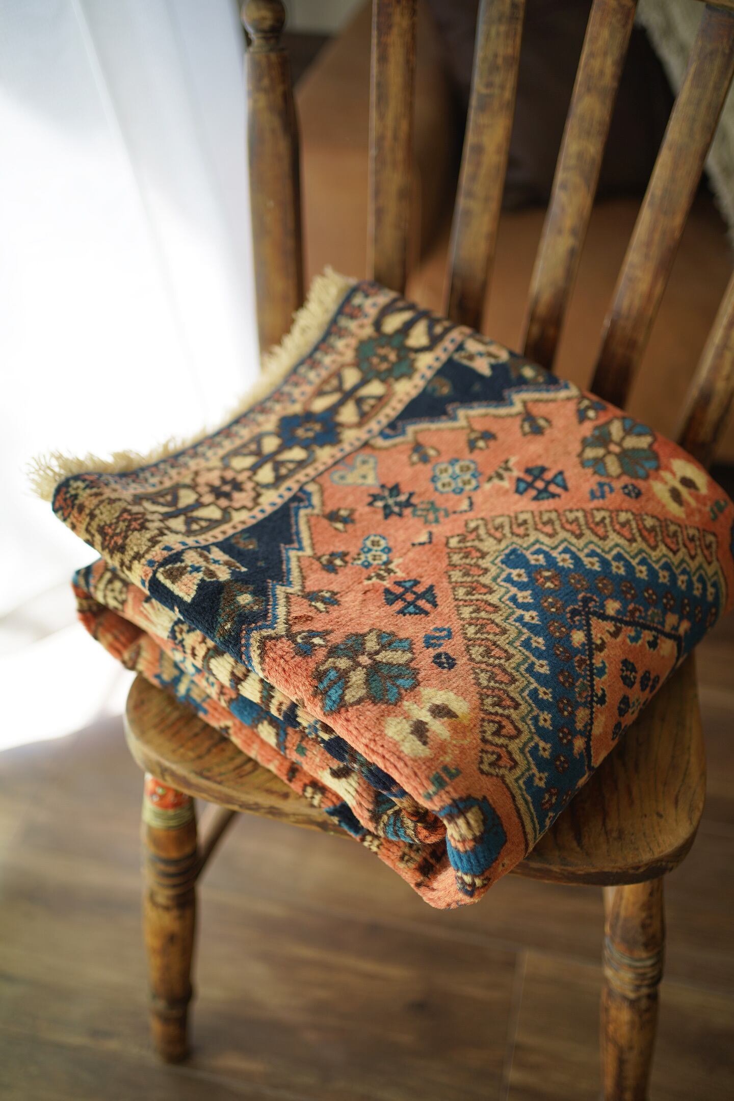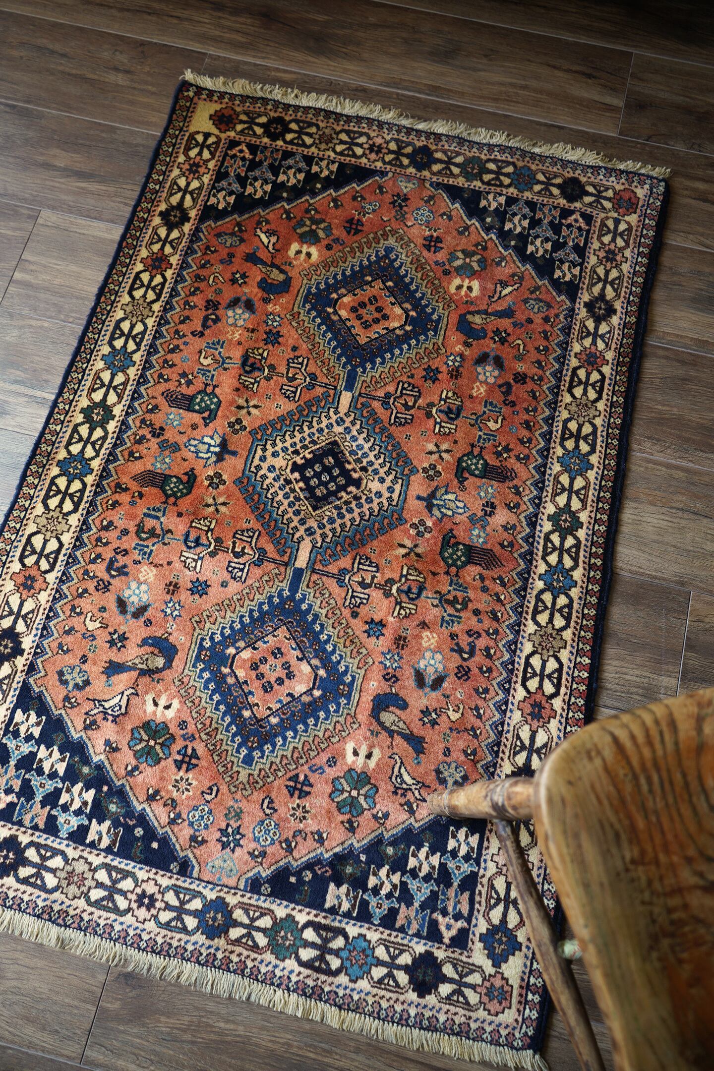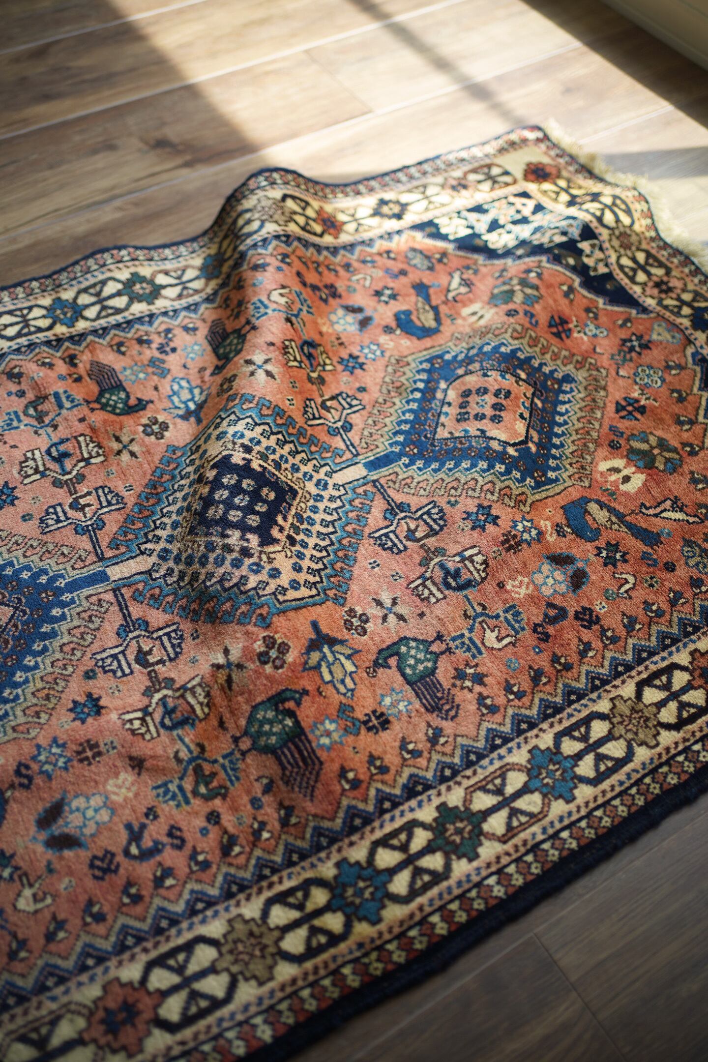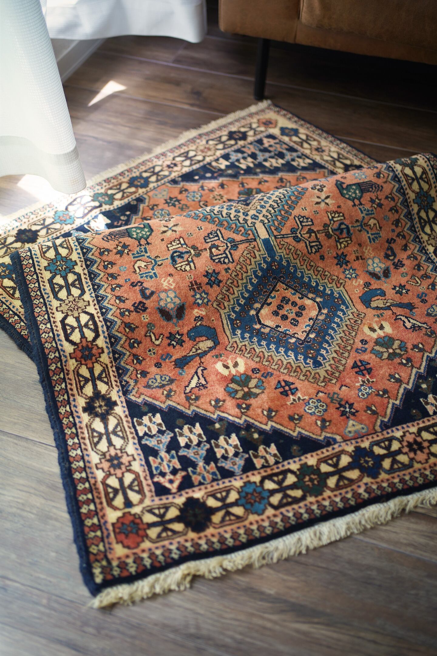 経年50年ほどのイラン・ヤラメ産のペルシャラグ。ヤラメ特有のフックドメダリオンの周りには可愛らしい鳥の紋様や美しい花模様などが織り込まれています。よく見ると鳥も様々なフォルムのタイプがおり、眺めているだけでワクワクしてくる素敵な一枚です。褪せたオレンジ色が渋い雰囲気で、味のあるヴィンテージ感を醸し出しています。またパイルには経年変化による艶も感じられます。毛並みはふわっと滑らかな気持ちの良い肌触りで、厚みは8mm程度。目立ったダメージもなく大変良好なコンディション。玄関スペースや洗面スペース、デスク下に敷いたりと使い勝手の良いサイズ感です♫