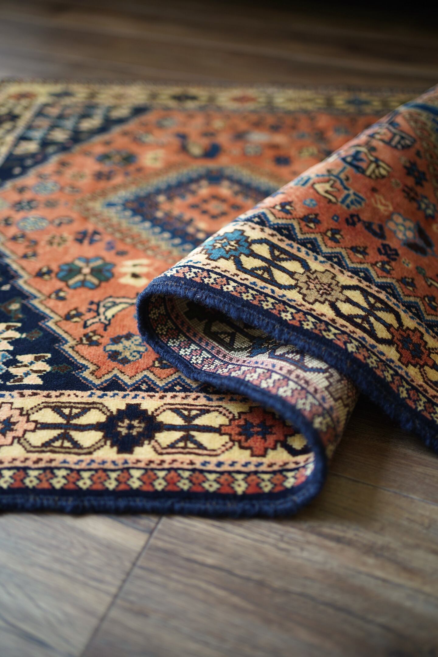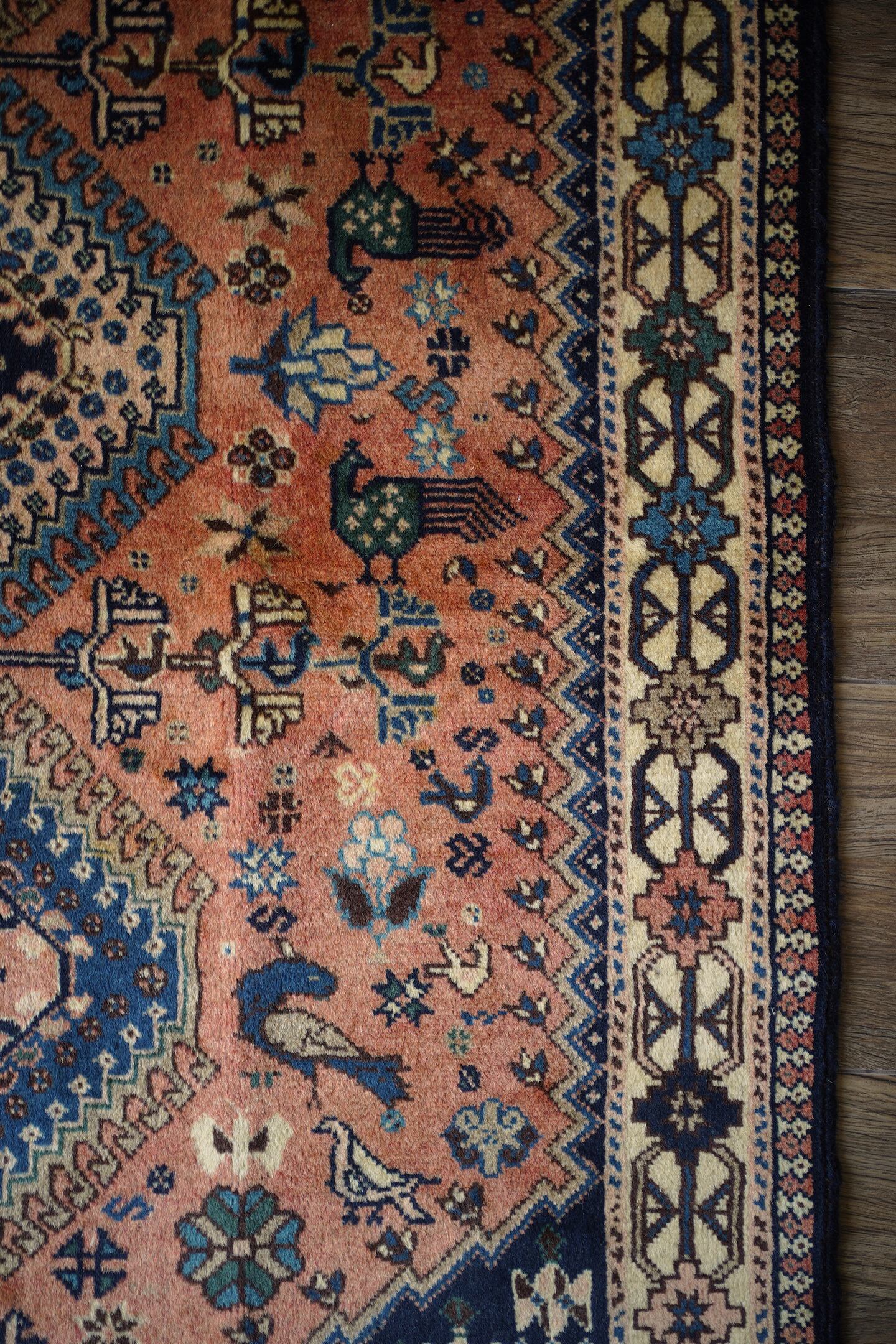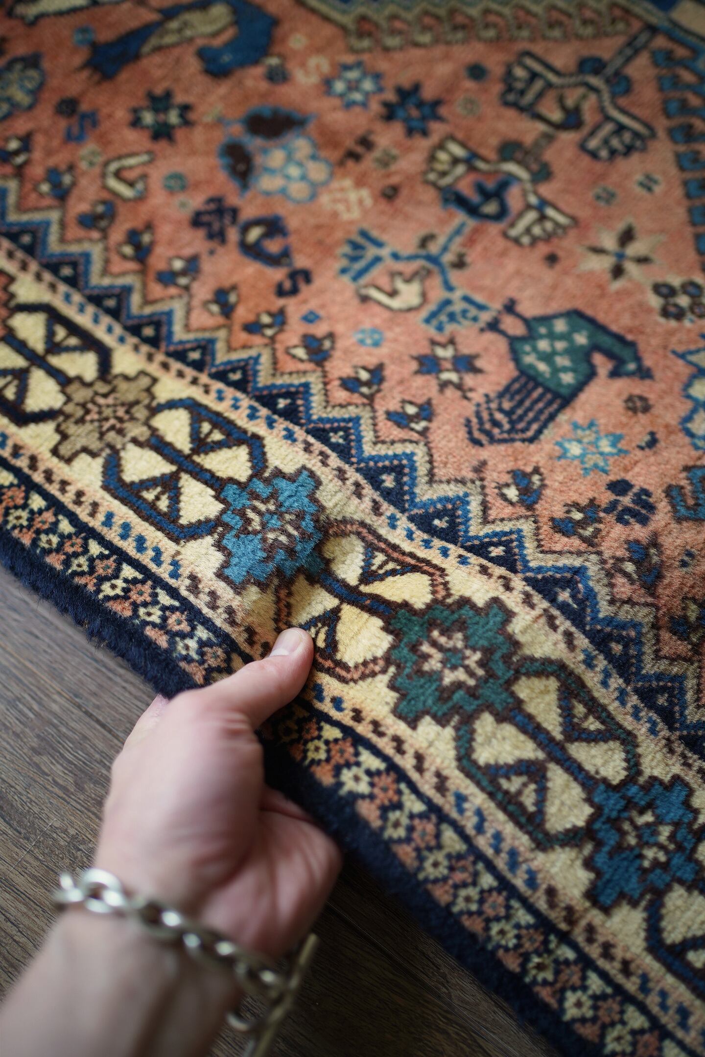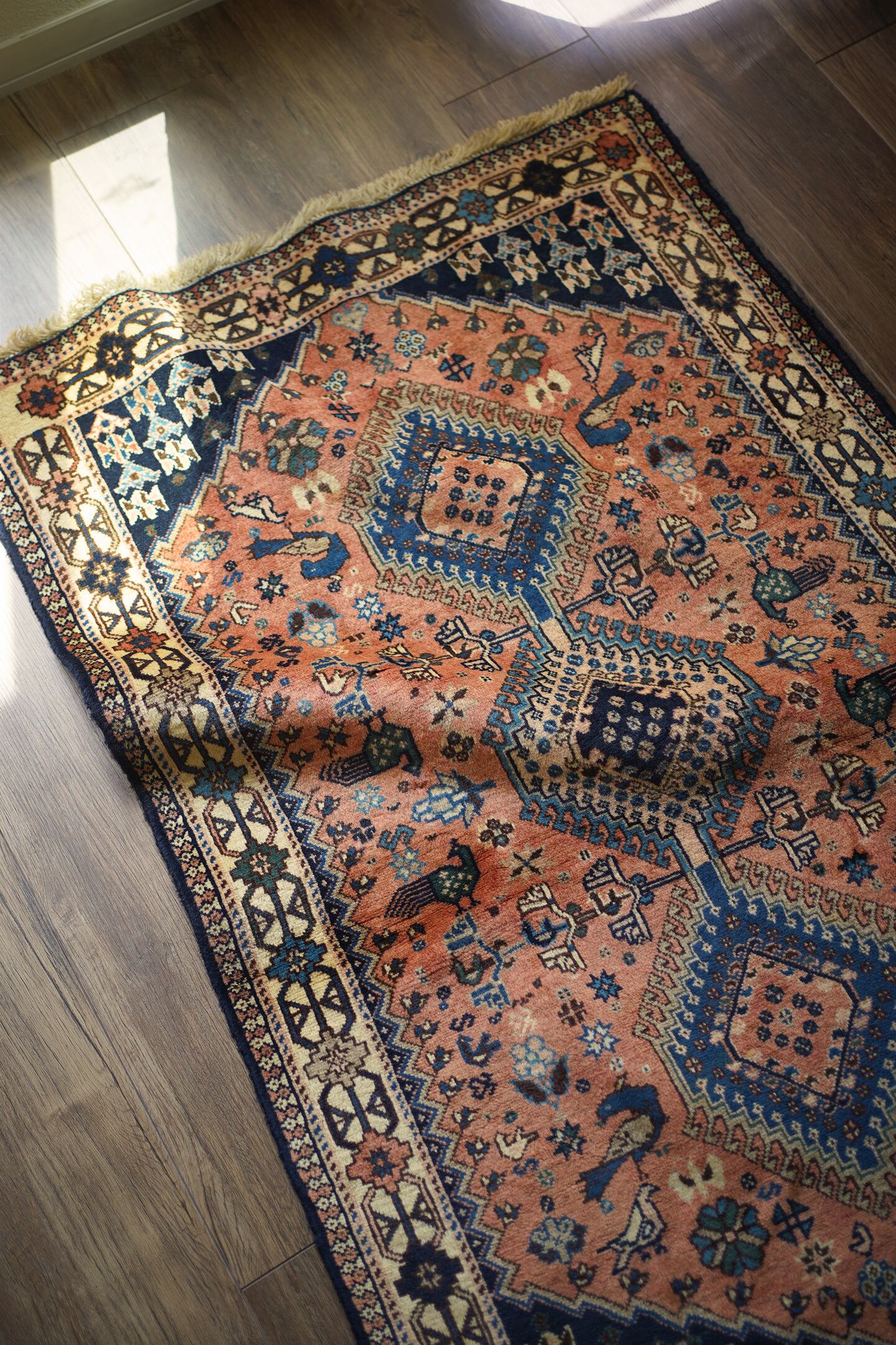 経年50年ほどのイラン・ヤラメ産のペルシャラグ。ヤラメ特有のフックドメダリオンの周りには可愛らしい鳥の紋様や美しい花模様などが織り込まれています。よく見ると鳥も様々なフォルムのタイプがおり、眺めているだけでワクワクしてくる素敵な一枚です。褪せたオレンジ色が渋い雰囲気で、味のあるヴィンテージ感を醸し出しています。またパイルには経年変化による艶も感じられます。毛並みはふわっと滑らかな気持ちの良い肌触りで、厚みは8mm程度。目立ったダメージもなく大変良好なコンディション。玄関スペースや洗面スペース、デスク下に敷いたりと使い勝手の良いサイズ感です♫
