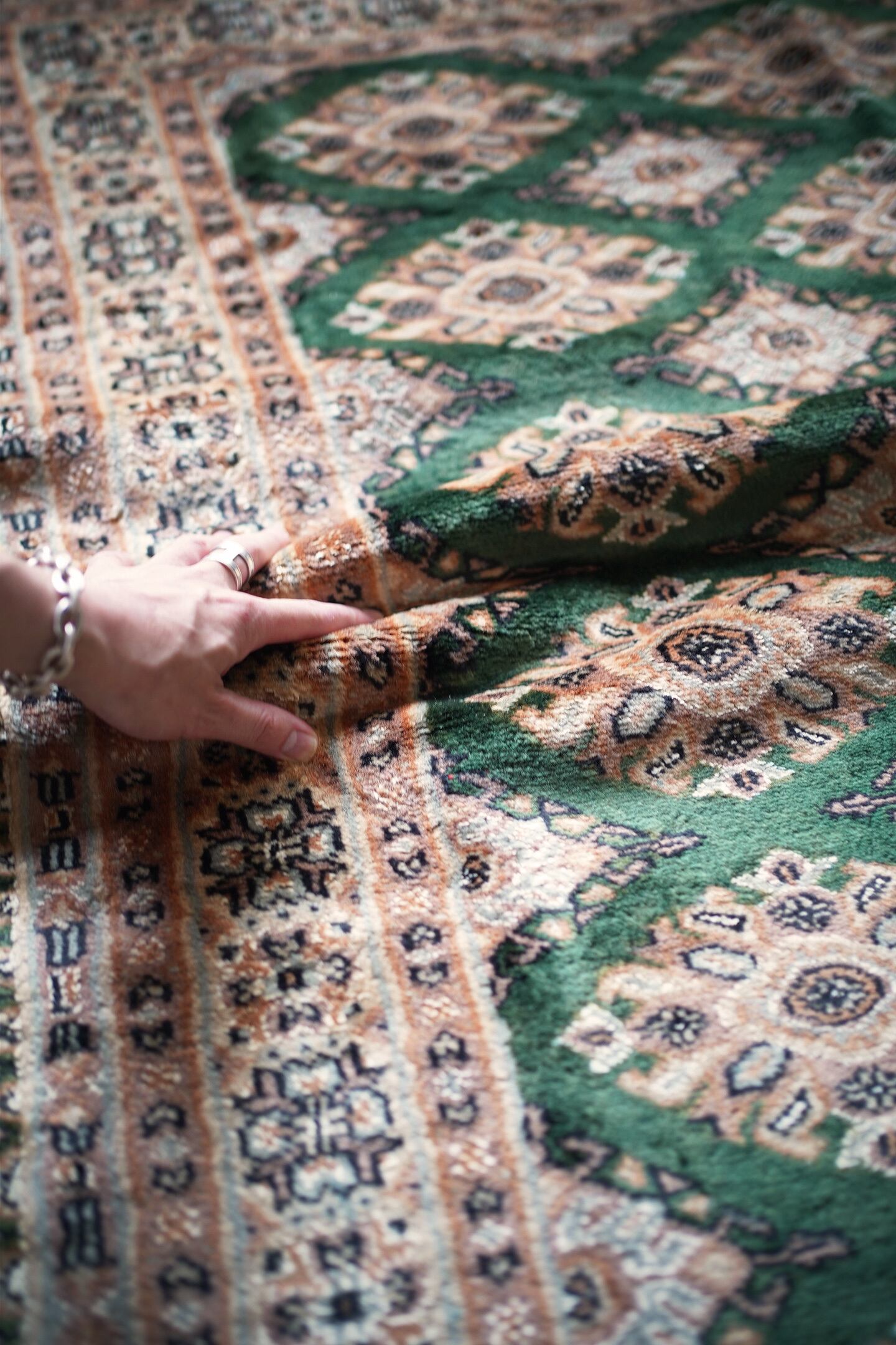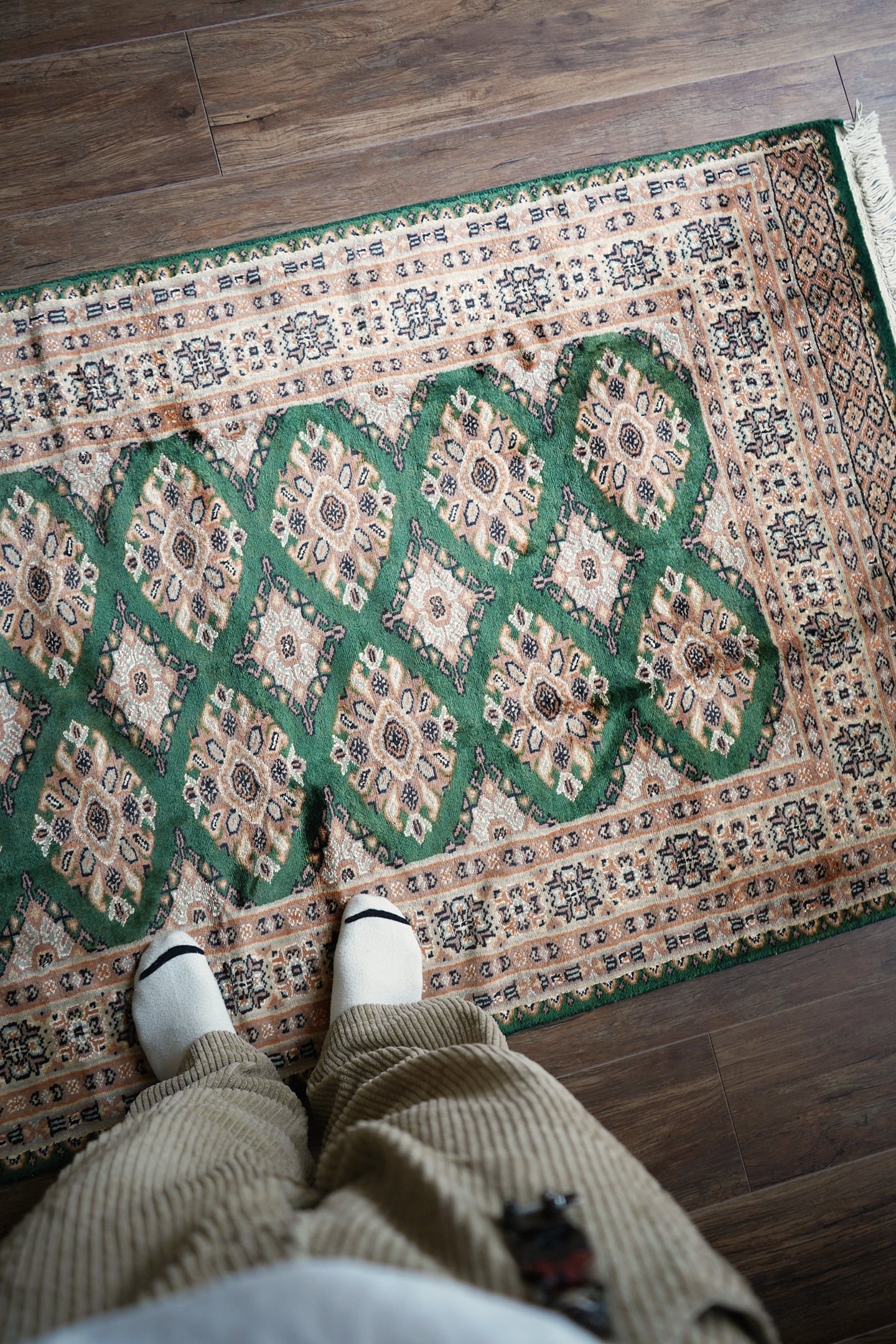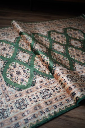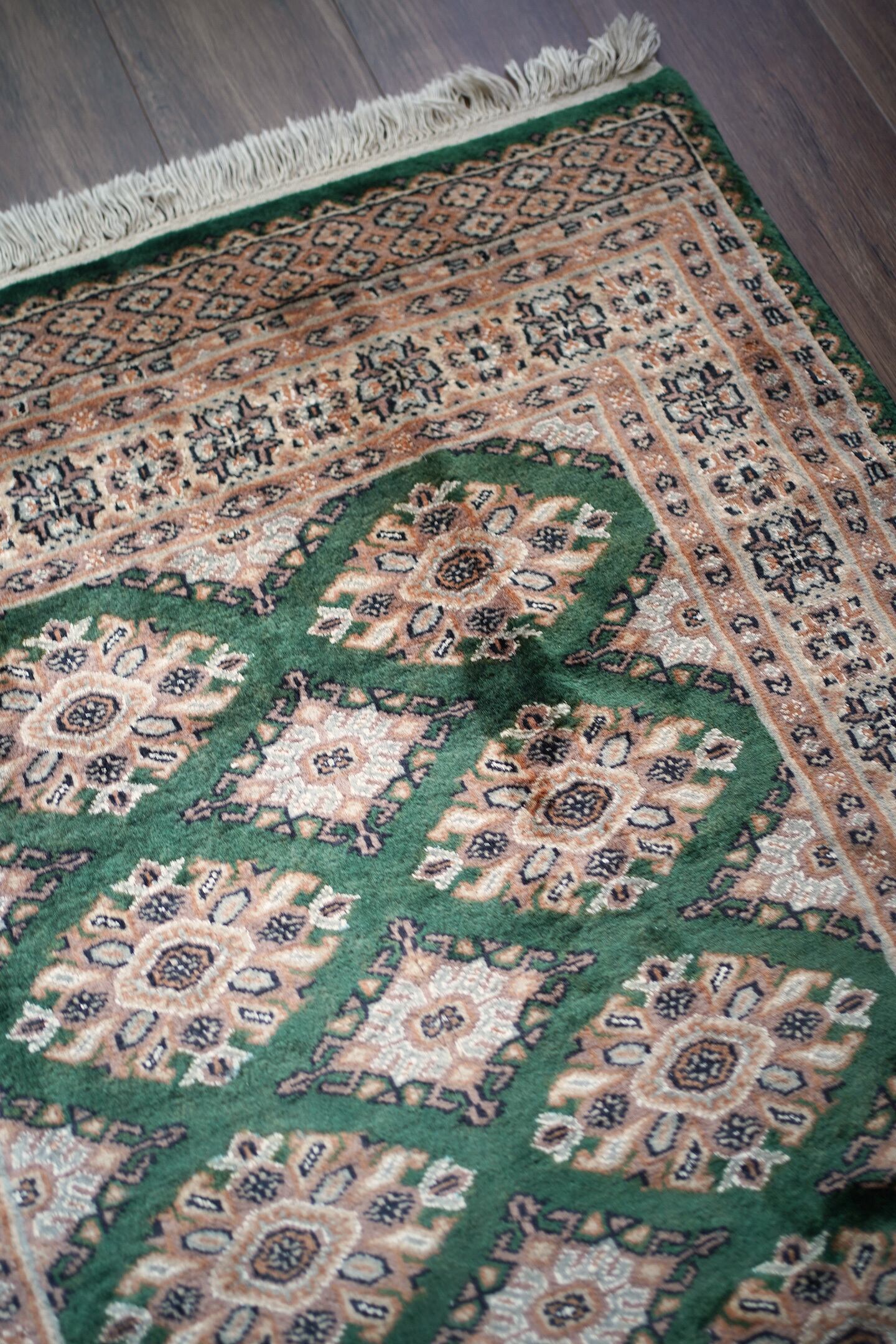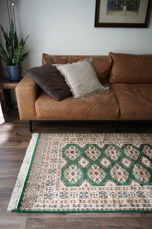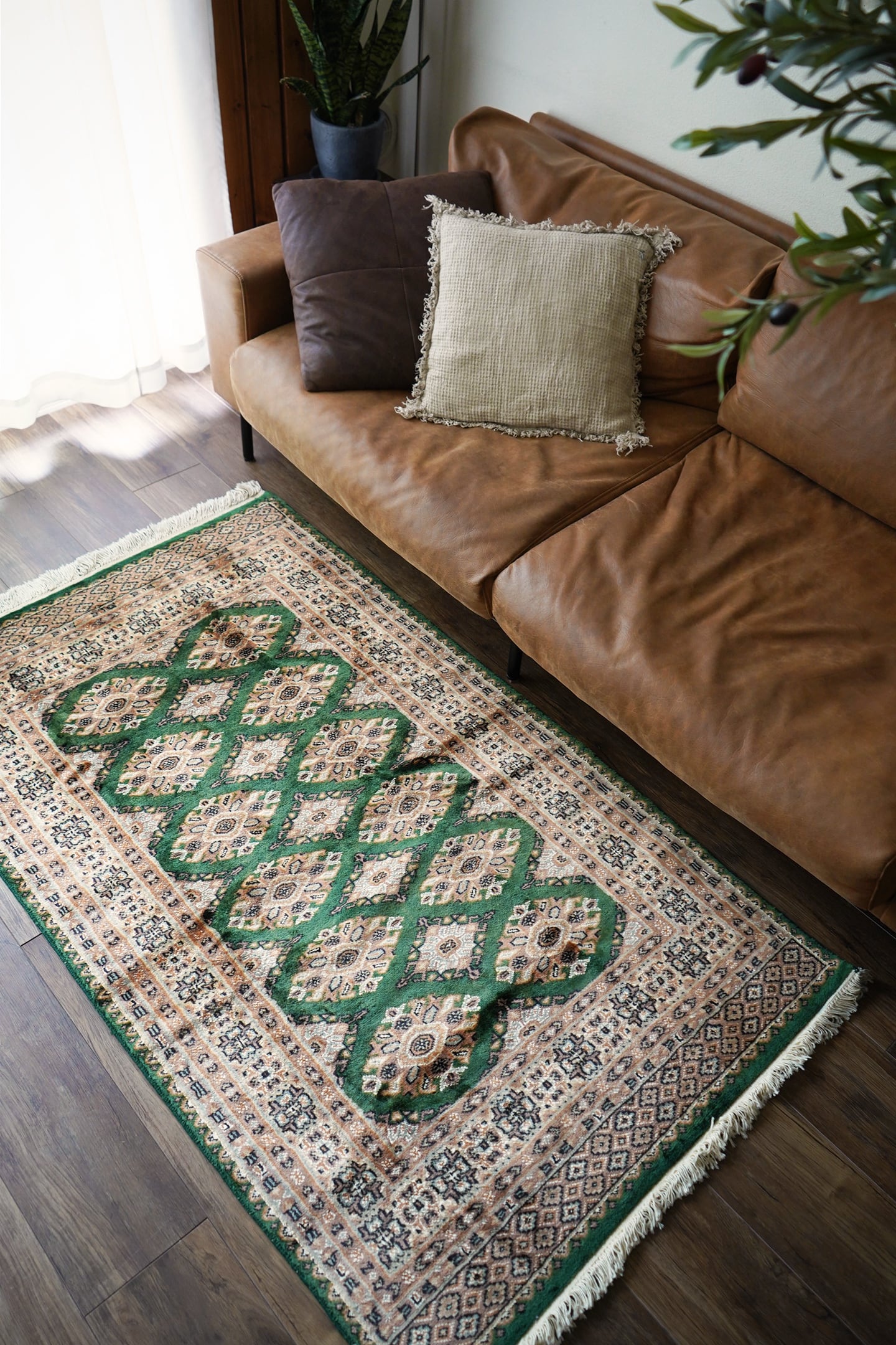 パキスタン北東部の都市ラホールで織られたヴィンテージラグ。光沢感のある艶を纏った深みのあるモスグリーンにパキスタンラグ特有の幾何学模様が織り込まれた美しいデザインが魅力的です。落ち着きと華やさ両方を持ち合わせており、空間を素敵に彩ってくれるかと思います。表面はふわふわと柔らかく、滑らかな気持ちの良い肌触り。厚みは7mmほど。使用感もほとんど見られないパーフェクトなコンディション。ベッドサイドをはじめ、お好みのスペースにどうぞ。