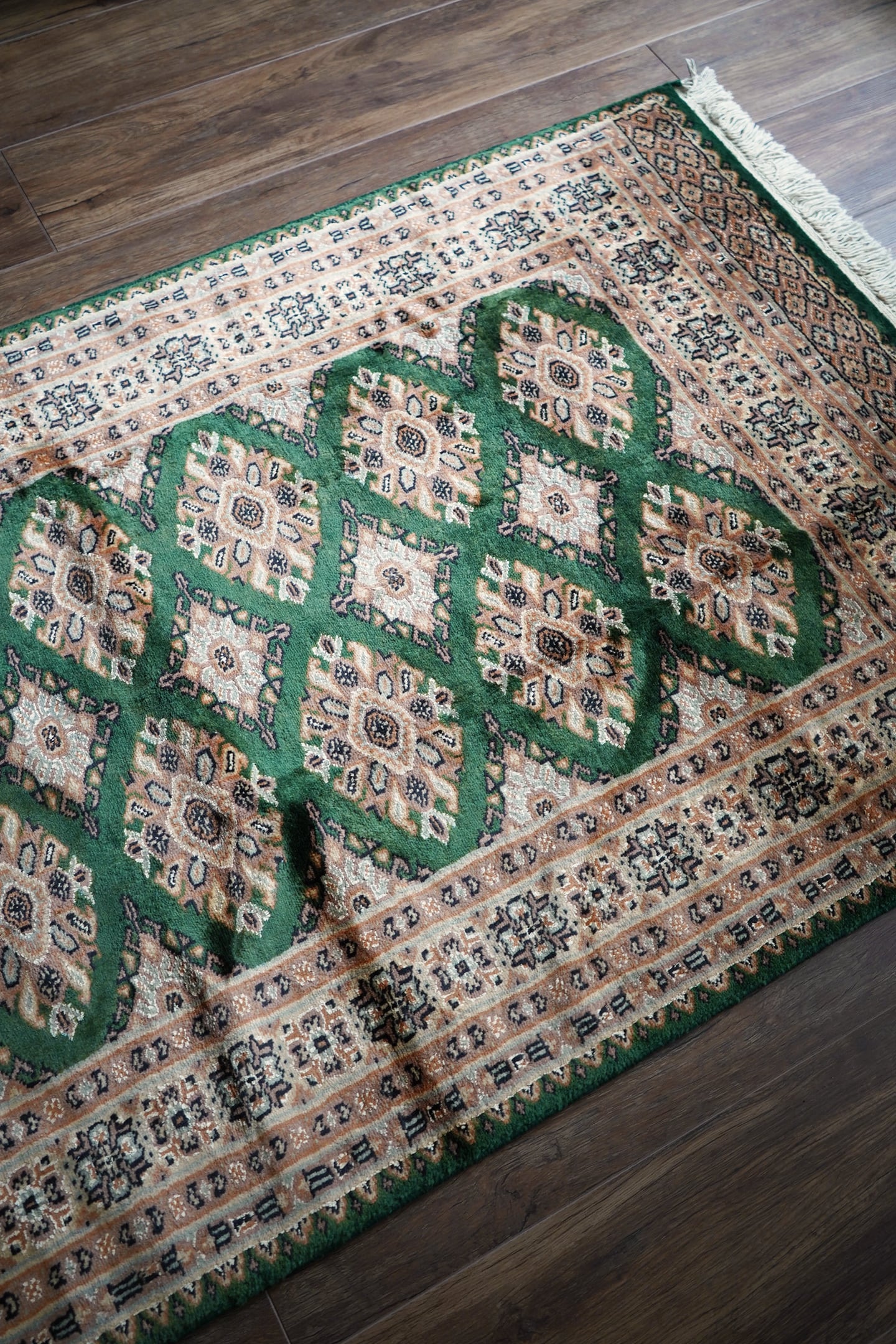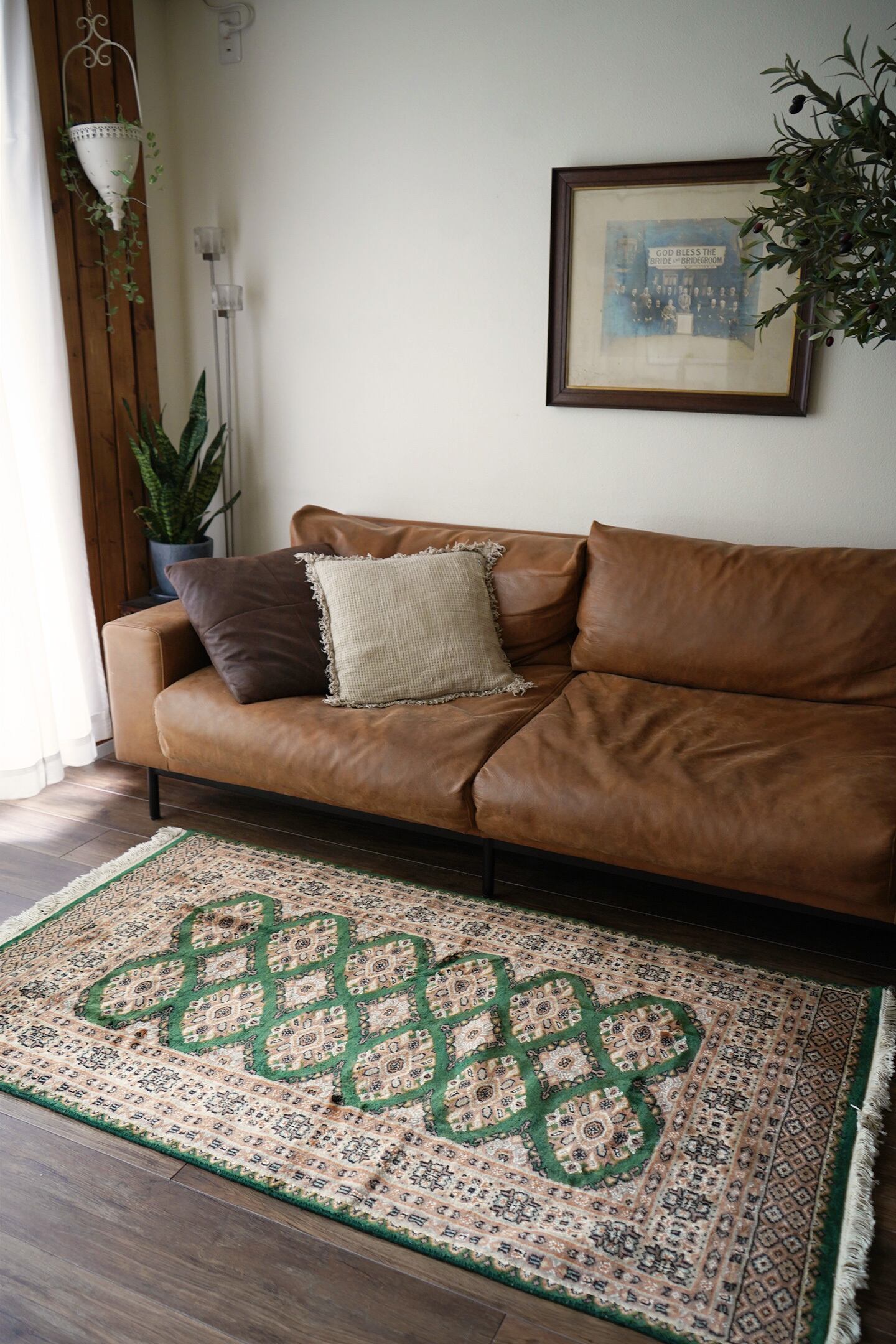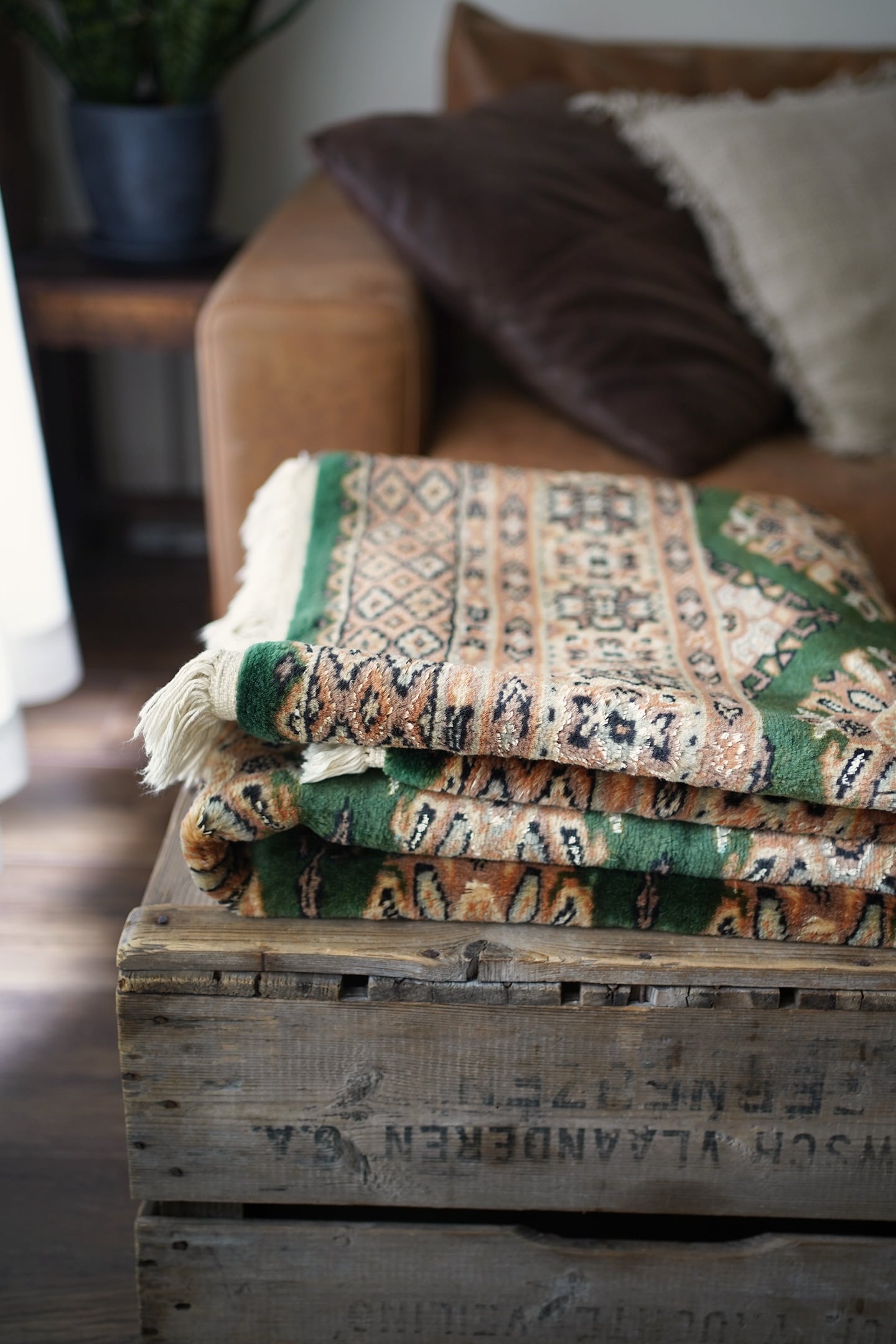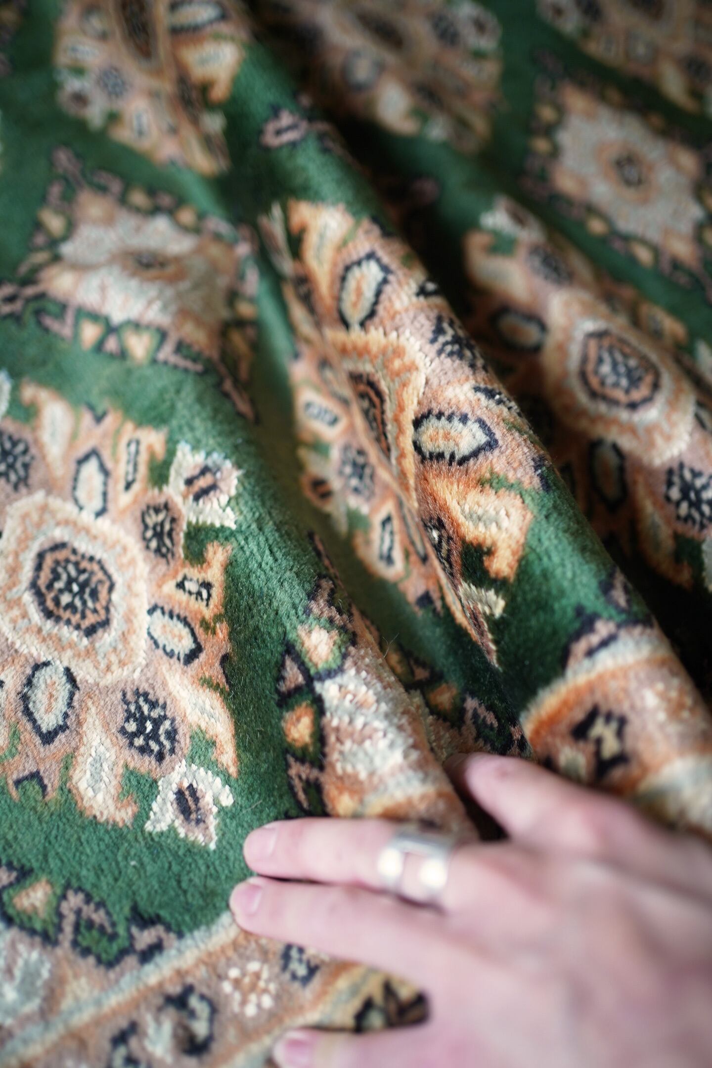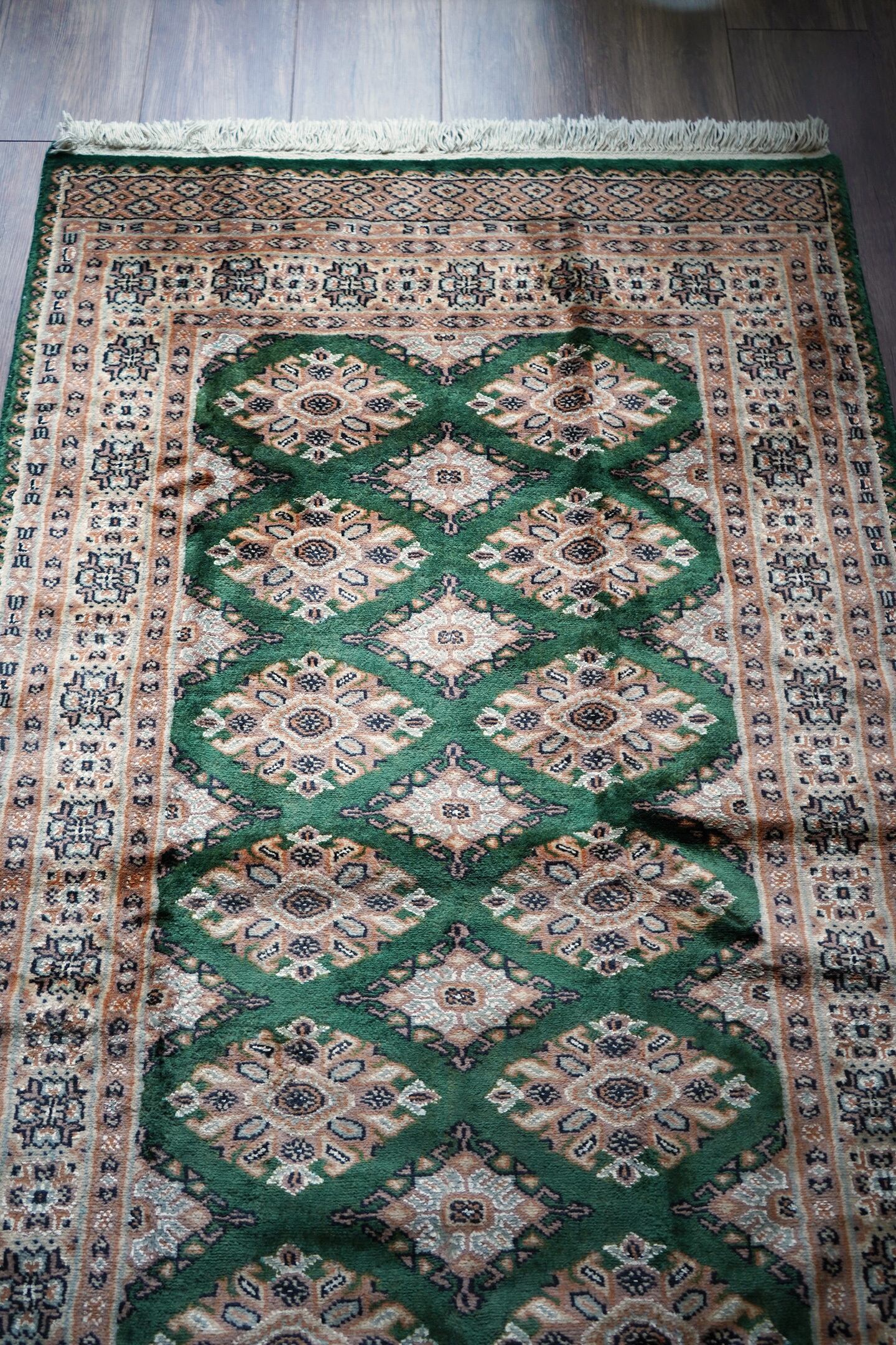 パキスタン北東部の都市ラホールで織られたヴィンテージラグ。光沢感のある艶を纏った深みのあるモスグリーンにパキスタンラグ特有の幾何学模様が織り込まれた美しいデザインが魅力的です。落ち着きと華やさ両方を持ち合わせており、空間を素敵に彩ってくれるかと思います。表面はふわふわと柔らかく、滑らかな気持ちの良い肌触り。厚みは7mmほど。使用感もほとんど見られないパーフェクトなコンディション。ベッドサイドをはじめ、お好みのスペースにどうぞ。
