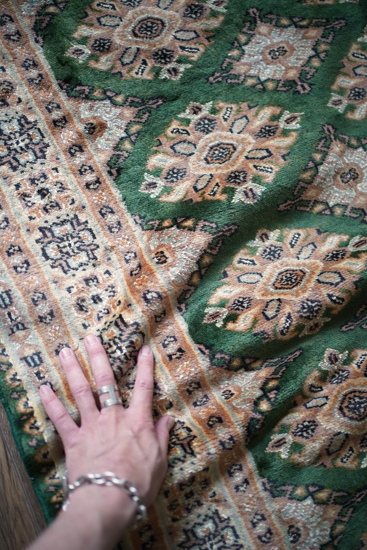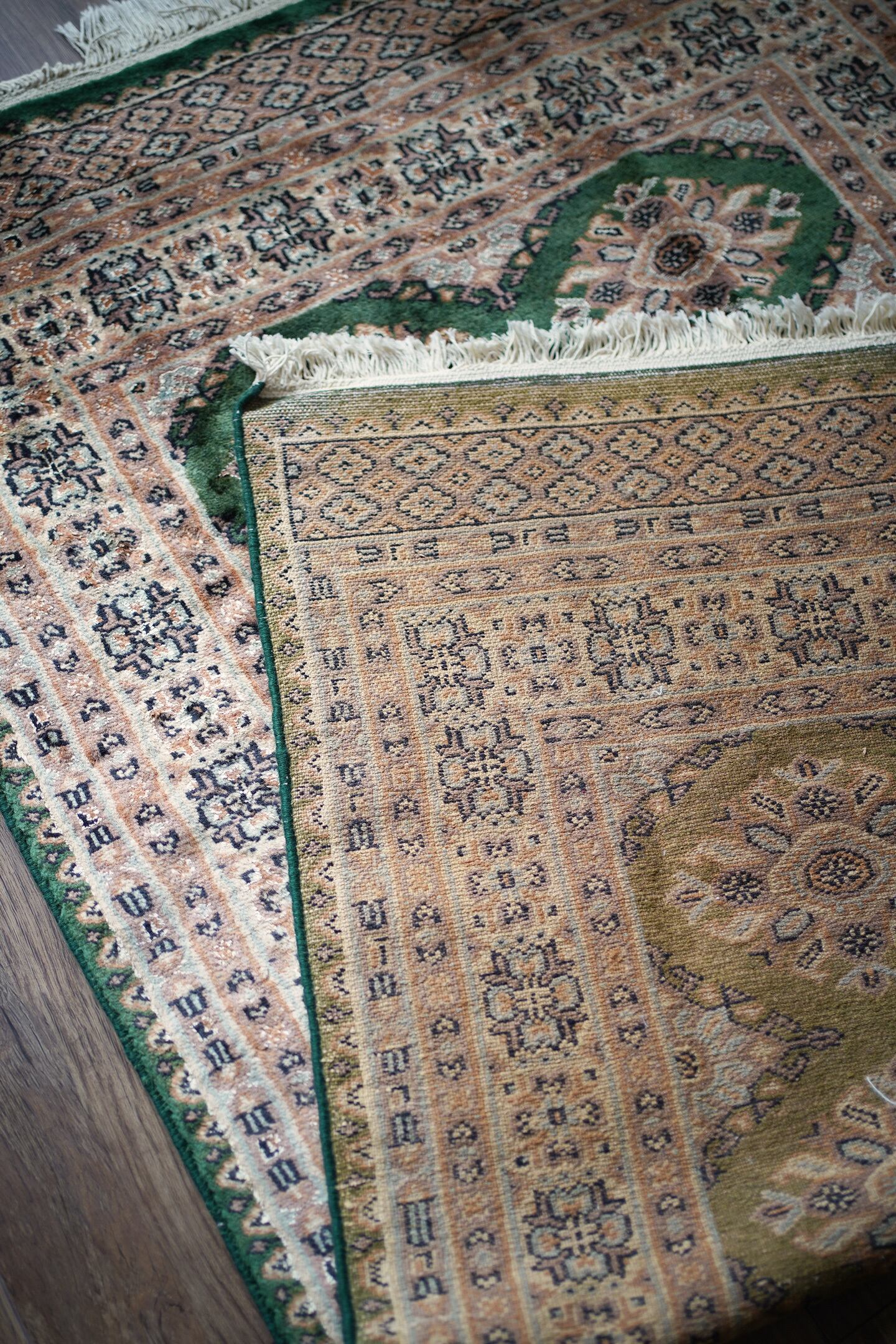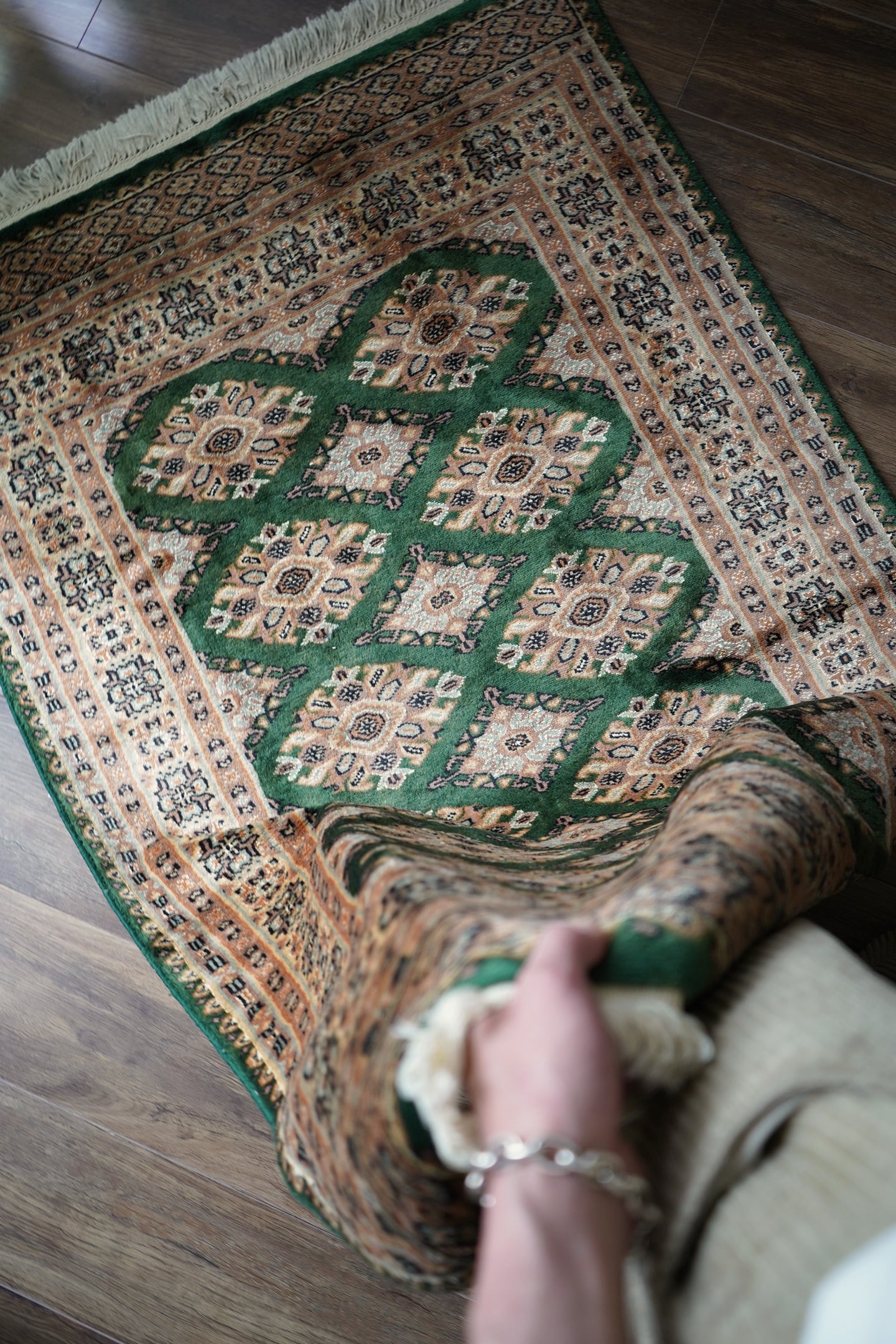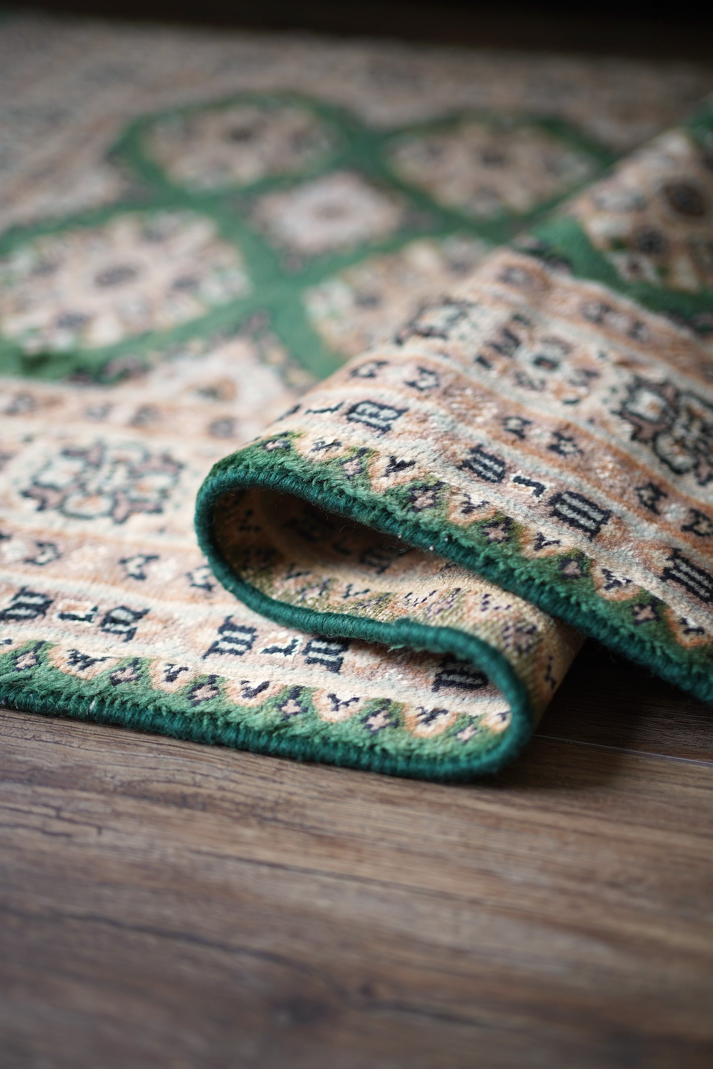 パキスタン北東部の都市ラホールで織られたヴィンテージラグ。光沢感のある艶を纏った深みのあるモスグリーンにパキスタンラグ特有の幾何学模様が織り込まれた美しいデザインが魅力的です。落ち着きと華やさ両方を持ち合わせており、空間を素敵に彩ってくれるかと思います。表面はふわふわと柔らかく、滑らかな気持ちの良い肌触り。厚みは7mmほど。使用感もほとんど見られないパーフェクトなコンディション。ベッドサイドをはじめ、お好みのスペースにどうぞ。