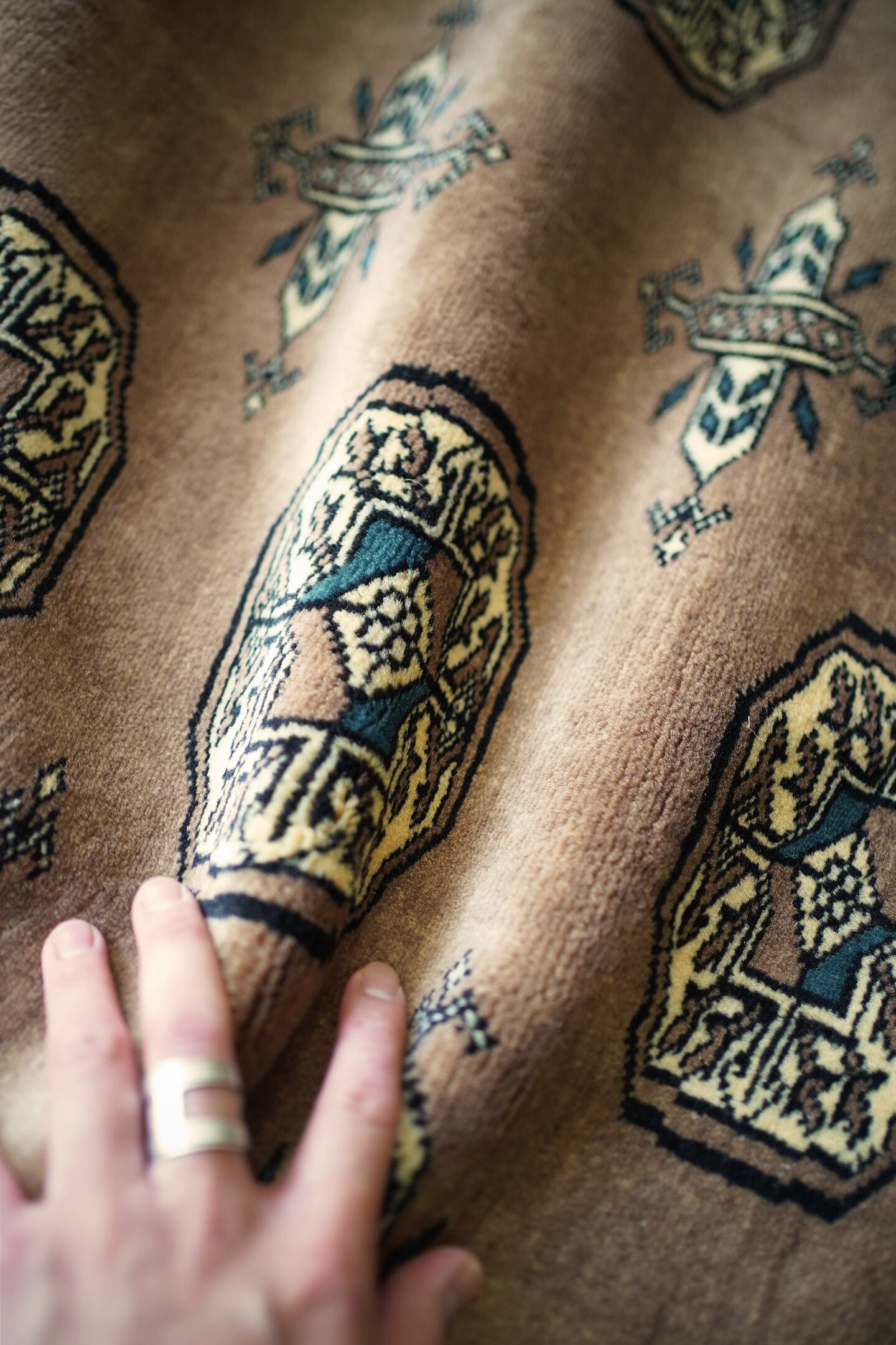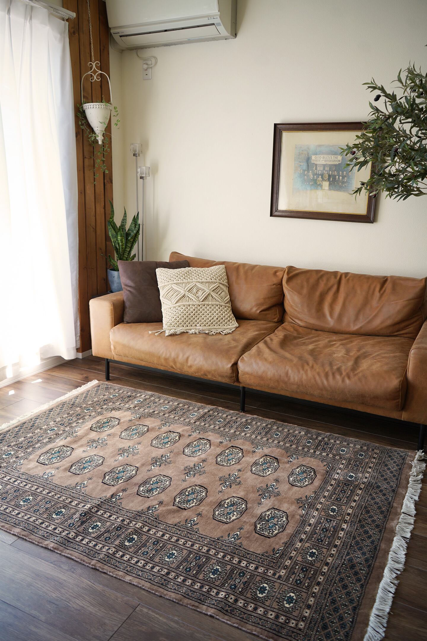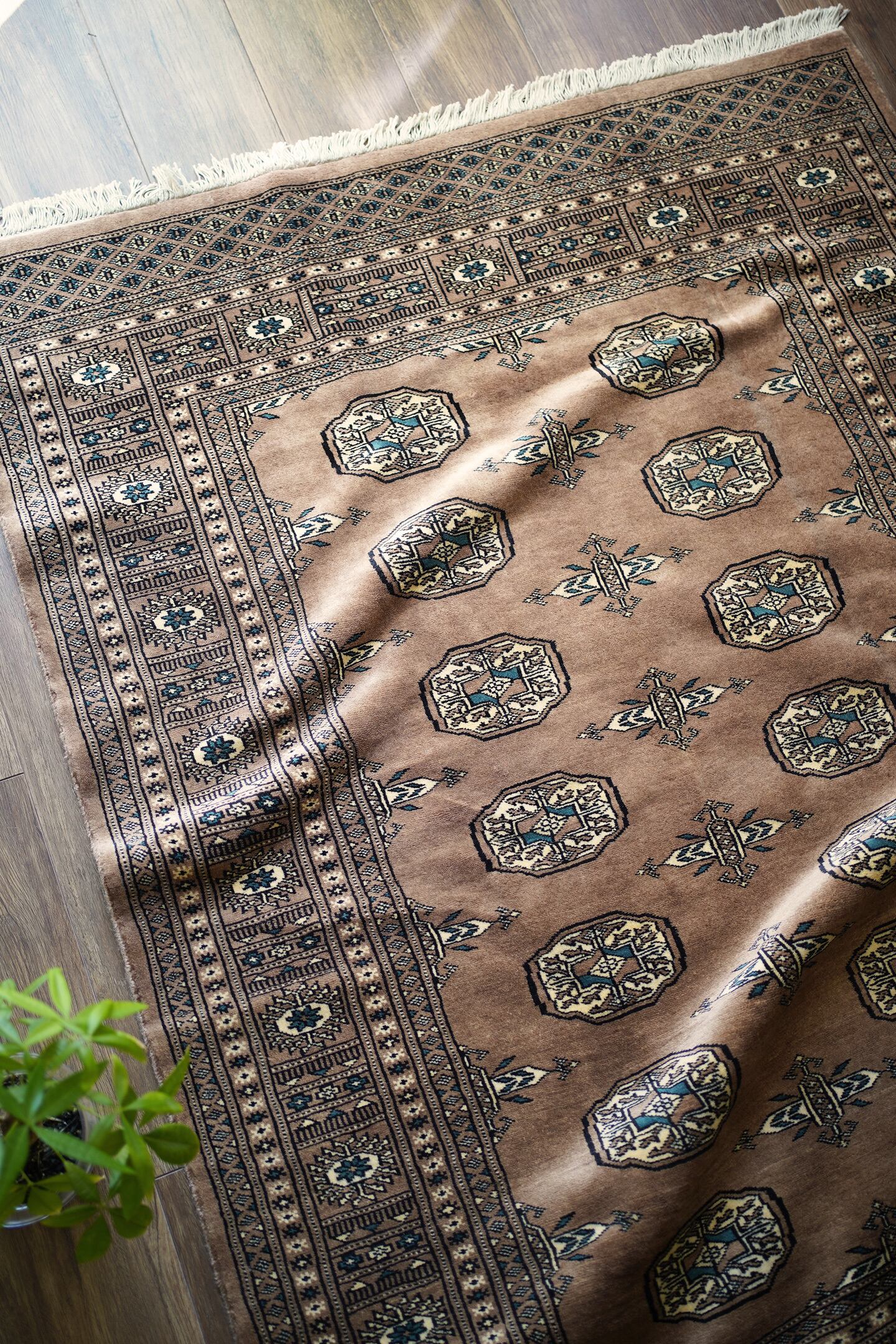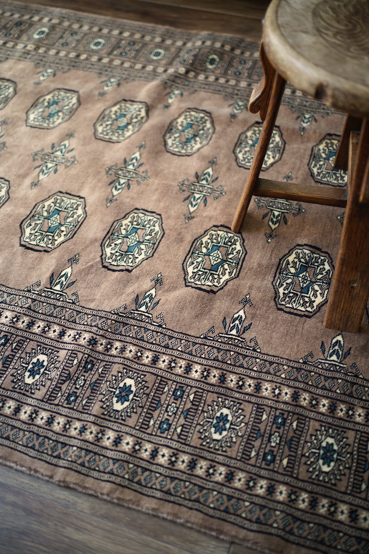 パキスタン北東部の都市ラホールで織られたヴィンテージラグ。"ボハラ"と呼ばれる象の足跡をモデルにしたとされる紋様が織り込まれたデザインです。ブラウンとグレーの中間色をベースに、さりげなく施されたブルーグリーンのアクセントが非常に素敵で、一目惚れで仕入れを決めました。落ち着きのある色調なので、インテリアとの相性も良く空間にすっと馴染みながら上品な存在感を与えてくれます。表面はソフトウールで、ふわっと柔らかく弾力感のある気持ちの良い肌触りをしています。フラットに整った毛並みから非常に高品質な印象を受けます。厚みは1cmほど。こちらはデッドストックの未使用品のため、使用感もなくパーフェクトなコンディション。リビングのソファ前や寝室、書斎などお好みのスペースにどうぞ。