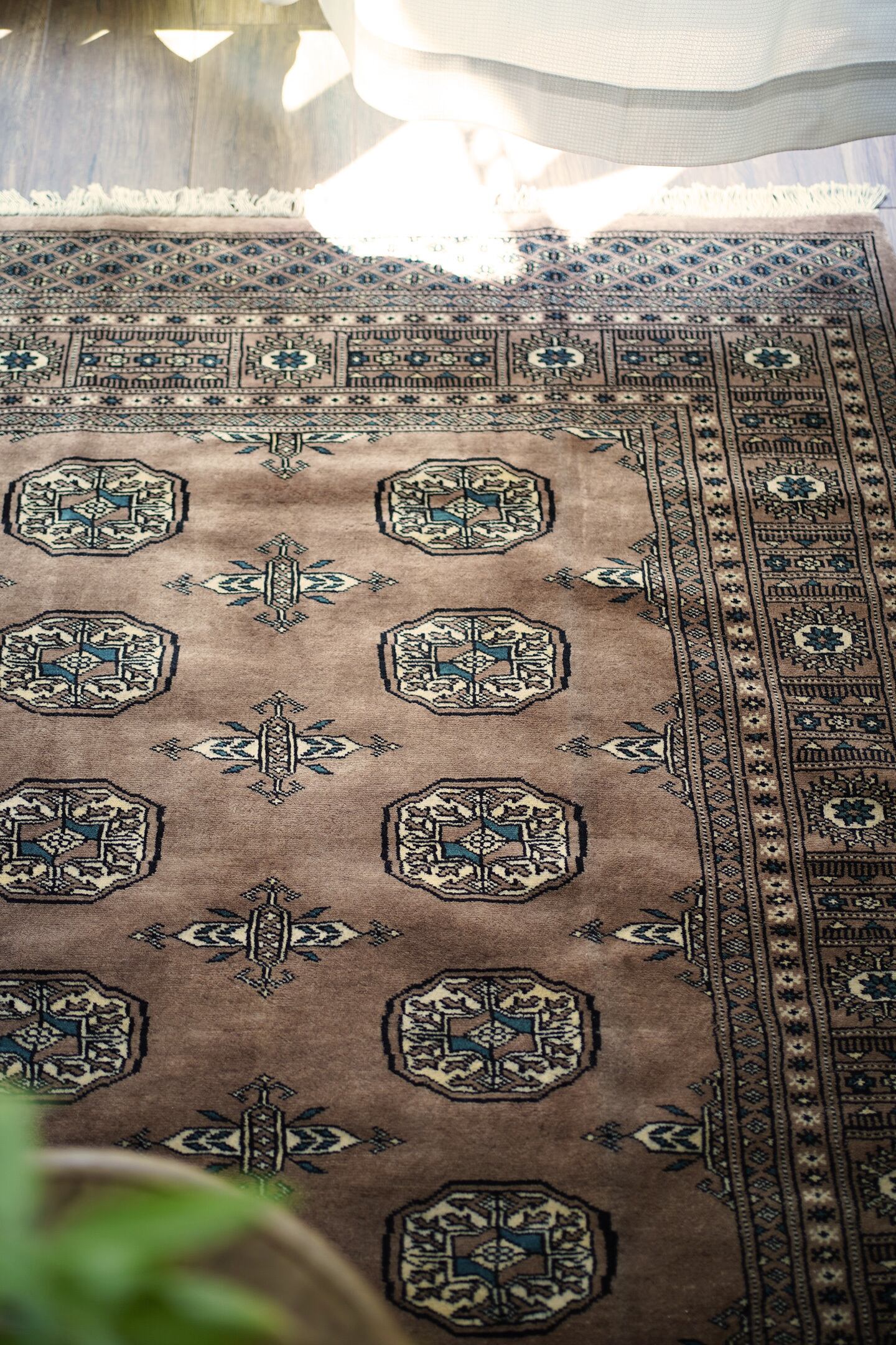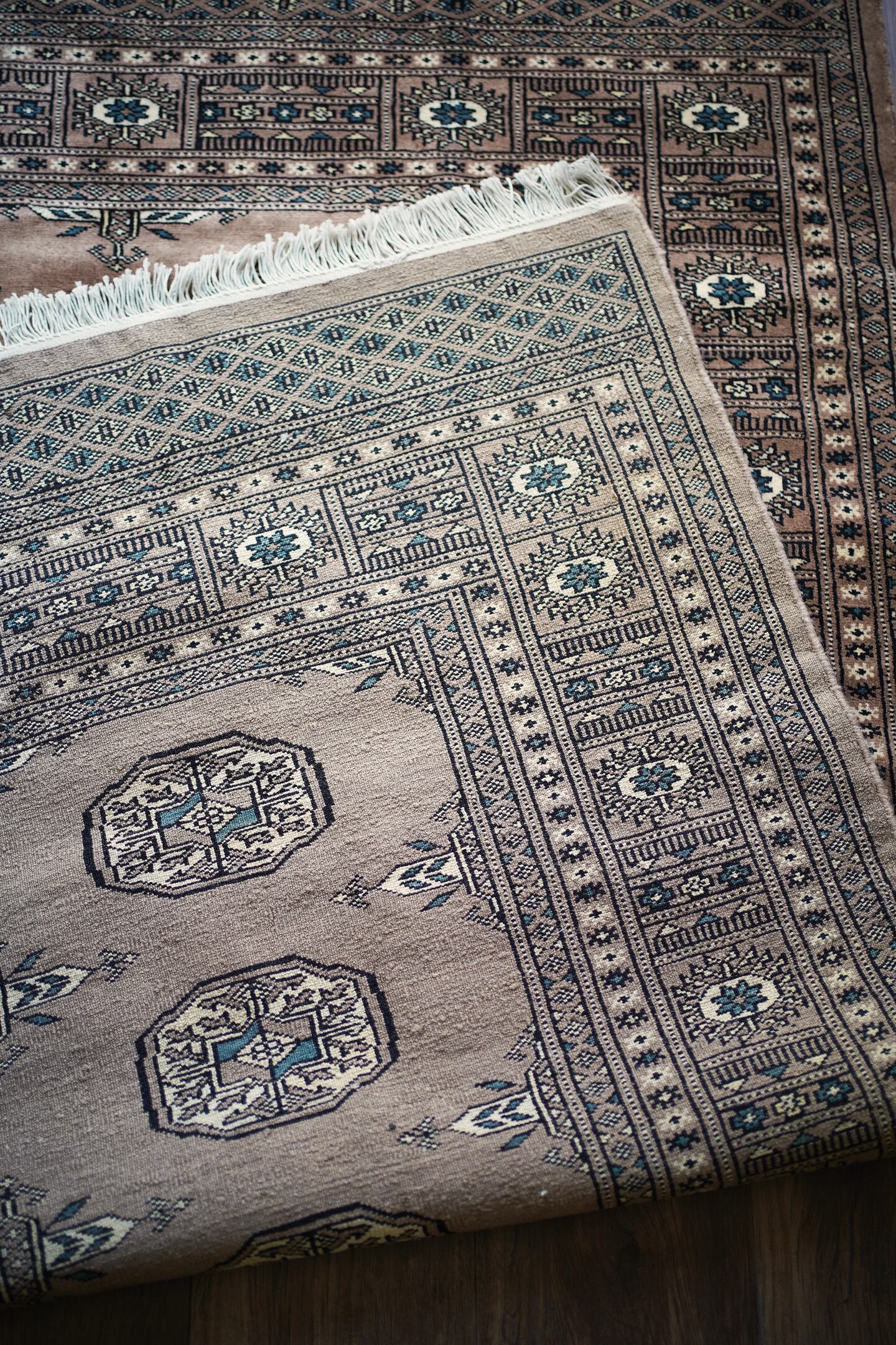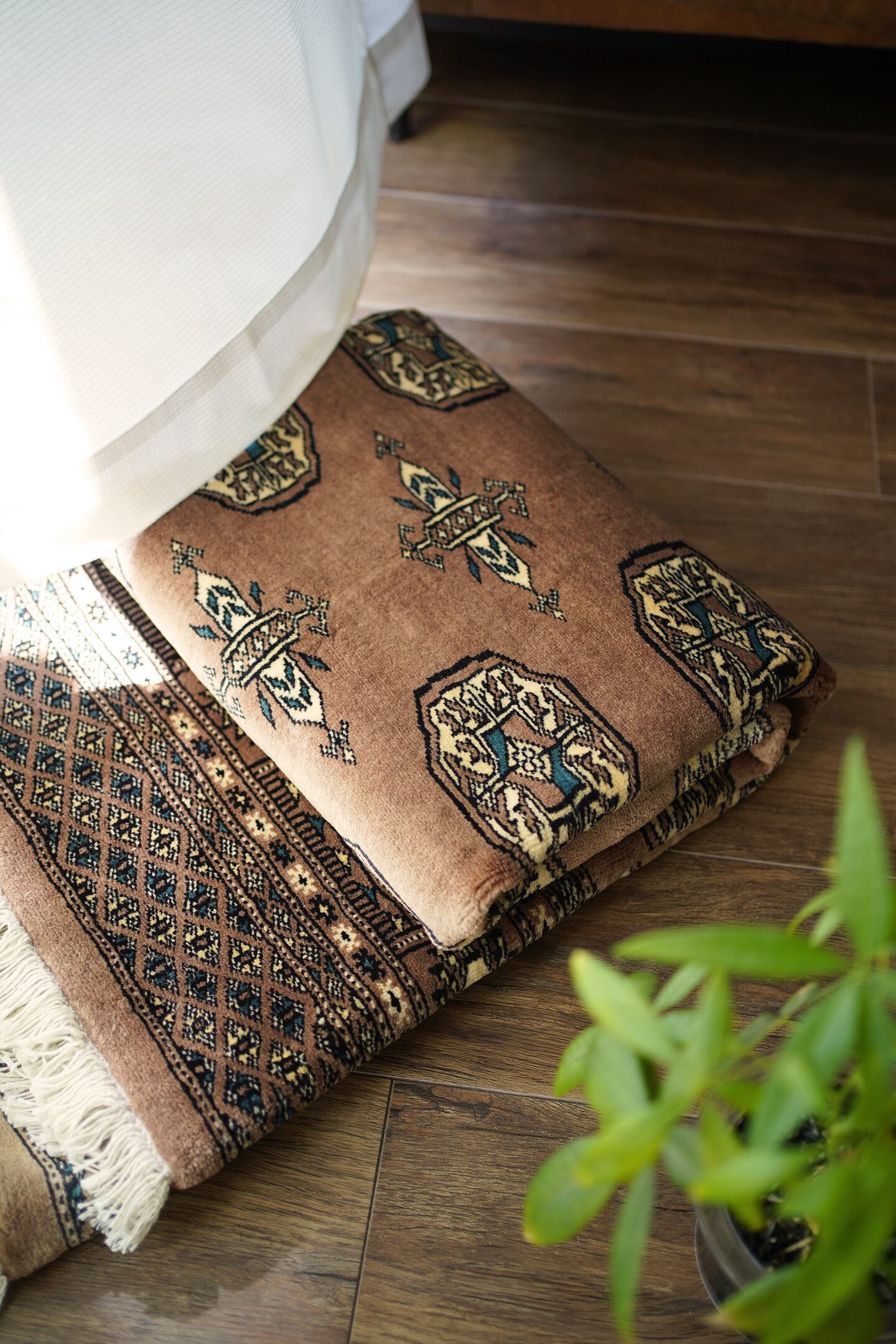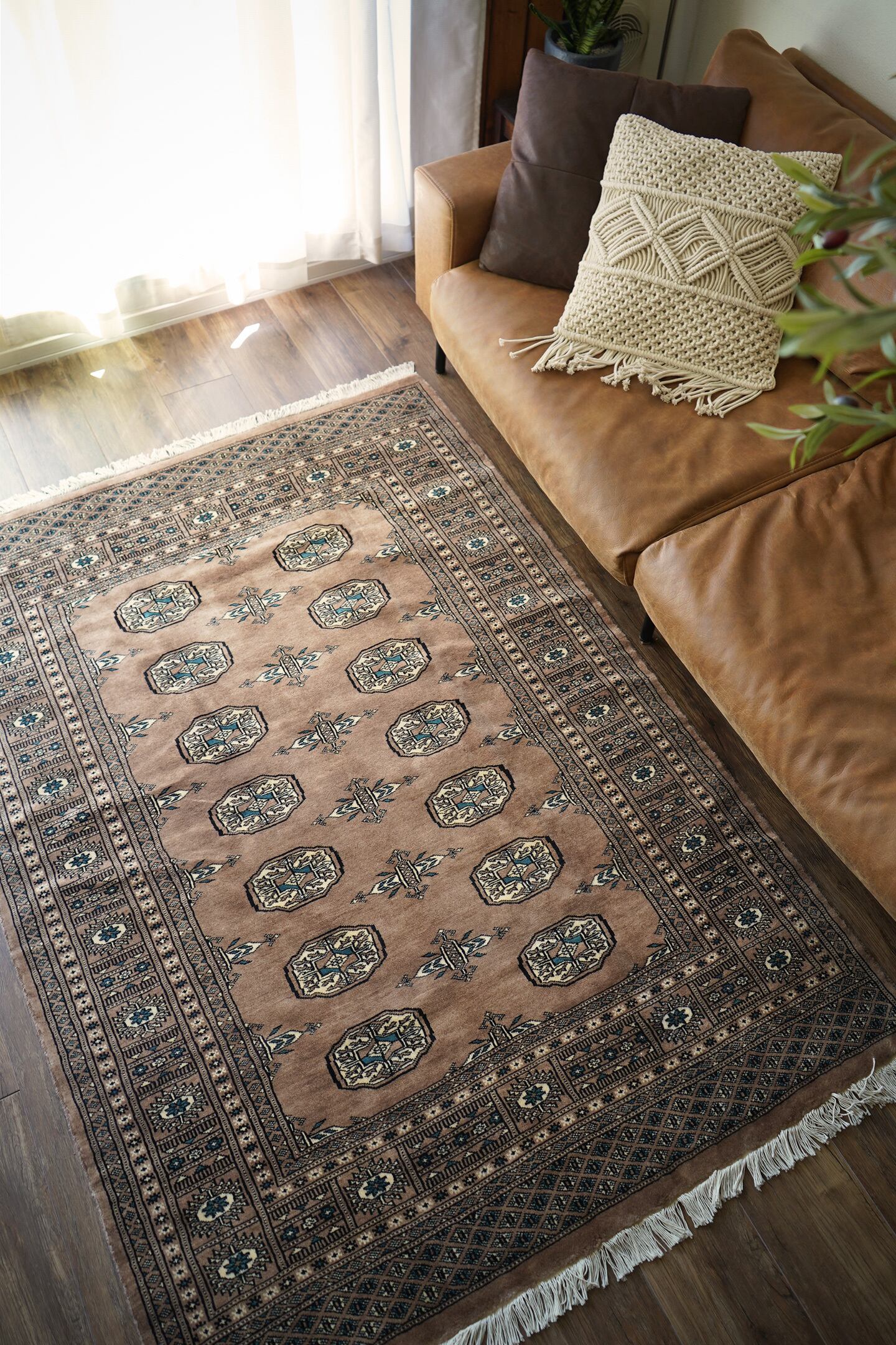 パキスタン北東部の都市ラホールで織られたヴィンテージラグ。"ボハラ"と呼ばれる象の足跡をモデルにしたとされる紋様が織り込まれたデザインです。ブラウンとグレーの中間色をベースに、さりげなく施されたブルーグリーンのアクセントが非常に素敵で、一目惚れで仕入れを決めました。落ち着きのある色調なので、インテリアとの相性も良く空間にすっと馴染みながら上品な存在感を与えてくれます。表面はソフトウールで、ふわっと柔らかく弾力感のある気持ちの良い肌触りをしています。フラットに整った毛並みから非常に高品質な印象を受けます。厚みは1cmほど。こちらはデッドストックの未使用品のため、使用感もなくパーフェクトなコンディション。リビングのソファ前や寝室、書斎などお好みのスペースにどうぞ。