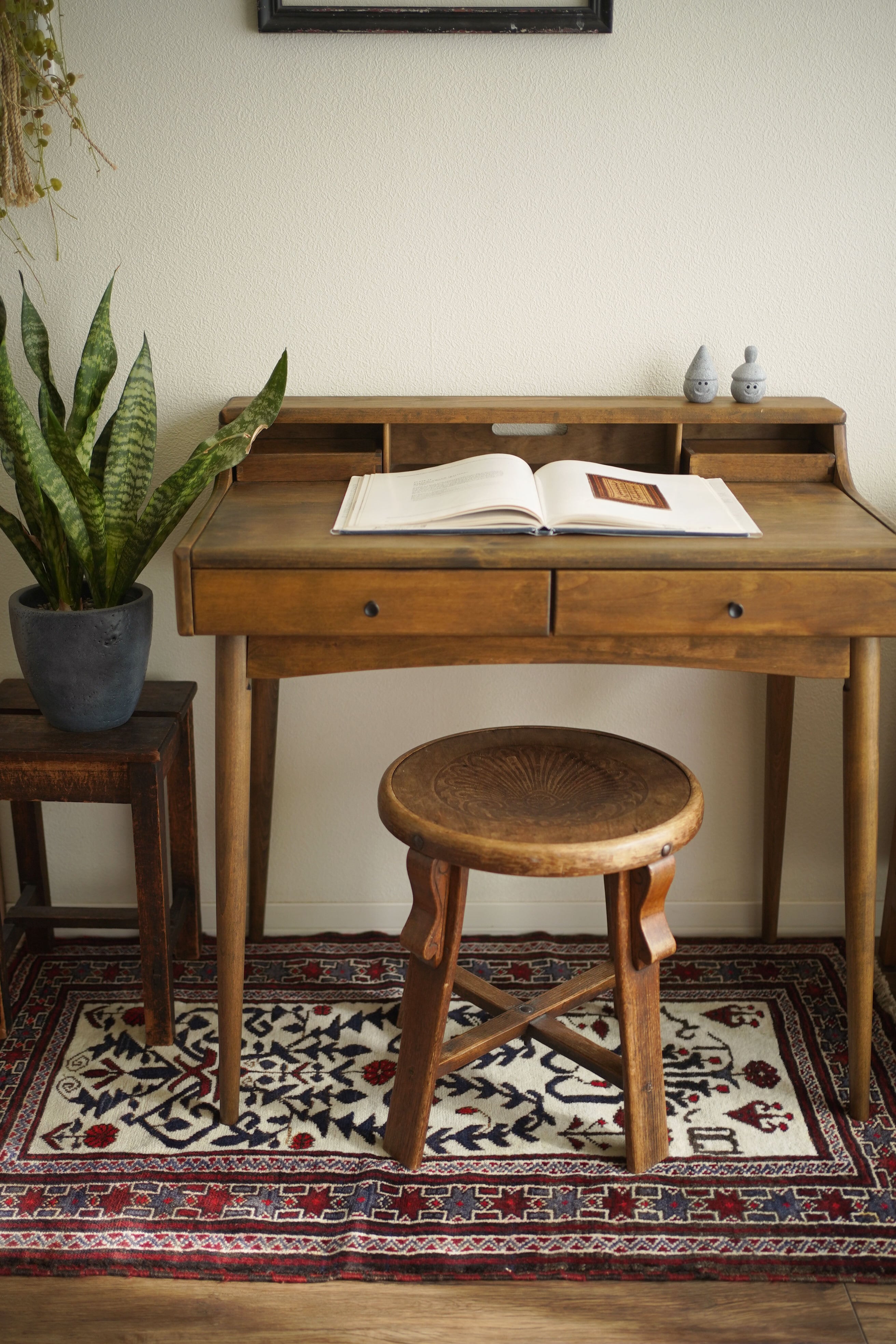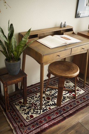 アフガニスタン・ヘラート地方のマシュワニ族によって織られたバラジャスタラグです。対称的に咲く草花や動きのある蔦のような珍しいモチーフが美しく織り込まれています。アイボリー、濃厚、赤、えんじ、グレーの配色で品を感じる色合いが目を惹きます。表面はふわっと柔らかく気持ちの良い肌触りで、8mm程度の厚みです。ダメージや補修跡も見受けられず大変良好なコンディション。扱いやすいサイズ感で、玄関やベッドサイド、チェアの足元など、様々なスペースを華やかに彩ってくれます♫