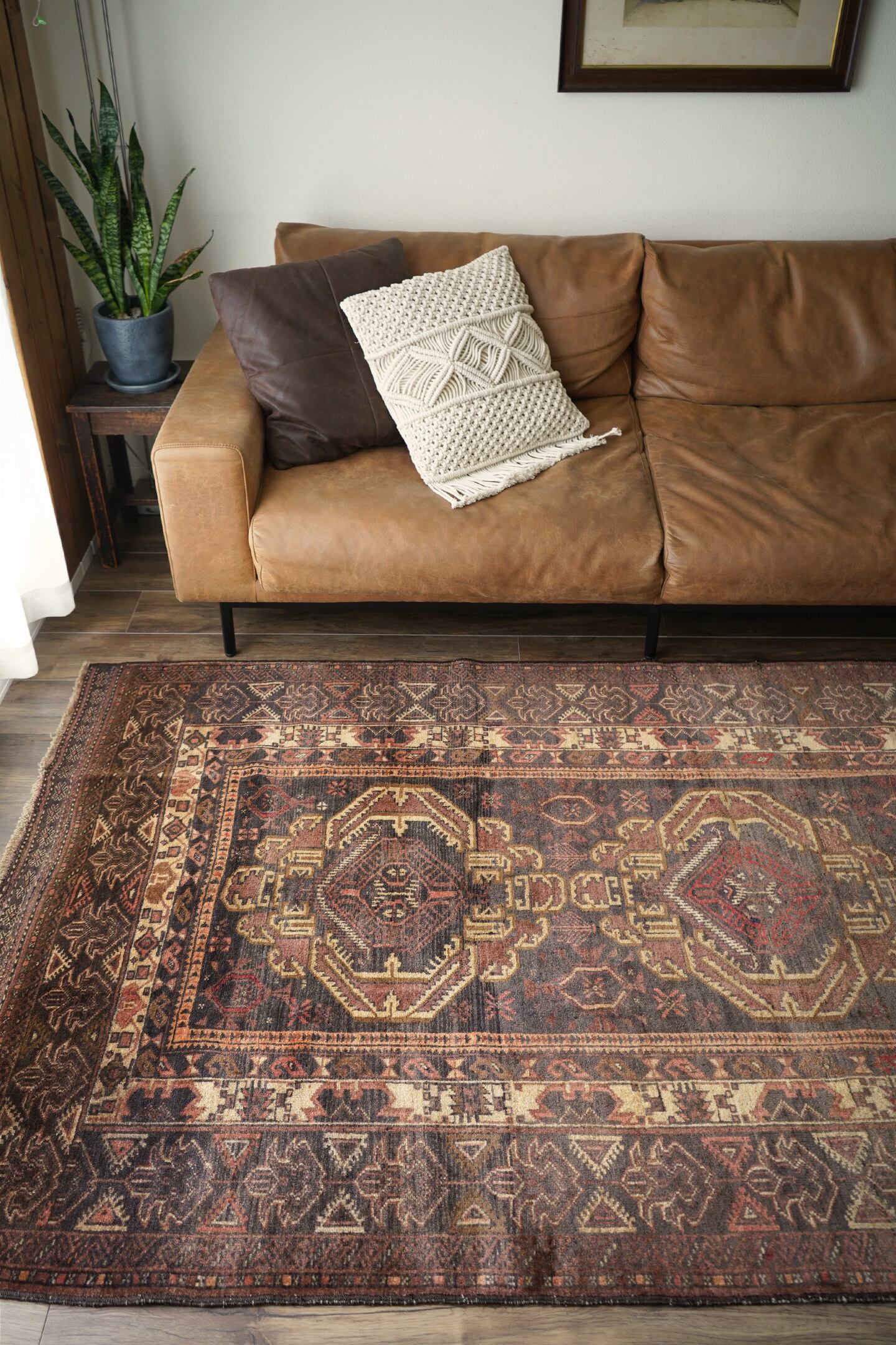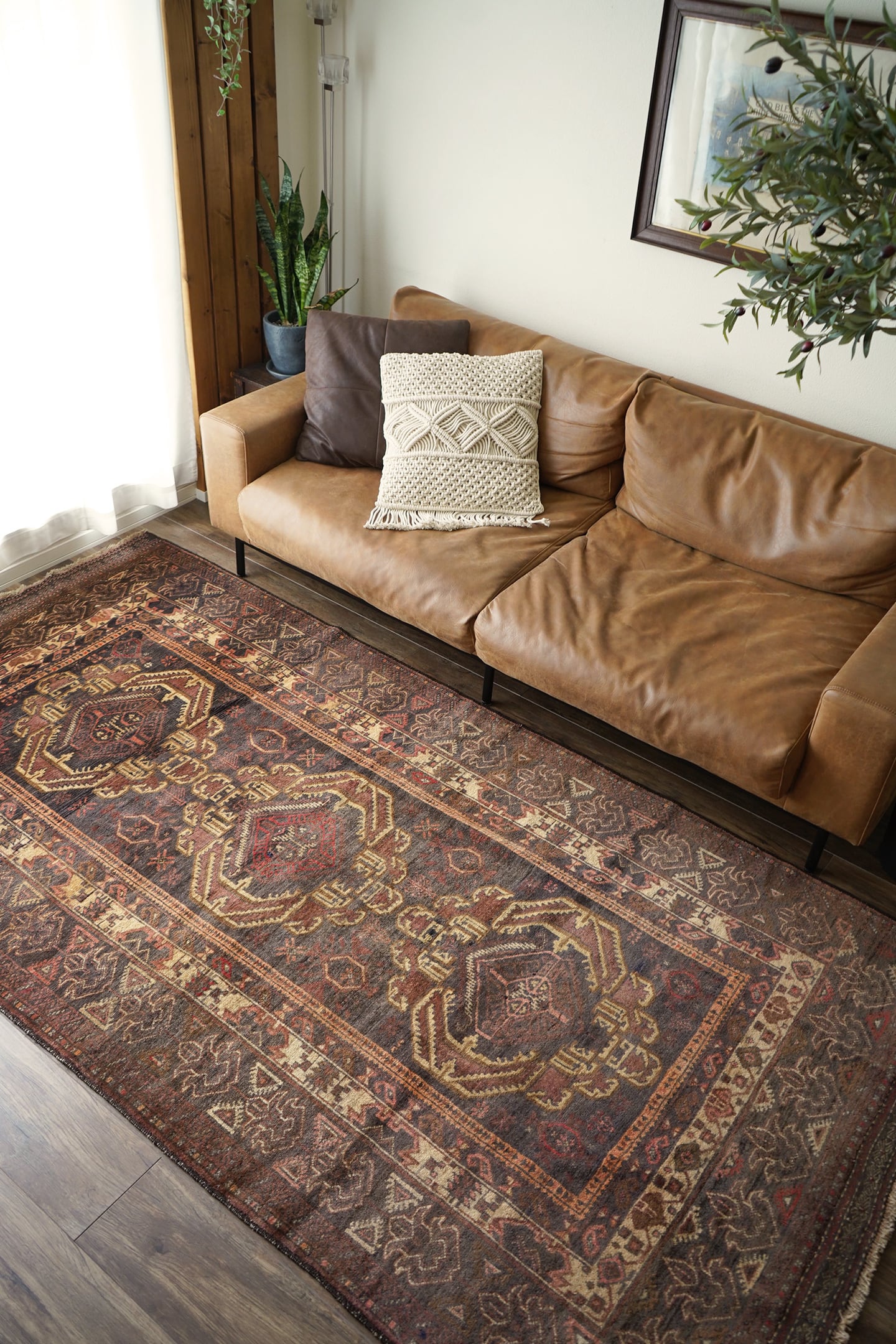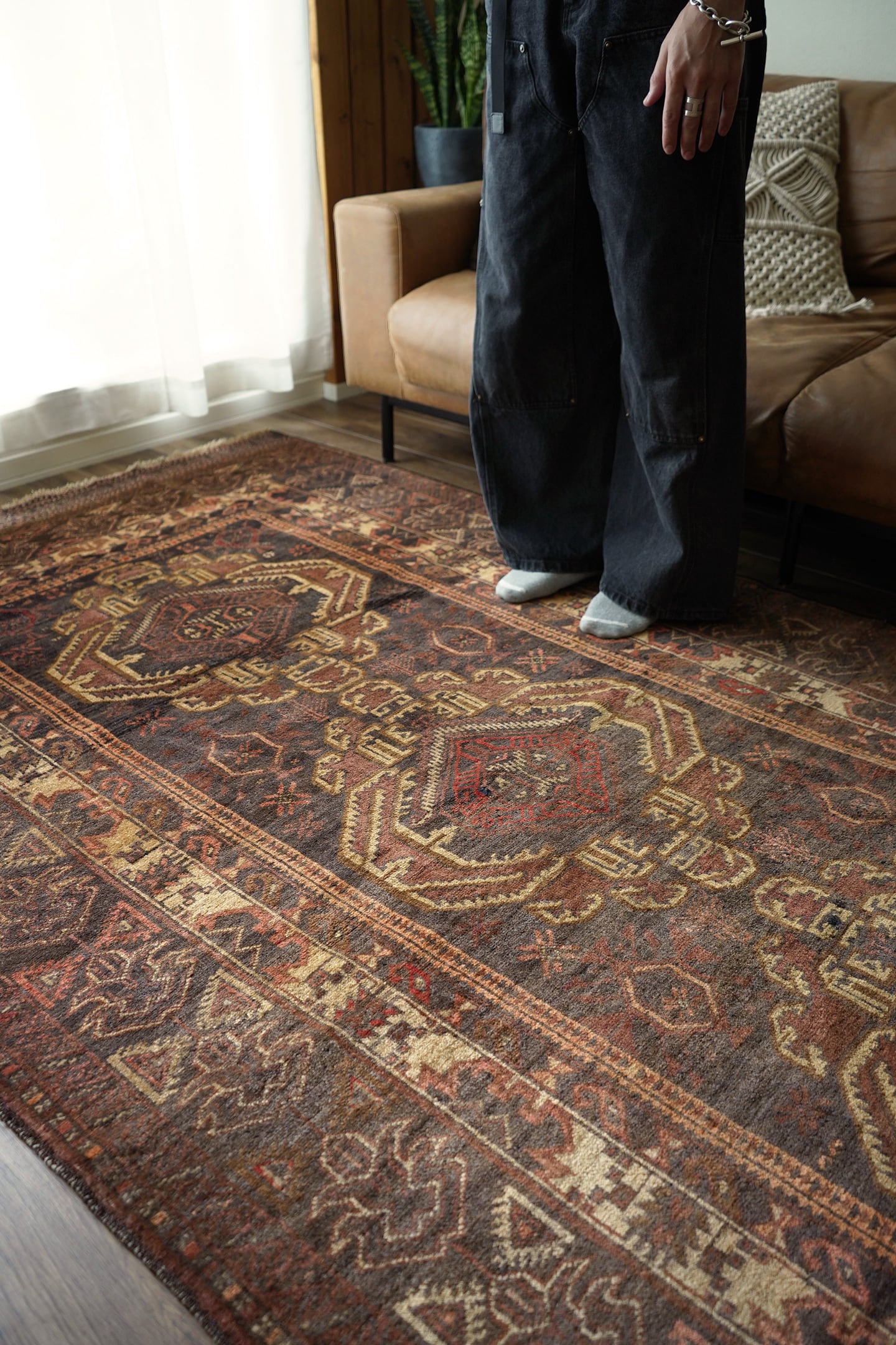 約70年前にアフガニスタンでバルーチ族の手によって織られたヴィンテージラグ。中央に連なる八角形メダリオンと繊細な部族モチーフが織りなす、重厚で力強いデザインが魅力的です。両端はキリムエンド仕様になっており、経年による風合いと相まって、より一層味わい深さを引き立てています。配色はブラウン、ブラック、ベージュ、薄いオレンジなど落ち着いたトーンで統一され、全体に褪せたような風合いが渋く格好良い雰囲気を演出しています。パイルはふわっと滑らかで気持ちの良い肌触り。厚みは約7mm程度あり、通年で心地よくご使用いただける質感です。いくつか小さな補修跡が見られますが、しっかりと馴染んでおり、全体の美観を損なうものではありません。渋みのある大判のバルーチラグをお探しの方には特におすすめの一枚です♫