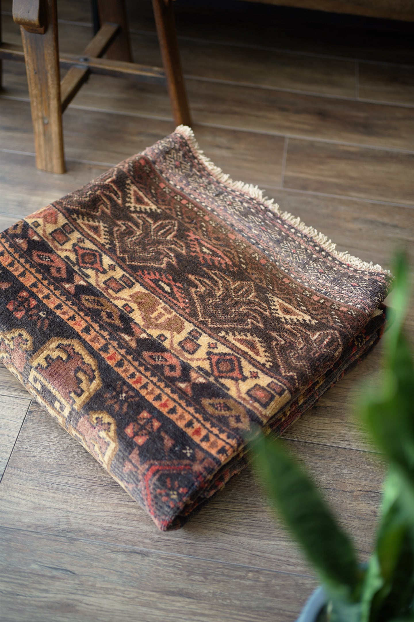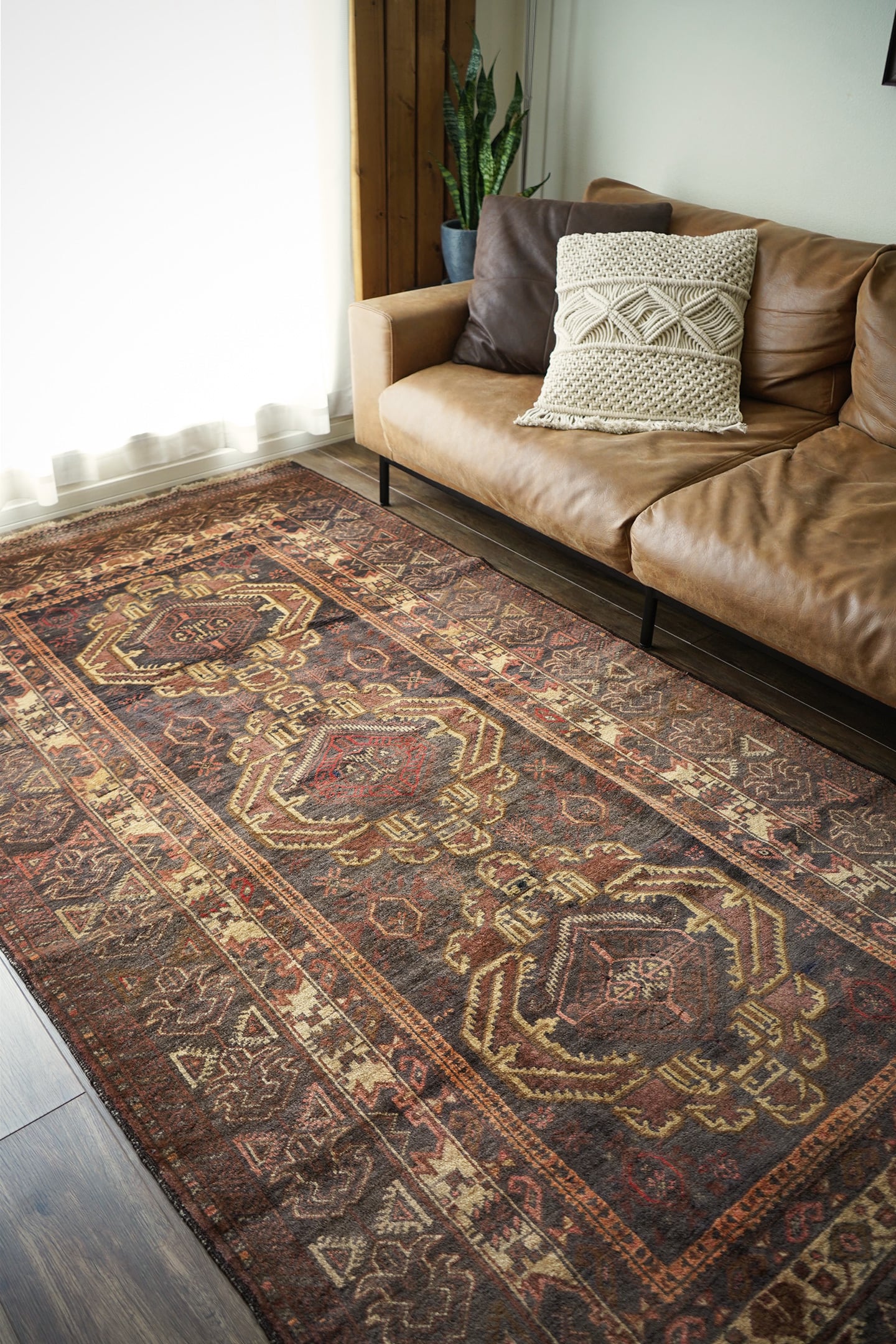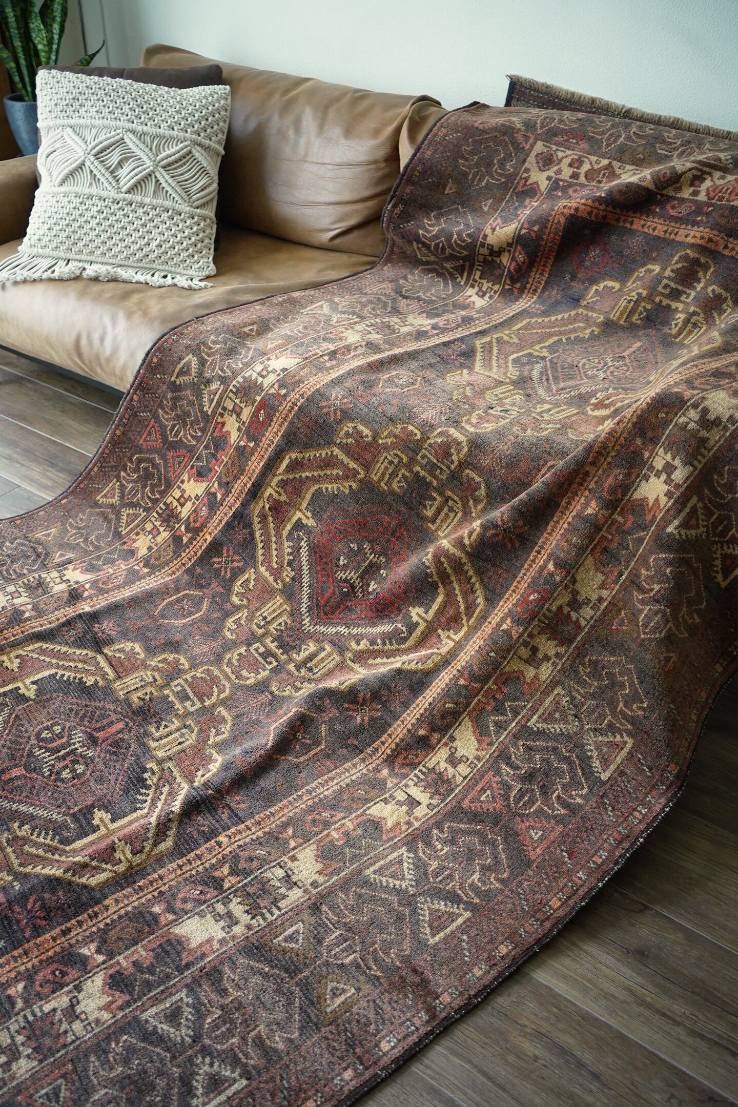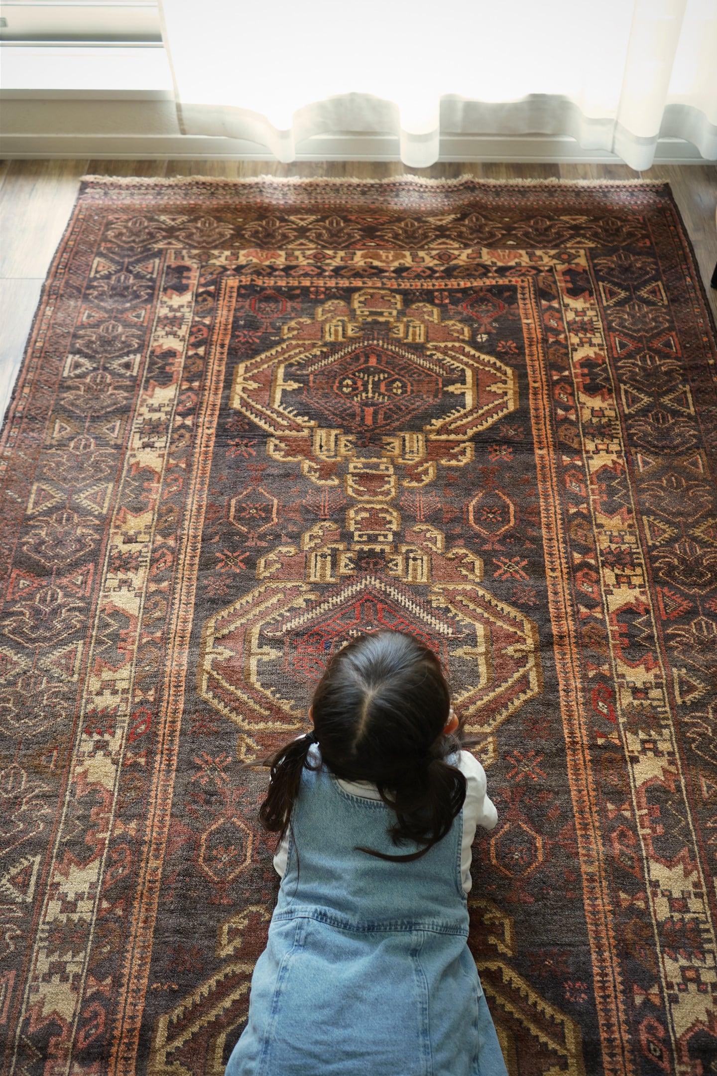 約70年前にアフガニスタンでバルーチ族の手によって織られたヴィンテージラグ。中央に連なる八角形メダリオンと繊細な部族モチーフが織りなす、重厚で力強いデザインが魅力的です。両端はキリムエンド仕様になっており、経年による風合いと相まって、より一層味わい深さを引き立てています。配色はブラウン、ブラック、ベージュ、薄いオレンジなど落ち着いたトーンで統一され、全体に褪せたような風合いが渋く格好良い雰囲気を演出しています。パイルはふわっと滑らかで気持ちの良い肌触り。厚みは約7mm程度あり、通年で心地よくご使用いただける質感です。いくつか小さな補修跡が見られますが、しっかりと馴染んでおり、全体の美観を損なうものではありません。渋みのある大判のバルーチラグをお探しの方には特におすすめの一枚です♫
