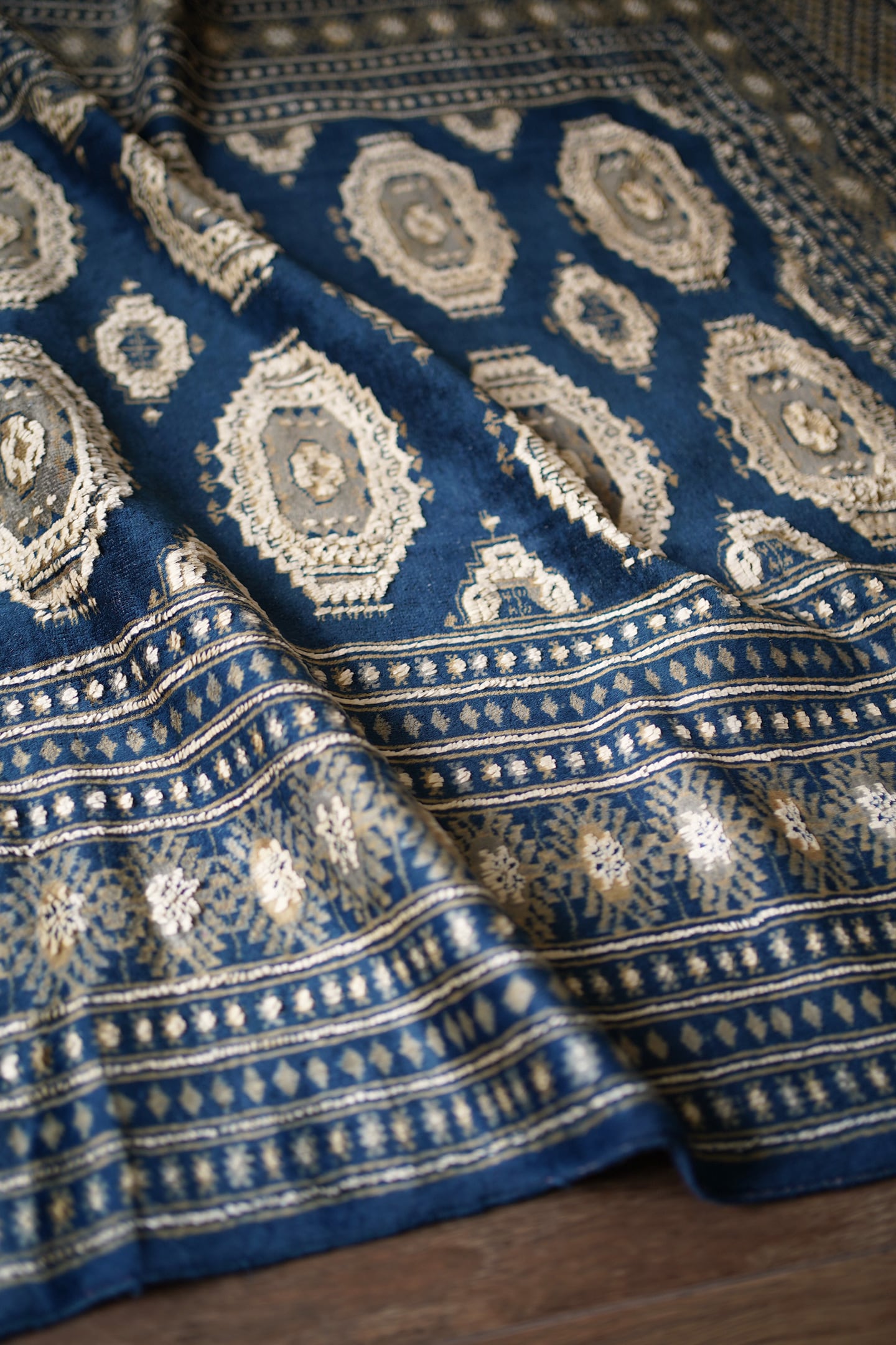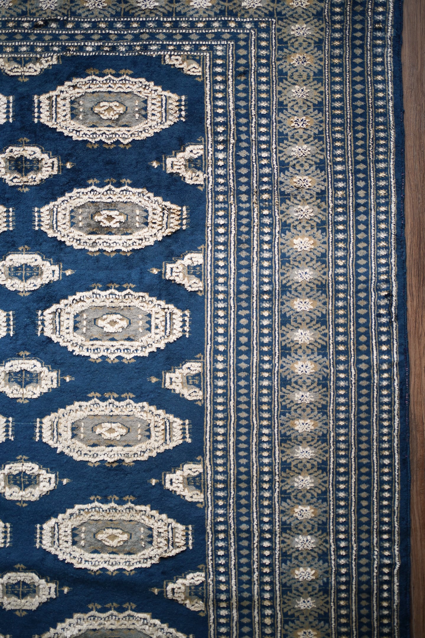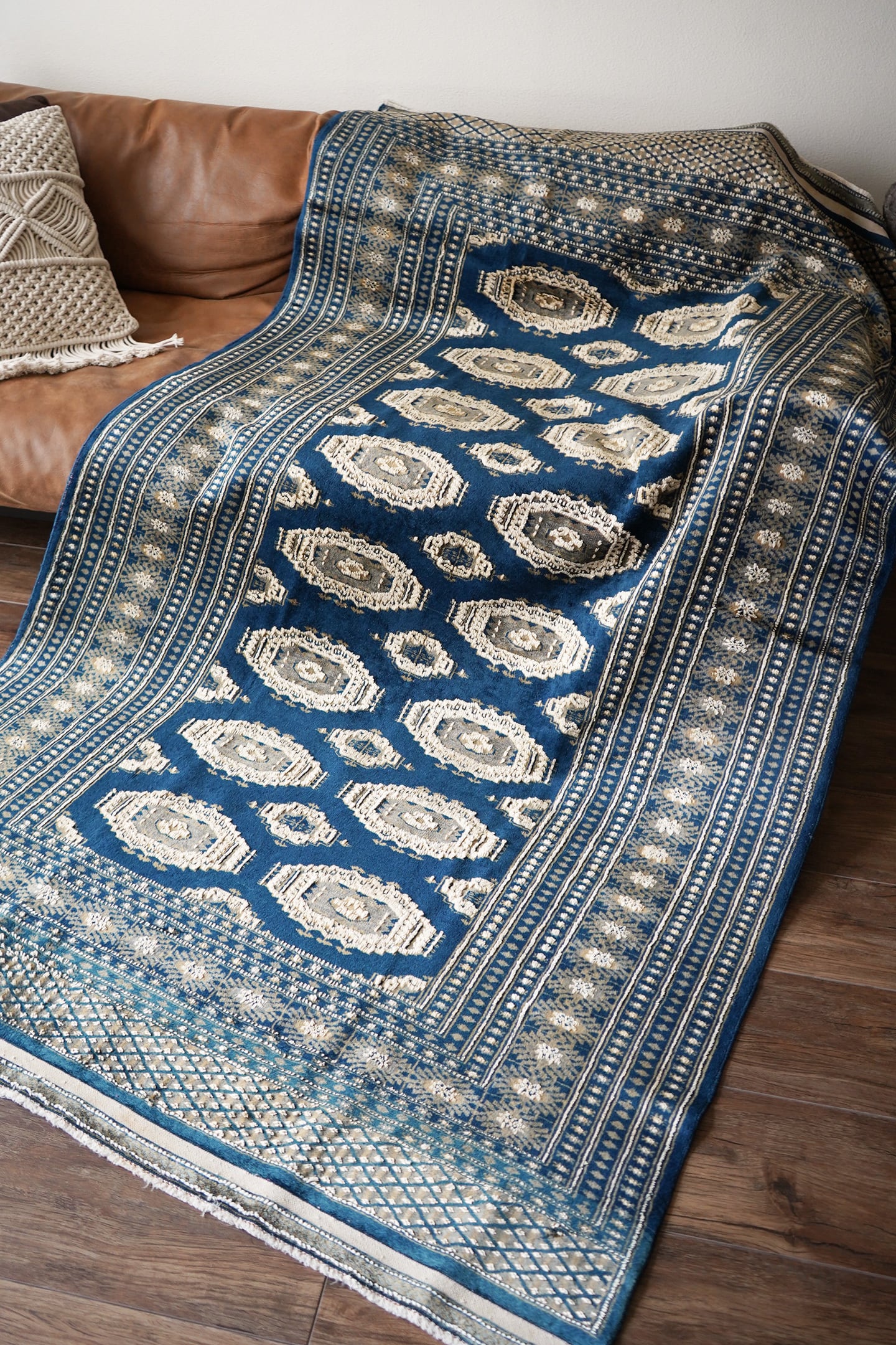 約40年前にパキスタンで織られたヴィンテージラグです。深く艶のあるネイビーブルーをベースに、整然と並ぶギュル(Gul)文様が目を惹く一枚です。文様の白い部分にはシルクが用いられており、毛足もやや長めに織られています。美しい光沢と立体感が際立つ一枚で、ネイビーとシルクホワイトのコントラストが、洗練された印象をより一層引き立てています。表面はふわっとしつつもサラリと軽やかな質感で、厚みは7〜8mm程度。通年で快適にご使用いただけます。目立つダメージや補修跡も見られず、良好なコンディション。空間に凛とした美しさと高級感を添える、ブルー系のラグをお探しの方にぜひおすすめしたい一枚です♫
