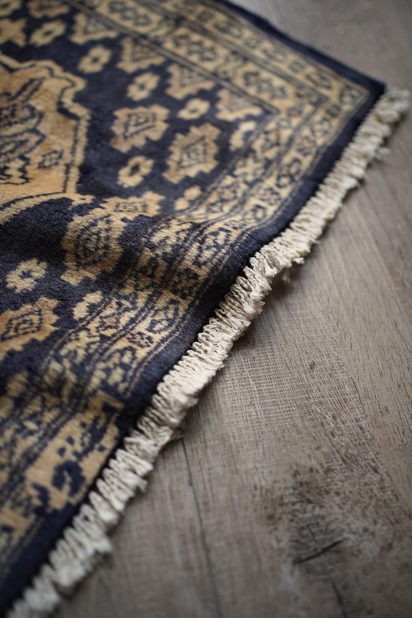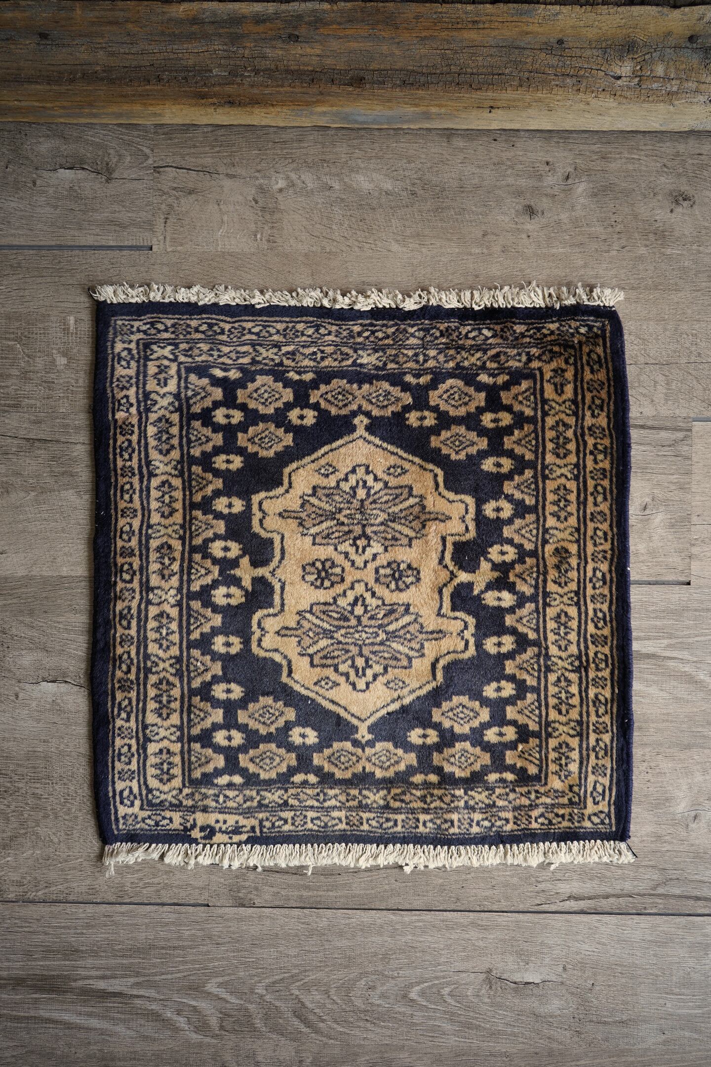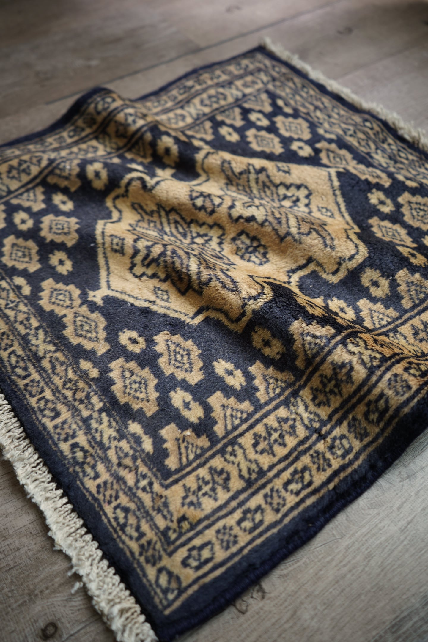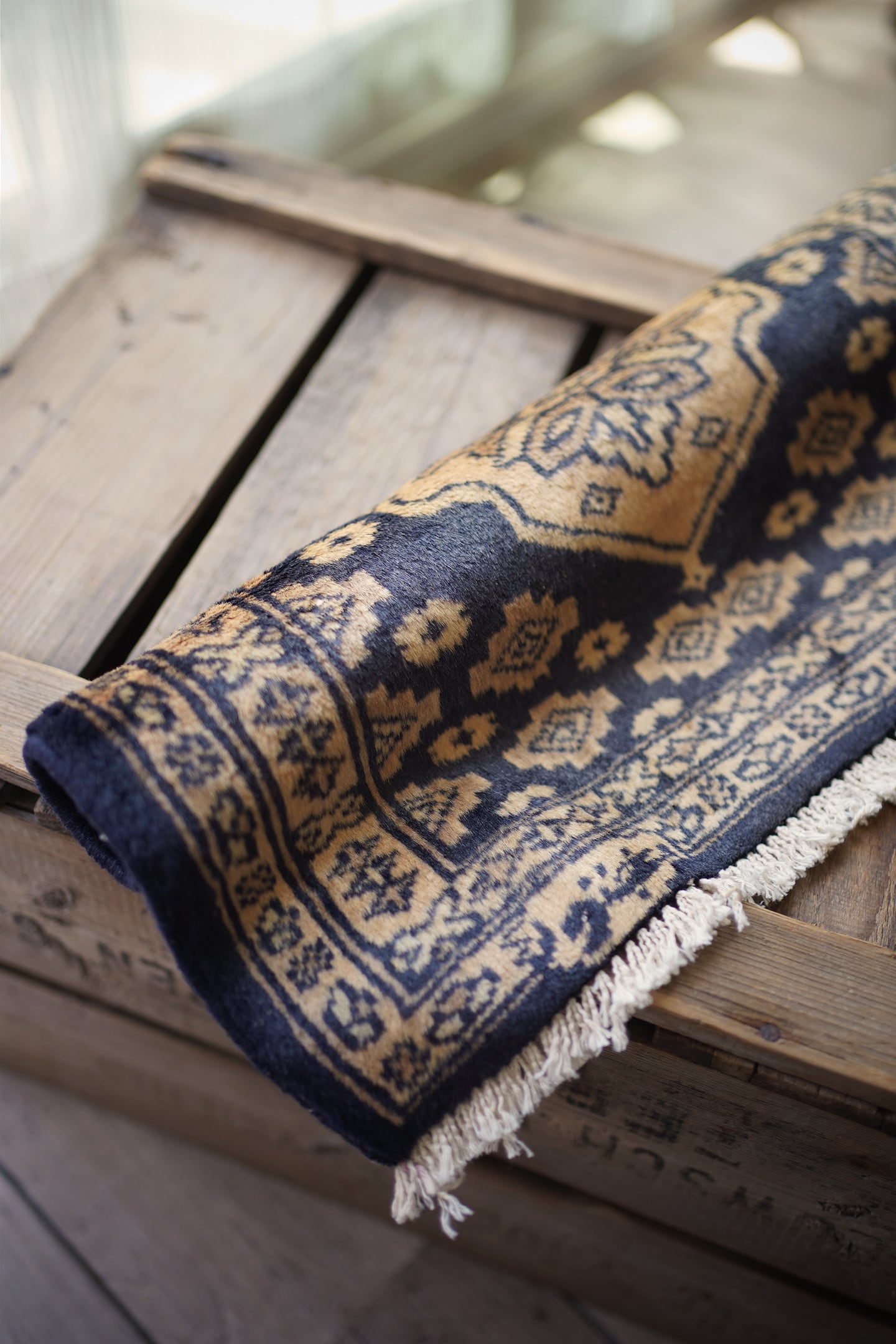 落ち着いた濃紺とベージュの2色で構成された、上品で洗練された印象のパキスタンラグ。中央には花のようなモチーフが描かれ、端には織り手のサインもさりげなく入っています。表面はふわっと滑らかで優しい肌触りで、厚みは約8mm程度。目立ったダメージなども見受けられず、グッドコンディション。ラックやテーブルの上に敷いて、小物や花瓶などを乗せればお気に入りの空間がとってもオシャレに。タペストリーとして壁に飾っても素敵かと思います♪