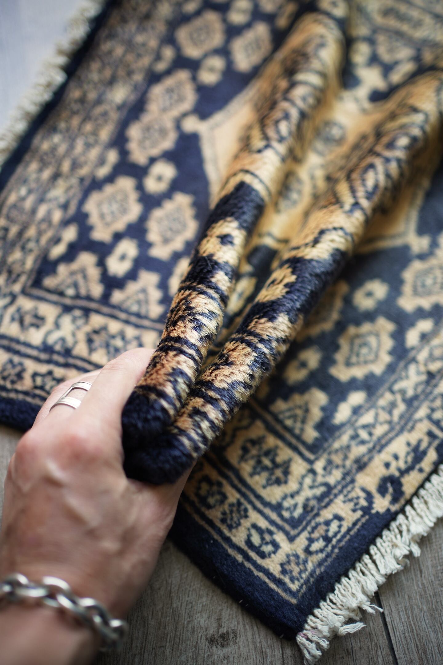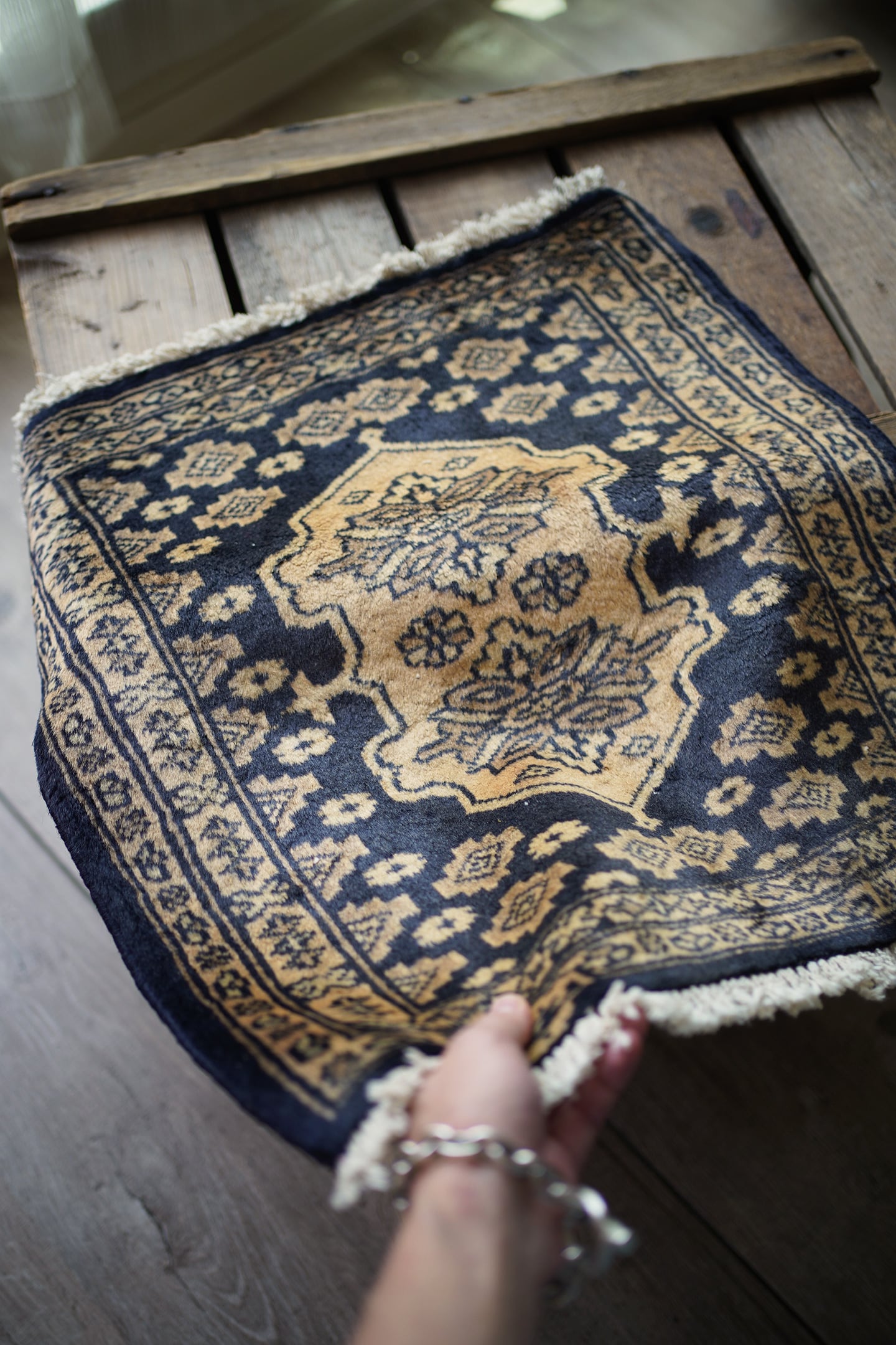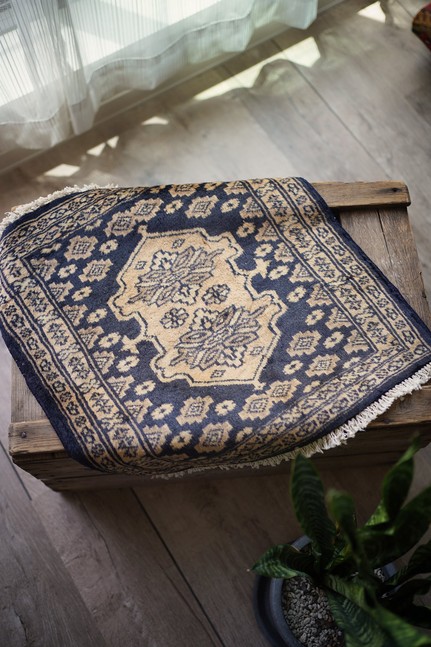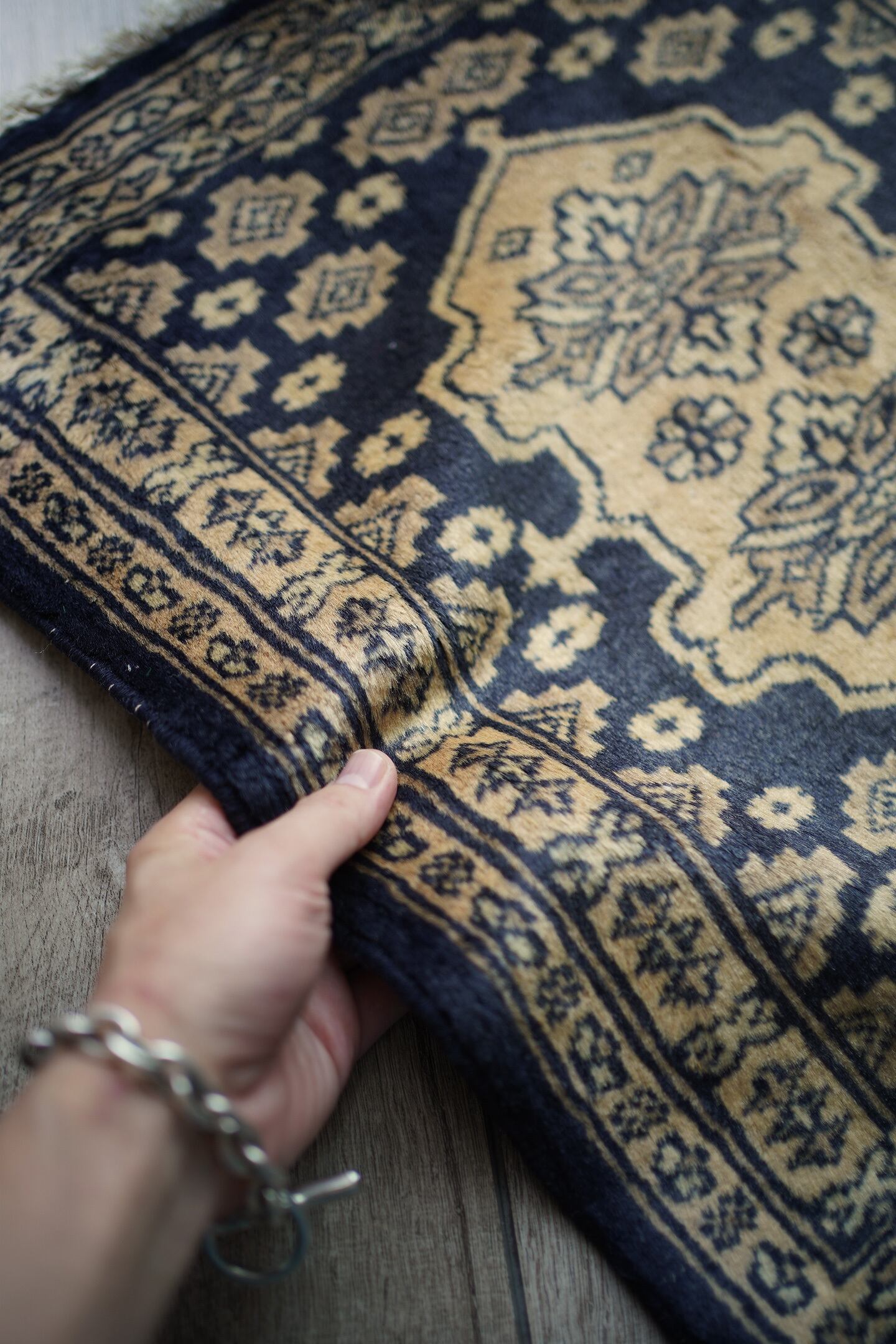 落ち着いた濃紺とベージュの2色で構成された、上品で洗練された印象のパキスタンラグ。中央には花のようなモチーフが描かれ、端には織り手のサインもさりげなく入っています。表面はふわっと滑らかで優しい肌触りで、厚みは約8mm程度。目立ったダメージなども見受けられず、グッドコンディション。ラックやテーブルの上に敷いて、小物や花瓶などを乗せればお気に入りの空間がとってもオシャレに。タペストリーとして壁に飾っても素敵かと思います♪