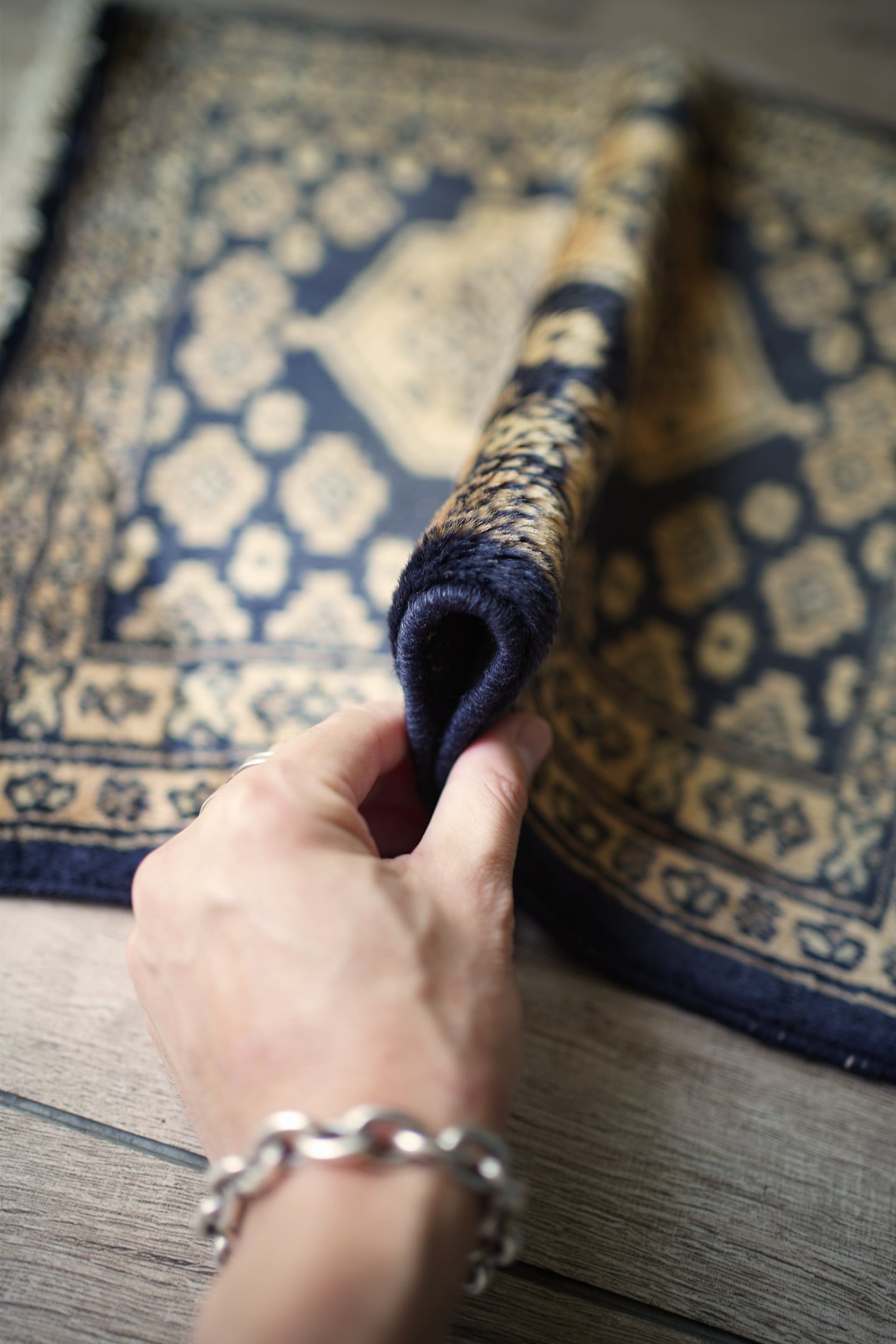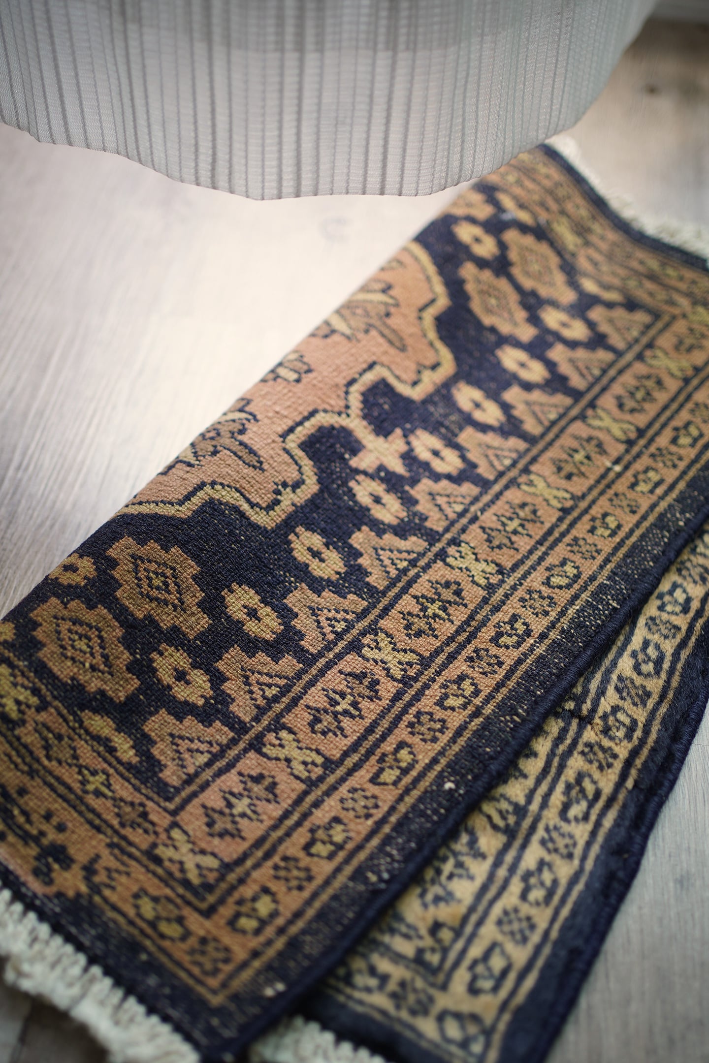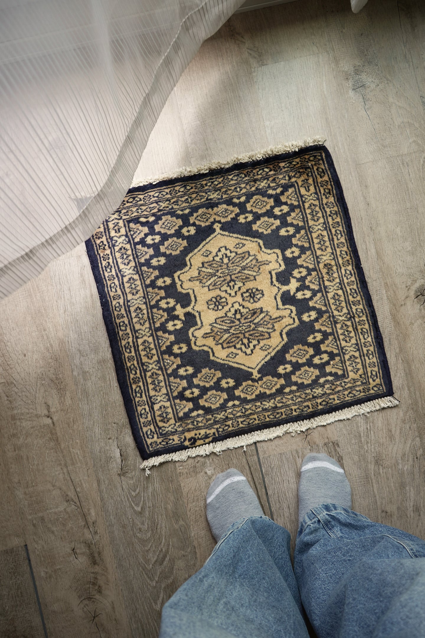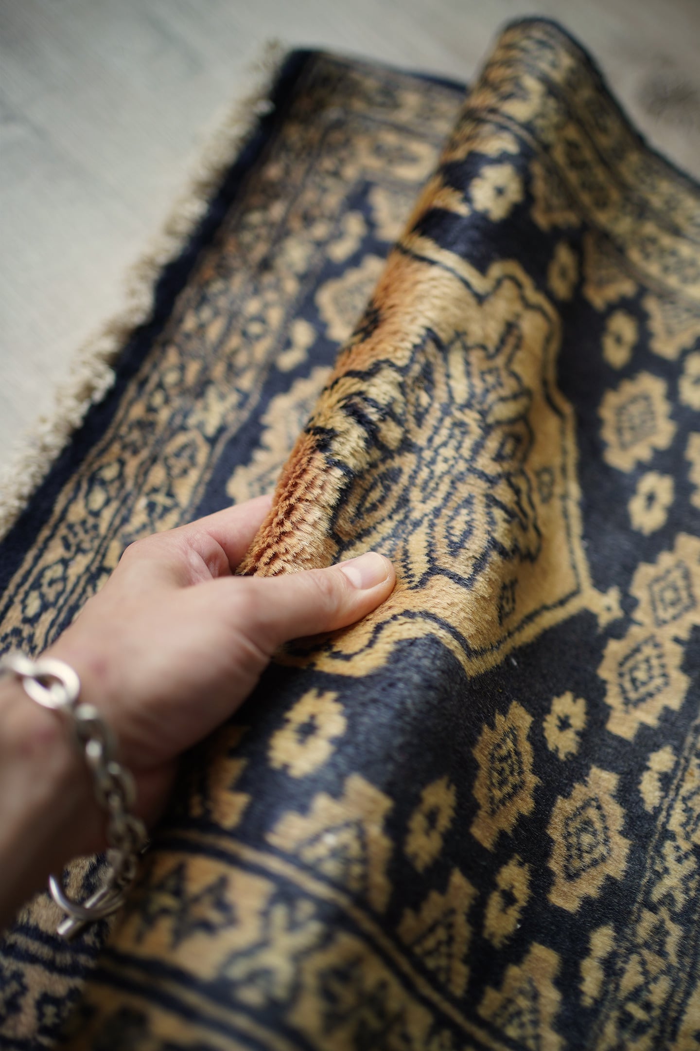 落ち着いた濃紺とベージュの2色で構成された、上品で洗練された印象のパキスタンラグ。中央には花のようなモチーフが描かれ、端には織り手のサインもさりげなく入っています。表面はふわっと滑らかで優しい肌触りで、厚みは約8mm程度。目立ったダメージなども見受けられず、グッドコンディション。ラックやテーブルの上に敷いて、小物や花瓶などを乗せればお気に入りの空間がとってもオシャレに。タペストリーとして壁に飾っても素敵かと思います♪