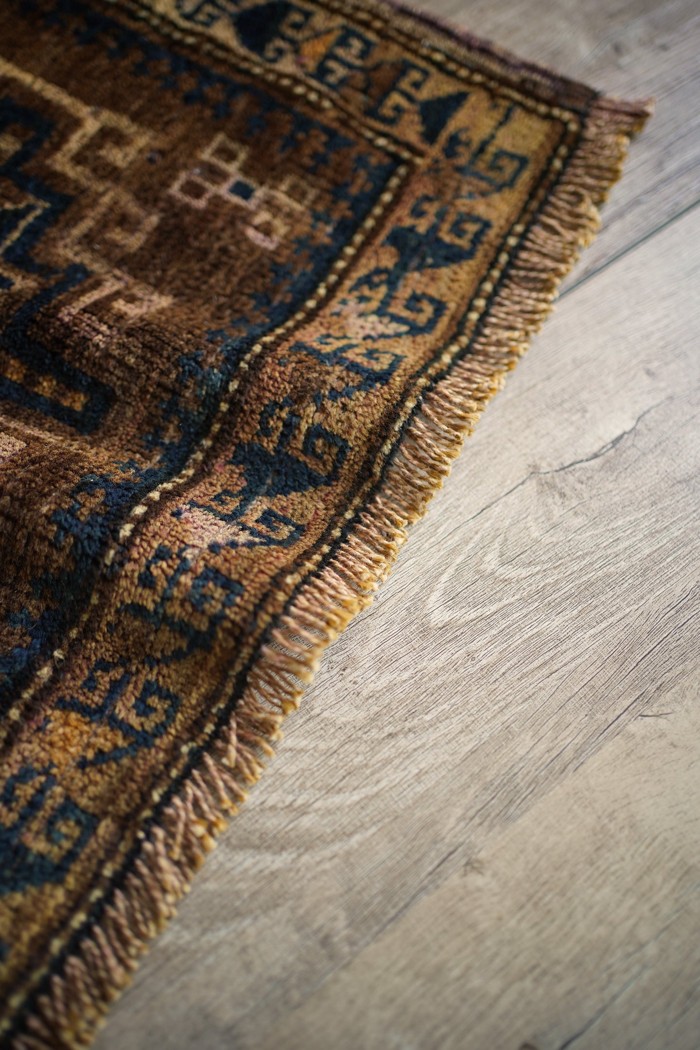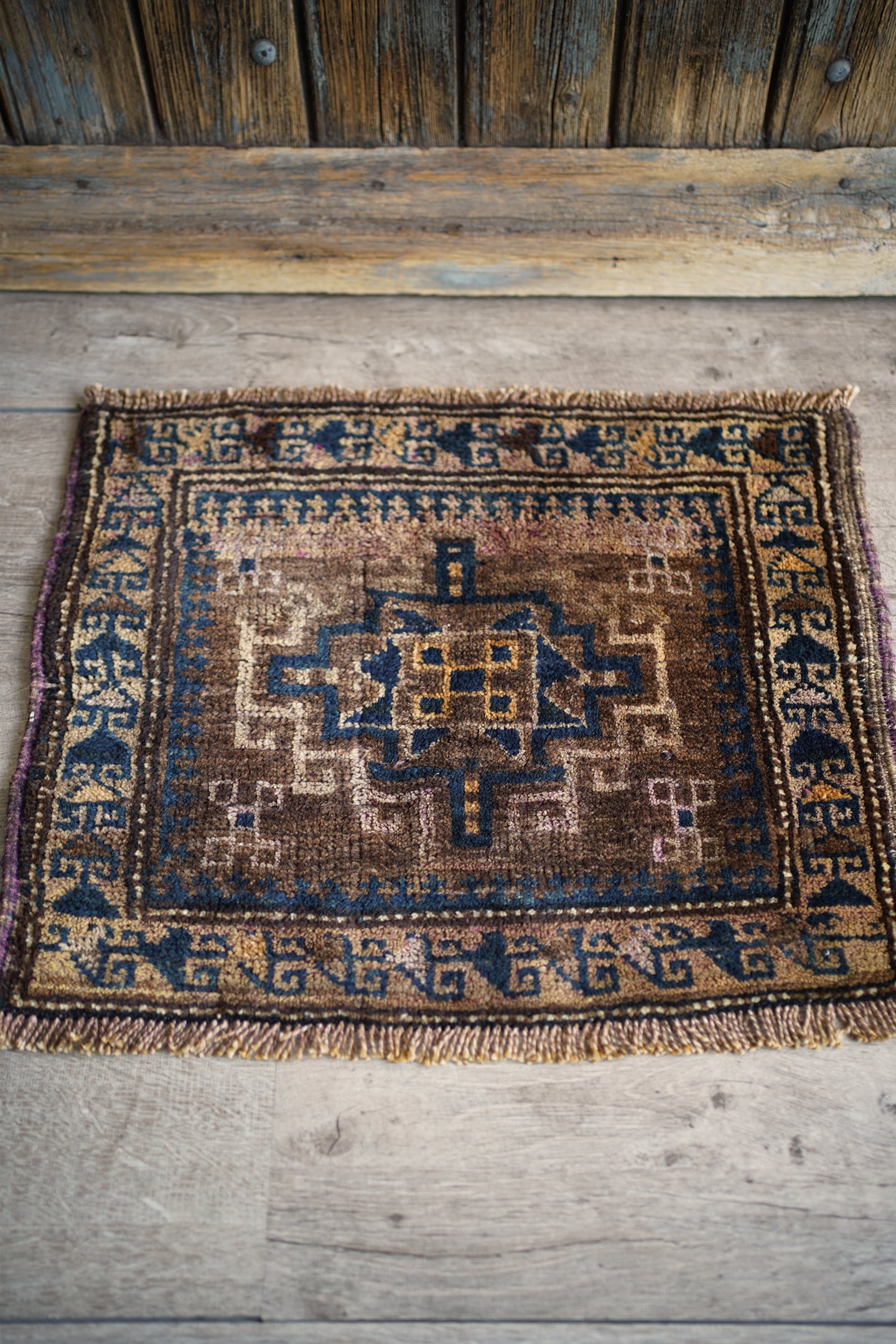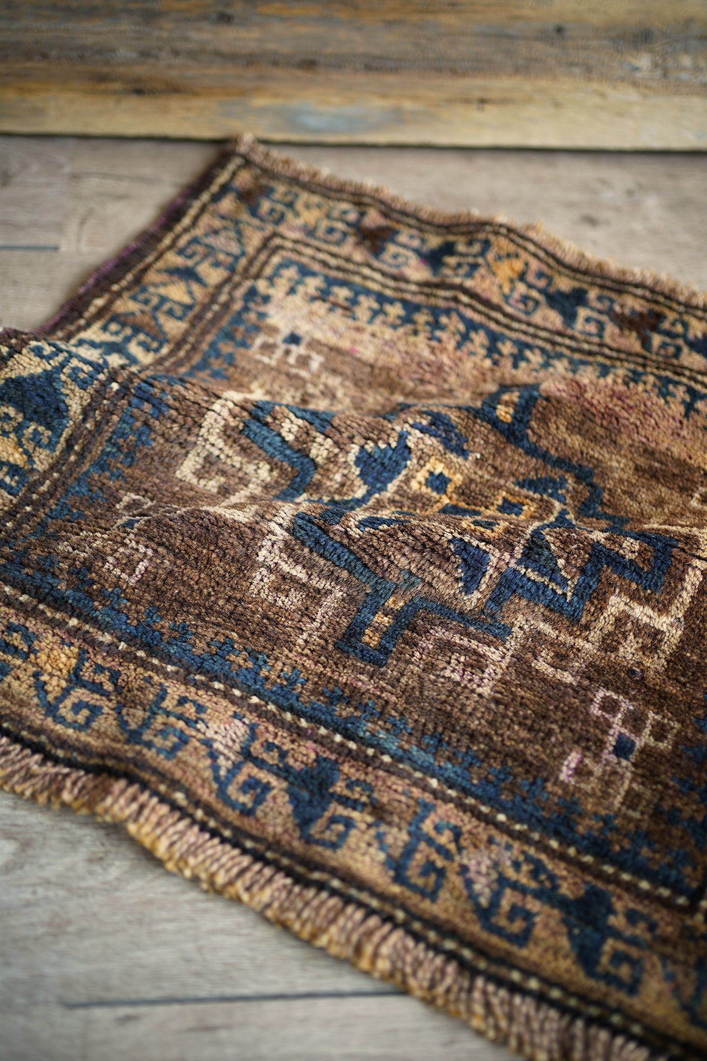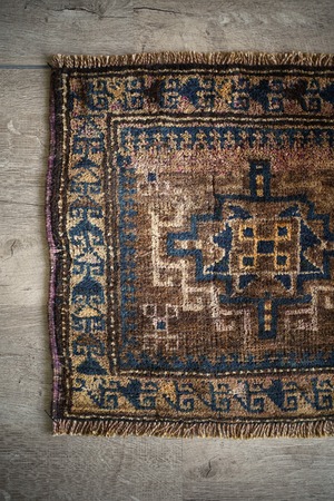 おおよそ80年前にイラン南東部のシスターン地方で織られたセミアンティークのバルーチラグです。渋い風合いが魅力的な一枚で、中央に配置された力強いジオメトリックなモチーフが印象的。落ち着いたベージュやブラウン、キャメルなどの統一感のある色合いに、深みのあるブルーグリーンがほどよく差し色となっています。表面はふわっと柔らかく心地よい肌触りをしており、厚みは約9mm程度。目立ったダメージもなくグッドコンディション。観葉植物にあわせたり、壁に飾ってタペストリーとしてお使いいただくのもオススメです♫