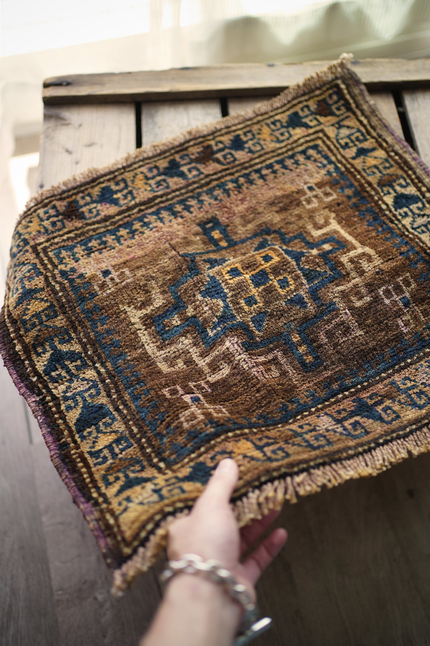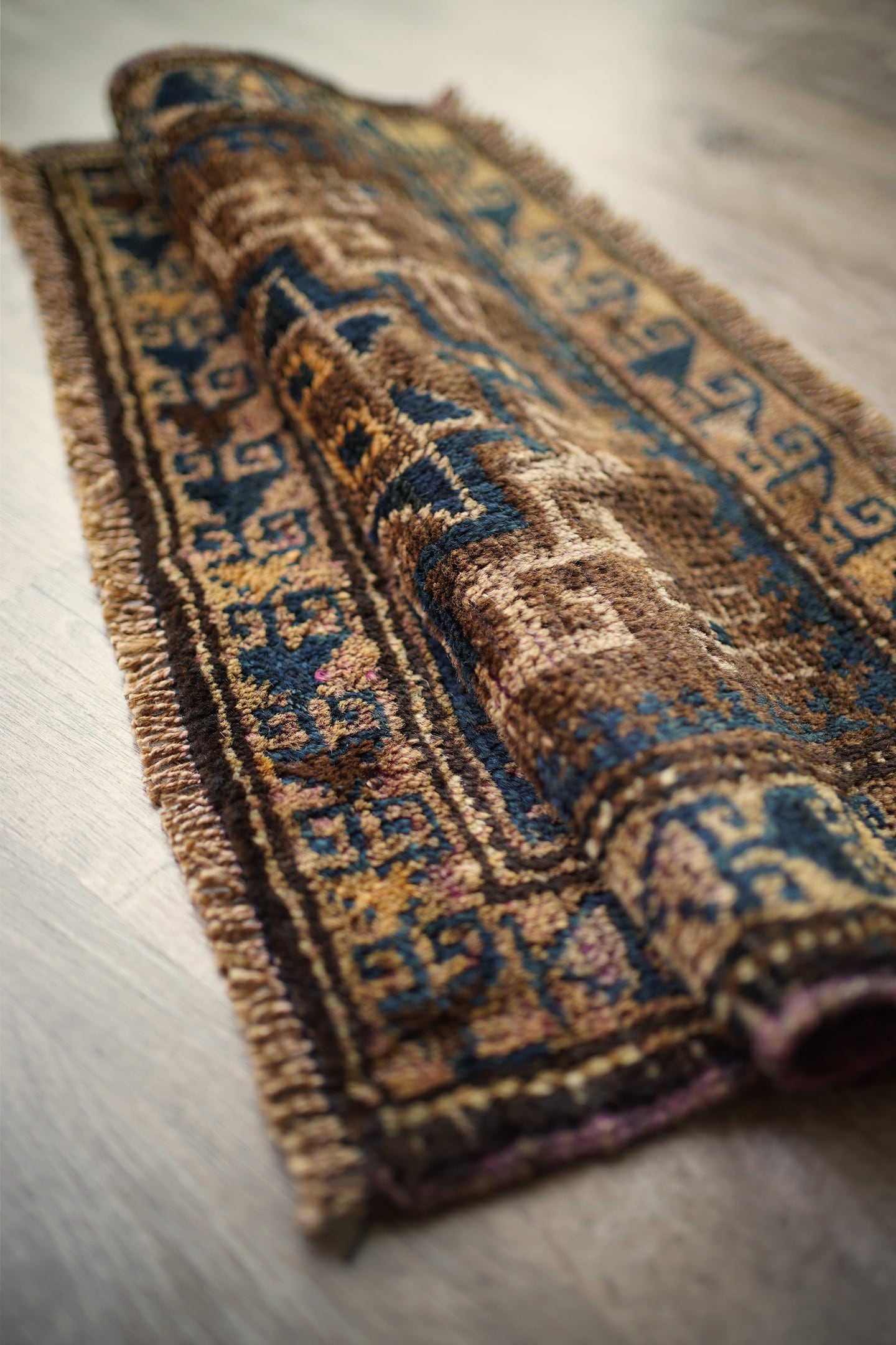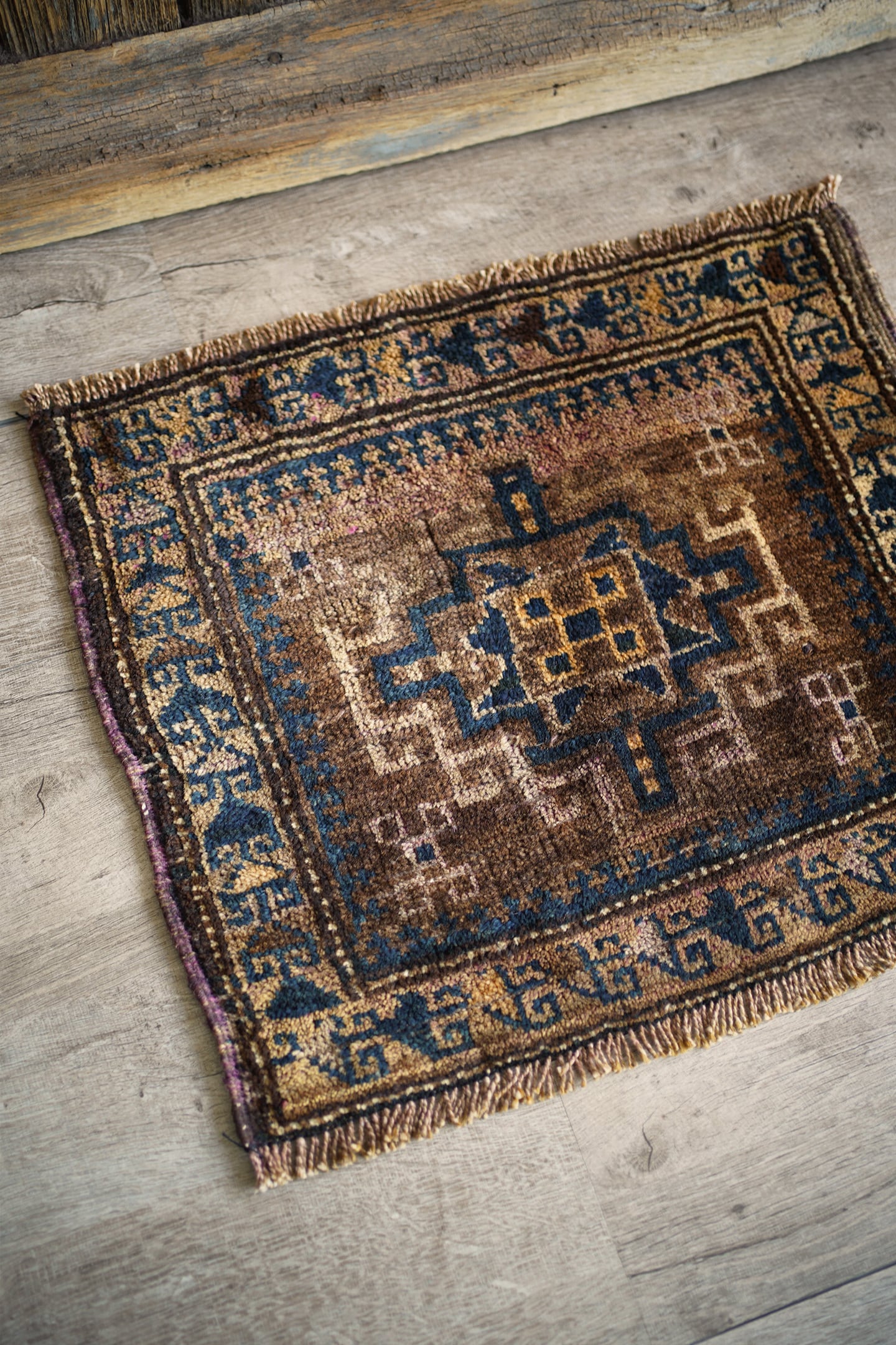 おおよそ80年前にイラン南東部のシスターン地方で織られたセミアンティークのバルーチラグです。渋い風合いが魅力的な一枚で、中央に配置された力強いジオメトリックなモチーフが印象的。落ち着いたベージュやブラウン、キャメルなどの統一感のある色合いに、深みのあるブルーグリーンがほどよく差し色となっています。表面はふわっと柔らかく心地よい肌触りをしており、厚みは約9mm程度。目立ったダメージもなくグッドコンディション。観葉植物にあわせたり、壁に飾ってタペストリーとしてお使いいただくのもオススメです♫