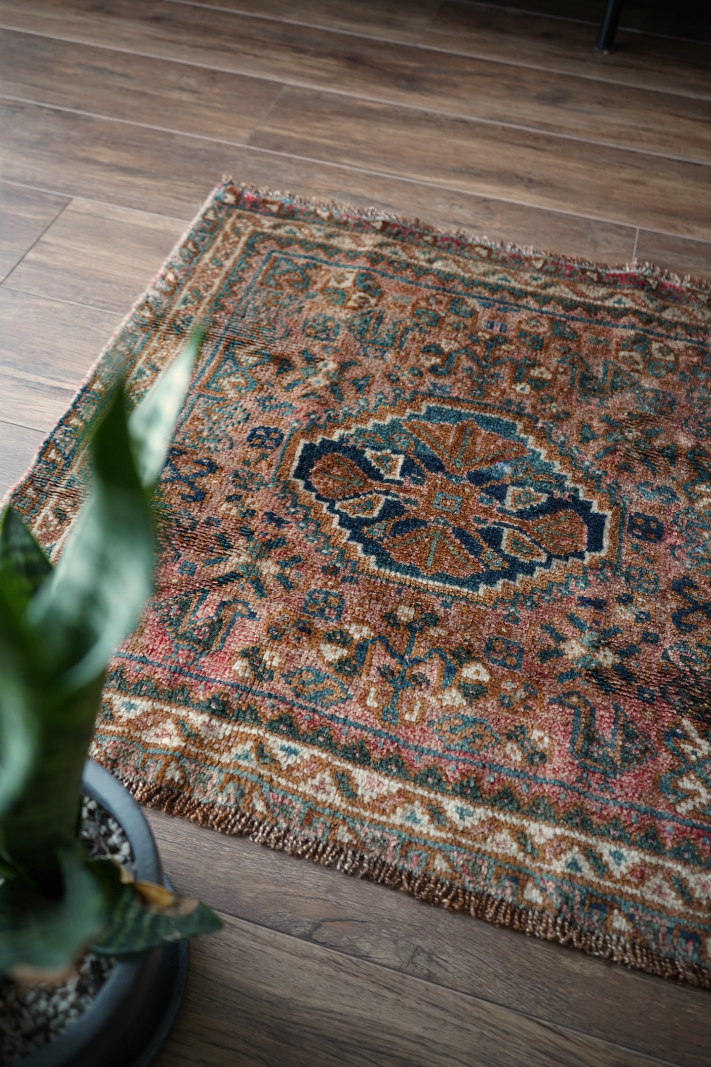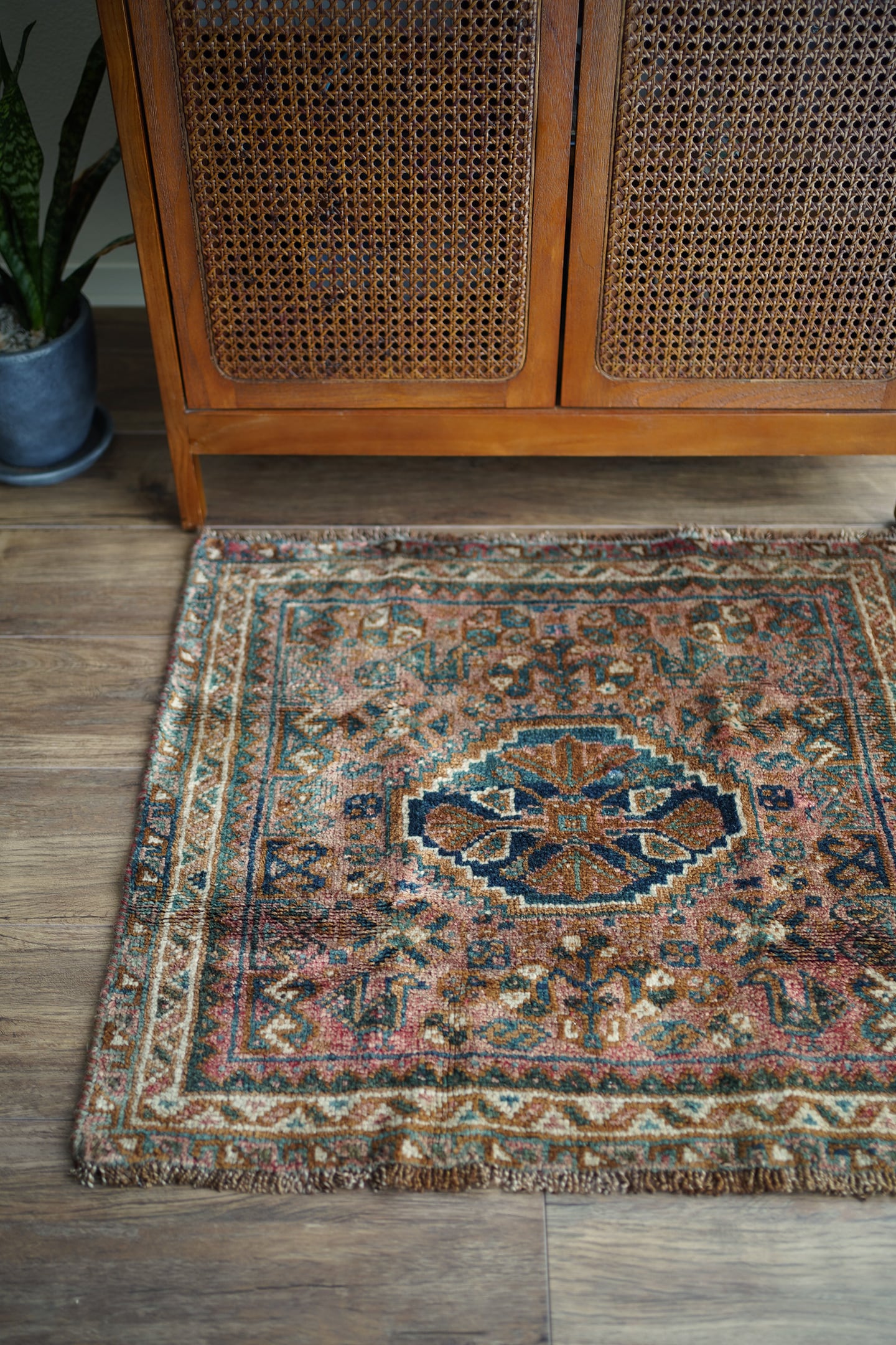 イラン南西部、ファールス地方に暮らす遊牧民・カシュガイ族によって約80年前に手織りされたセミアンティークラグ。中央には象徴的なメダリオンが織り込まれ、よく見るとそのまわりには4羽の鳥紋様が織り込まれています。薄いエメラルドグリーンやブルーグリーン、ブラウン、ピンクレッドなどの色合いが美しく掛け合わさり、パイル全体に広がる光沢感のある艶と相まって、見る角度によって色んな表情が楽しめるのが魅力です。表面はふわっと滑らかな心地良い肌触りをしており、厚みは約9mmほど。目立ったダメージや補修された跡もなく、グッドコンディション。スクエアタイプの程よいサイズ感なので、玄関をはじめ、ちょっとした空間のアクセントにもぴったりです♫