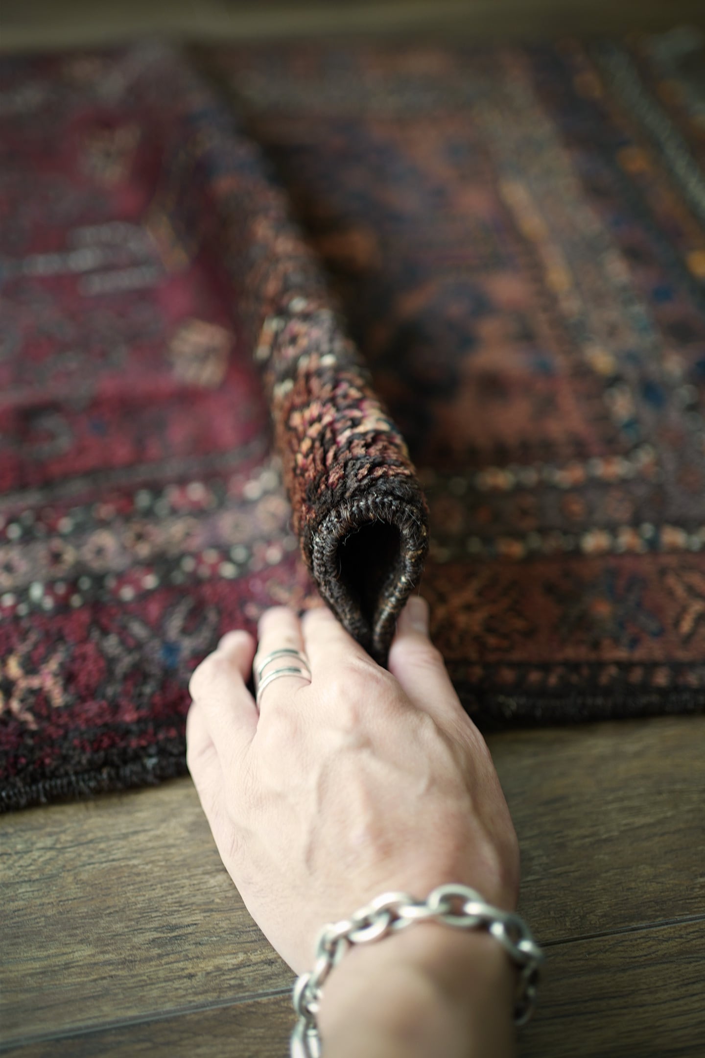 アフガニスタンに居住するバルーチ族によって、約60年前に手織りされた祈祷用のプレイヤーラグ。凸型のプレイヤーラグデザインには渦を巻くようなユニークな紋様。全体的に暗めでシックな雰囲気の一枚で、焦茶、暗い赤紫、えんじ、暗いブルーグリーン、薄めオレンジ、ライトブラウンなどが使われています。表面はふわふわで柔らかく、心地よい肌触り。厚みは約9mm程度です。目立ったダメージや補修跡も見受けられずグッドコンディション。リビングや寝室、ウォークインクローゼットなどお好みのスペースに。