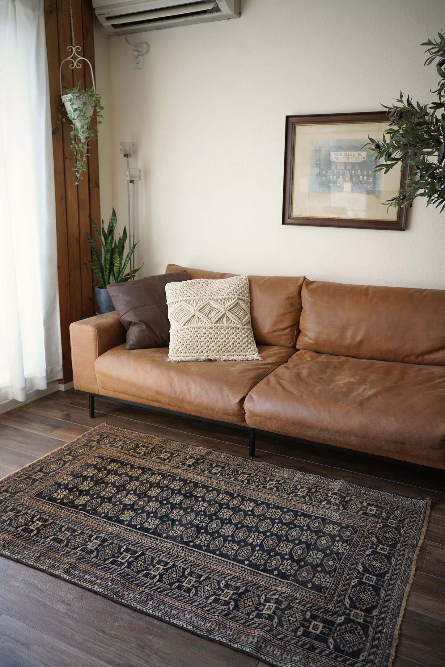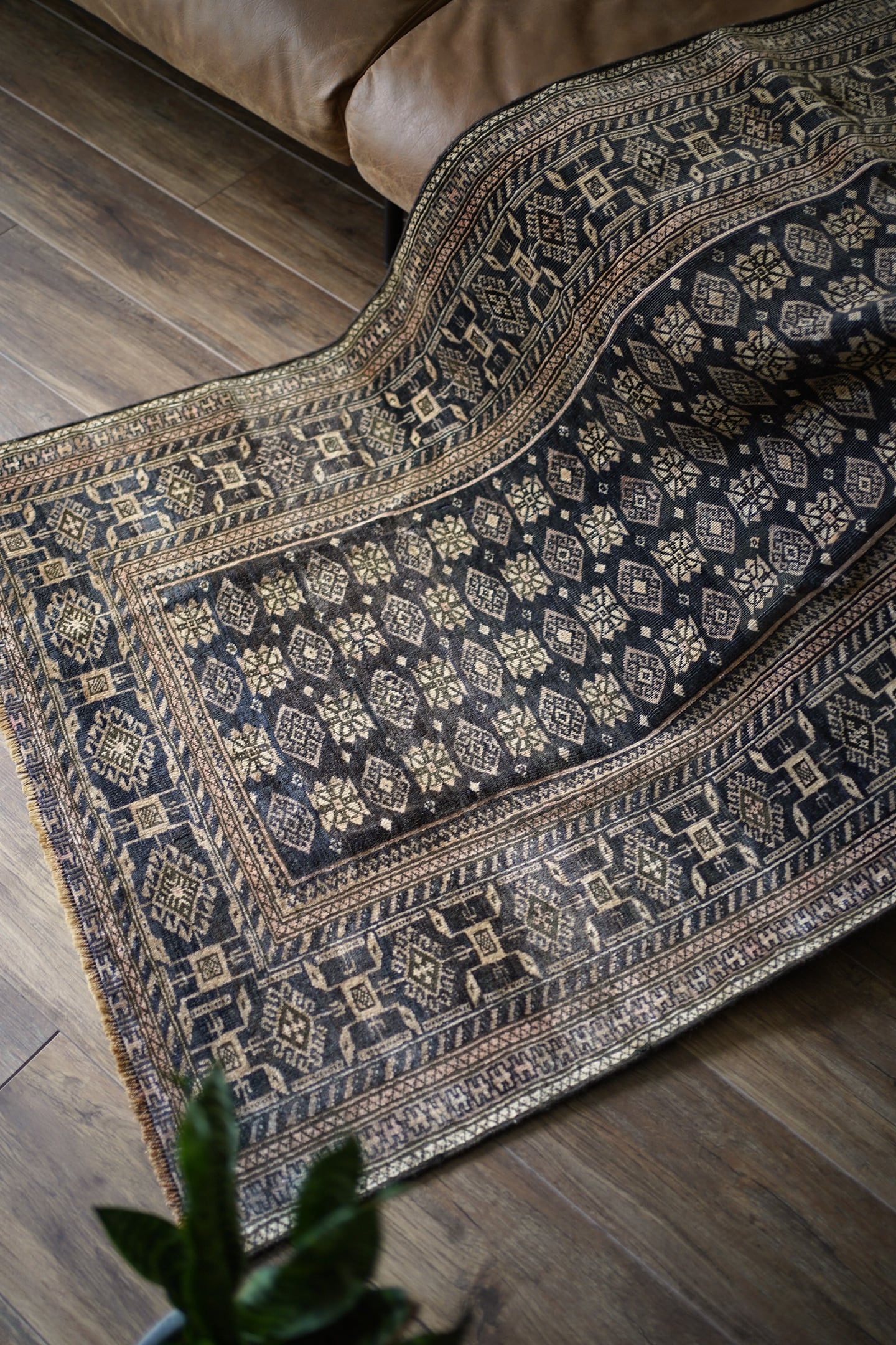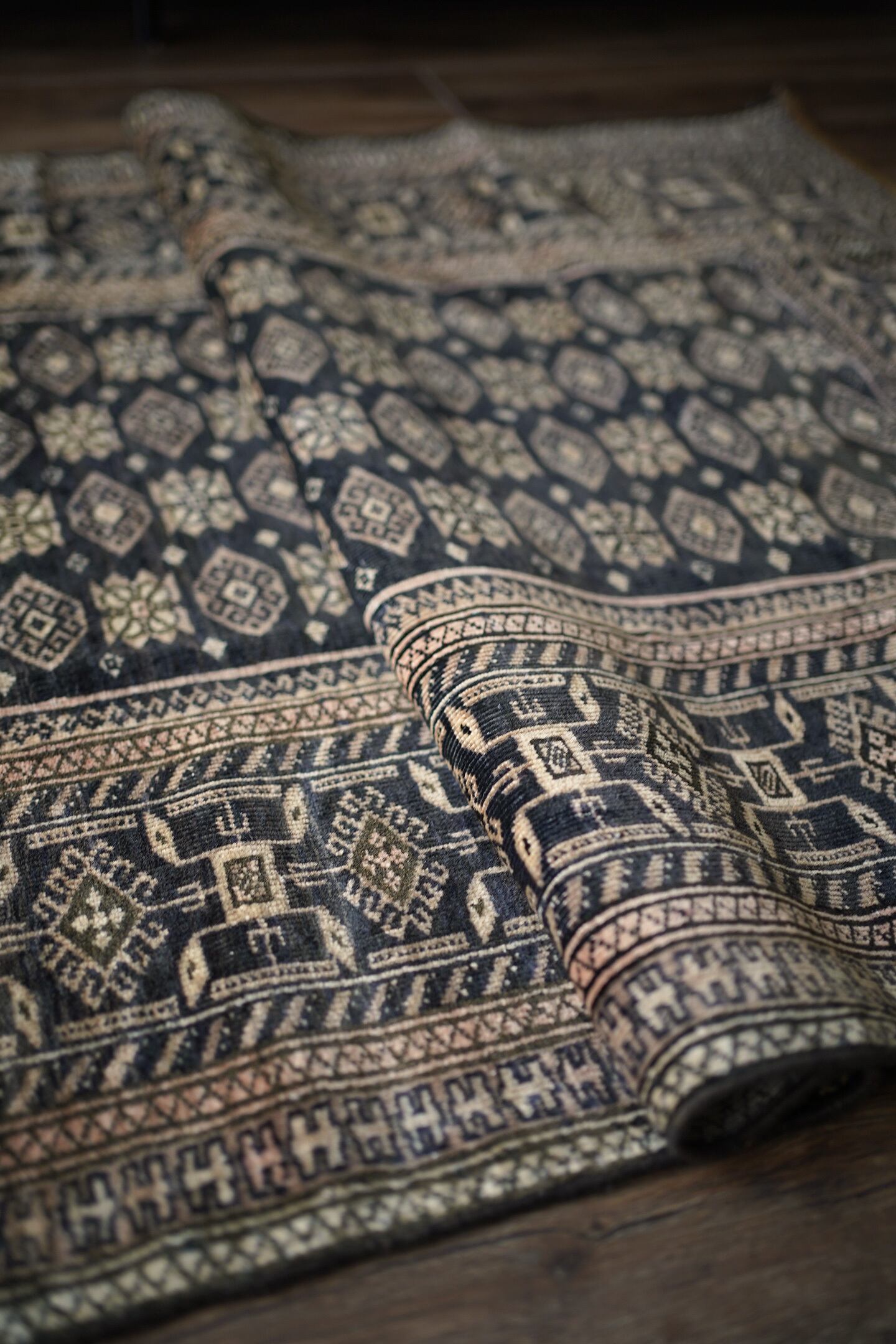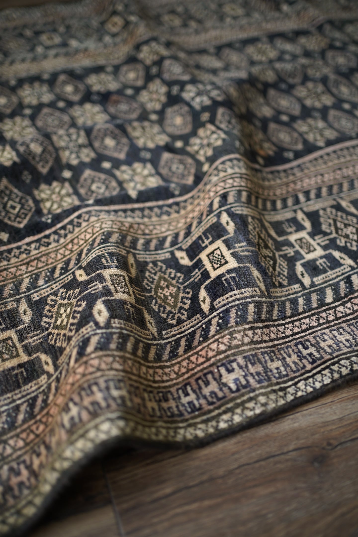 おおよそ80年前に織られたアフガニスタン産バルーチのセミアンティークラグ。長い年月を経て受け継がれてきた、渋みのある風合いが魅力の一枚で、退色した薄い黒をベースにベージュ、淡いオレンジが使われた色合い。全体的にパイルが薄くなっており、使い込まれたアンティークを感じる質感です。表面はふわサラッとした軽やかな肌触りで、厚みは5mm程度。所々補修されている箇所もありますが熟練の職人による丁寧なリペアで、よく見てもわからないほど綺麗に修復されています。ちょっとした空間や読書用のパーソナルチェアの足元に合わせても素敵ですし、空間に落ち着きと味わいを添えてくれるラグです。
