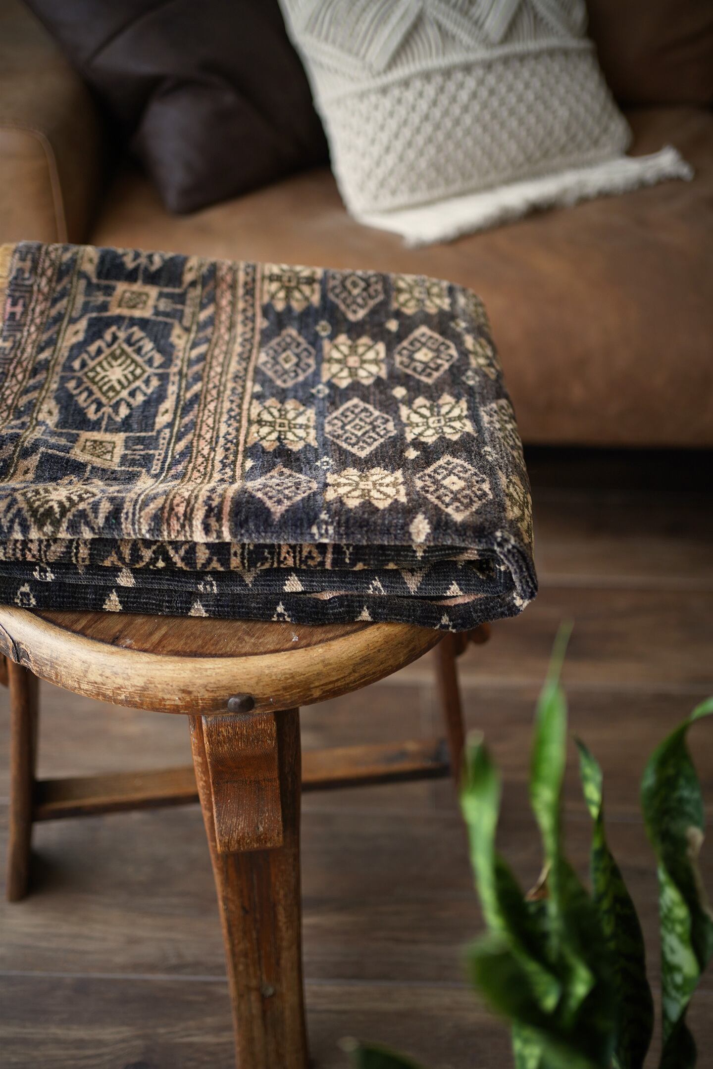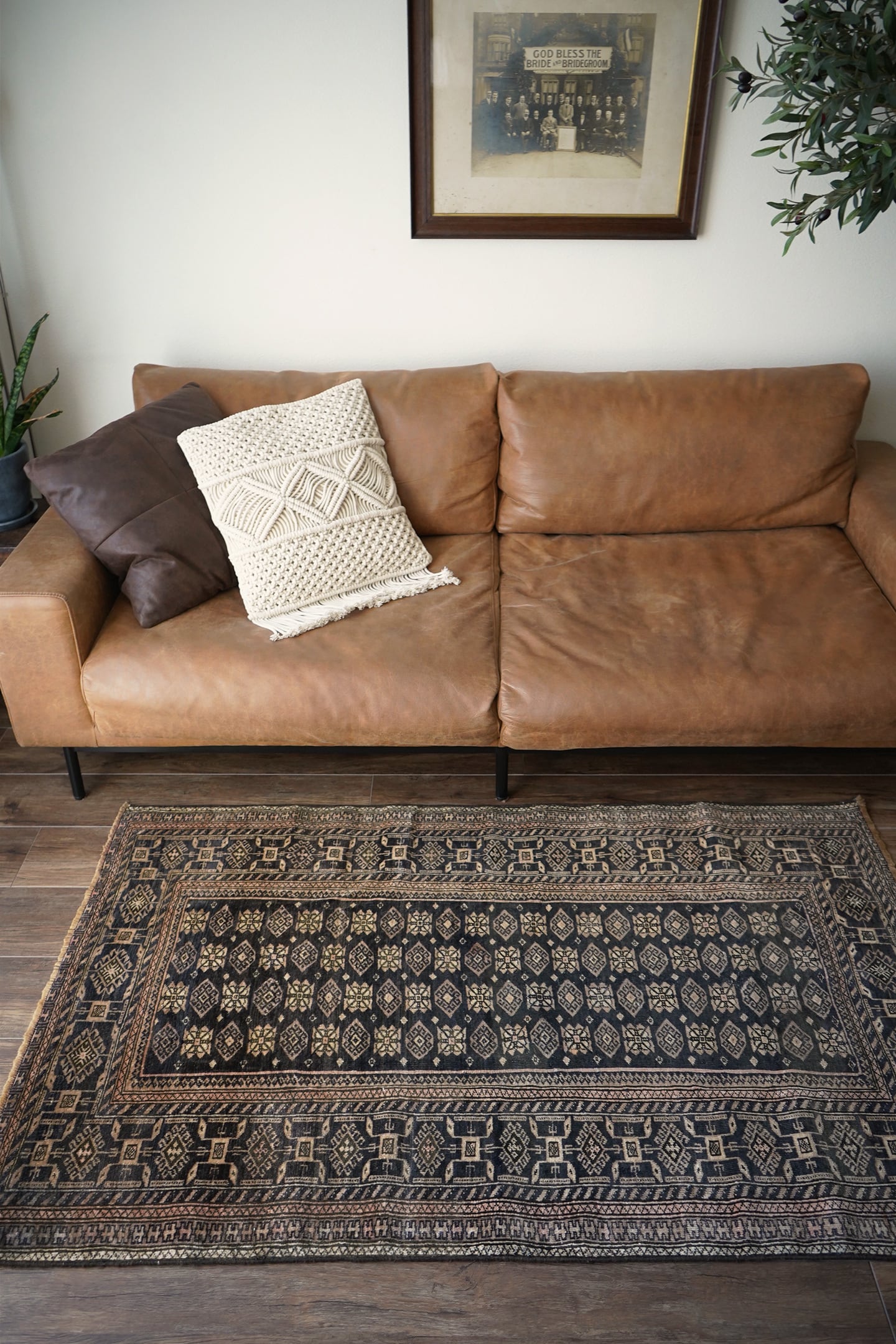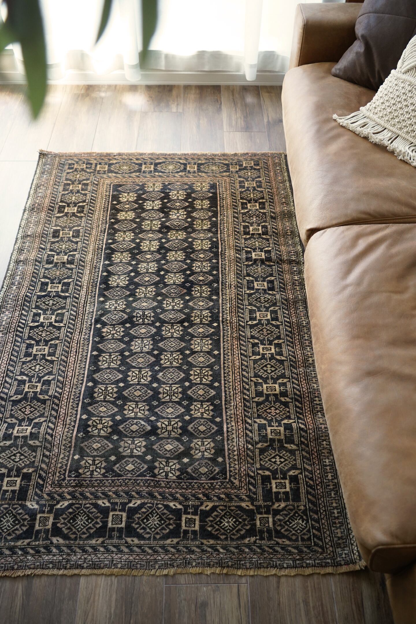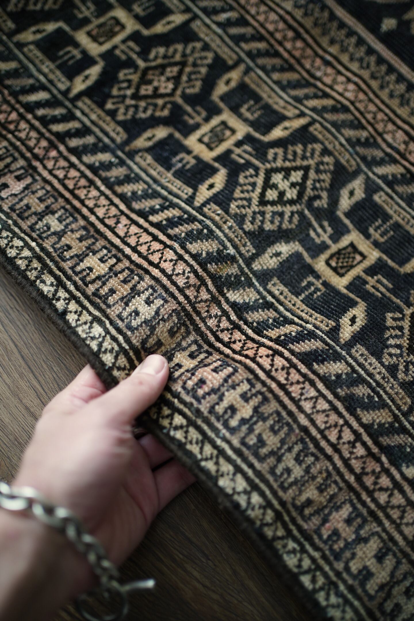 おおよそ80年前に織られたアフガニスタン産バルーチのセミアンティークラグ。長い年月を経て受け継がれてきた、渋みのある風合いが魅力の一枚で、退色した薄い黒をベースにベージュ、淡いオレンジが使われた色合い。全体的にパイルが薄くなっており、使い込まれたアンティークを感じる質感です。表面はふわサラッとした軽やかな肌触りで、厚みは5mm程度。所々補修されている箇所もありますが熟練の職人による丁寧なリペアで、よく見てもわからないほど綺麗に修復されています。ちょっとした空間や読書用のパーソナルチェアの足元に合わせても素敵ですし、空間に落ち着きと味わいを添えてくれるラグです。