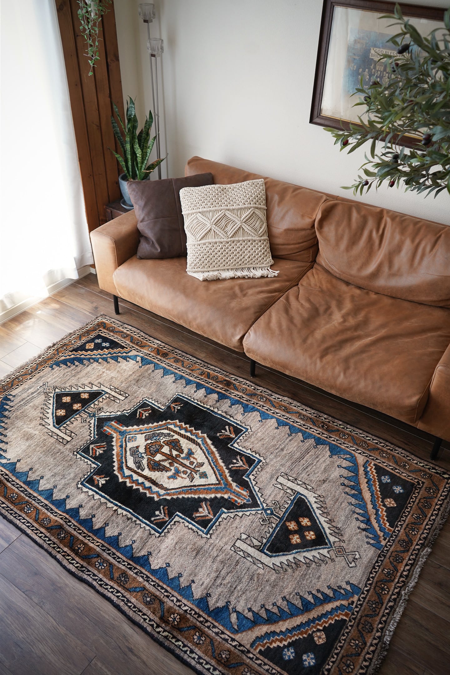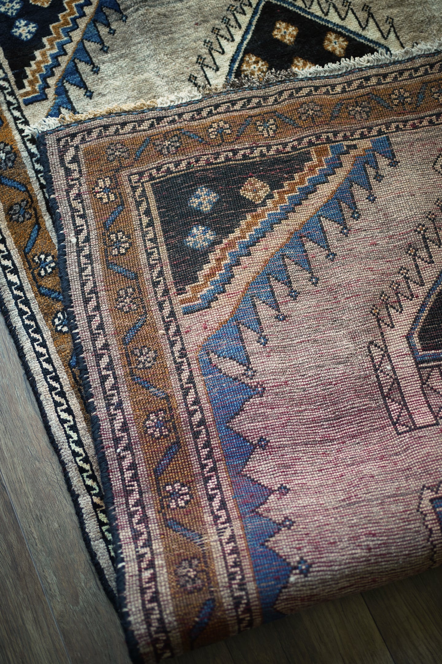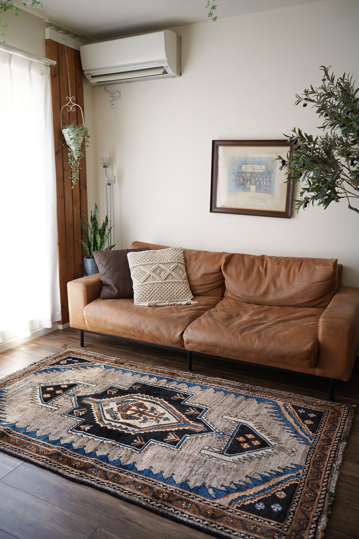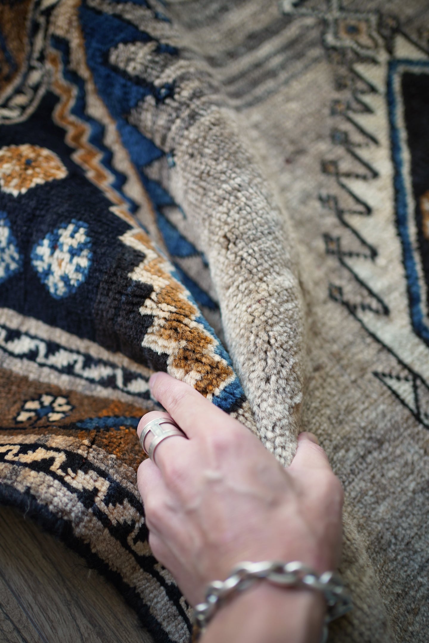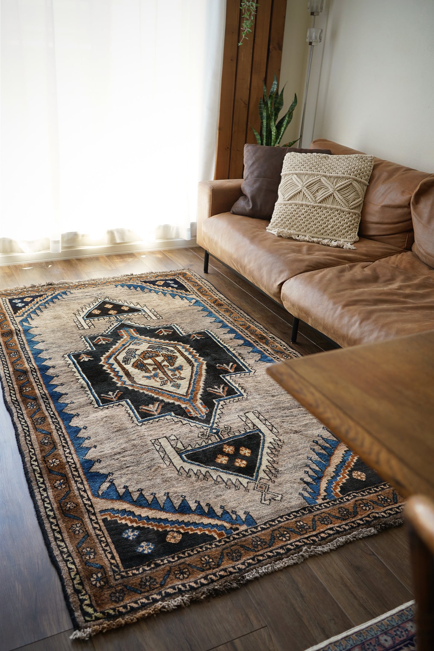 およそ40年前に、イラン南西部のザグロス山脈一帯で遊牧生活を送るカシュガイ族によって手織りされたギャッベです。中央には、仲睦まじく寄り添う2羽の鳥たちが描かれており、まるで木のようなモチーフの上で語り合っているかのような姿がとても印象的です。グレーとベージュの中間色を基調に、ブラック、ブラウン、深みのあるブルー、そしてアクセントに効いたオフホワイトが使われた配色で、落ち着いた中にも個性的な雰囲気を感じさせます。厚みは約1.1cm。ふんわりと柔らかく、弾力のある踏み心地で、ソファ前などの寛ぎのスペースも最適です。しっかりとした重みがあり、堅牢なつくりも魅力のひとつ。目立ったダメージや補修跡は見られず、良好なコンディションです。リビングや書斎、読書スペースなど、お気に入りのスペースにどうぞ。