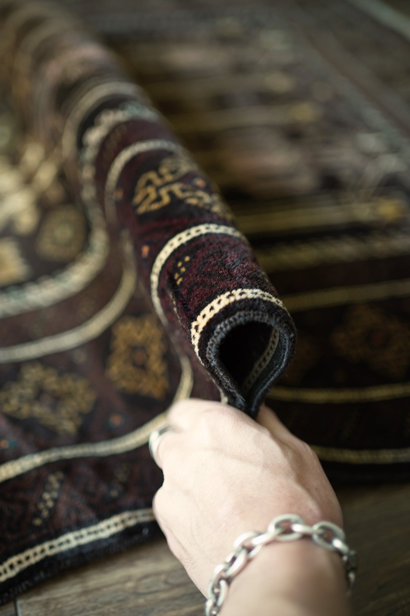 約40年前にアフガニスタンでバルーチ族によって手織りされたヴィンテージラグです。フィールドに並ぶ幾何学的な連続模様は、細やかで整ったバランス感があり、伝統的でありながらどこかモダンな雰囲気も感じさせてくれます。洗練された癖のないデザインは、和洋問わずさまざまなインテリアに馴染みやすいかと思います。ダークブラウンを基調に、ブラウンやベージュの落ち着いた配色がまとまりを生み出し、そこにさりげなく加えられたダークグリーンや赤茶がアクセントに。表面はふわっと柔らかく心地良い肌触りで、厚みは7mm〜8mm程度。美しく整ったフラットな毛並み、重みのある堅牢な作り、素晴らしいコンディションと三拍子揃った非常に高品質な一枚です。リビングのソファ前や寝室などにいかがでしょうか。