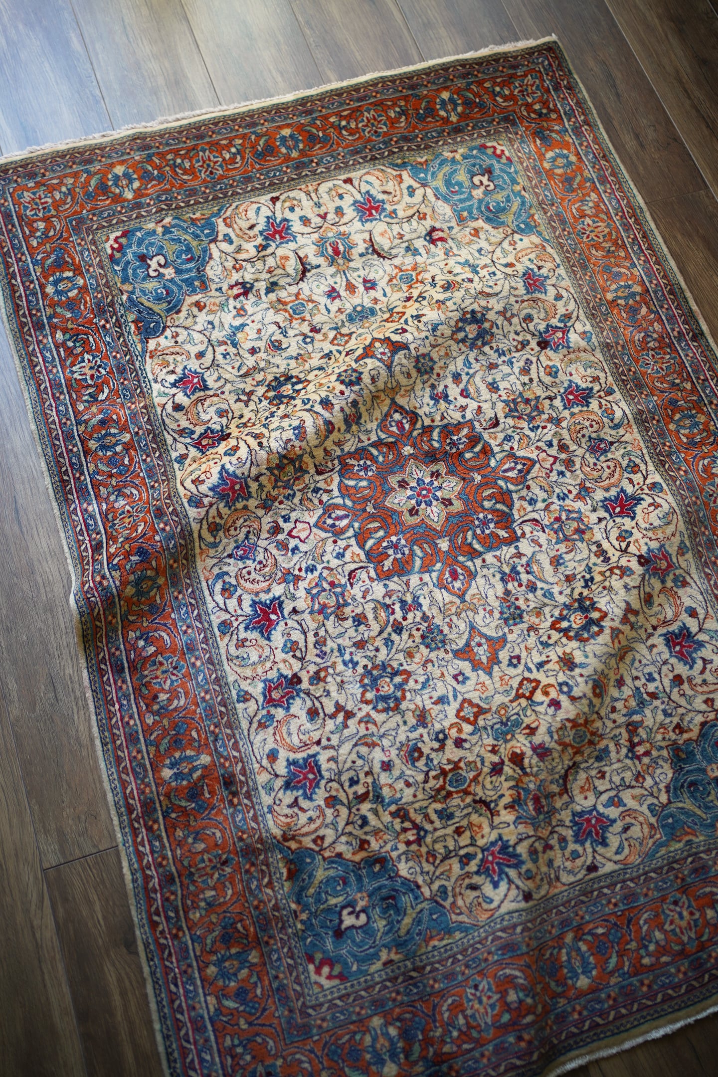 ペルシャ絨毯の五大産地のひとつ、イラン中央部・イスファハンで約40年前に織られたヴィンテージラグです。アイボリーをベースに、オレンジや水色、レッドなどの明るく華やかな色彩で、花々が繊細に描かれた可憐なデザインが印象的。クラシカルでありながらも品の良さが漂い、落ち着いた雰囲気をまとっているため、お部屋にも自然に馴染みやすい一枚です。とても品質の良いソフトウールが使われており、ふわっとしつつもしっとりとした極上の肌触り。厚みは約1.1cmと肉厚で弾力があり、歩くたびに足裏に優しくフィットし、いつまでもラグの上にいたくなるような素晴らしい心地よさです。コンディションも大変良好で、目立つダメージや補修跡なども見当たりません。二人がけのソファ前やパーソナルチェアの足元、ベッドサイドなど、くつろぎのスペースに華やぎと気品を添えてくれますよ♫