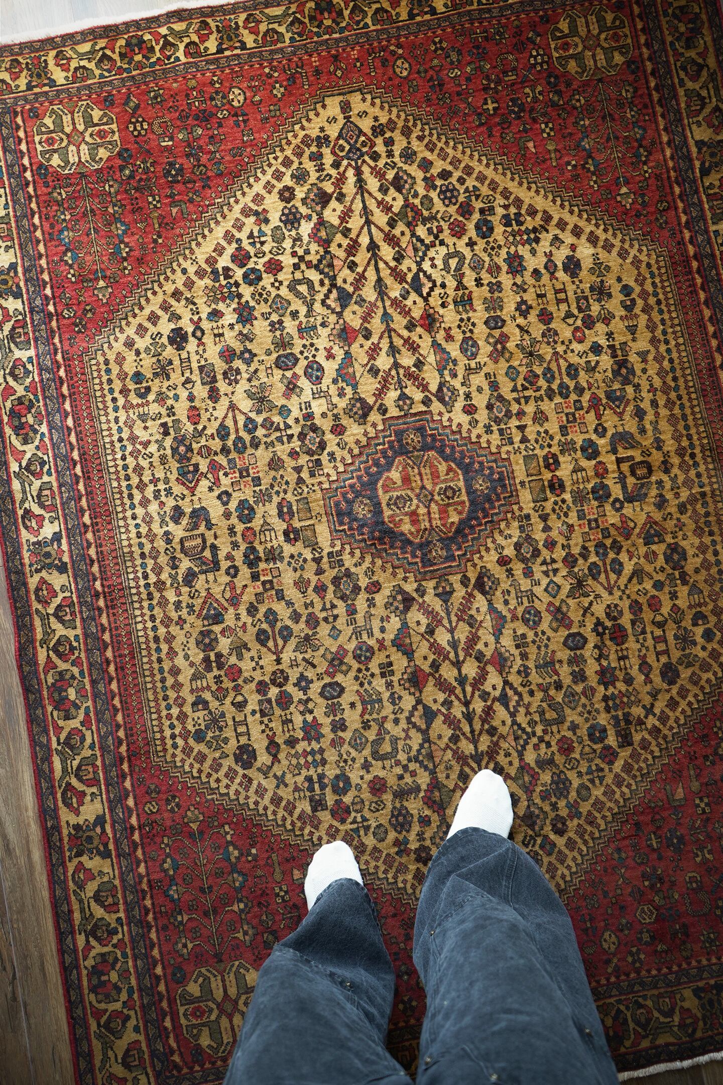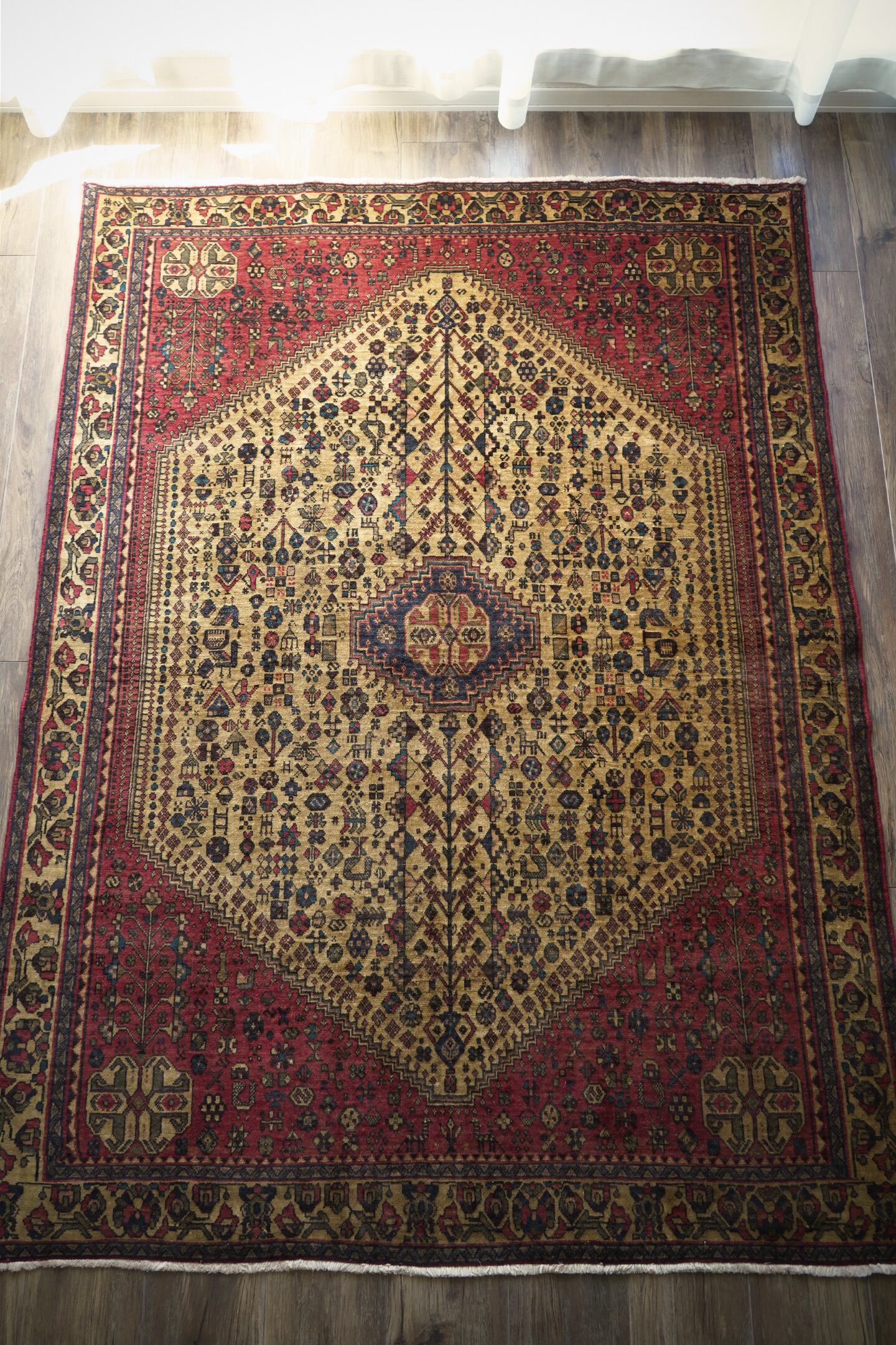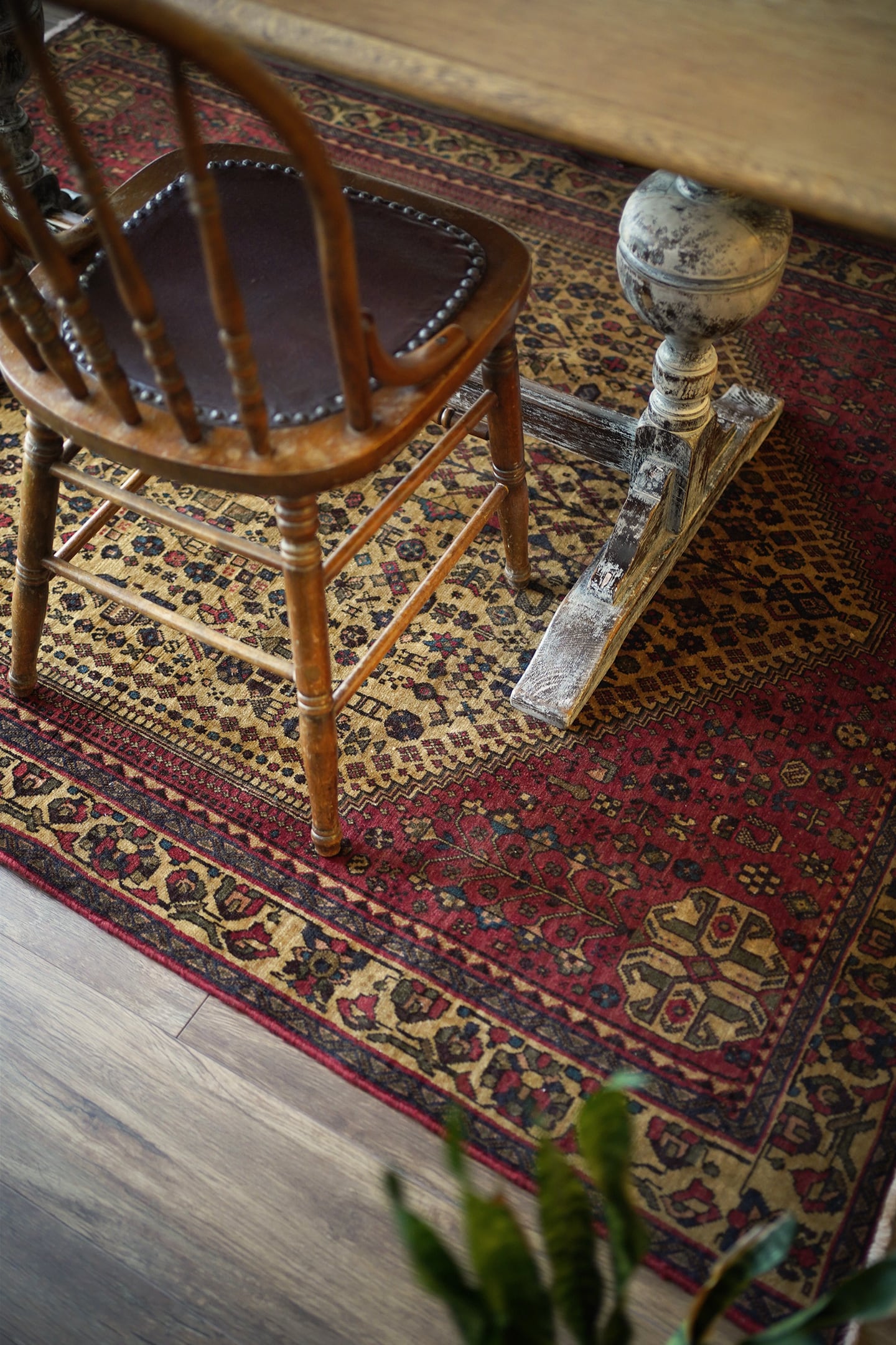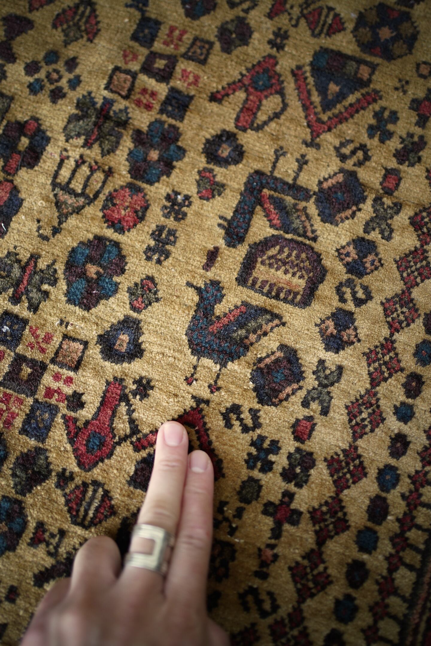 イランのイスファハーンとシラーズの中間に位置するアバデ産のペルシャラグです。繊細に織り込まれた小さな紋様が所狭しと散りばめられ、よく見ると愛らしい鳥たちの姿も。眺めているだけでワクワクしてくる遊び心あふれる一枚です。配色は薄いブラウン、退色した柔らかい赤、濃紺、暗くブルーグリーン、焦茶など。こちらのラグはお部屋に取り入れやすいように、上染め加工を行っており全体的に暗めで渋い風合いに仕上げています。毛並みは短めで、表面はふわサラッとしつつ、パイルの柔らかさを感じる肌触り。目立ったダメージもなく大変良好なコンディション。ダイニングテーブル下にちょうど良いサイズ感です♫