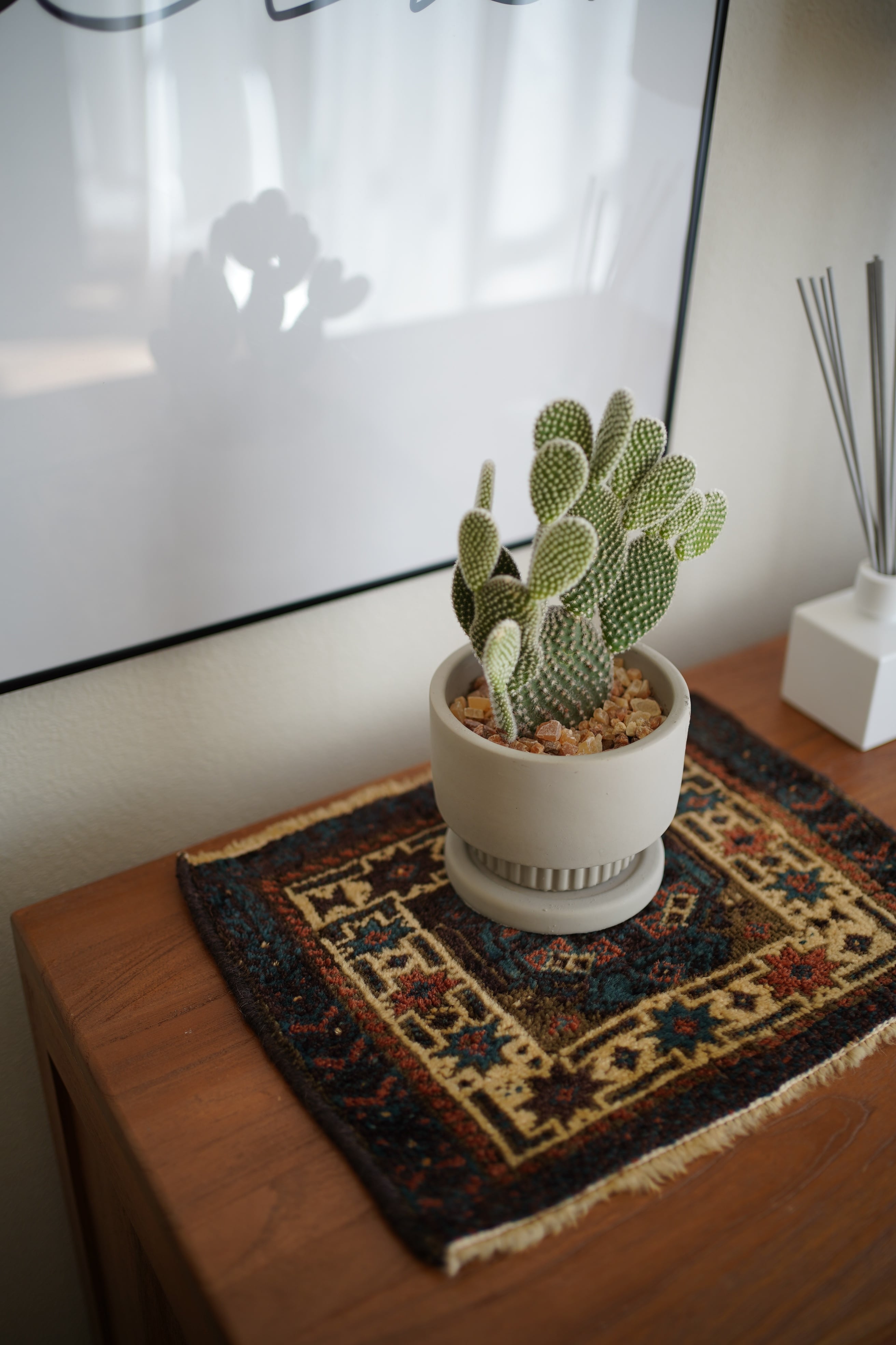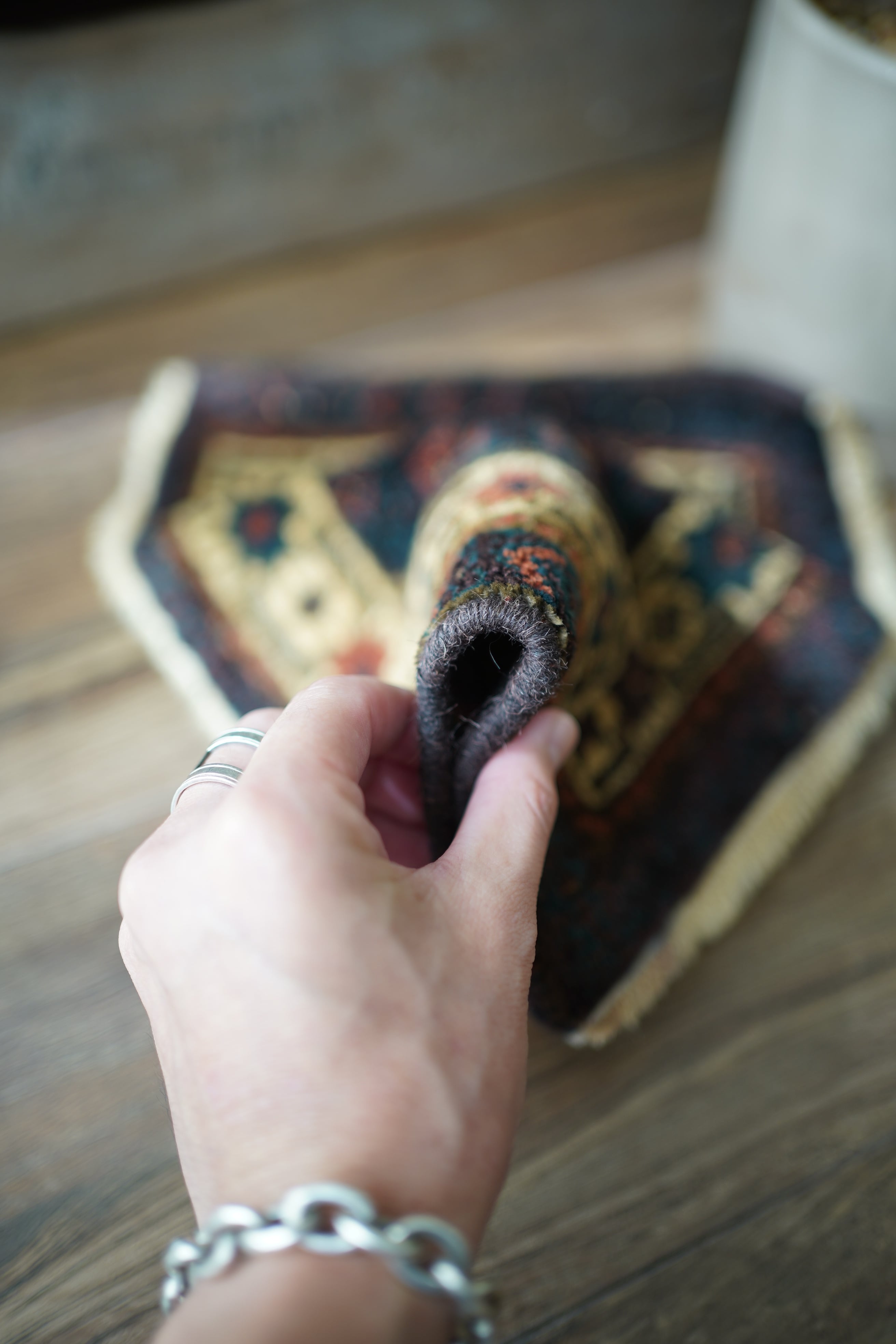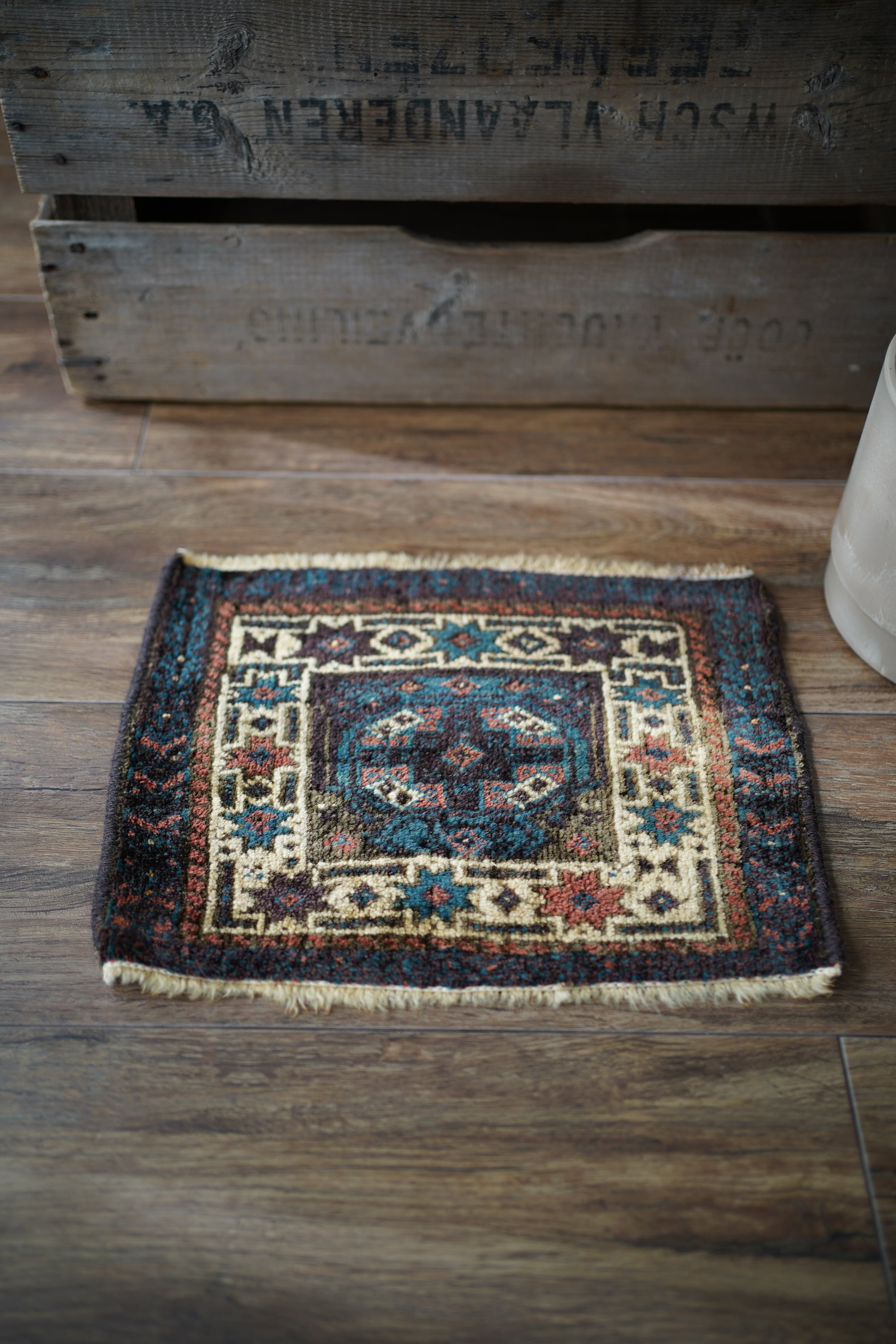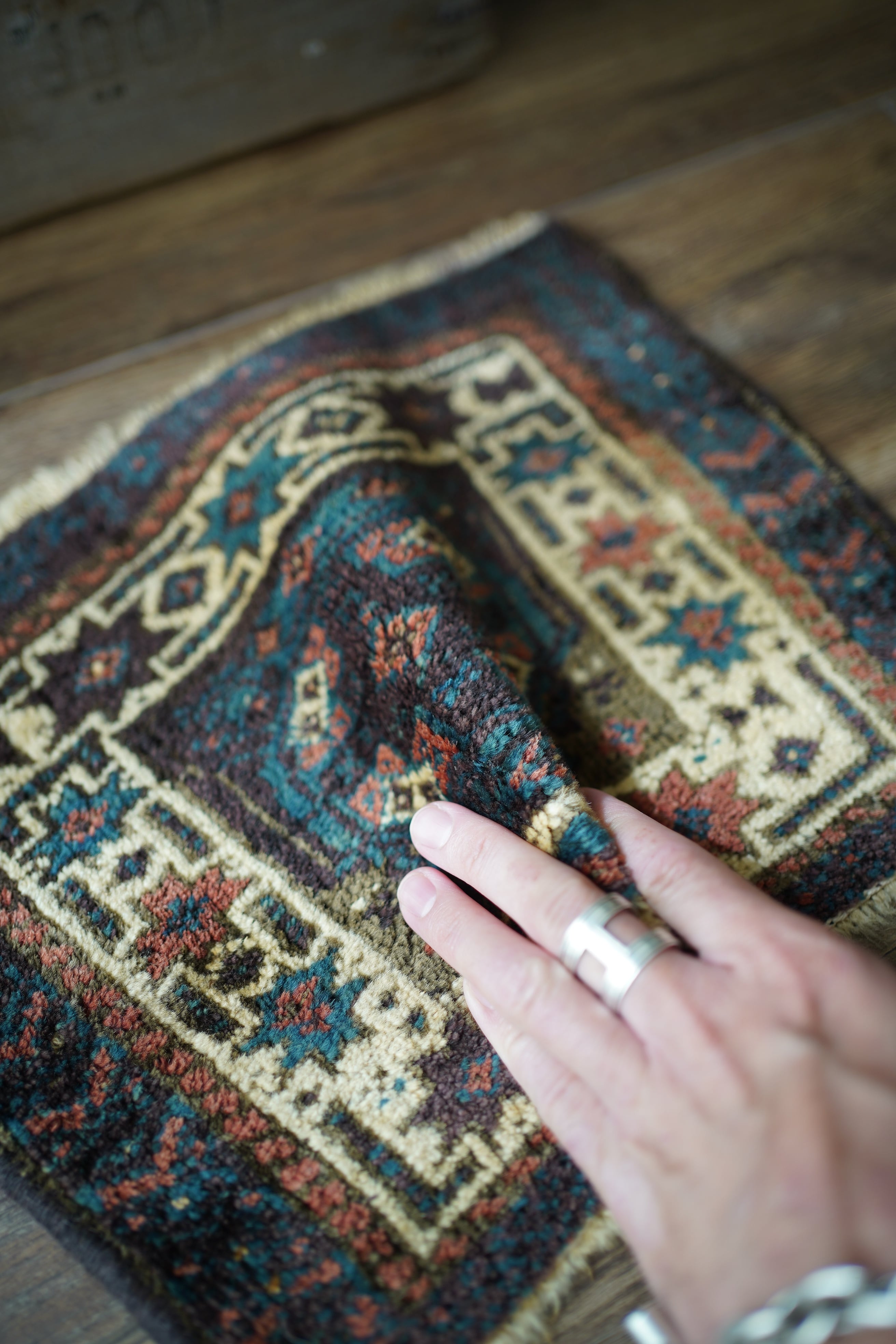 約50年前、イラン南東部のシスターン地方で織られたバルーチラグです。深みのあるブルーグリーン、テラコッタ、ベージュの組み合わせで、草木染めによる優しい風合いが魅力的な一枚。が厚みは約5mm、表面はふわっと滑らかで優しい肌触りをしています。目立ったダメージもなく、良好なコンディションを保っています。小ぶりなミニラグサイズのため、ラックの上に敷いたり、壁に飾ってタペストリーとしてもオススメです♫