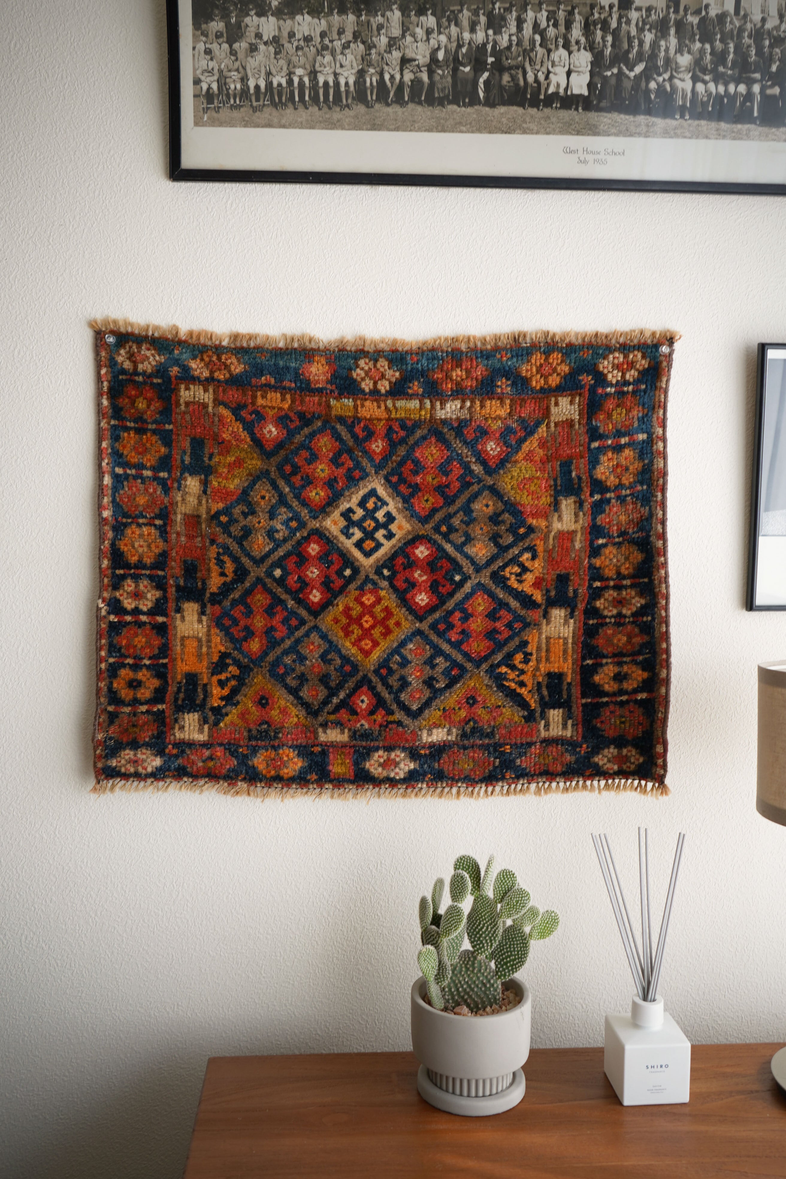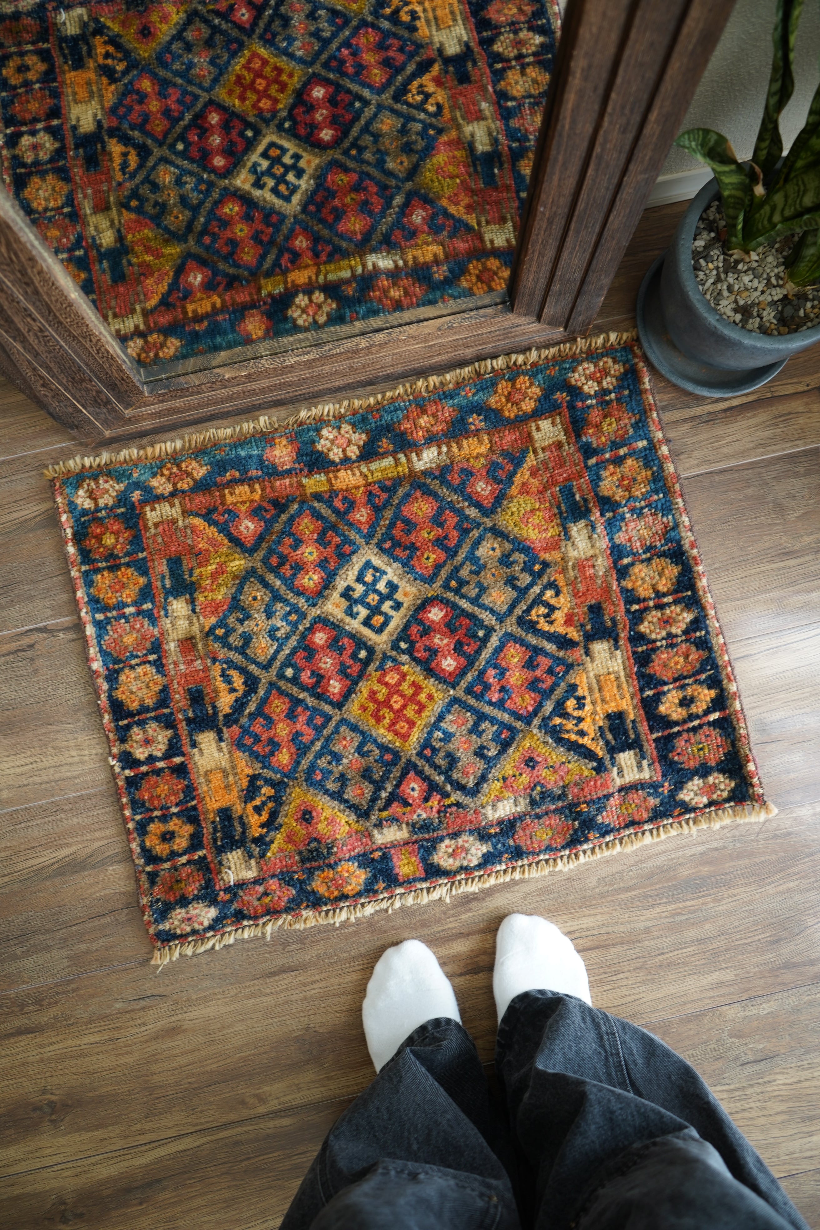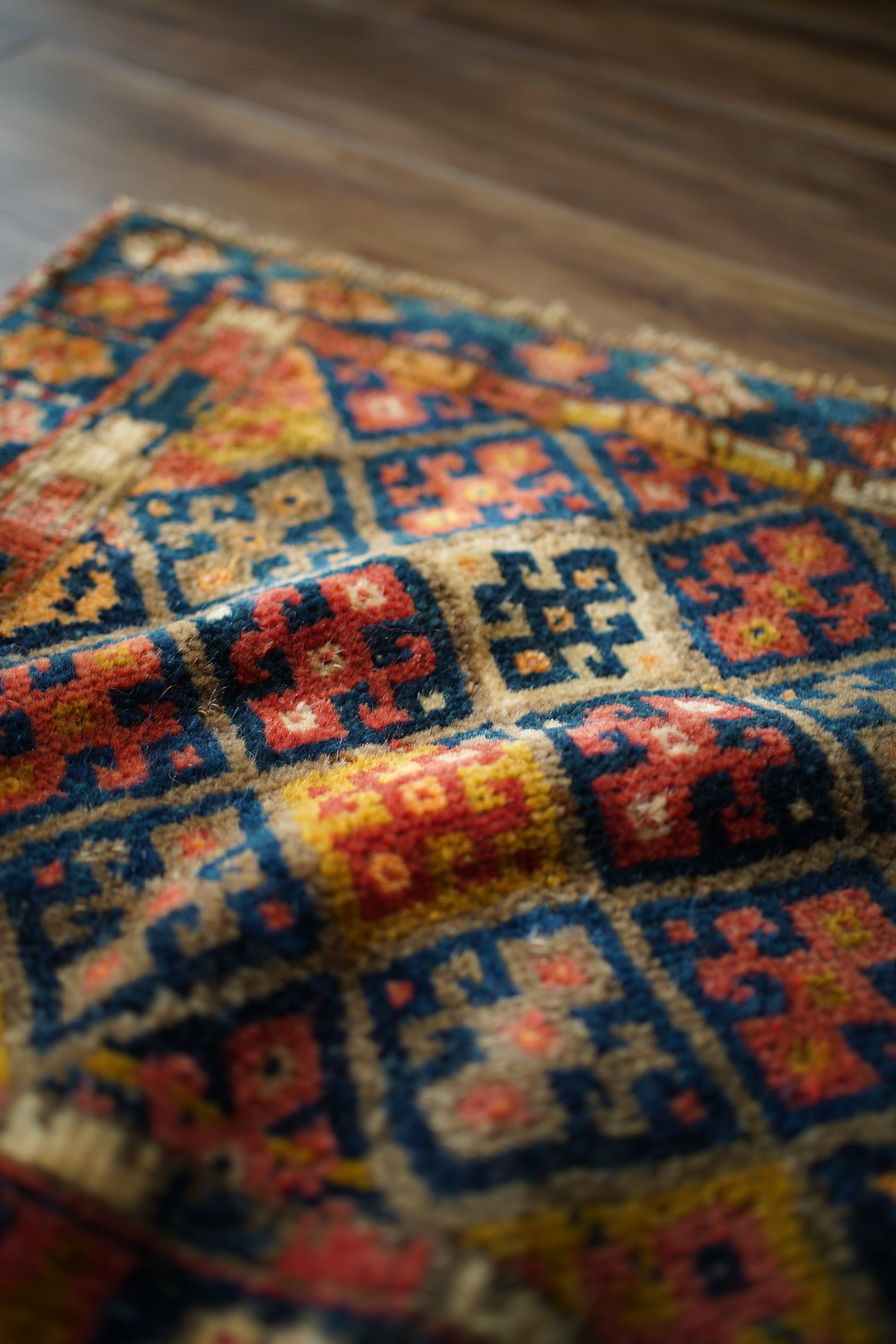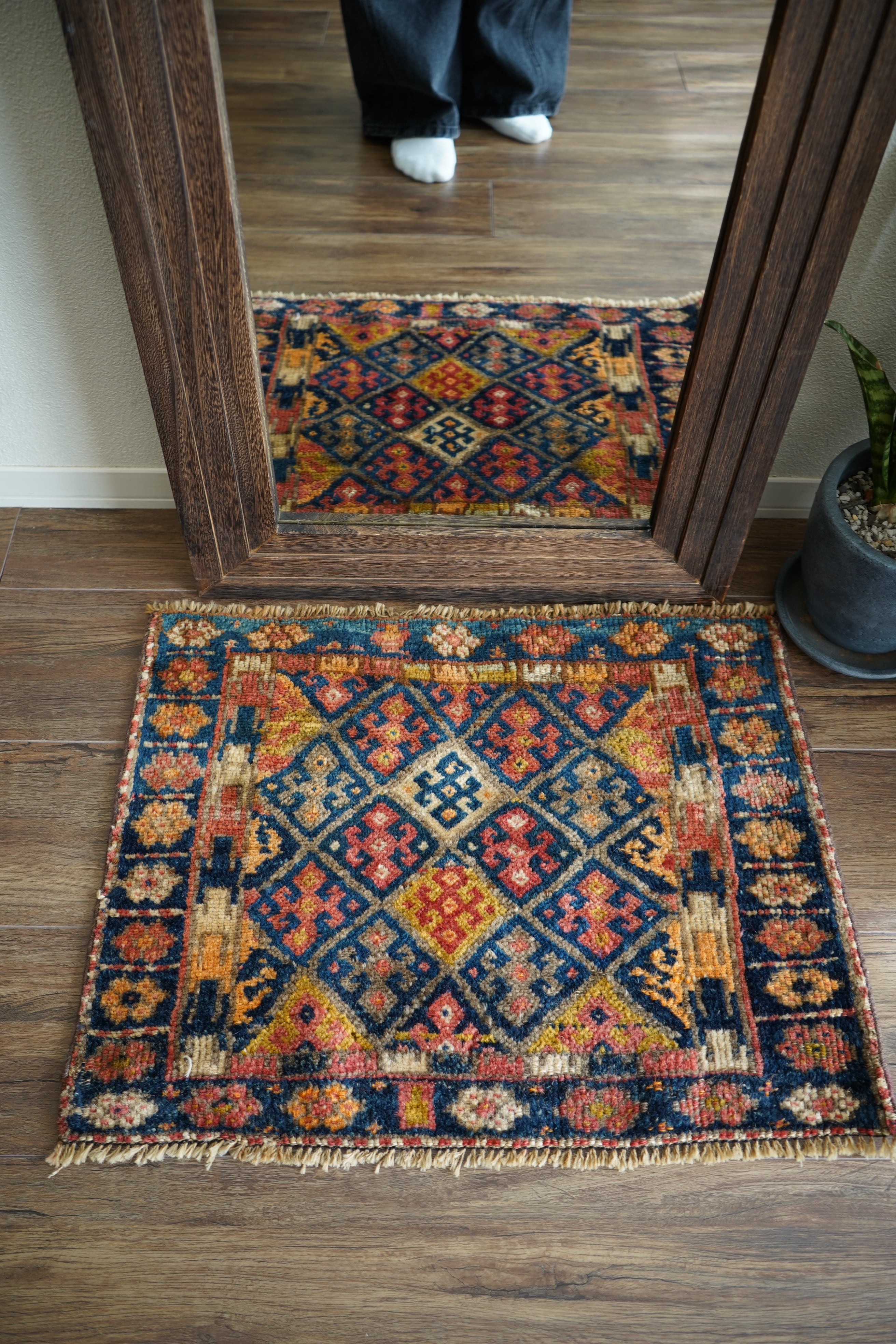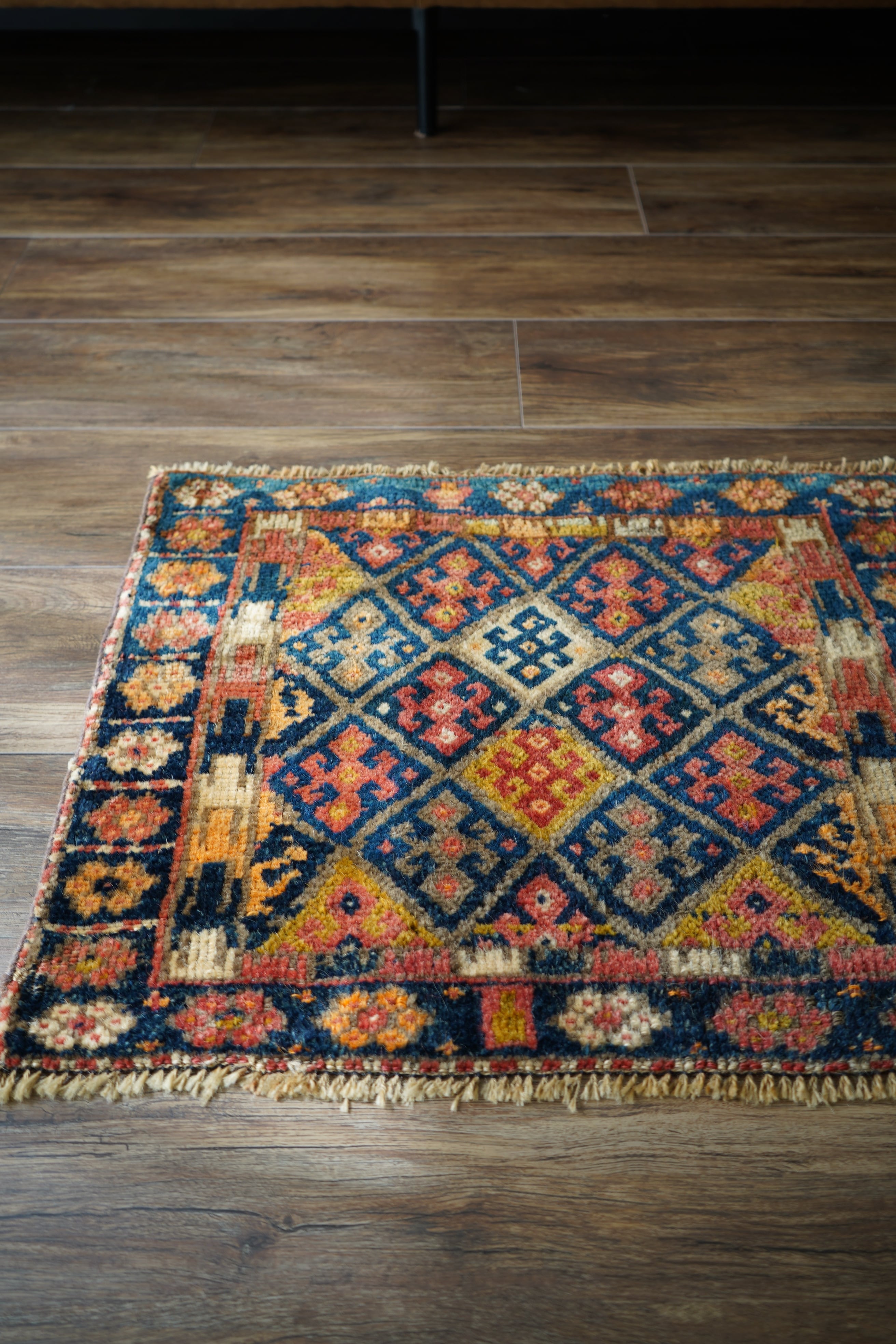 約60年前、イラン〜イラク〜トルコ国境付近のクルディスタン地方で、ジャフ・クルドと呼ばれる遊牧民によって織られたラグです。もともとはバックフェイス(鞍袋の背面)として作られたもので、厚みと密度のあるしっかりとした織りが特徴。ヴィンテージならではの渋い風合いで、素朴さの中に力強さが感じられる一枚です。中央にはジャフ・クルド特有のひし形モチーフが整然と並び、ボーダーには小花のような文様が連なり、どこか可愛らしい印象も。配色は暗めのブルーグリーンをベースに、朱色、ベージュ、黄土色、薄いオレンジなど。経年によって深みを増した温かみのある色合いが、美しく調和しています。表面はふわっと滑らかで、厚みは約7〜8mmほど。目立ったダメージもなく、全体的に良好なコンディションを保っています。小さなサイズながら存在感があり、壁掛けや全身鏡の前など、アートピースのように楽しんでいただける一枚です♫