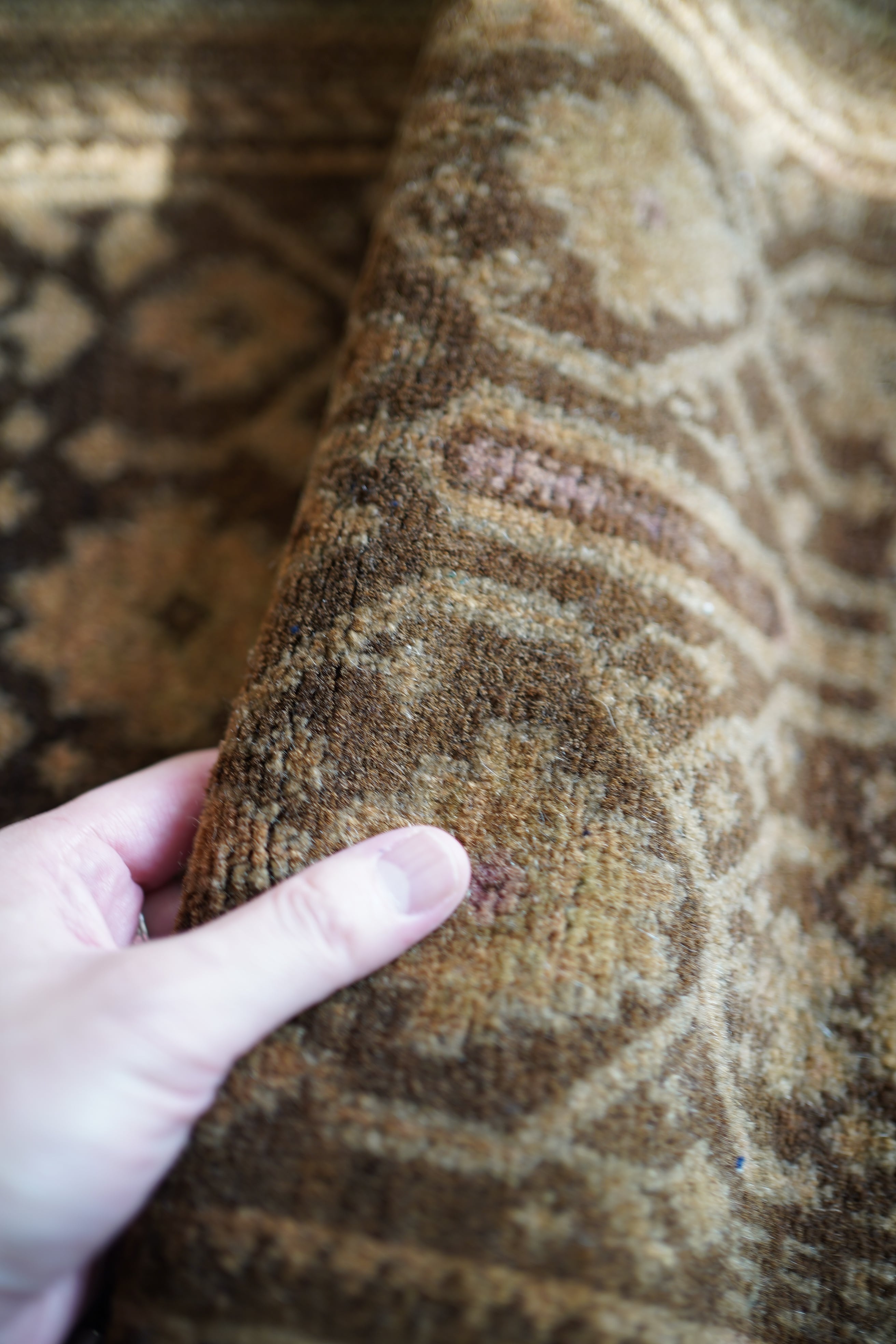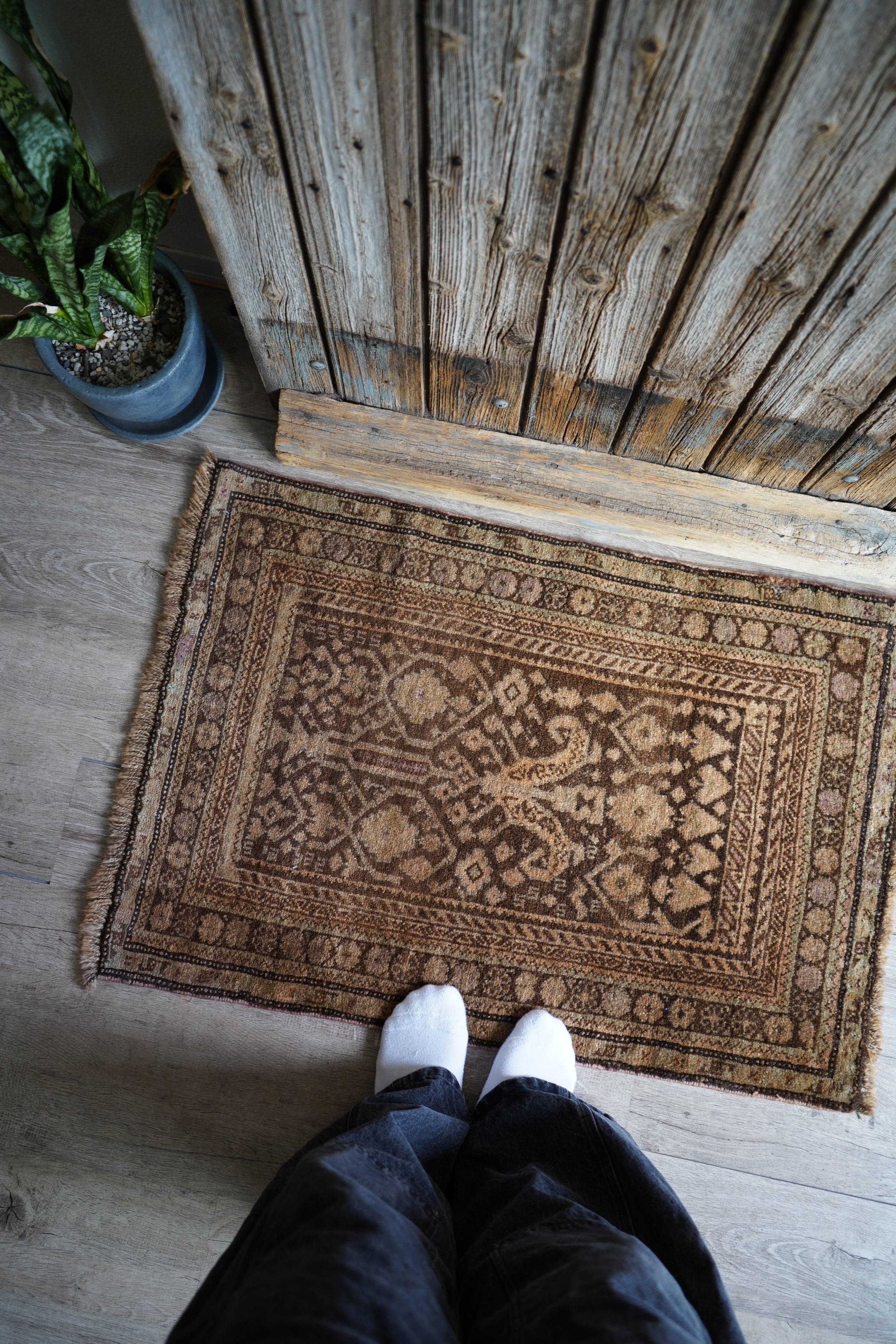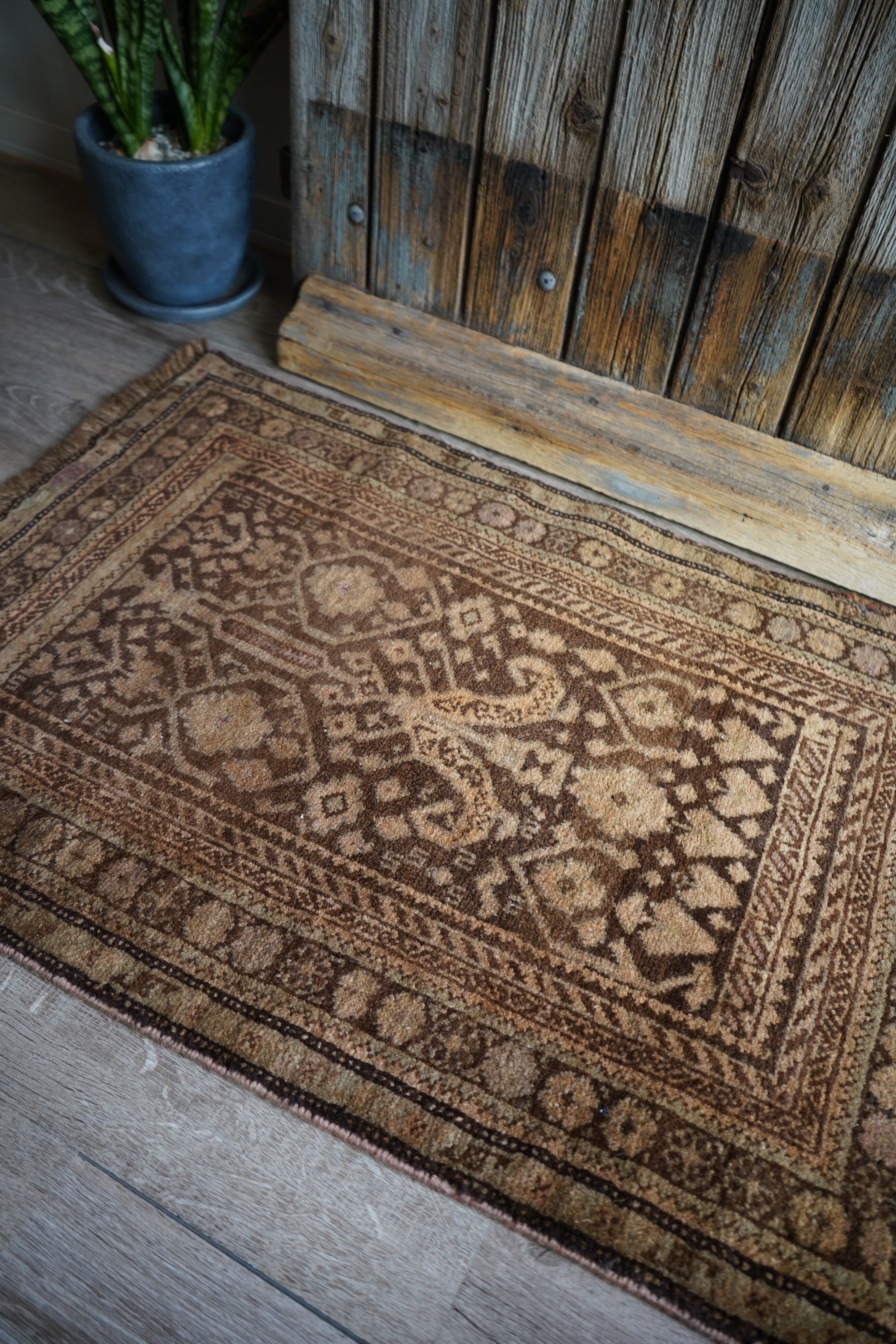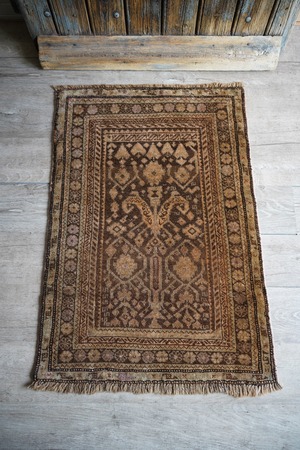 約40年前にアフガニスタンでバルーチ族によって織られたラグです。焦茶や薄いブラウンを基調とした、落ち着きのあるシックな色合いが特徴の一枚。中央には植物文様を思わせる樹木モチーフが織り込まれ、その周囲を囲むように幾何学的な模様が連なるデザイン。控えめながらも奥行きのある表情で、お部屋のインテリアにも自然に馴染み、落ち着きのある空間を演出してくれます。表面はふわっと柔らかく優しい肌触りで、厚みは約7mmほど。一部補修跡がありますが、同系色の糸で丁寧に馴染ませており、ほとんど目立ちません(お写真最後をご参照ください)。それ以外は全体的に良好なコンディションを保っています。玄関や洗面スペース、ラック前などにどうぞ♫