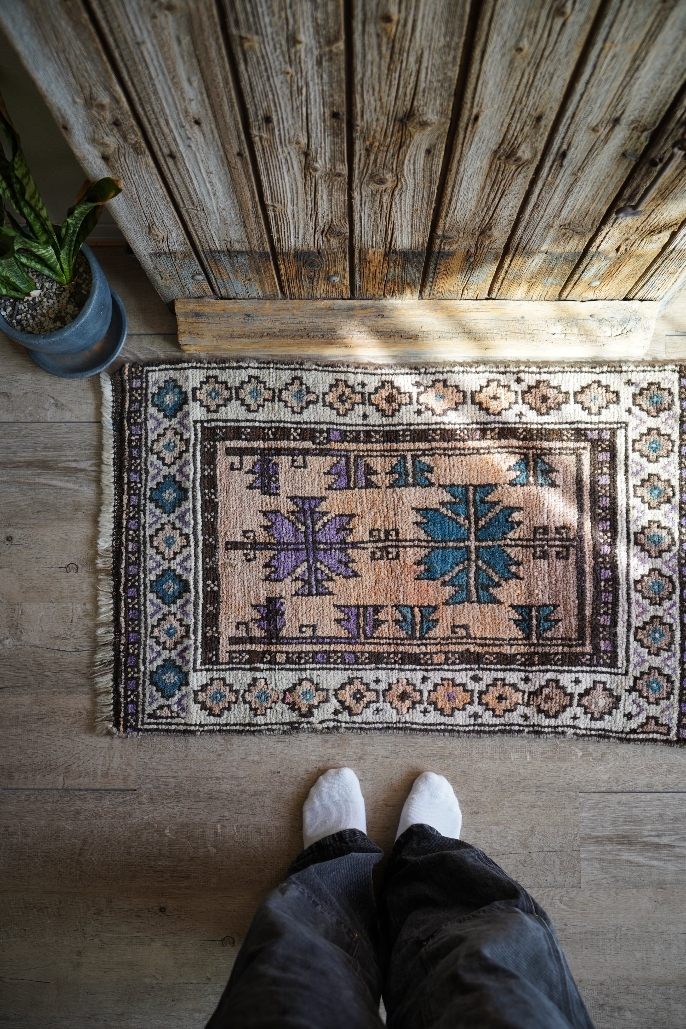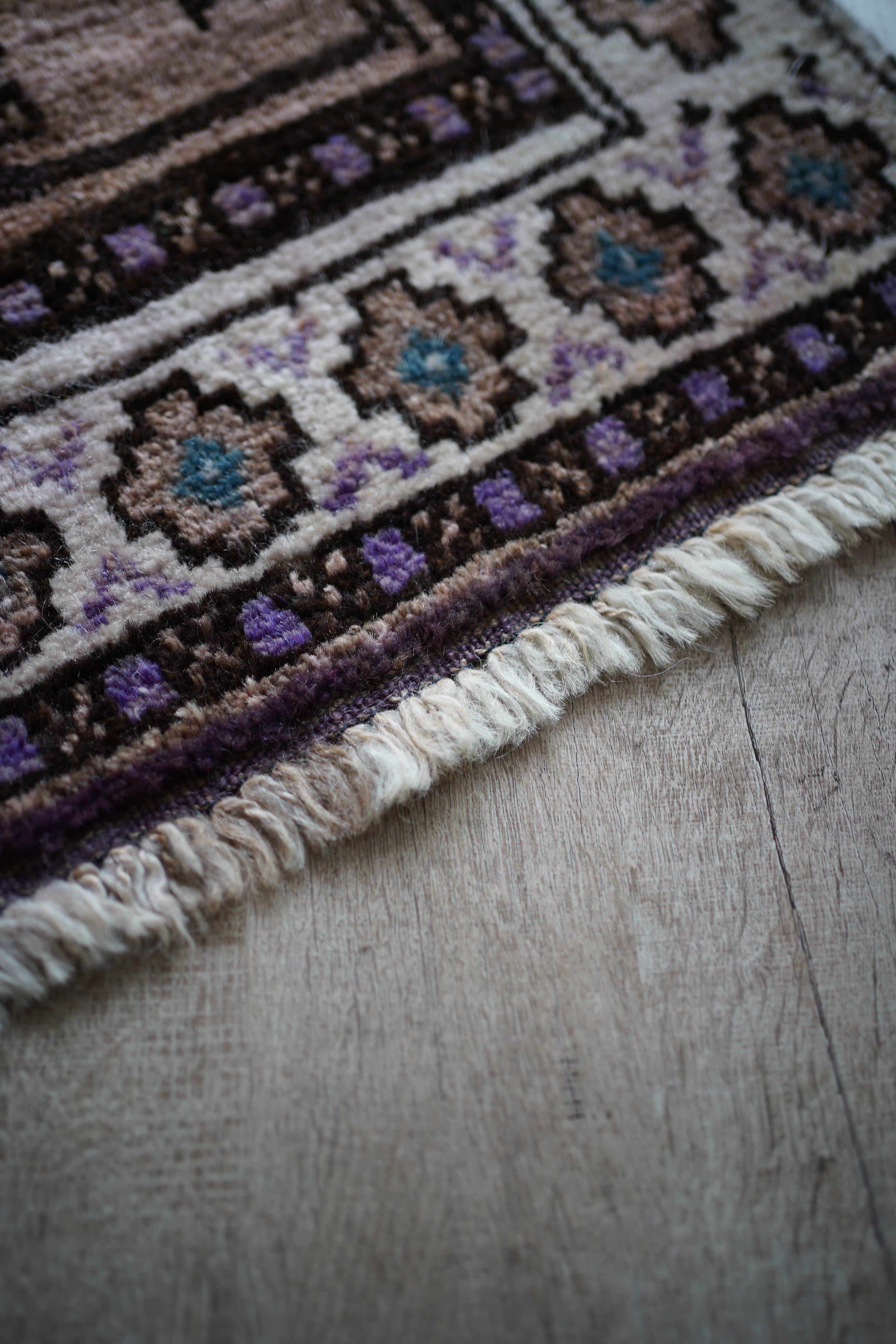 アフガニスタン北西部ヘラート近郊に暮らすマルダリ族によって織られたラグです。肌色のような淡いオレンジをベースに、薄紫とブルーグリーンの葉っぱの形をしたチナール紋様が2つ象徴的に織り込まれたデザイン。なかなか出会えないユニークな配色とバランスに一目惚れし、仕入れを決めました。厚みは約9mmで、表面はふわふわと柔らかく優しい肌触り。目立ったダメージもなく、大変良好なコンディションです。全身鏡の足元やラック前、玄関マットとしても取り入れやすいサイズ感で、小さなスペースにも個性と温もりを添えてくれる味わい深いヴィンテージラグです♫