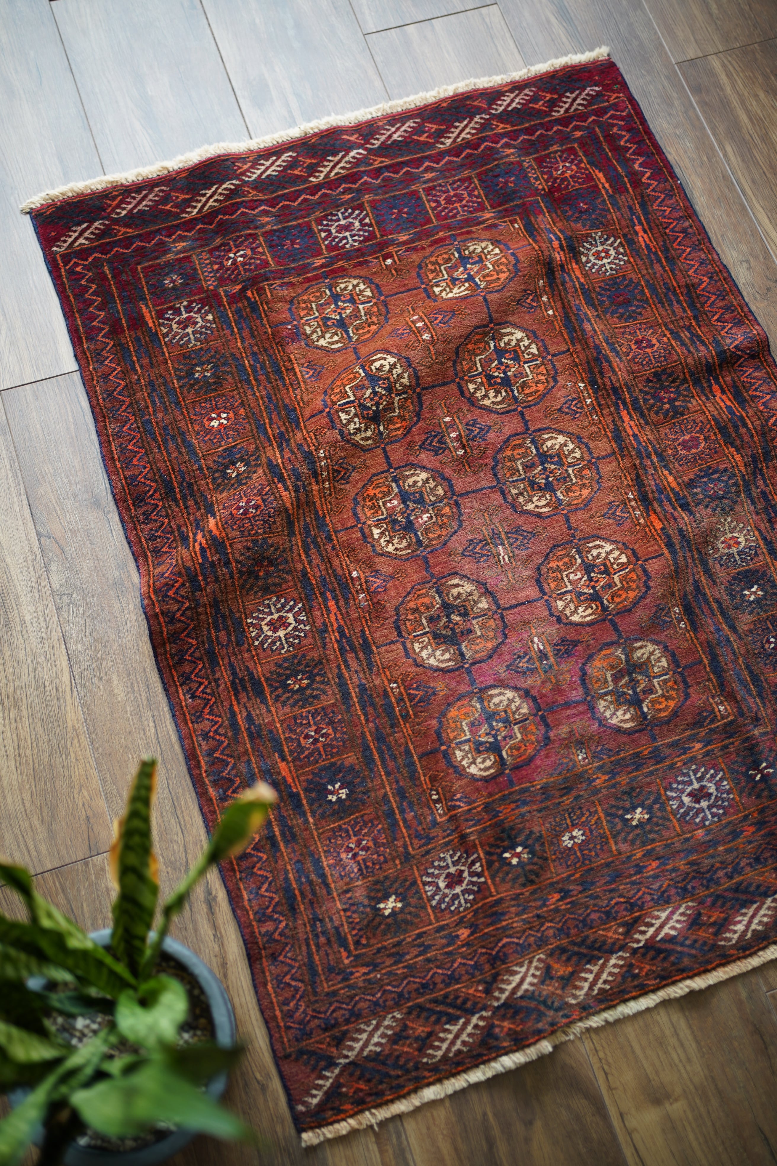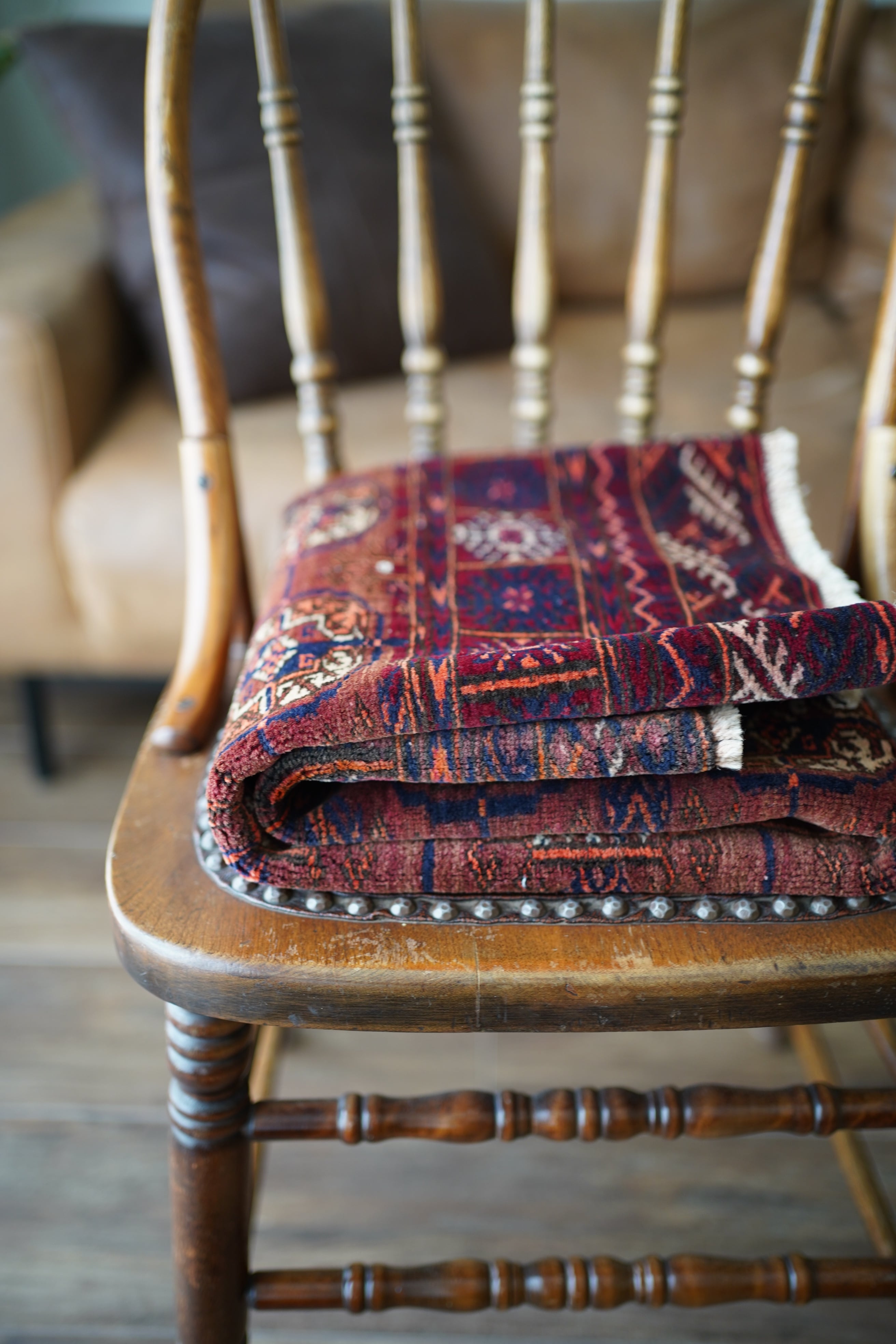 約50年前にアフガニスタンで織られたトルクメンによって織られたヴィンテージラグ。深みのあるえんじ色をベースに、オレンジ、ベージュ、ブラックが織り交ざった配色で、経年による落ち着いた雰囲気が魅力的です。中央にはトルクメンラグの象徴ともいえる繰り返し文様「ギュル」が並び、周囲を囲む幾何学的なボーダーも整然と美しく、まさに“王道のトライバルラグ”といった印象。力強さと品の良さを兼ね備えた、永く愛されるデザインです。表面はふわサラっとした優しい肌触り。厚みは約6mmほどで扱いやすく、リビングのアクセントやベッドサイドにも取り入れやすいサイズ感です。目立ったダメージもなく大変良好なコンディション。年月を重ねてもなお気品を保ち続ける、トルクメンらしい凛とした佇まいの一枚です。