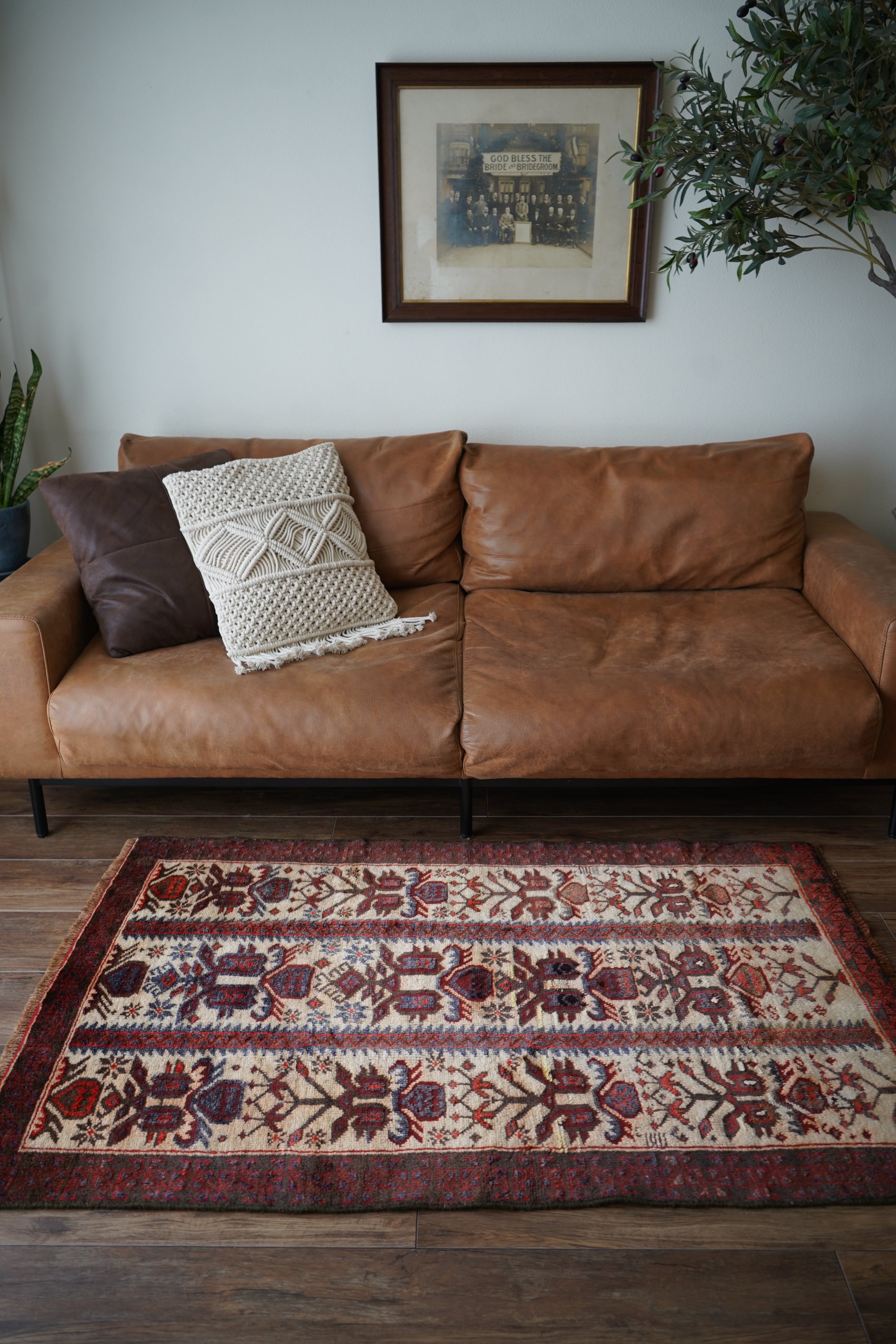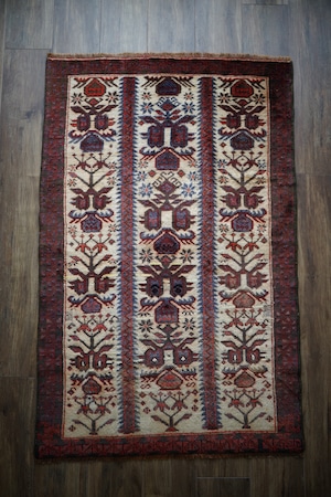 約40年前にアフガニスタンでバルーチ族によって織られたヴィンテージラグ。3本の縦ラインで構成されたユニークなデザインで、それぞれに植物や花を思わせるモチーフが整然と並んでいます。ベージュとえんじを基調に、薄い赤、チャコールグレーが織り交ざった、落ち着きと温もりを併せ持つ色合いが印象的な一枚です。表面はふわっと柔らかく、気持ちの良い肌触り。厚みは約8mmほどで、しっかりとした踏み心地があります。目立ったダメージもなく、グッドコンディション。リビングのアクセントや二人掛けソファ前、ベッドサイドなどに取り入れやすいサイズ感です♫