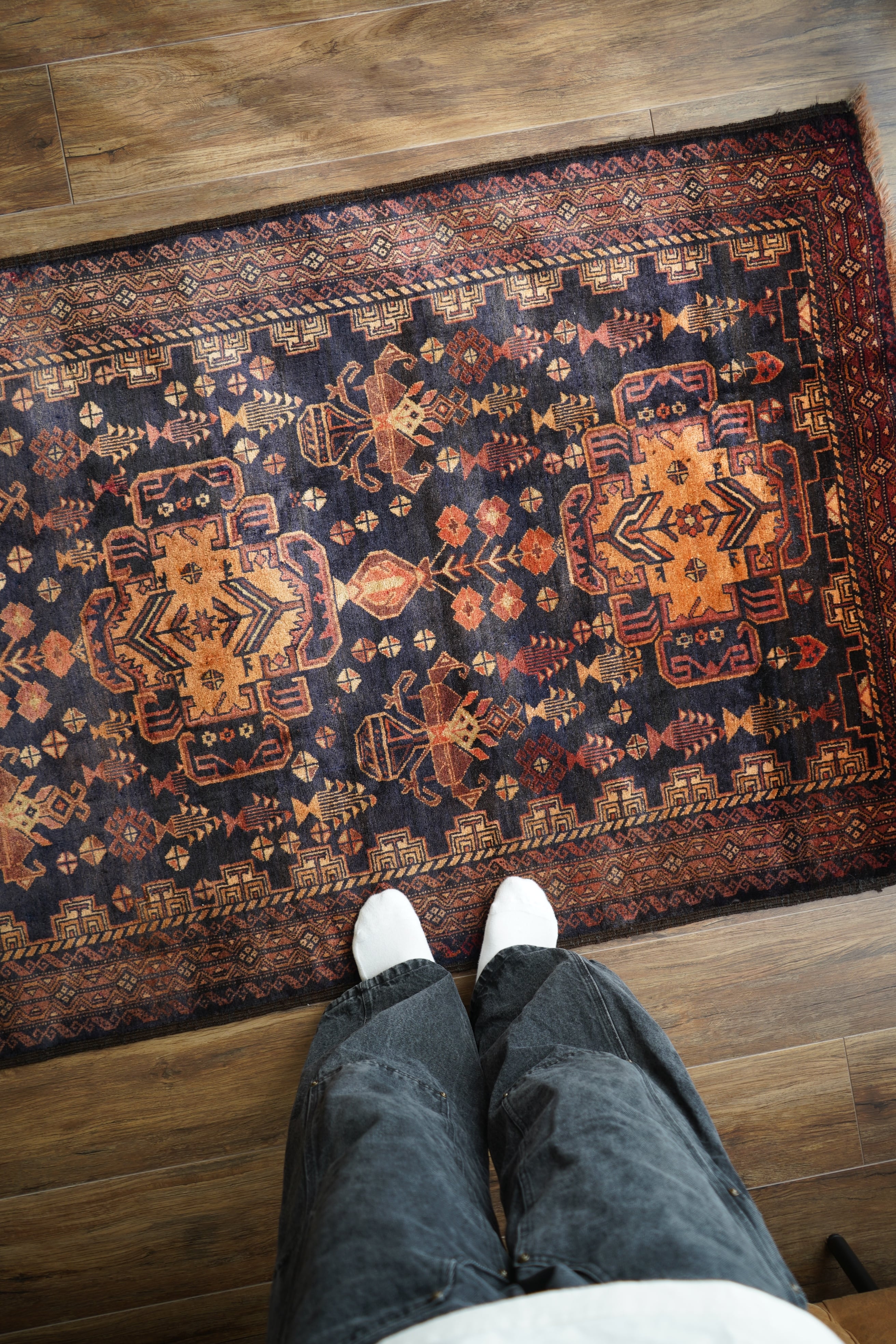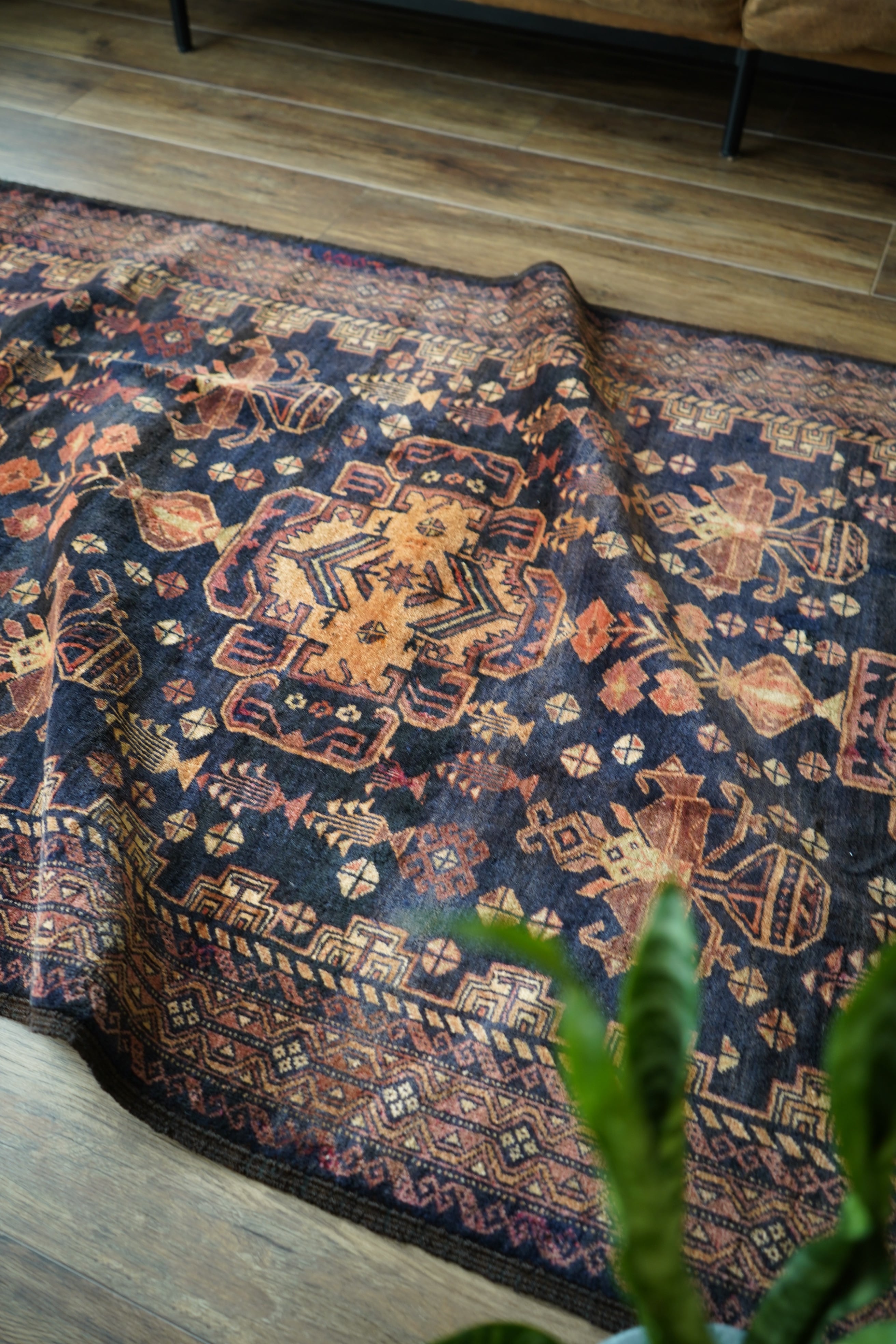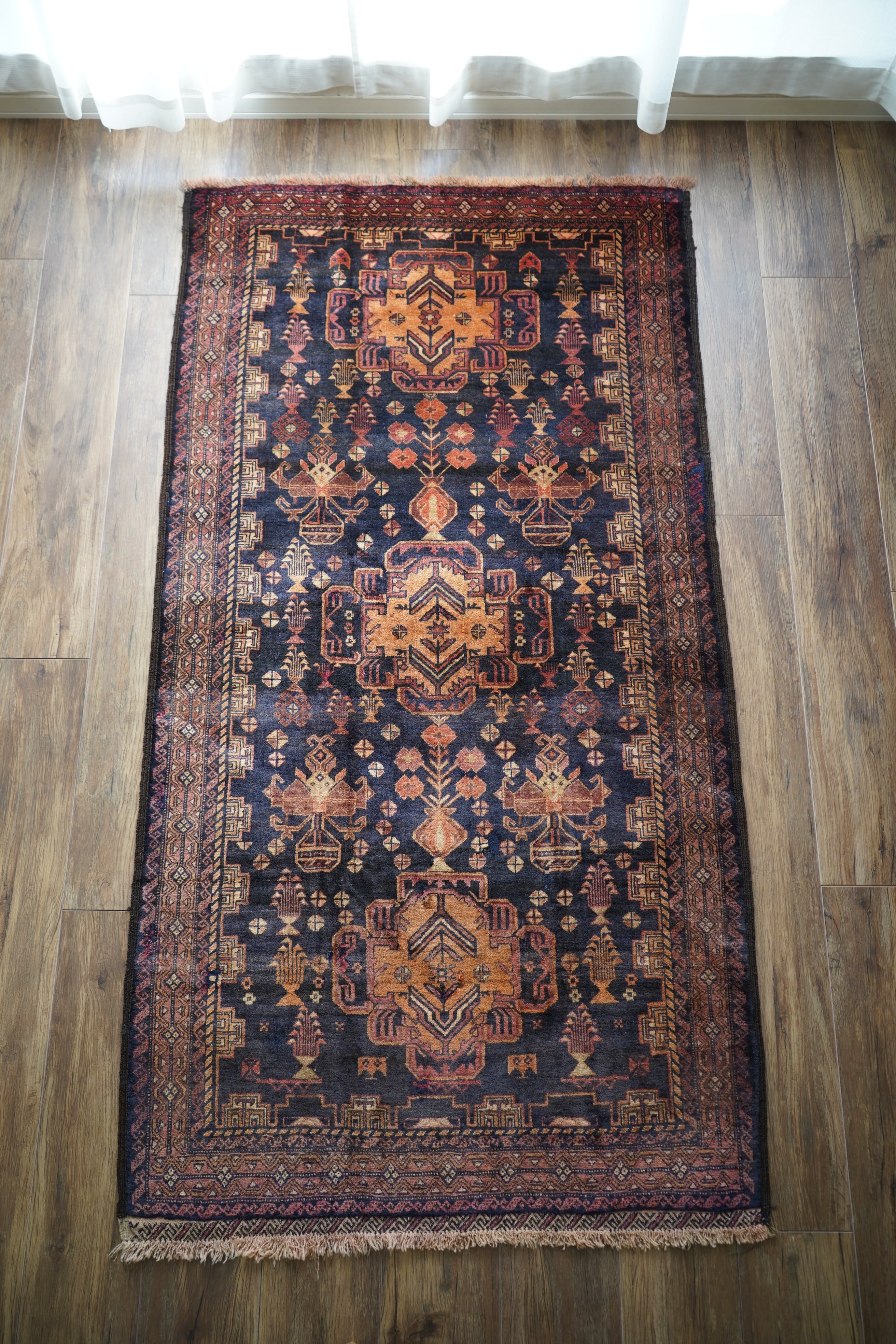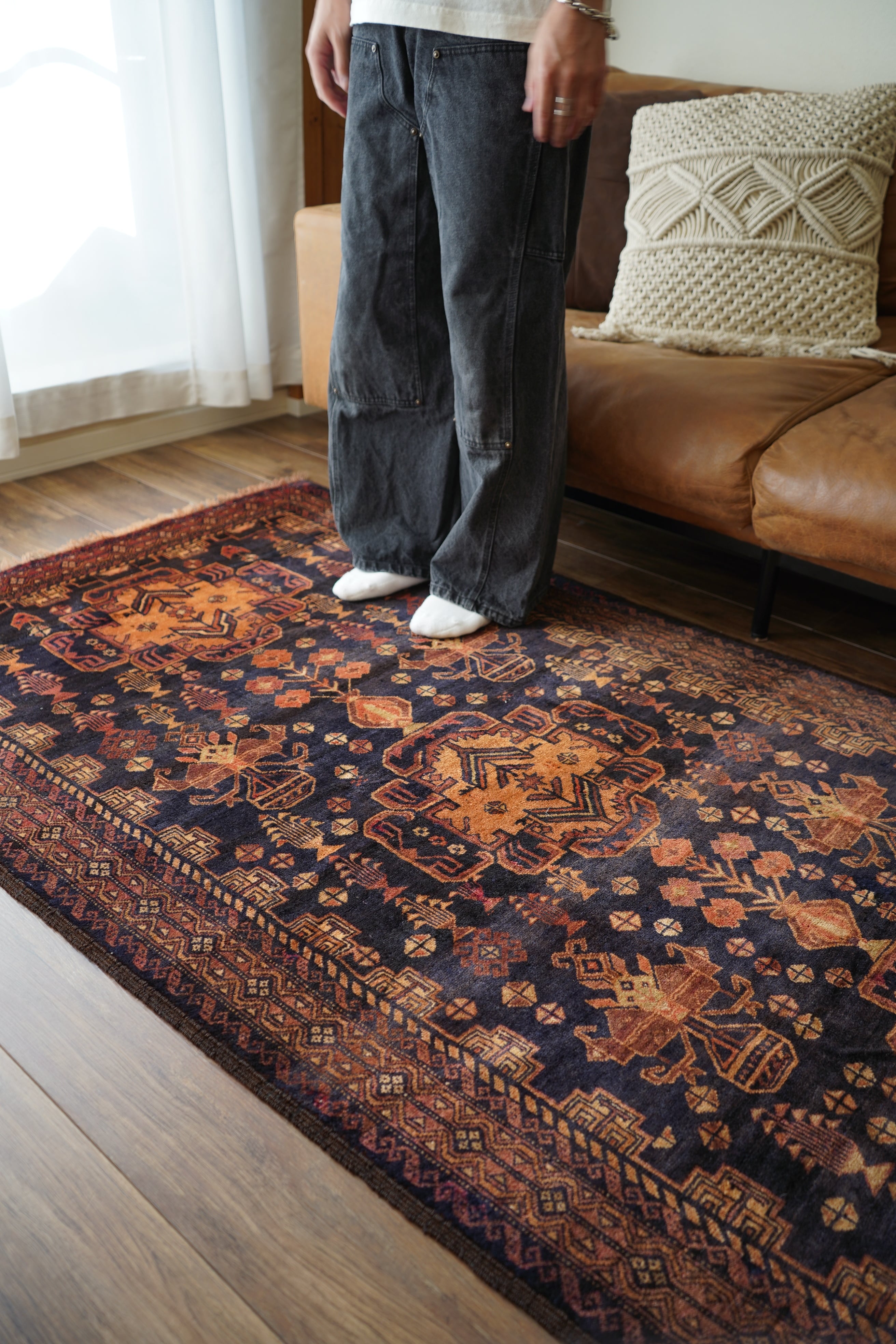 経年約40年、アフガニスタンのバルーチ族によって織られたヴィンテージラグです。濃紺をベースに、テラコッタ、ベージュ、焦茶、淡い赤などの色糸が織り込まれ、温かみと深みのある落ち着いた印象の一枚。花瓶に入った花を思わせるモチーフや、部族的な幾何学文様が並び、素朴ながらも味わい深い佇まいです。ヴィンテージならではの風合いが心地よく、ヴィンテージ家具などのインテリアとの相性も非常によろしいかと思います。厚みは約7mmで、ふわっとしなやかな優しい肌触り。部分的にパイルが薄くなっている箇所もありますが、全体的に見て良好なコンディションを保っています。ソファ前やベッドサイド、書斎などにどうぞ♫