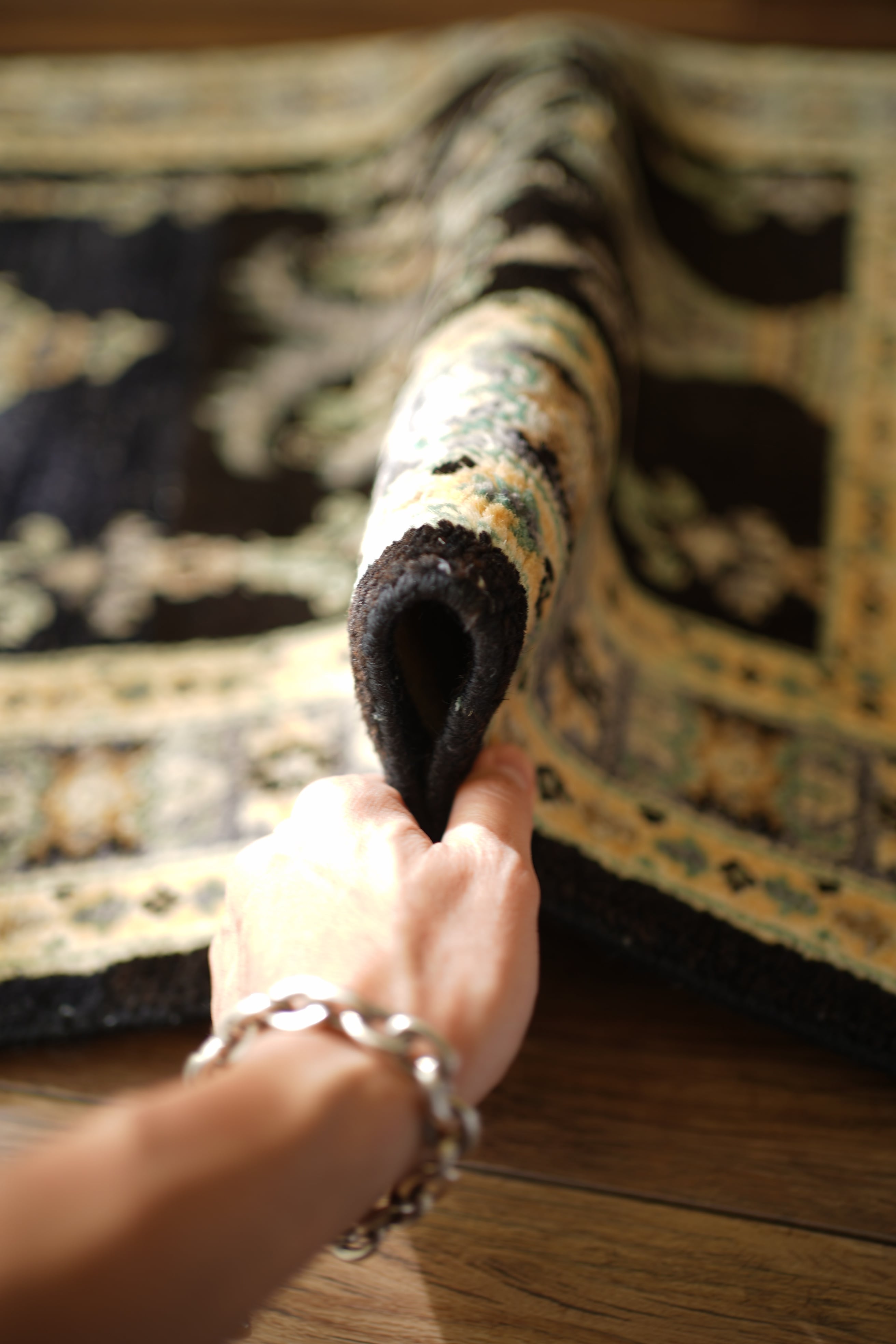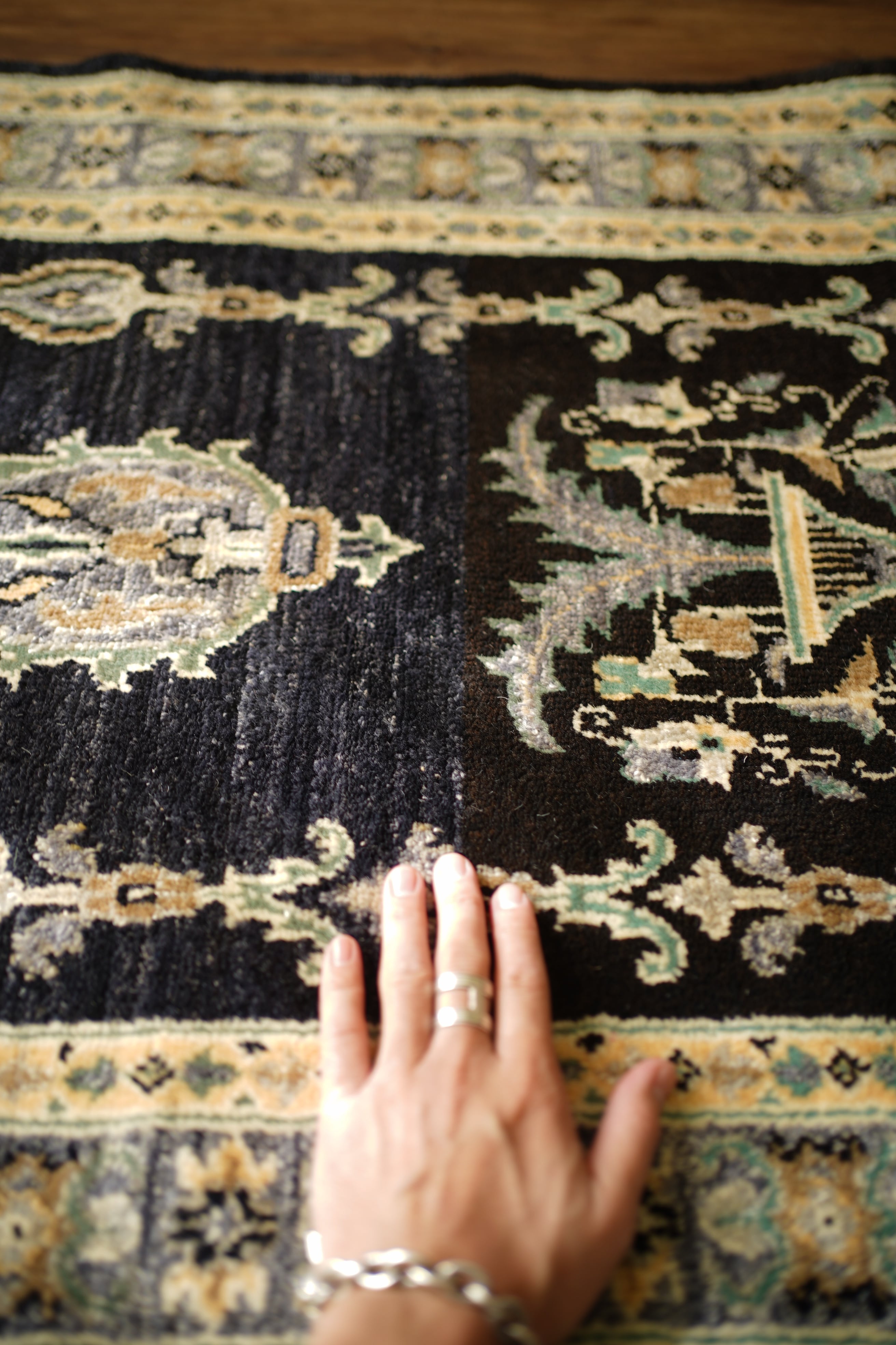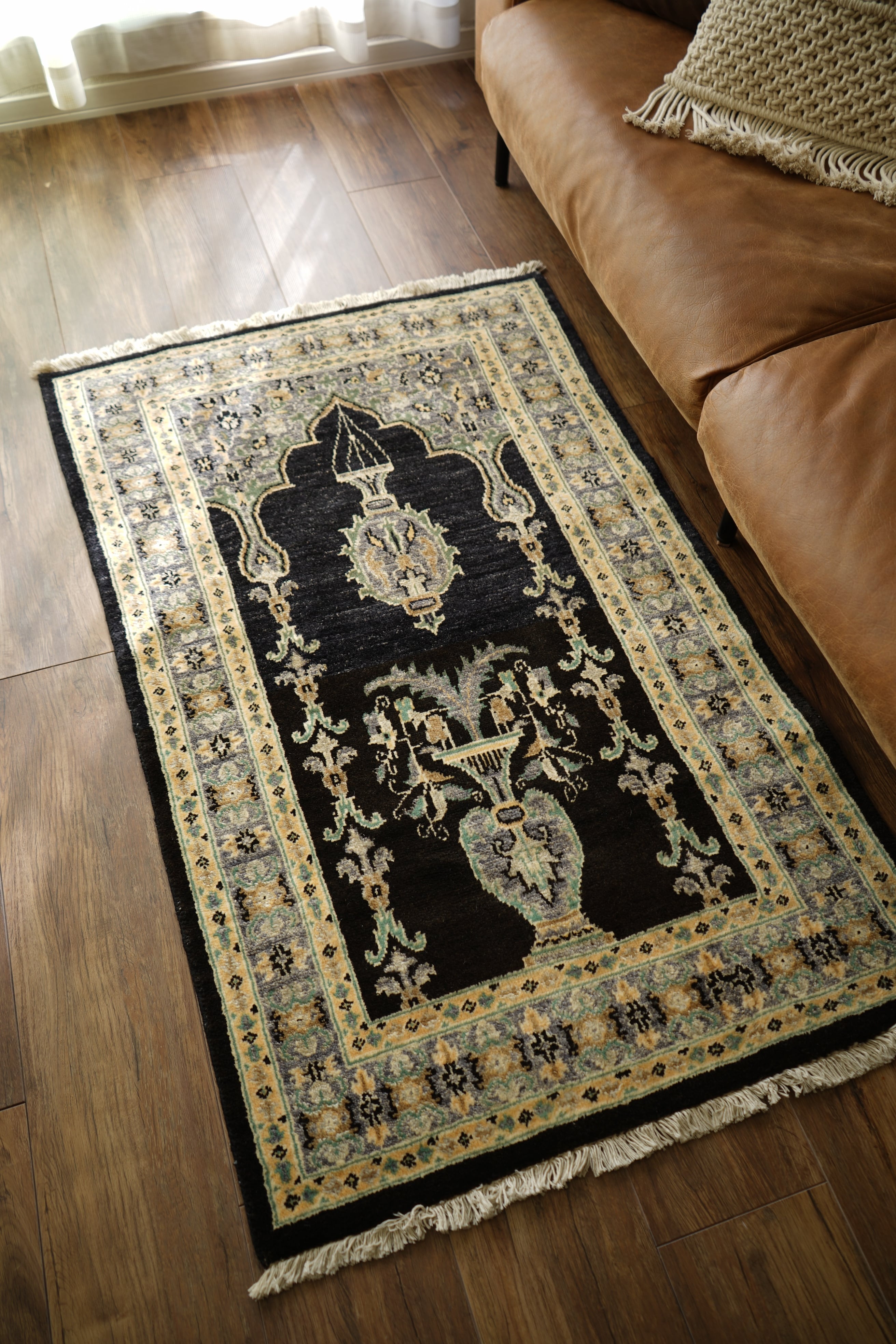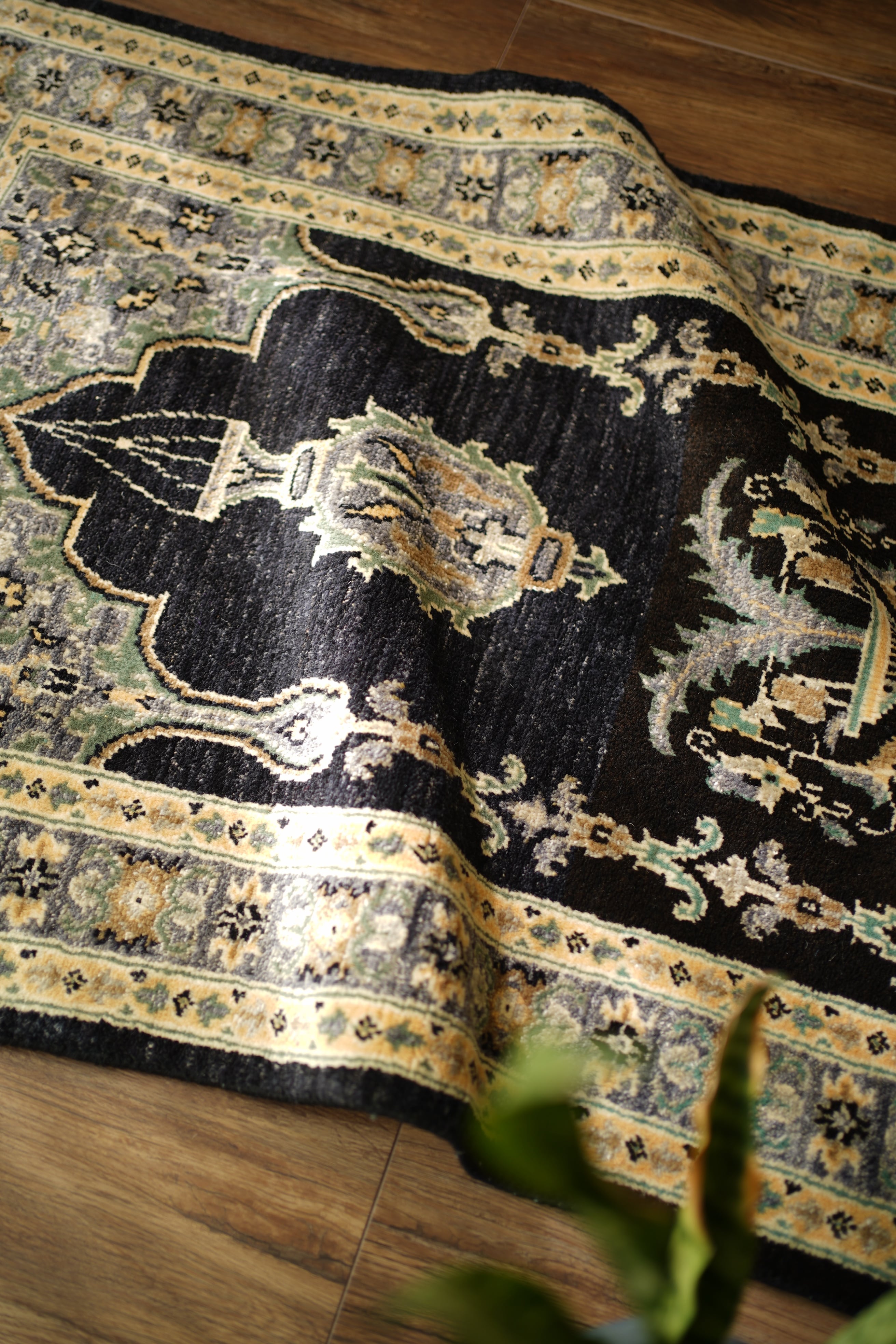 経年約30年ほどのパキスタン産ヴィンテージラグです。中央には花瓶モチーフの文様が配され、左右対称に広がるデザインがエレガントな雰囲気を醸し出しています。ブラックを基調に、くすんだエメラルドグリーン、淡い黄土色、グレーなどが使われた配色で、上品さと洗練された色使いが魅力的。真ん中あたりで黒のトーンが微妙に変化しており、ハンドメイドならではの味わいと奥行きを感じられます。厚みは約1cmで、表面はふわっと優しい肌触り。目立ったダメージもなく、大変良好なコンディションです。ウォークインクローゼットやベッドサイドなど、落ち着いた空間にも映えるかと思います。