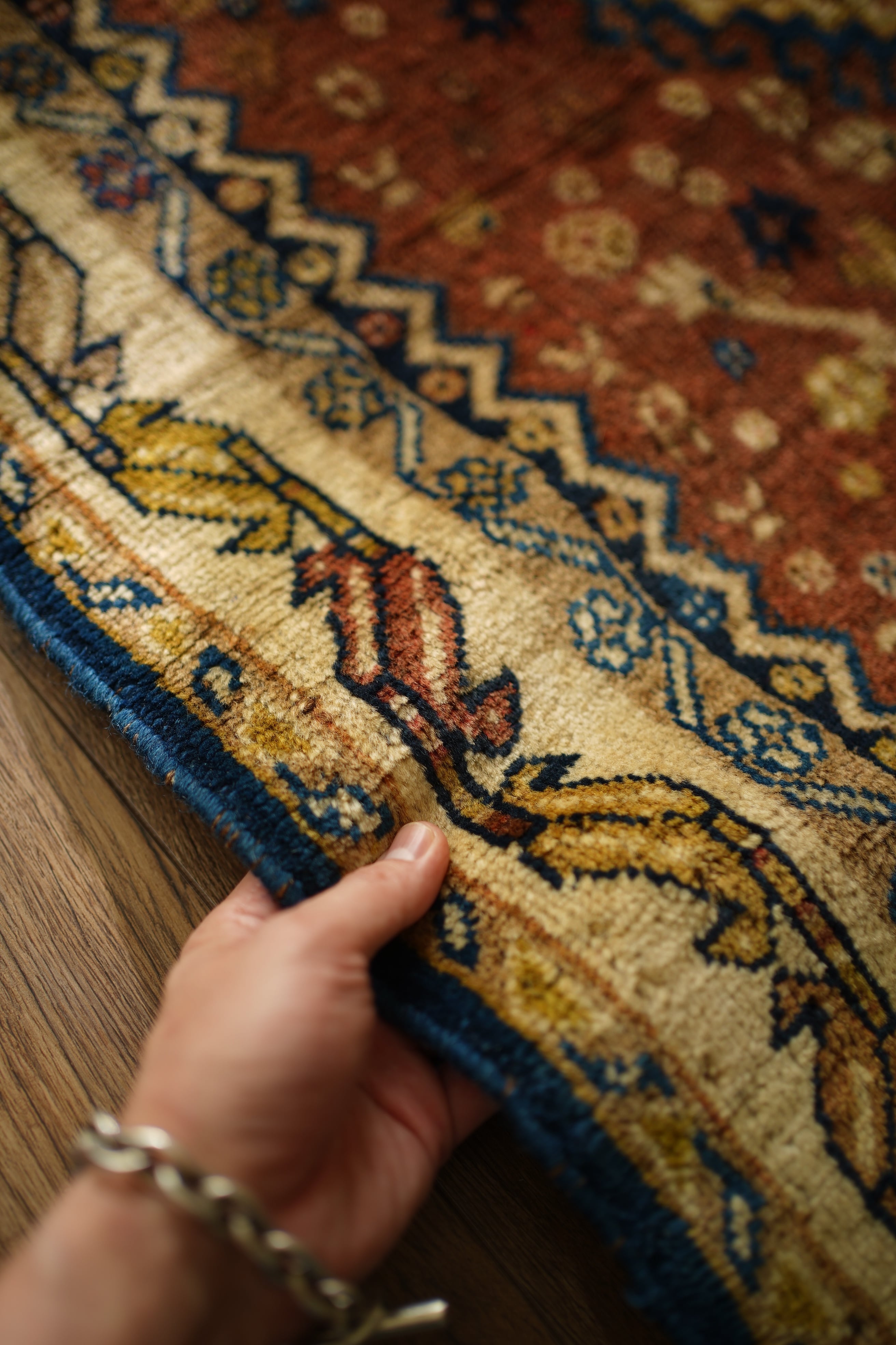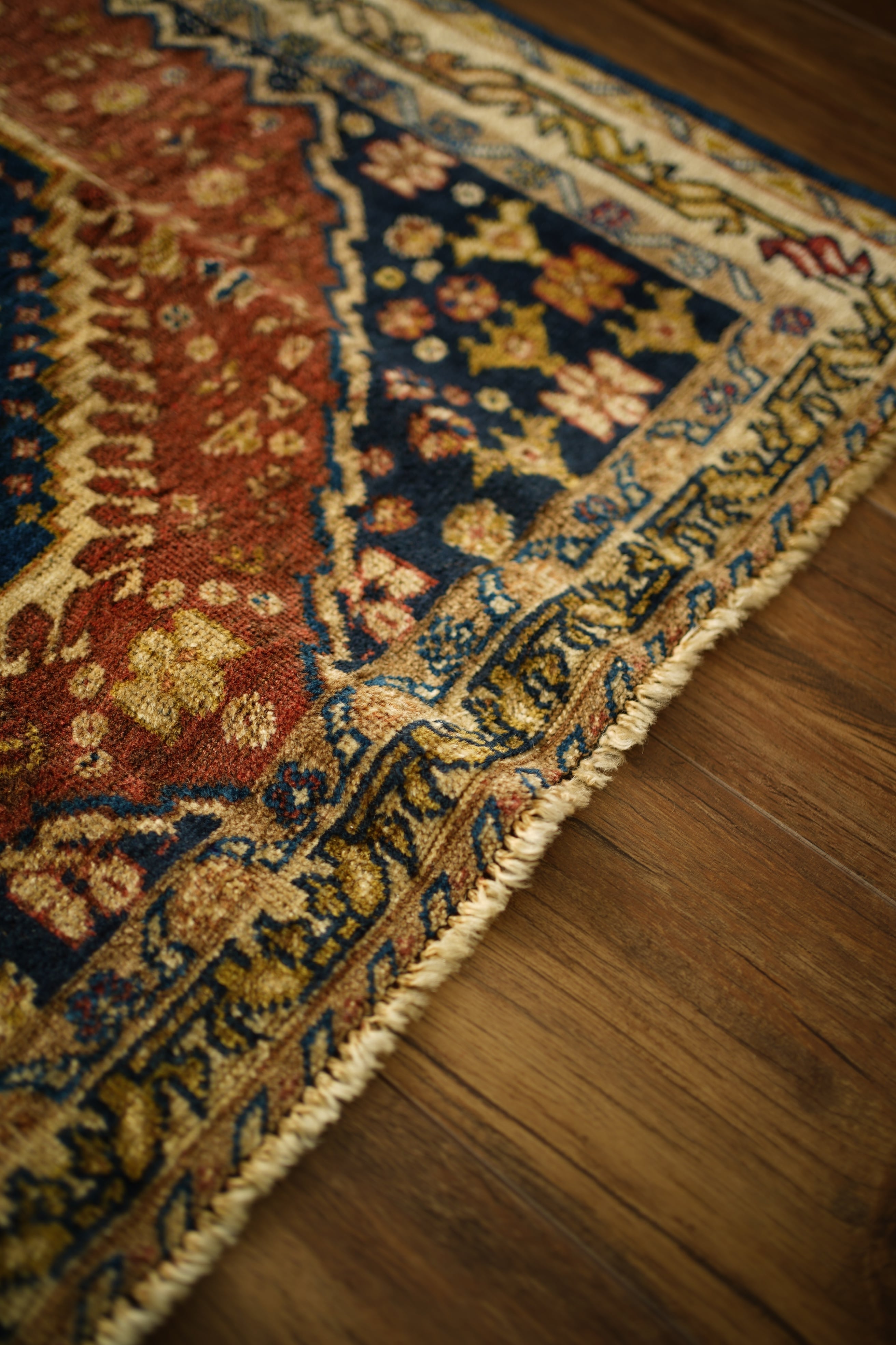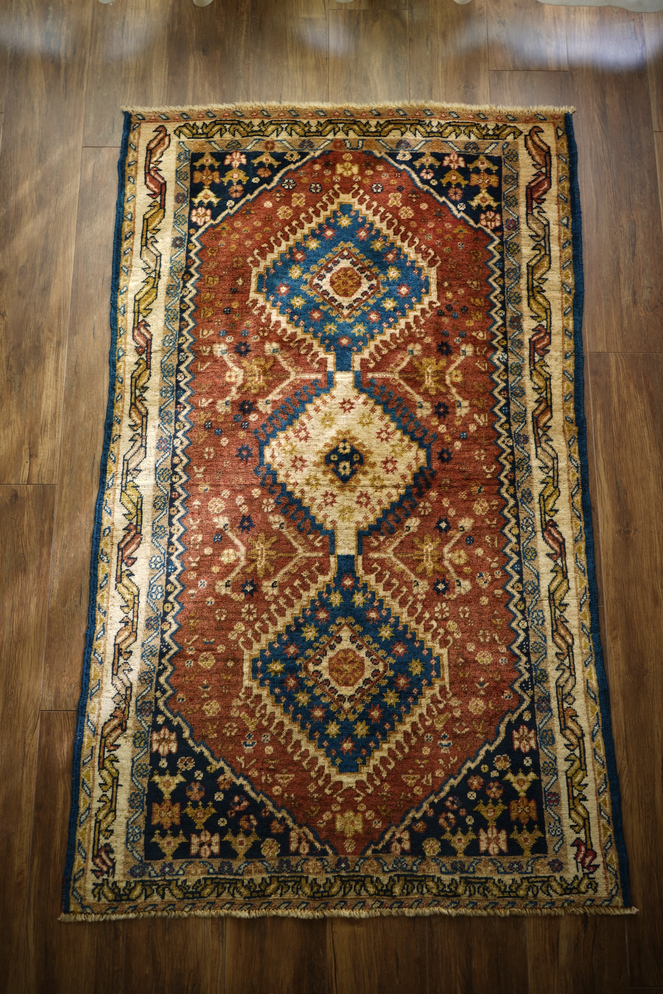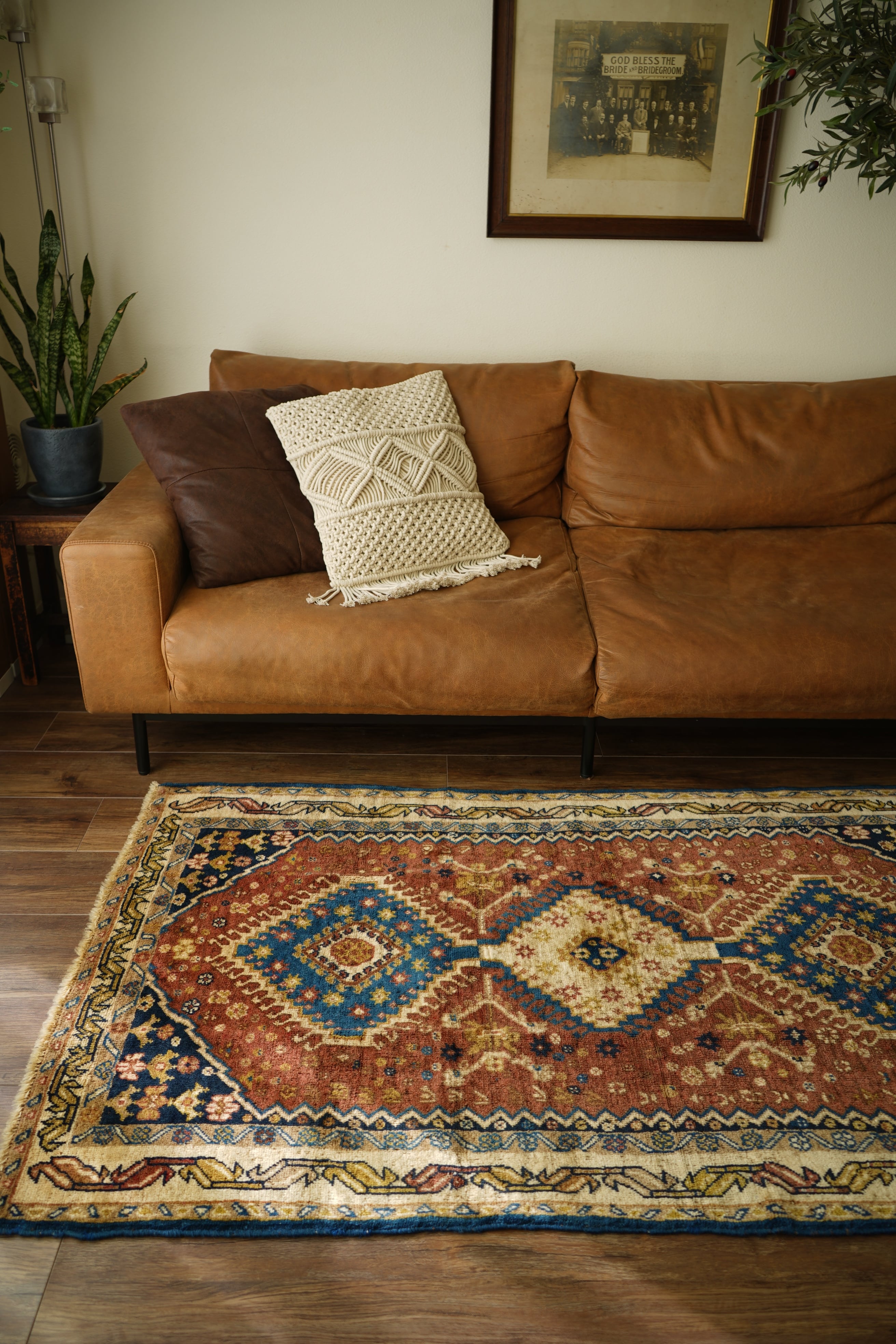 経年70年ほどのイラン・ヤラメ産のペルシャラグ。中央にはヤラメ特有のフックドメダリオンが連なり、周囲には魔除けを意味する"狼の足跡"や幸運を意味する"八角星"など、守護や祈りの意味を込めた部族文様が散りばめられています。ヴィンテージならではの風合いと色の深みが魅力で、年月を重ねたヤラメならではの素朴な美しさが感じられる一枚。ネイビーブルー、ブラウン、濃紺、ベージュ、黄土色などが使われ、落ち着いた温かみのある配色が魅力的です。表面はふわっと滑らかで優しい肌触りで、厚みは約6〜7mmほど。目立ったダメージも見受けられず、全体的にグッドコンディション。二人掛けのソファ前、ベッドサイド、デスク下などにいかがでしょうか。