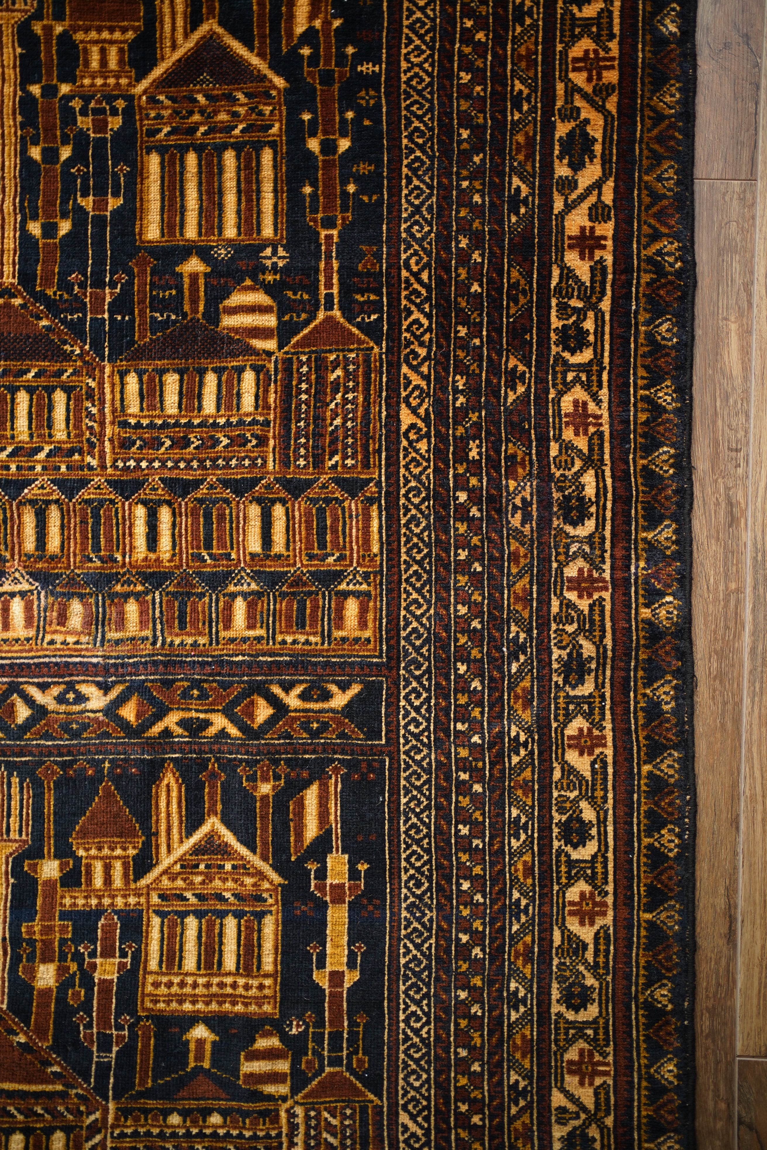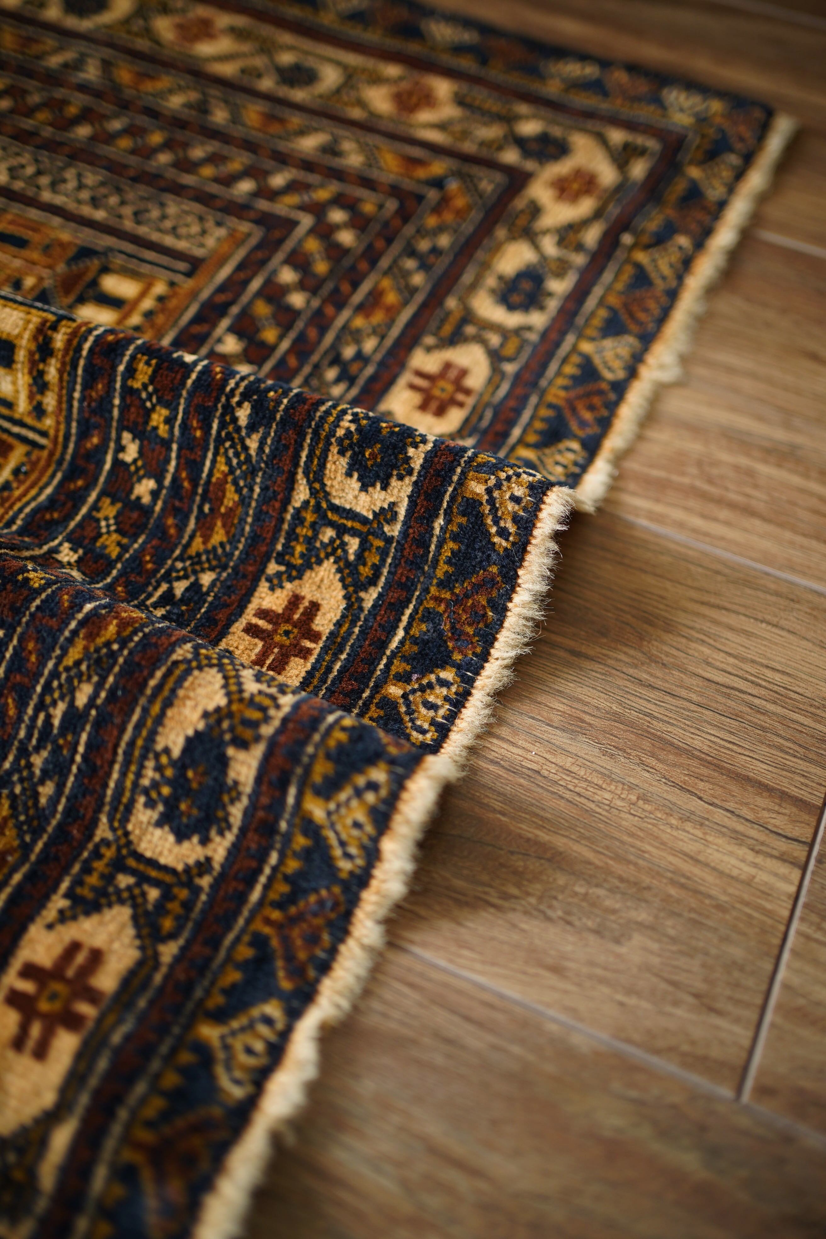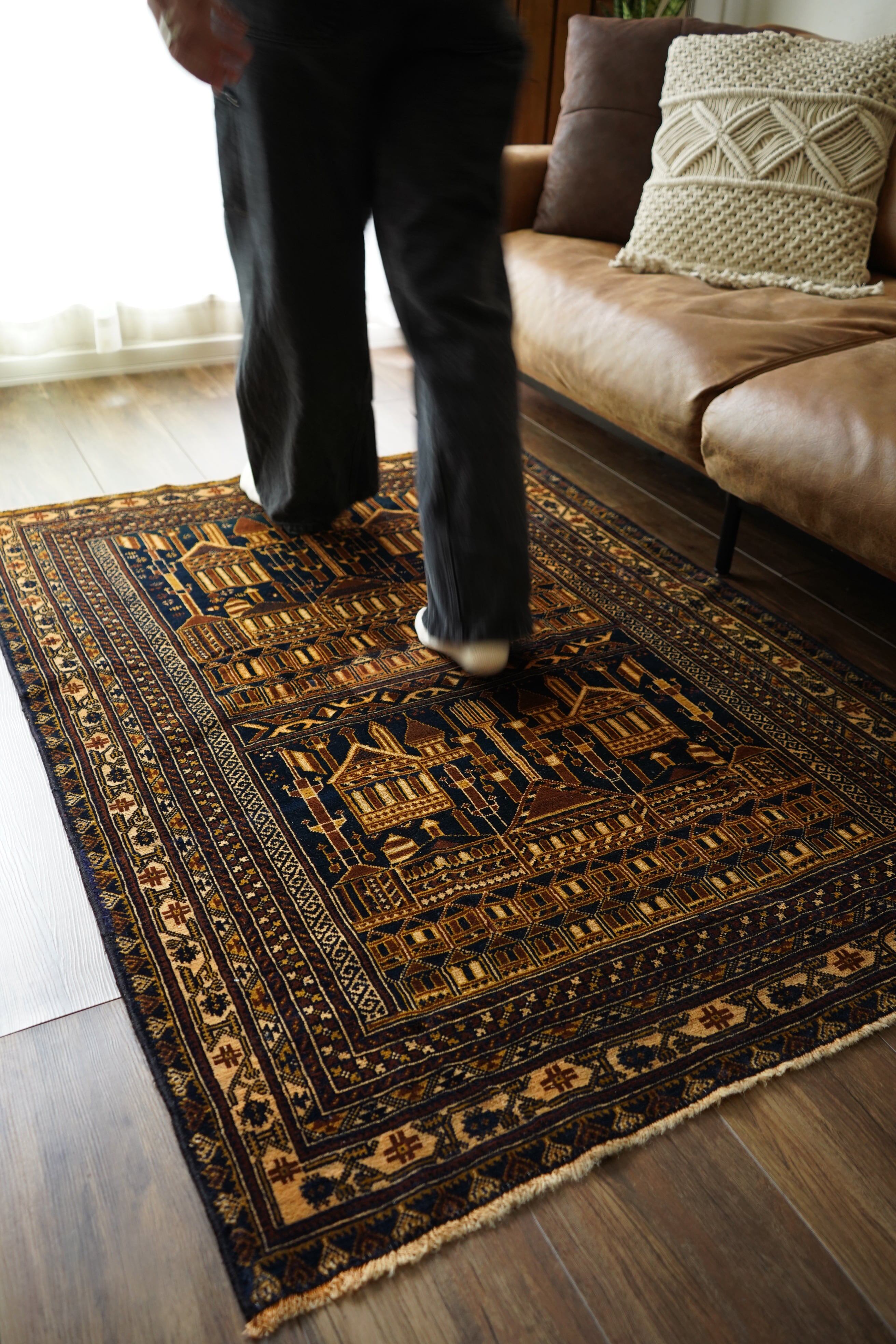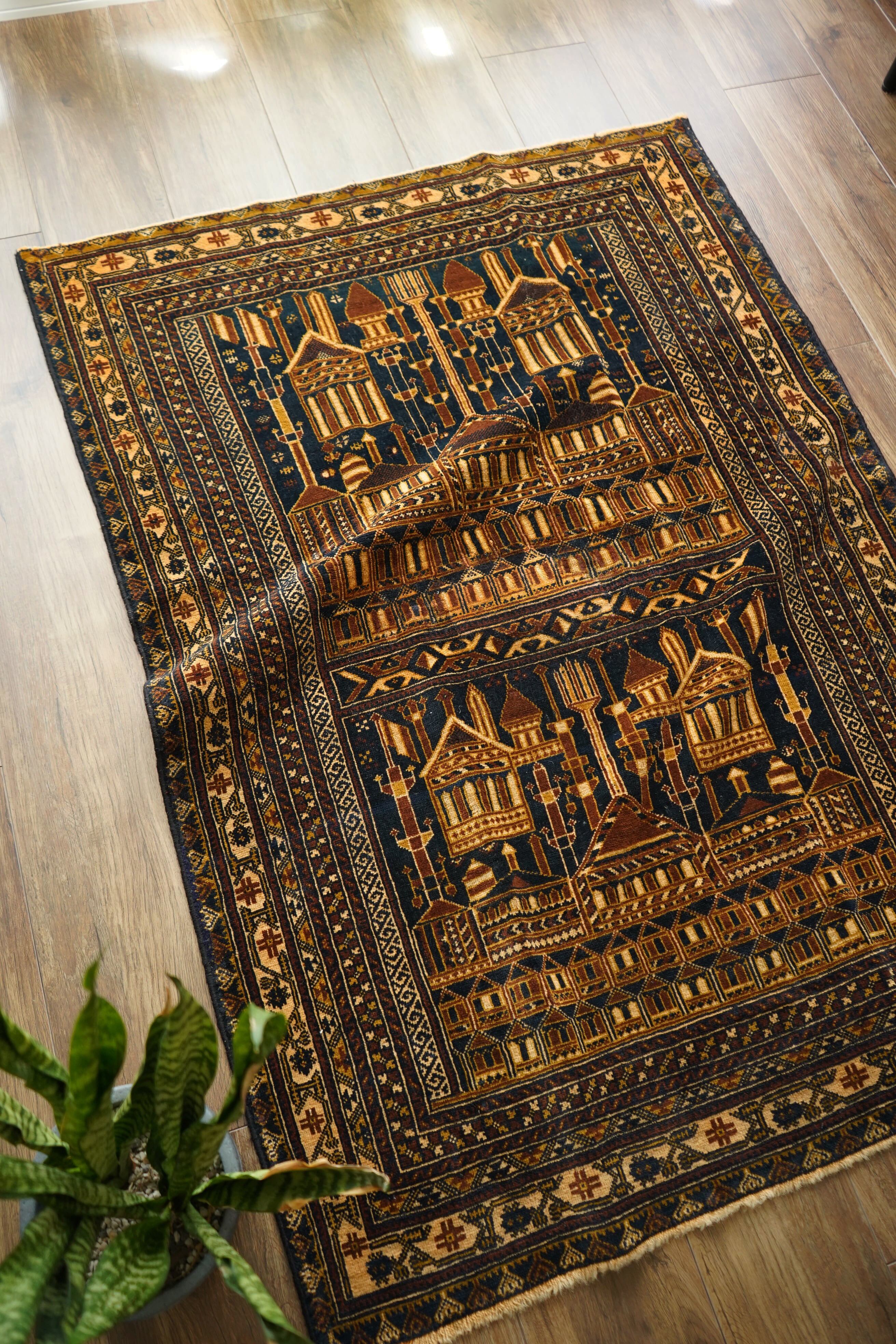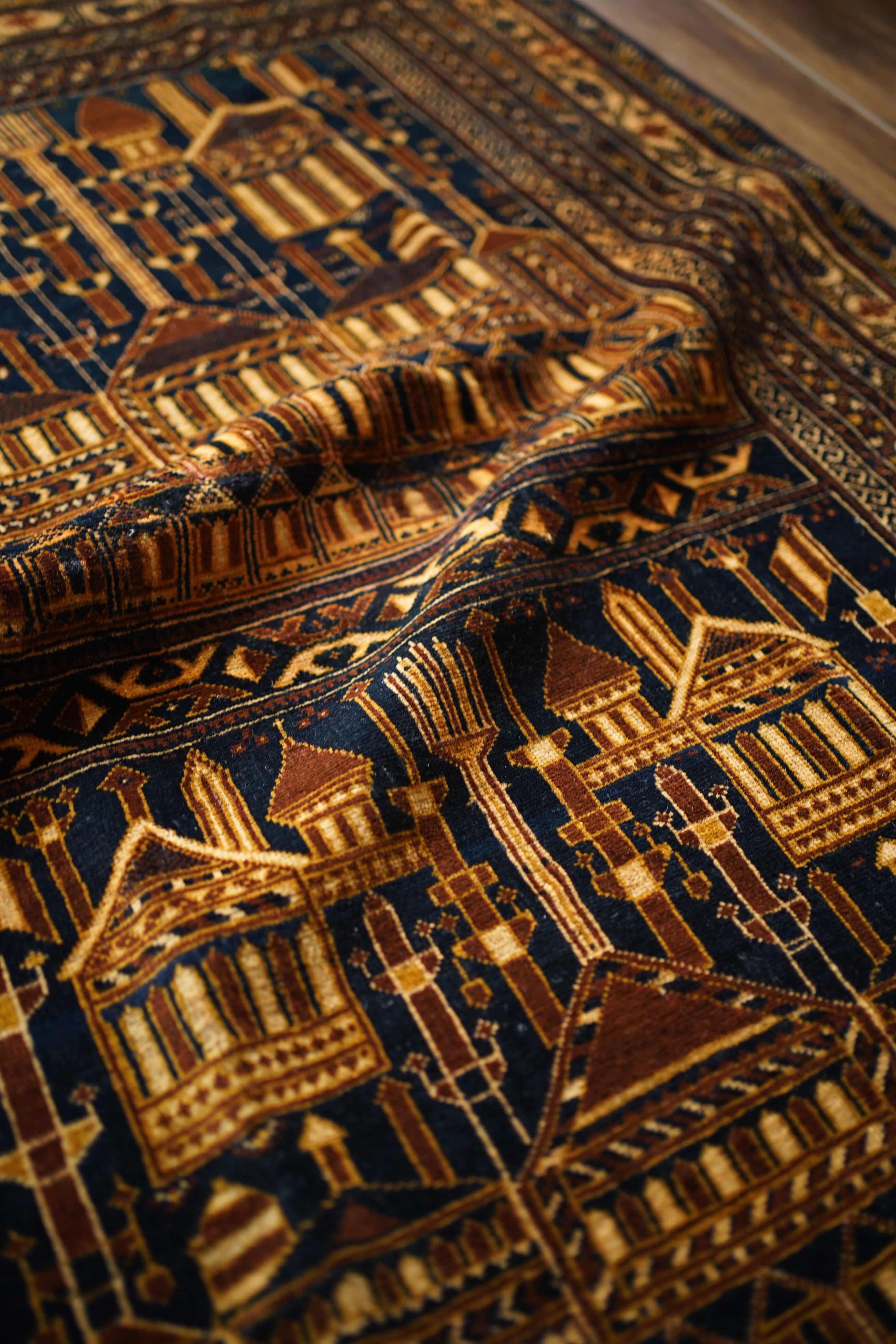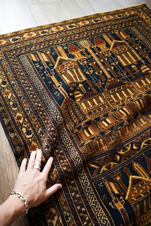 経年約50年、トルクメン族によって織られたアリホジャラグです。建築物をモチーフにした繊細な織りが特徴で、ミナレット(尖塔)やドームが並ぶような構図が芸術的に表現されています。濃紺をベースに、ブラウン、ベージュ、焦茶などの配色で、落ち着いた深みのある色調が印象的。パイルは短めながら、ふわっと滑らかで優しい肌触り。厚みは約5mmほどで、軽やかで扱いやすい質感です。一部に補修跡はありますが、熟練職人による丁寧なリペアでとても自然に仕上がっており、ほとんど気にならない程度です。それ以外は非常に良好なコンディションを保っています。ヴィンテージならではの深みと静けさを感じる、芸術性の高いトルクメンラグです。