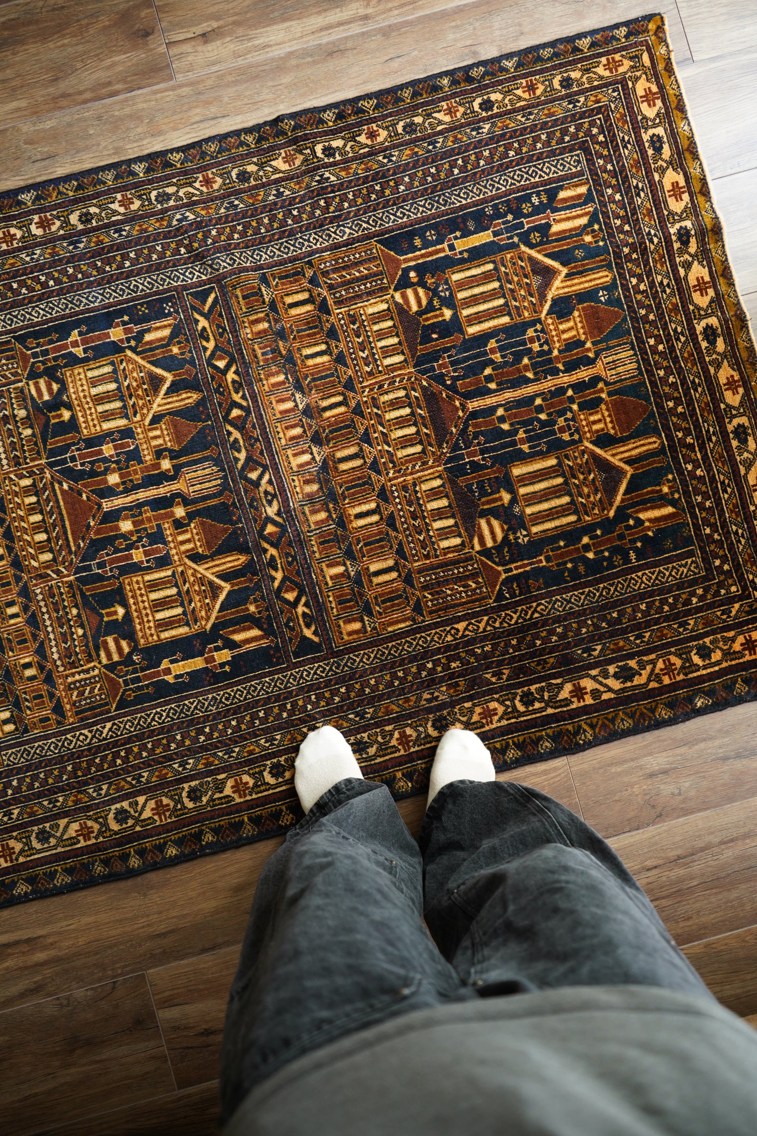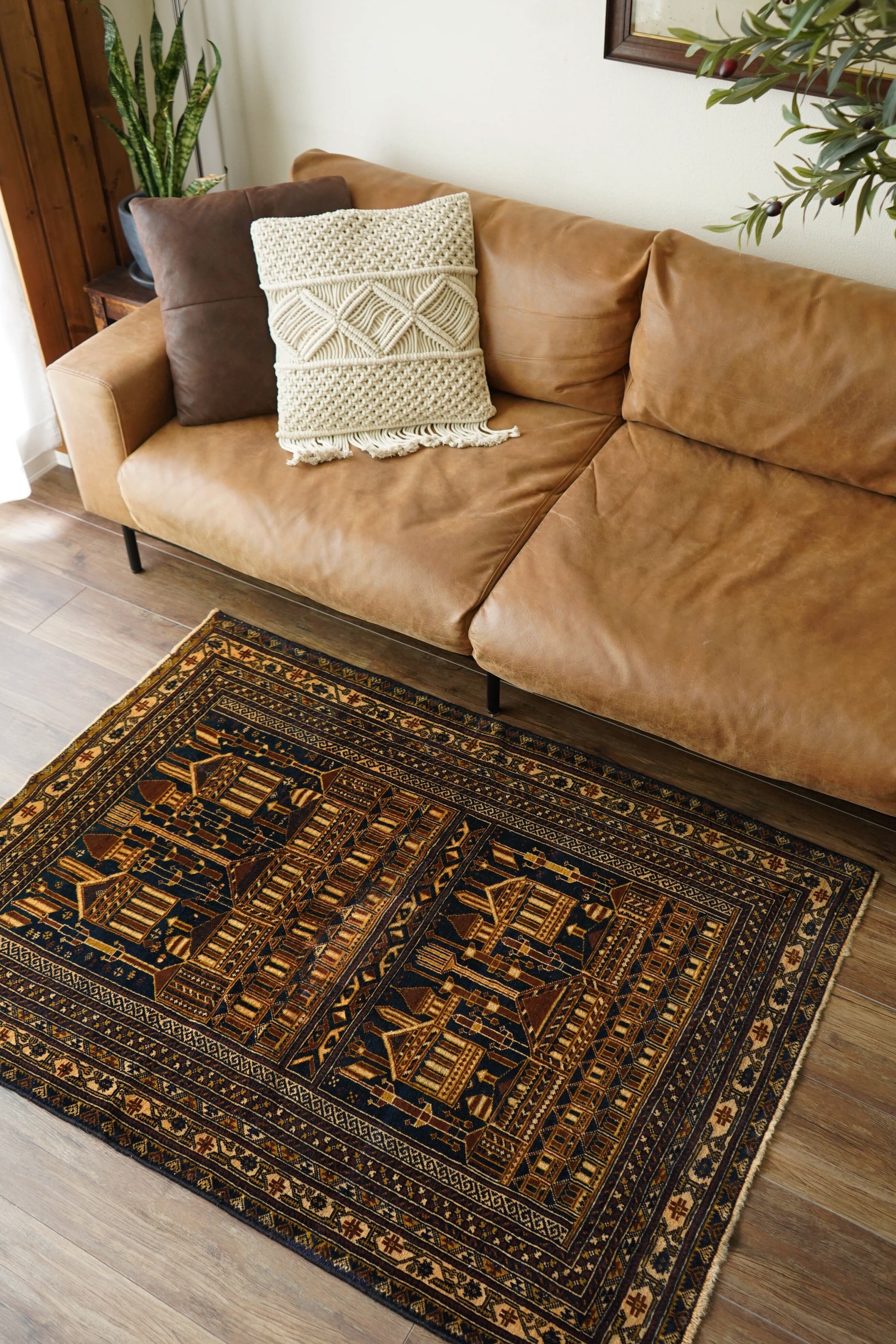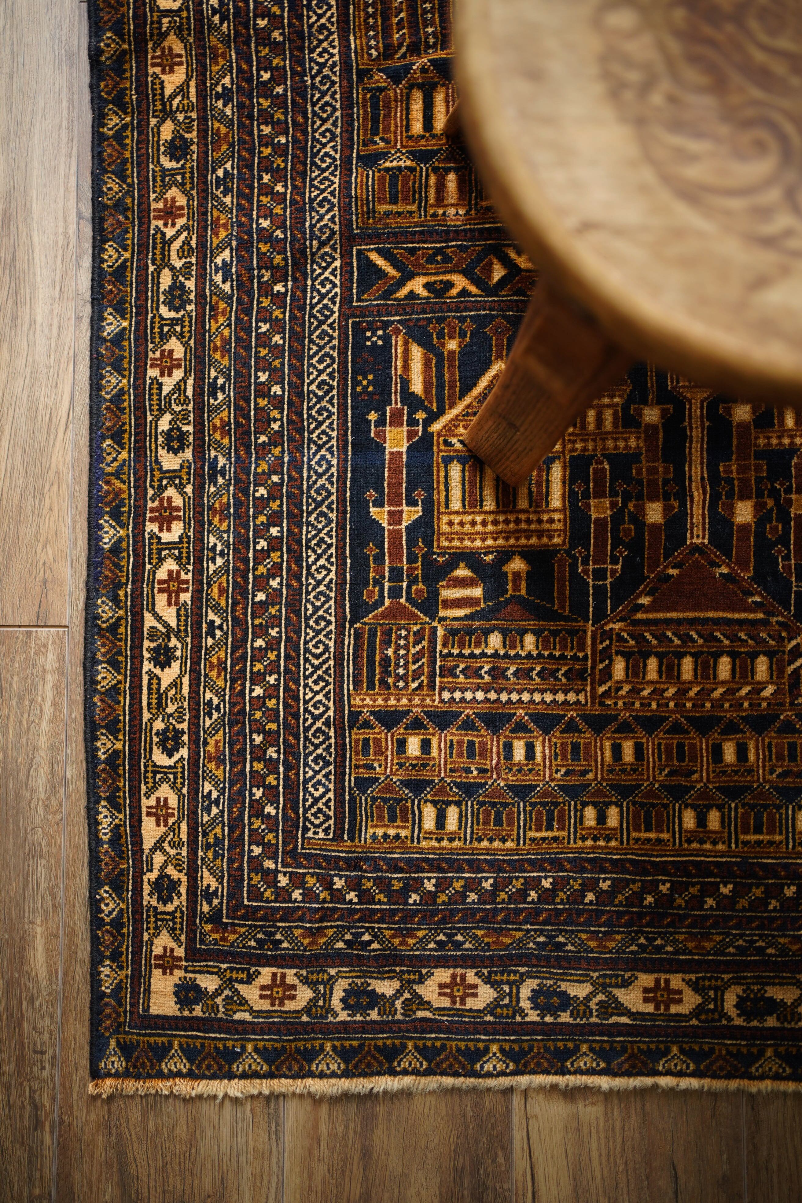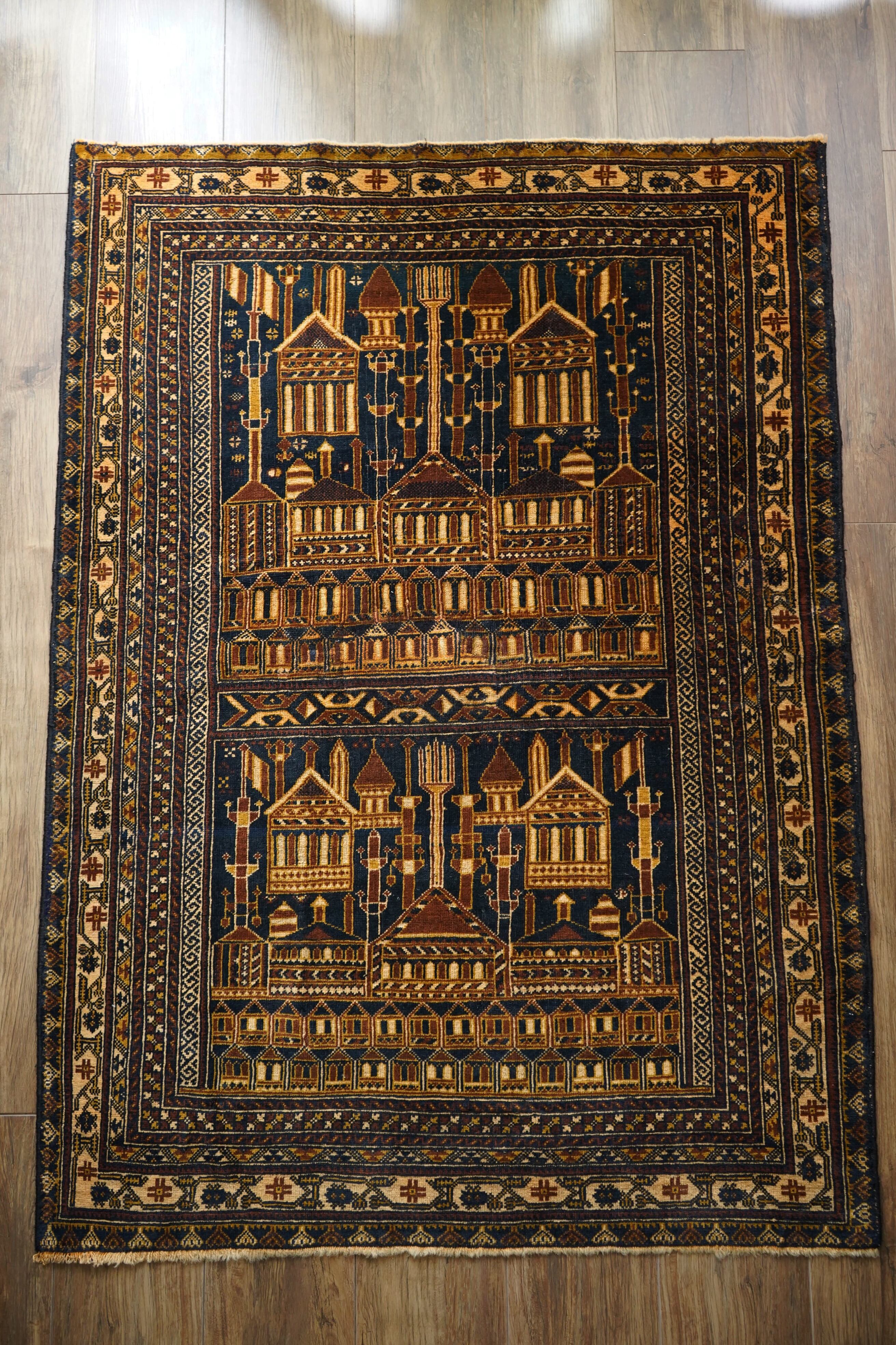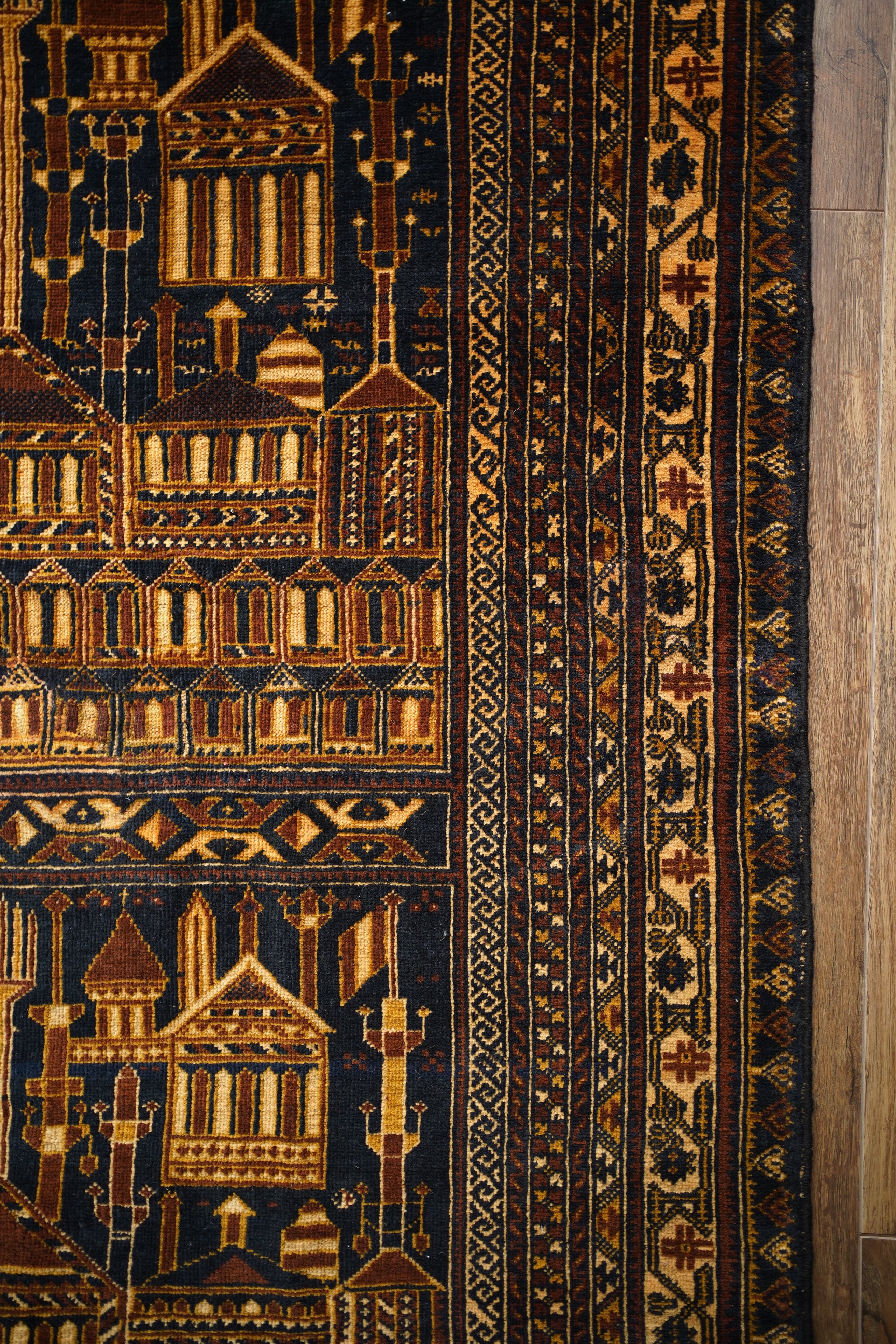 経年約50年、トルクメン族によって織られたアリホジャラグです。建築物をモチーフにした繊細な織りが特徴で、ミナレット(尖塔)やドームが並ぶような構図が芸術的に表現されています。濃紺をベースに、ブラウン、ベージュ、焦茶などの配色で、落ち着いた深みのある色調が印象的。パイルは短めながら、ふわっと滑らかで優しい肌触り。厚みは約5mmほどで、軽やかで扱いやすい質感です。一部に補修跡はありますが、熟練職人による丁寧なリペアでとても自然に仕上がっており、ほとんど気にならない程度です。それ以外は非常に良好なコンディションを保っています。ヴィンテージならではの深みと静けさを感じる、芸術性の高いトルクメンラグです。