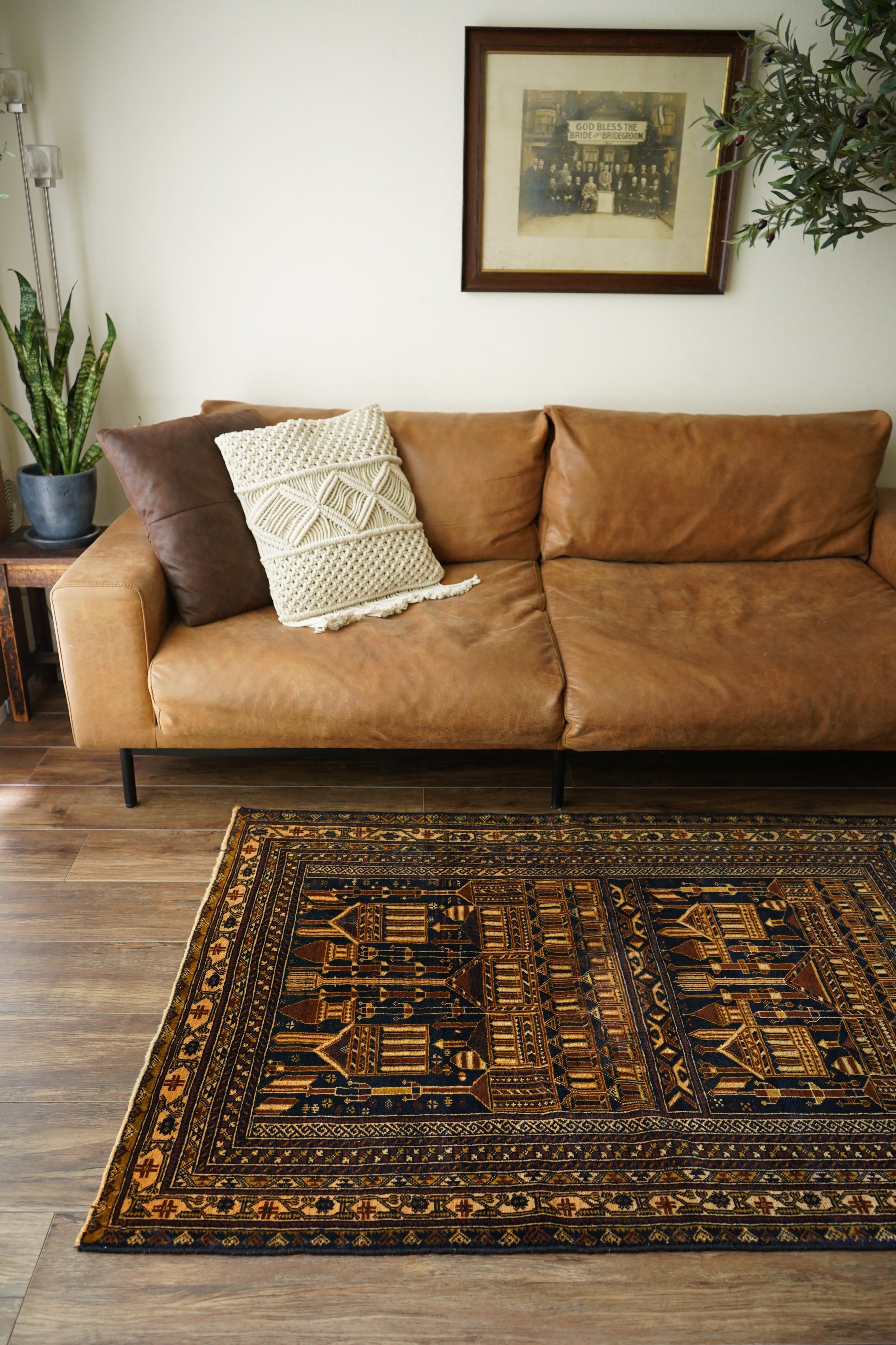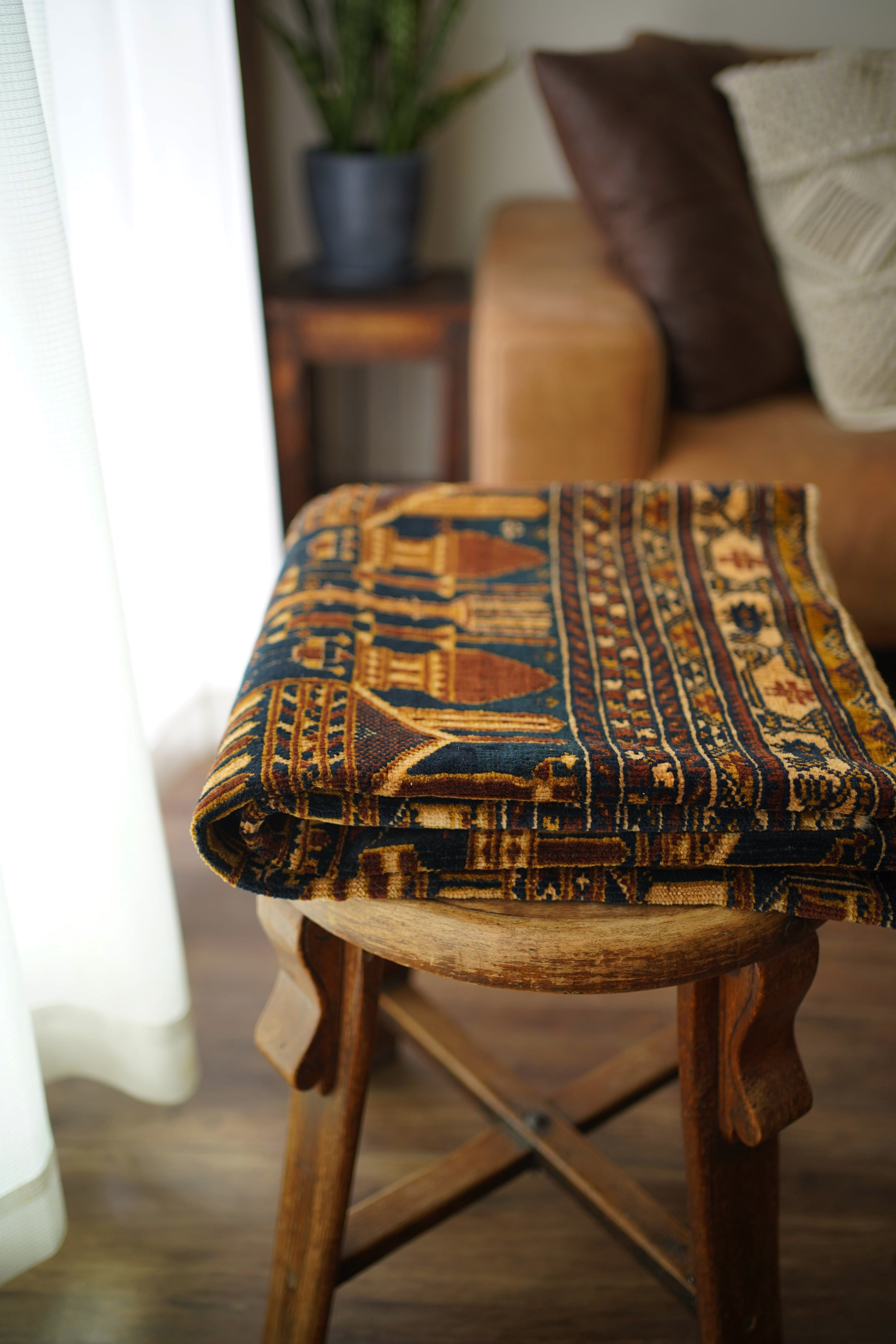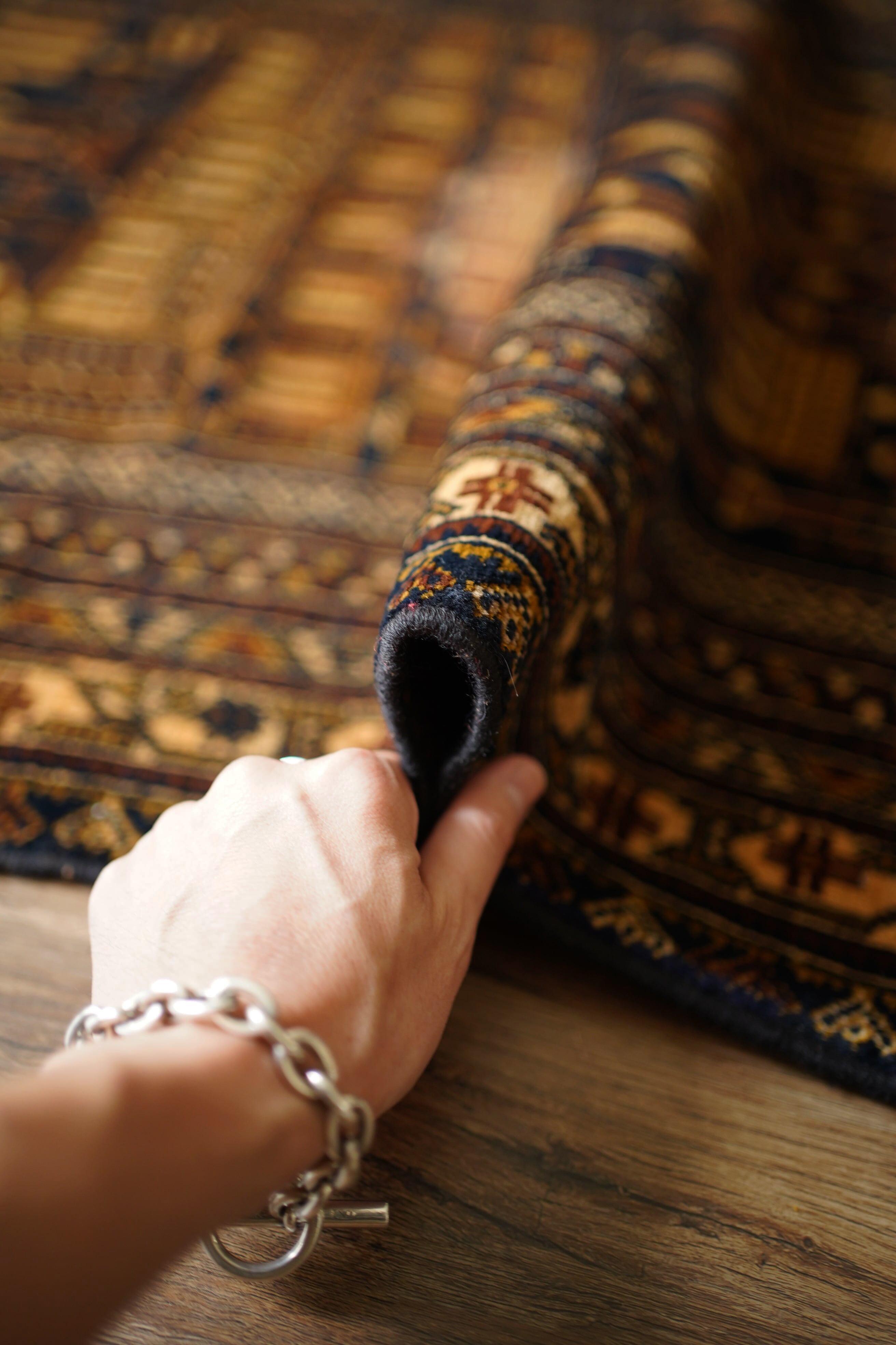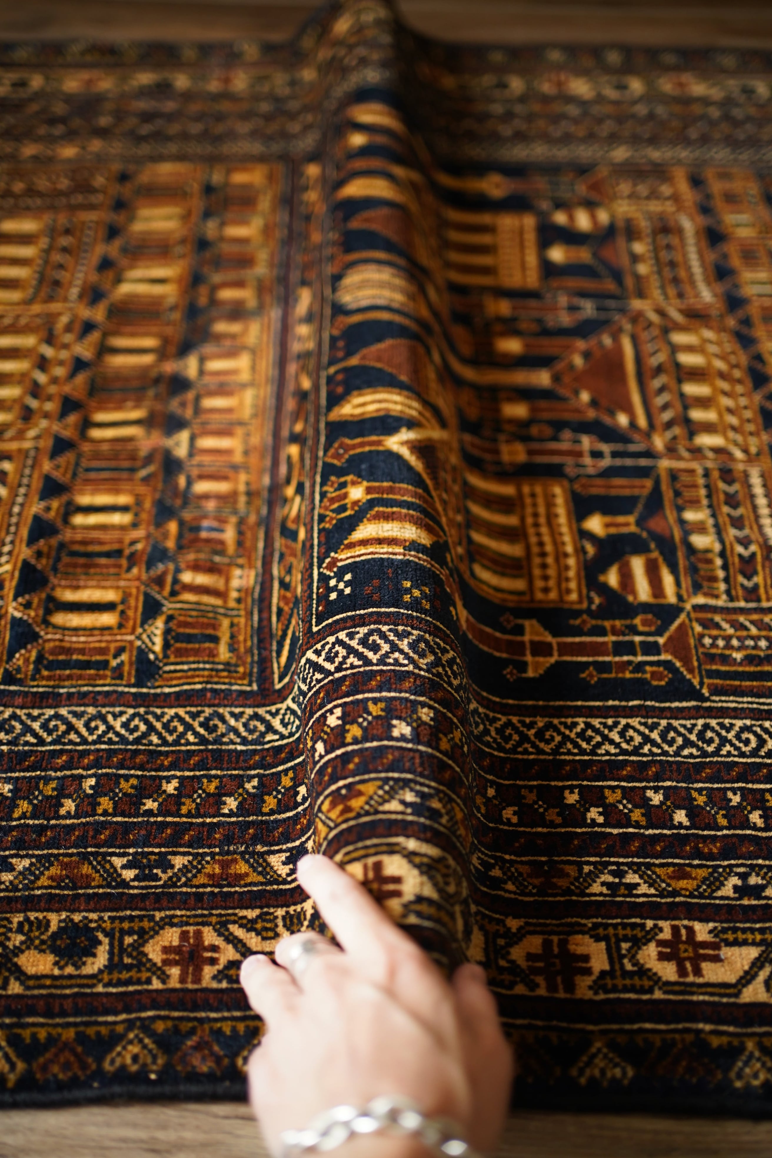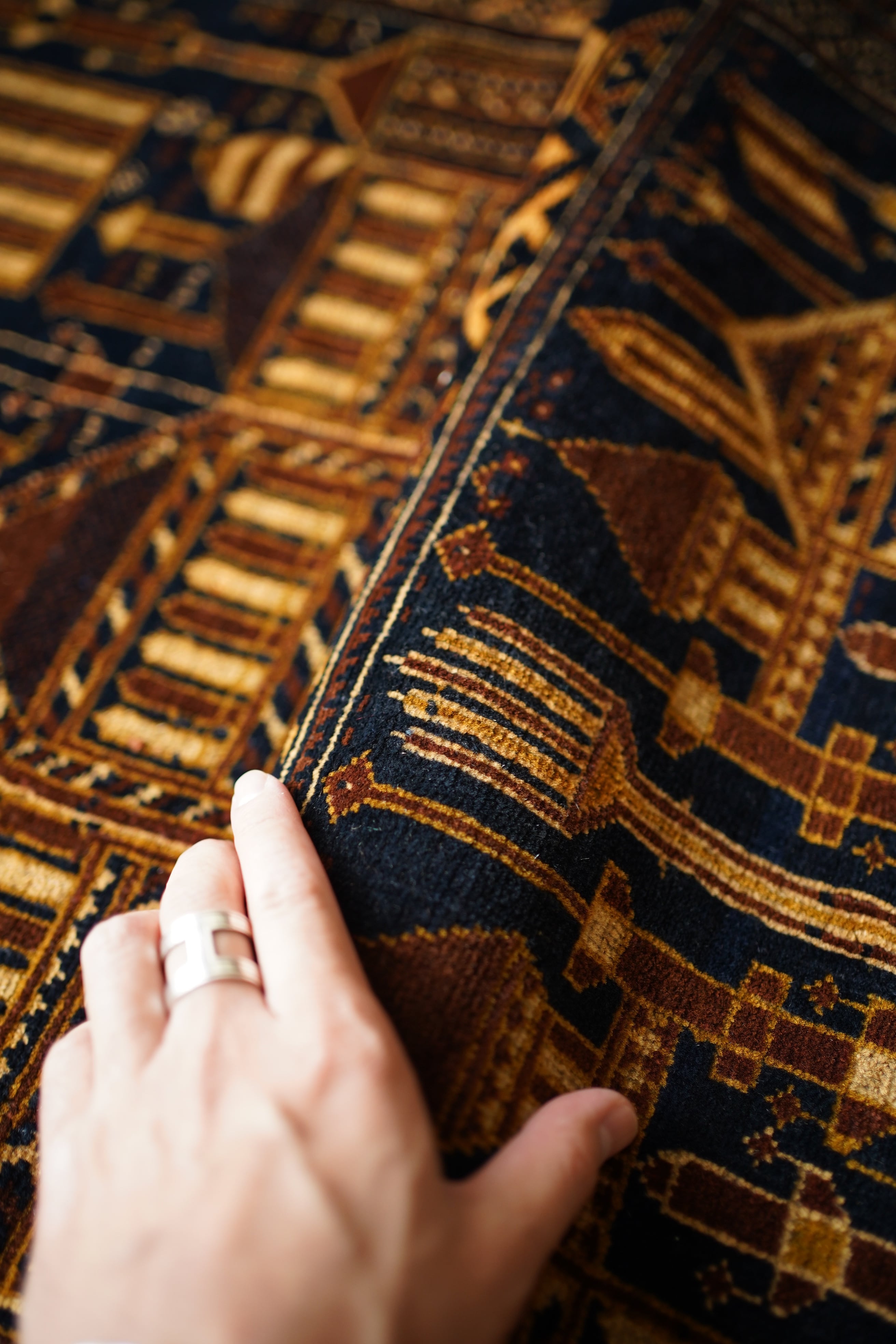 経年約50年、トルクメン族によって織られたアリホジャラグです。建築物をモチーフにした繊細な織りが特徴で、ミナレット(尖塔)やドームが並ぶような構図が芸術的に表現されています。濃紺をベースに、ブラウン、ベージュ、焦茶などの配色で、落ち着いた深みのある色調が印象的。パイルは短めながら、ふわっと滑らかで優しい肌触り。厚みは約5mmほどで、軽やかで扱いやすい質感です。一部に補修跡はありますが、熟練職人による丁寧なリペアでとても自然に仕上がっており、ほとんど気にならない程度です。それ以外は非常に良好なコンディションを保っています。ヴィンテージならではの深みと静けさを感じる、芸術性の高いトルクメンラグです。