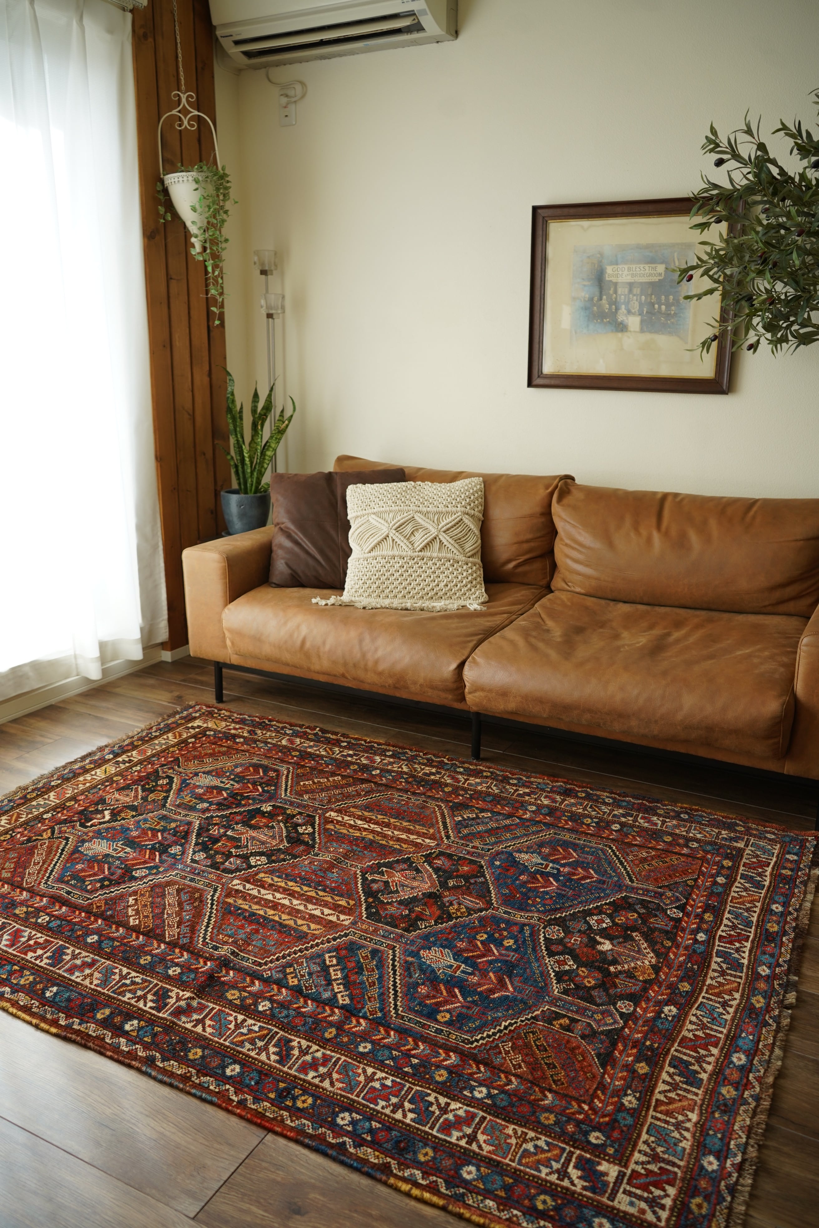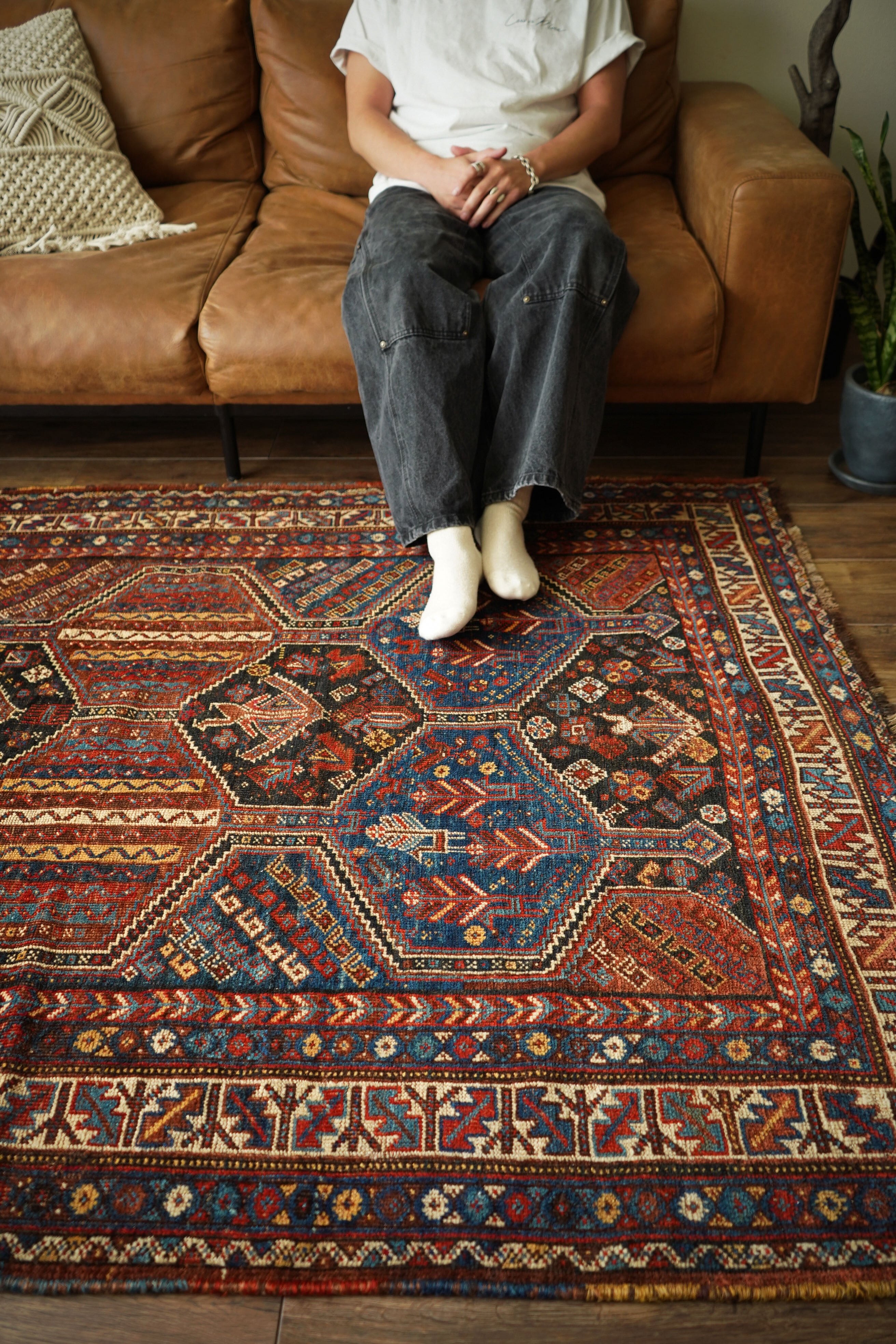 約80年前にイラン南西部のファールス州に居住する5つの部族の連合体「ハムセ連合」によって織られたセミアンティークラグ。六角形のメダリオンが連なる構図に、鳥や草花などの文様が織り込まれた、ハムセらしい部族的な美しさを感じさせます。ムルグ(鶏)やボテなどの伝統的なモチーフも見受けられ、自然と祈りを織り込んだような静かな存在感があります。ブラウンを基調に、奥行きのあるブルー、ブラック、黄土色、ベージュ、暗い赤、焦茶などが使われ、落ち着いたトーンの中に微妙な色のゆらぎが美しく表れています。長い年月を経て柔らかく馴染んだウールは、ふわりとサラッとした軽やかな肌触り。厚みは約8mmほどです。パイルは部分的に擦り減ってはいるものの、全体的にはしっかりと残っており、織りの緻密さとバランスの良さが際立っています。時を経てもなお、風格と温もりを感じさせる希少なアンティーク。次の世代へも受け継いでいきたい、歴史を感じる一枚です。
