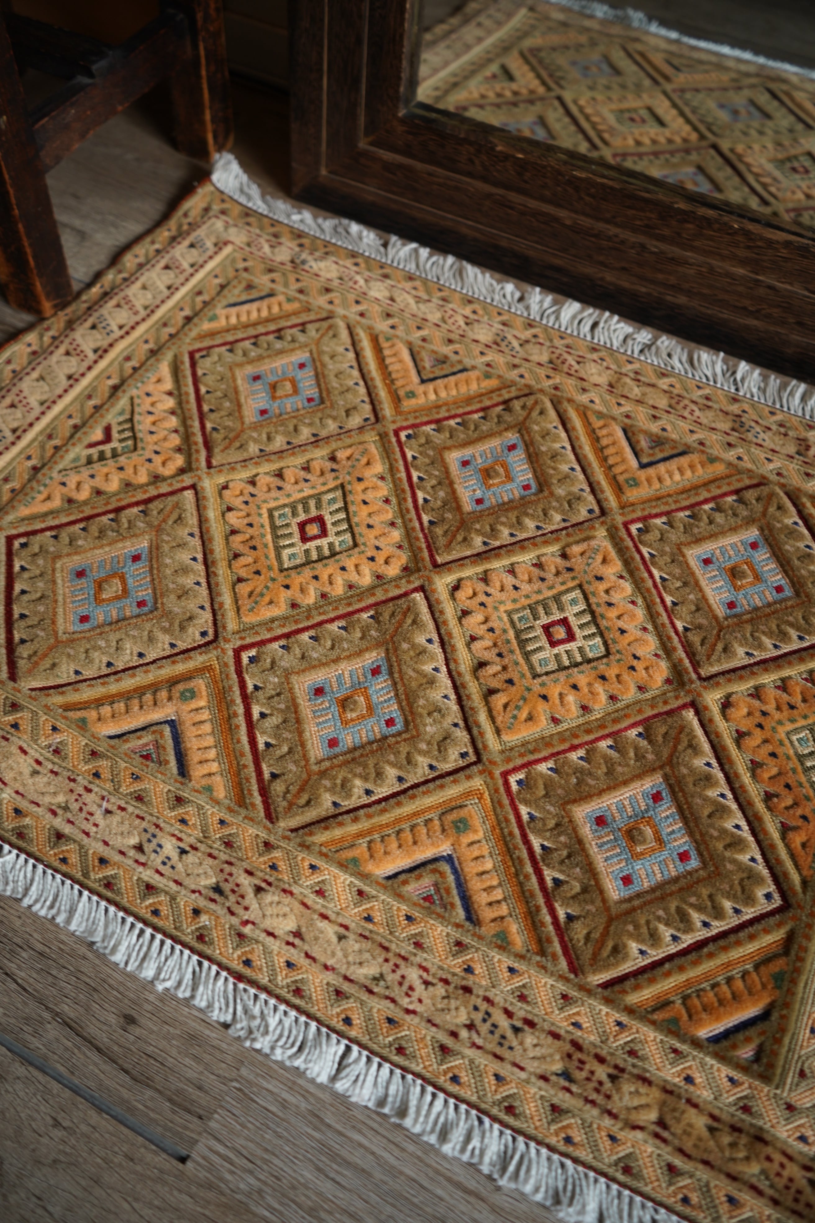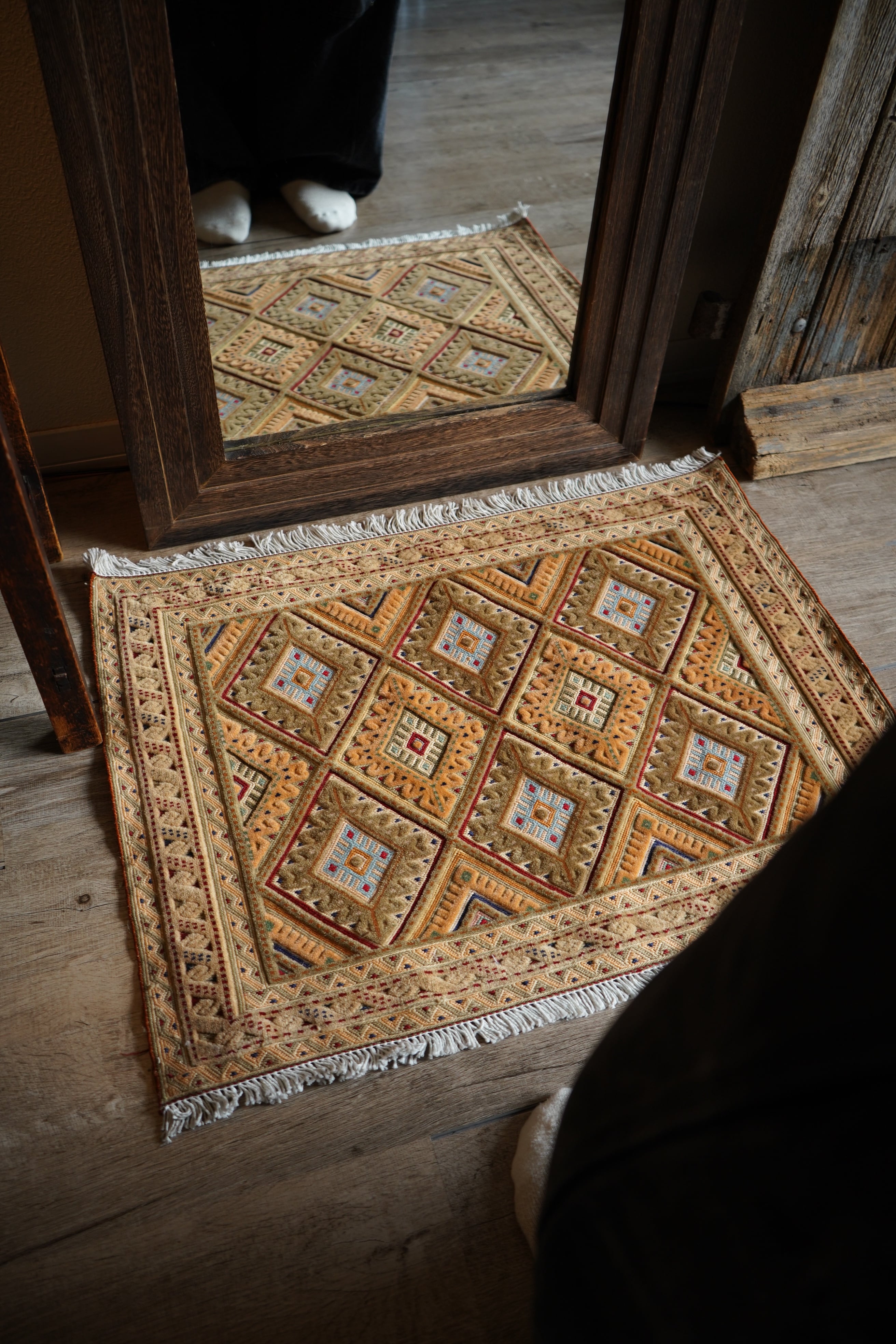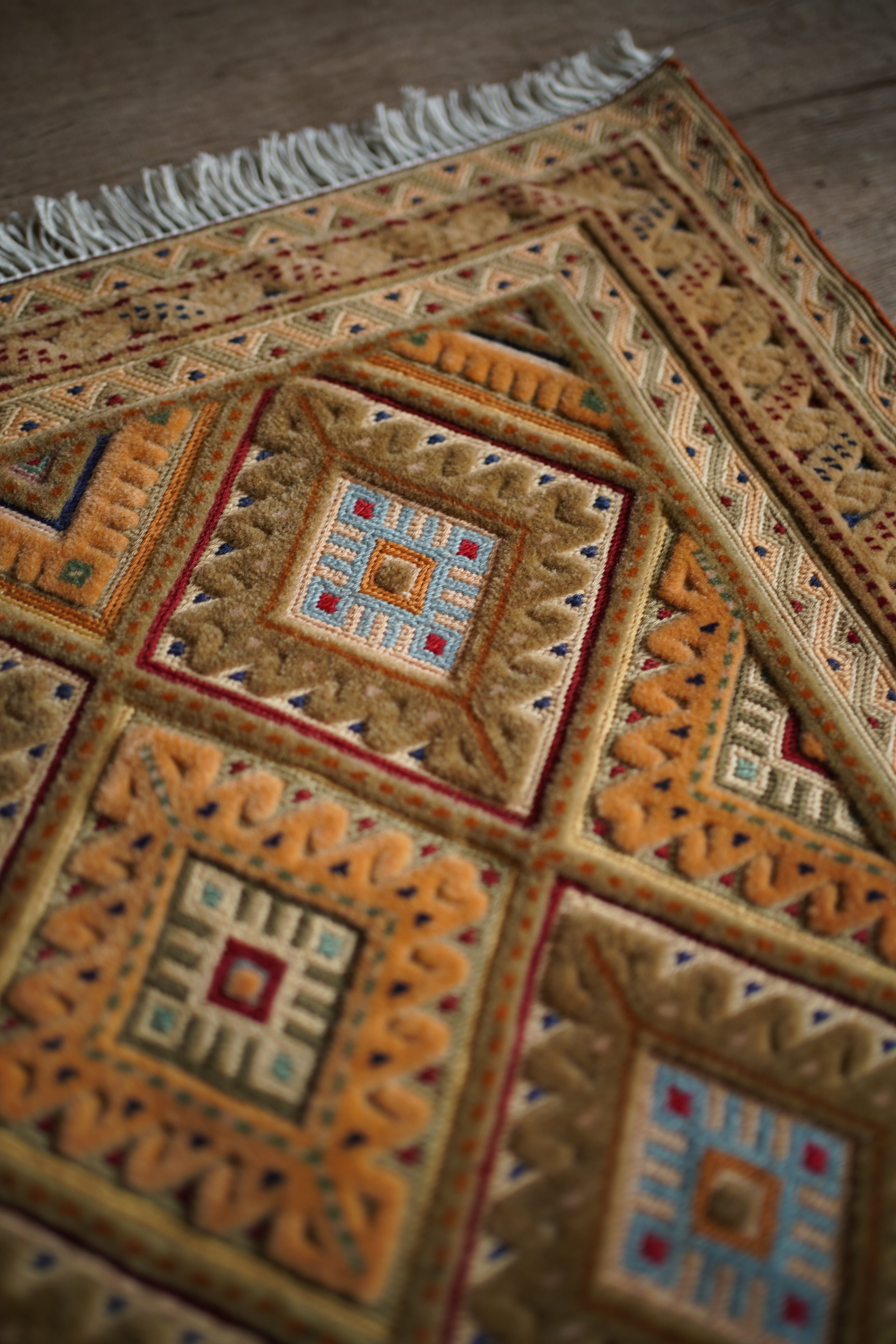 アフガニスタン北西部の都市ヘラート地域で織られたマシュワニラグ。マシュワニラグは平織り(キリム)とパイル織り(絨毯)をミックスした技法で織られているため、ポコポコとした凹凸が特徴的です。美しい配列で織り込まれた菱形文様デザインが目を惹く一枚で、配色は淡いキャロットオレンジ、暗めのくすんだベージュ、水色、赤など。表面はふわサラっとした肌触りで、凹凸の質感が心地良いです。厚みは4mm〜5mm程度。補修跡やダメージも見られず、大変良好なコンディション。小さめのラック前や全身鏡の前など、ちょっとしたスペースにどうぞ♫