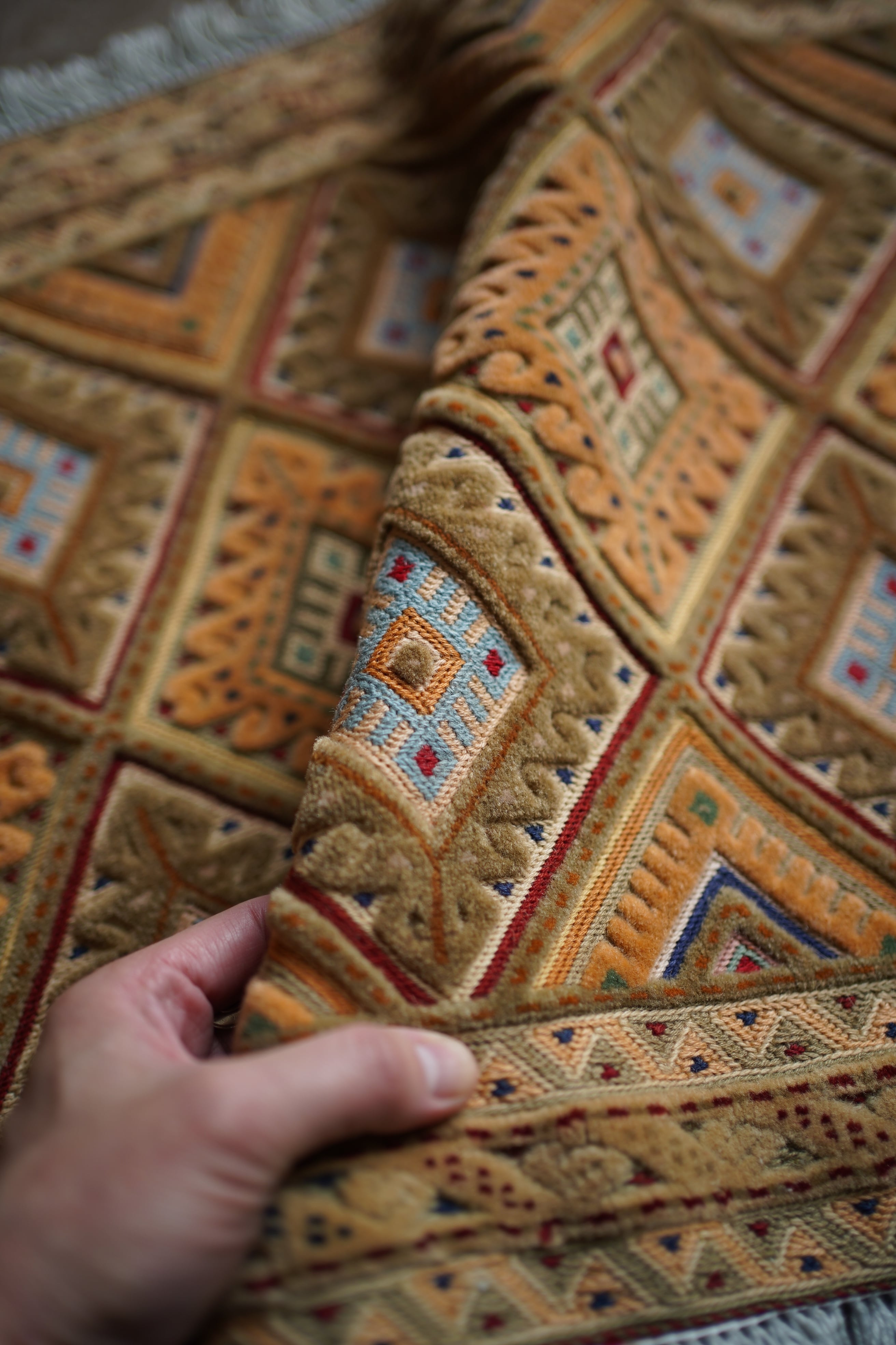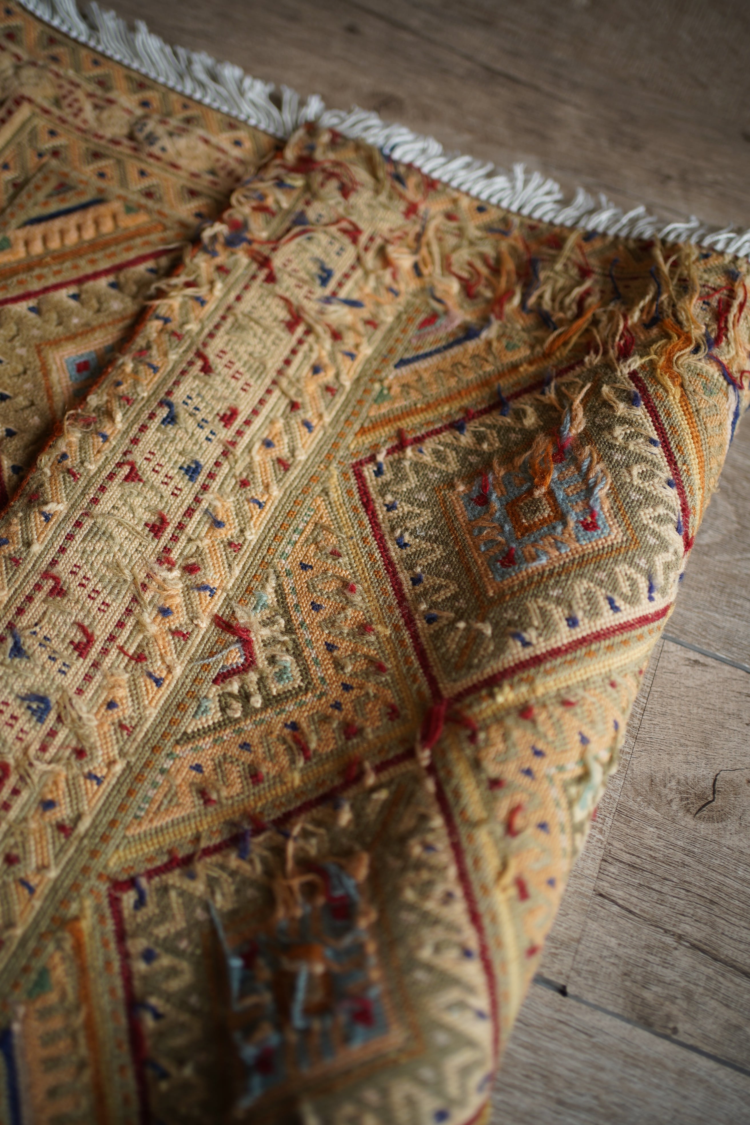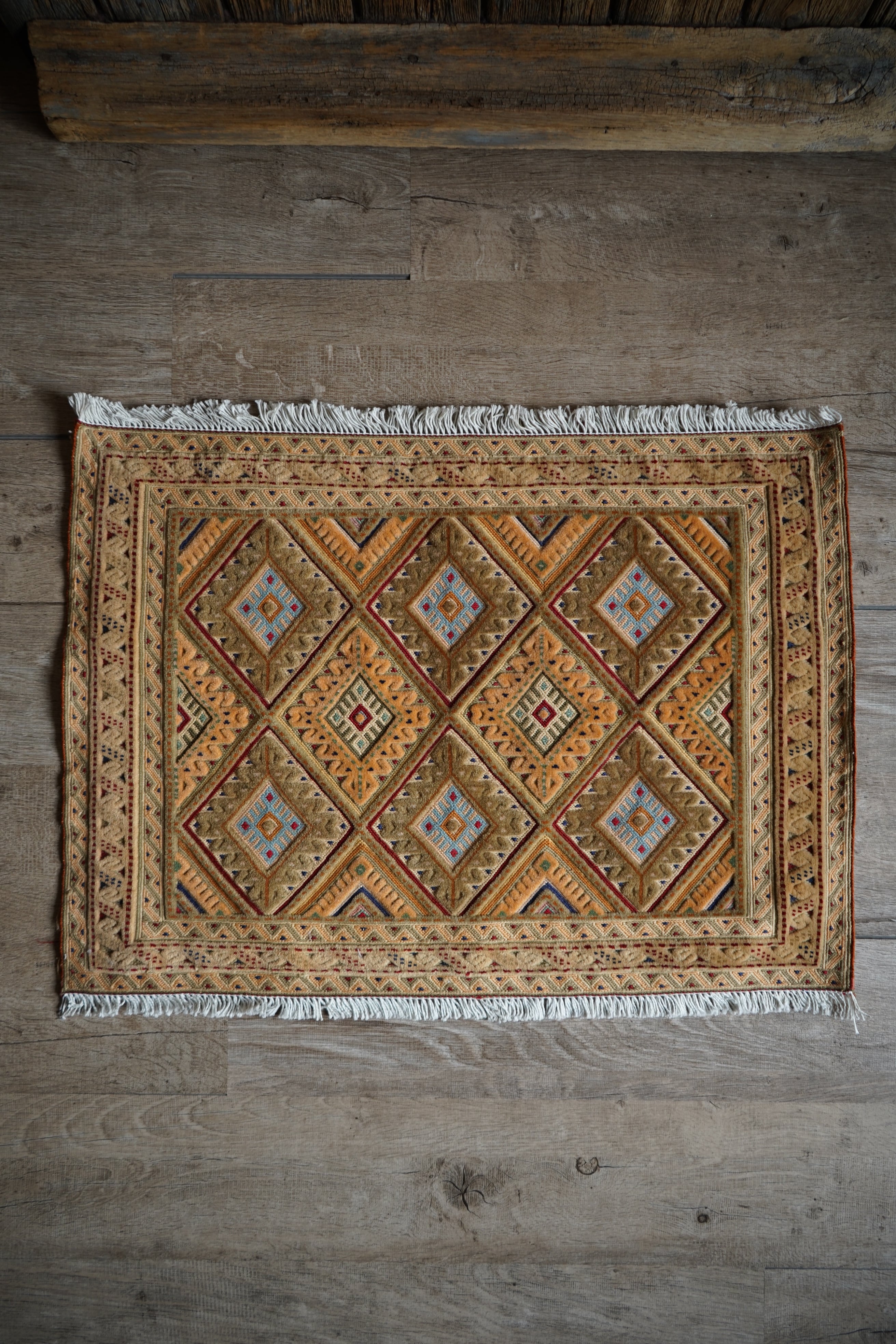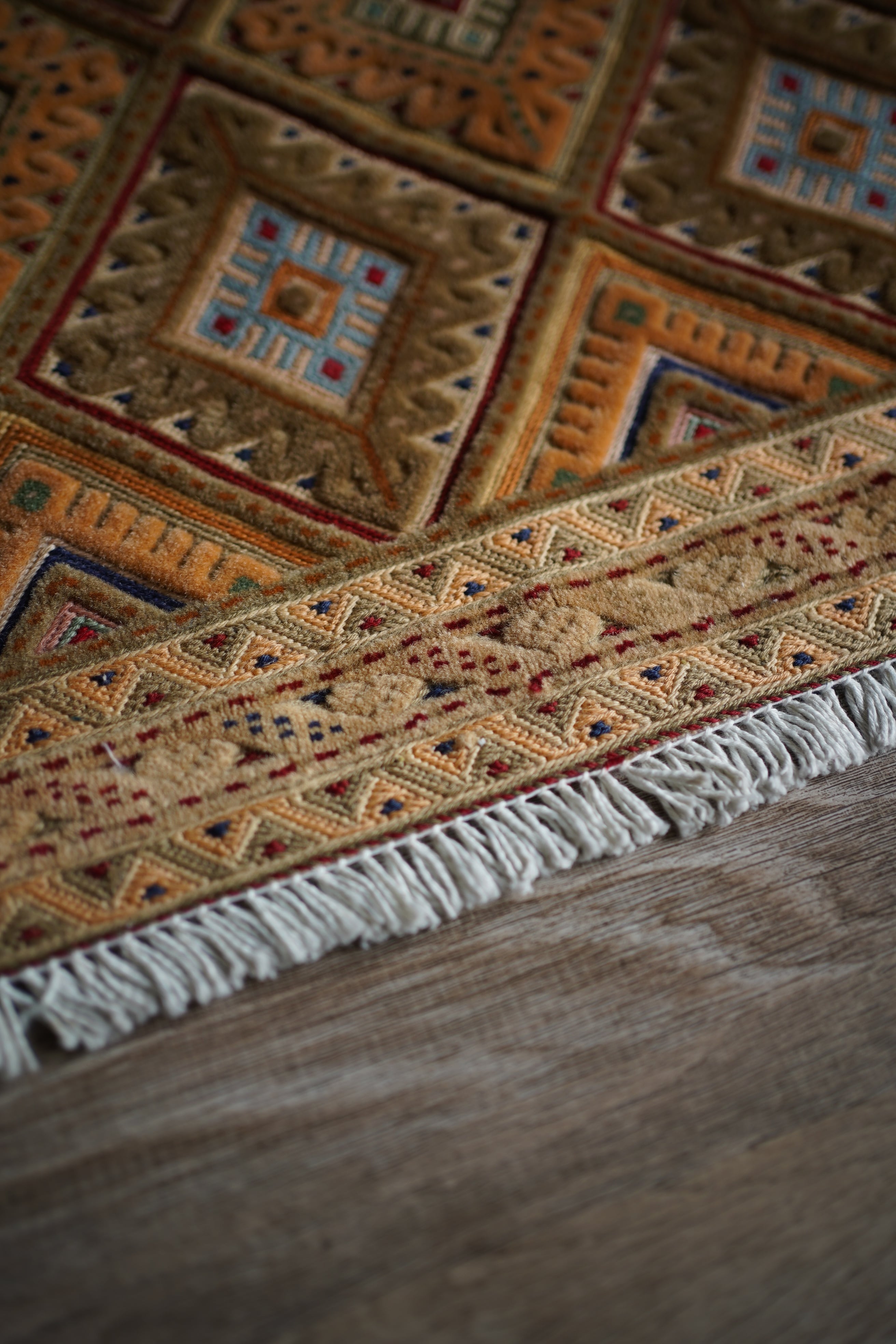 アフガニスタン北西部の都市ヘラート地域で織られたマシュワニラグ。マシュワニラグは平織り(キリム)とパイル織り(絨毯)をミックスした技法で織られているため、ポコポコとした凹凸が特徴的です。美しい配列で織り込まれた菱形文様デザインが目を惹く一枚で、配色は淡いキャロットオレンジ、暗めのくすんだベージュ、水色、赤など。表面はふわサラっとした肌触りで、凹凸の質感が心地良いです。厚みは4mm〜5mm程度。補修跡やダメージも見られず、大変良好なコンディション。小さめのラック前や全身鏡の前など、ちょっとしたスペースにどうぞ♫