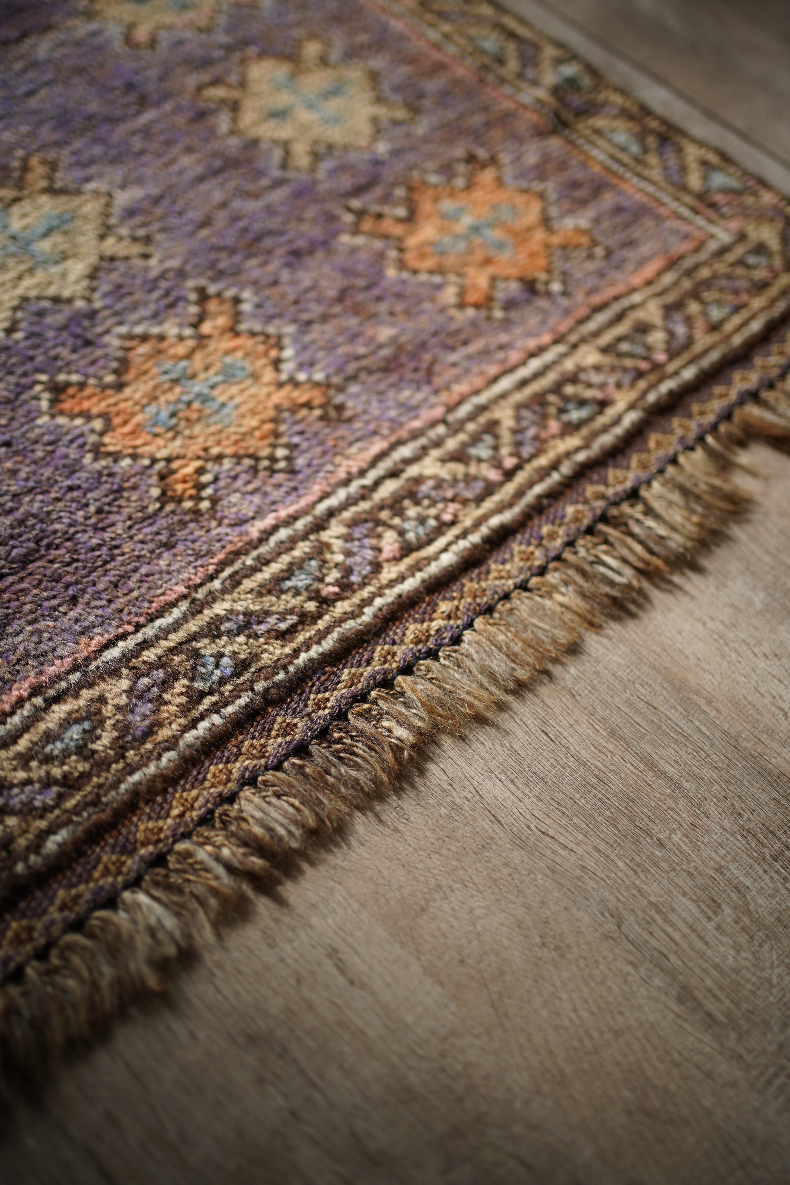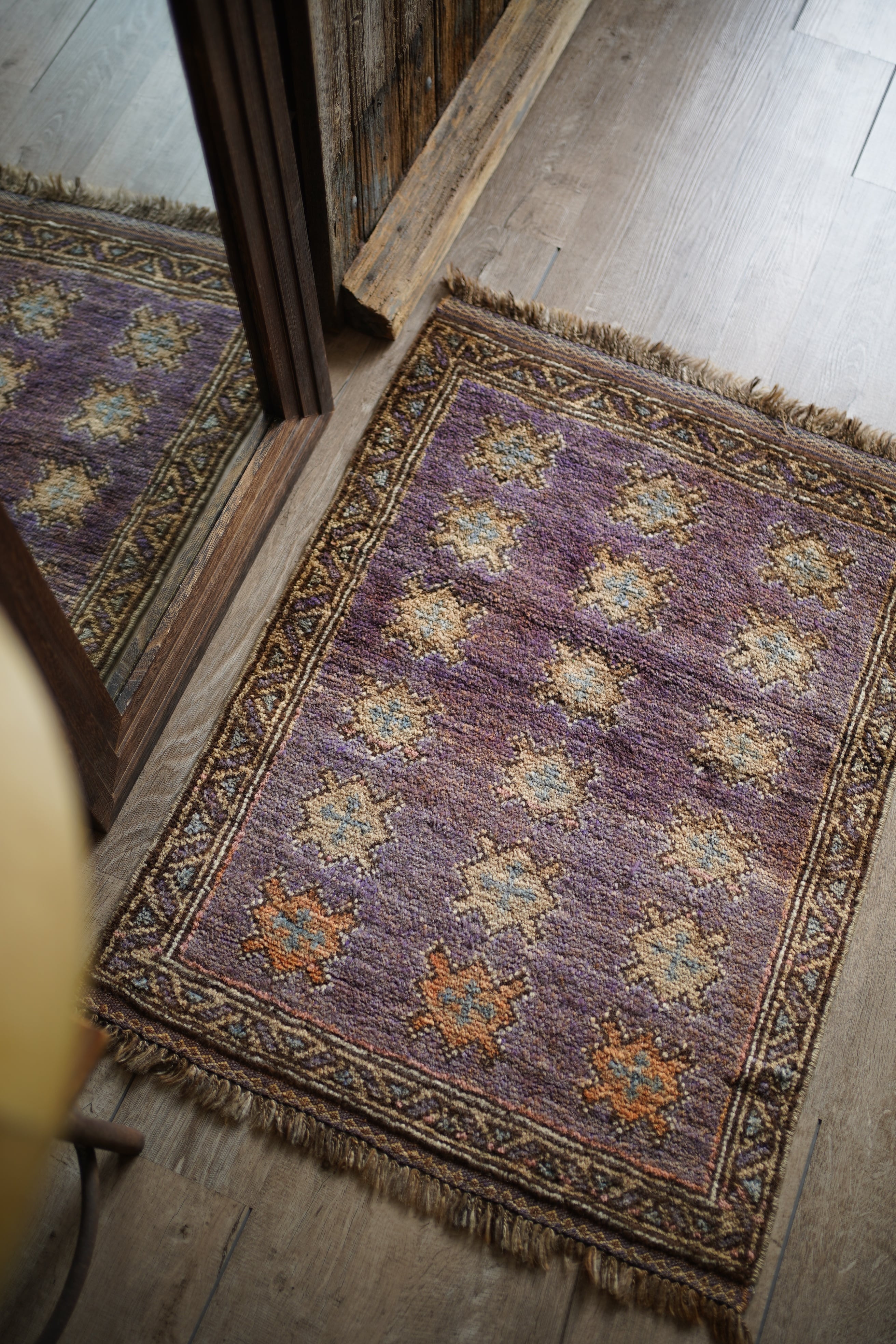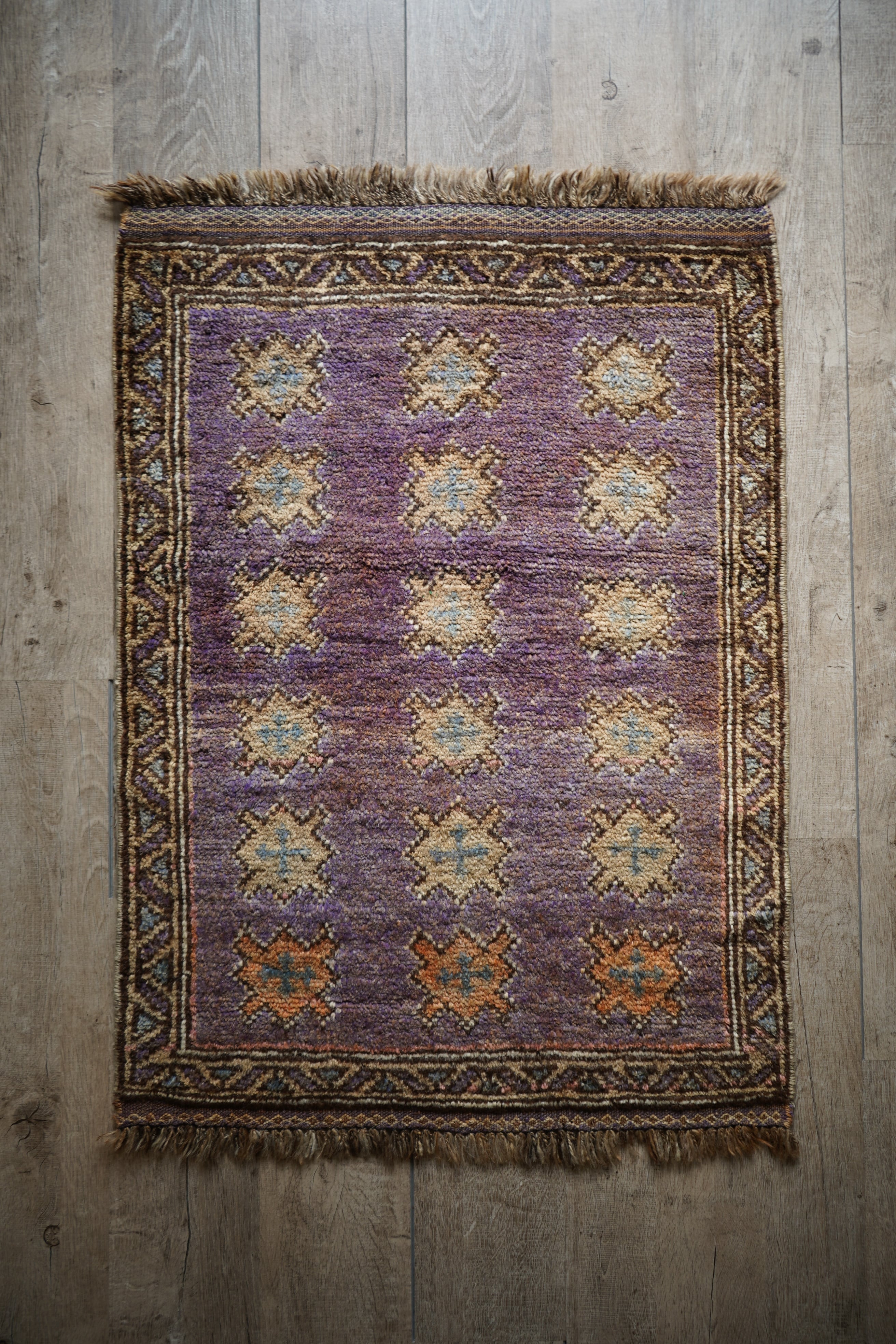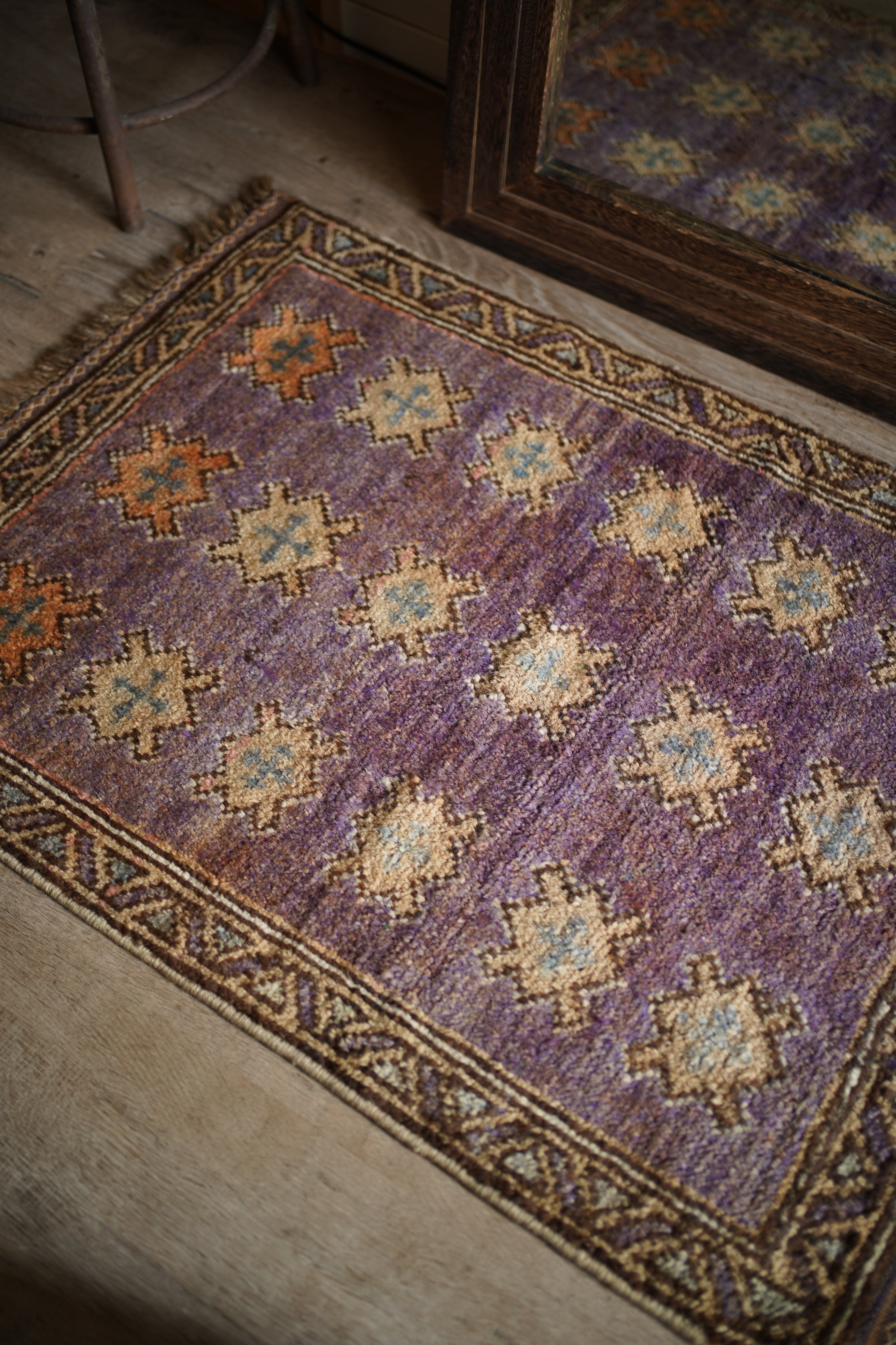 アフガニスタン西部を拠点とするタイマニ族によって、今から約50年前に織られたヴィンテージラグです。とても珍しい藤色(ライラック)のような柔らかな色合いが目を惹き、そこに淡いオレンジ、ベージュ、ブラウンがほどよく調和した雰囲気のある一枚。フリンジ部分はキリムエンドの作りとなっています。表面はふわっとした優しいタッチで、踏んだときの柔らかい質感が心地よいです。厚みはおよそ8mm程度。目立つダメージもなく大変良好なコンディションです。玄関はもちろん、洗面スペース、ラック前、ワークスペースなど、さまざまな場所で取り入れやすい万能サイズ。お部屋にそっと彩りと温もりを添えてくれる上品な配色の一枚です。