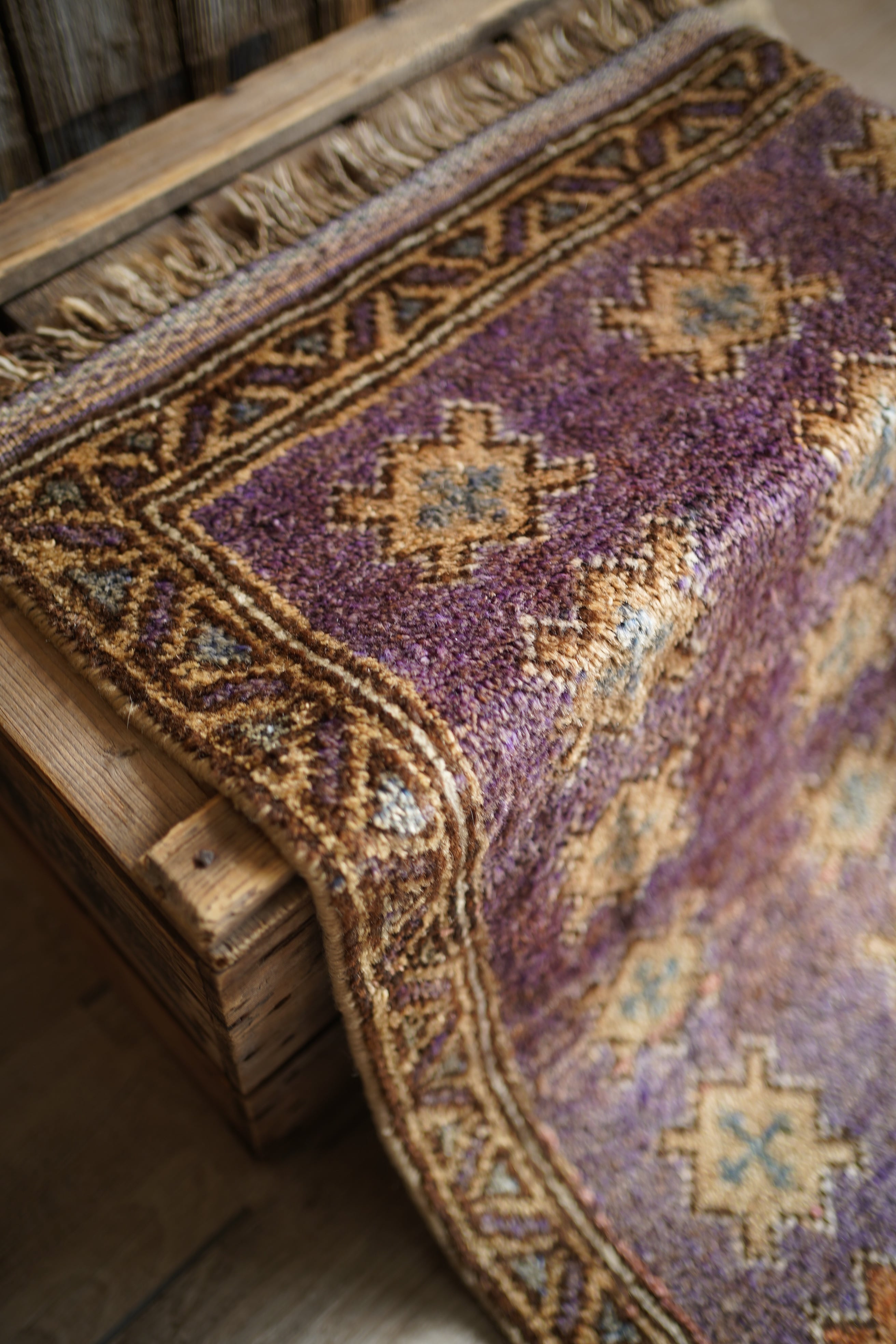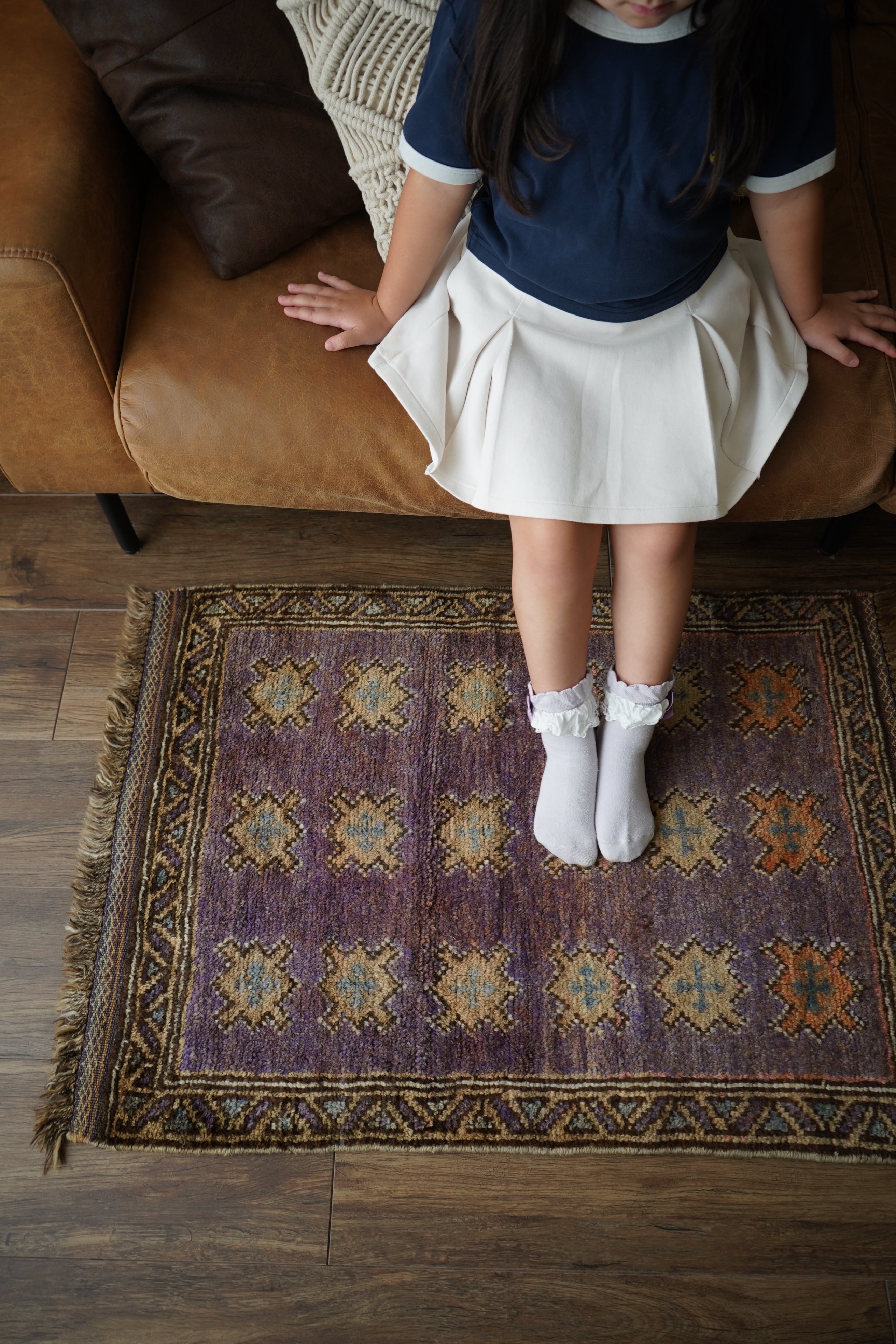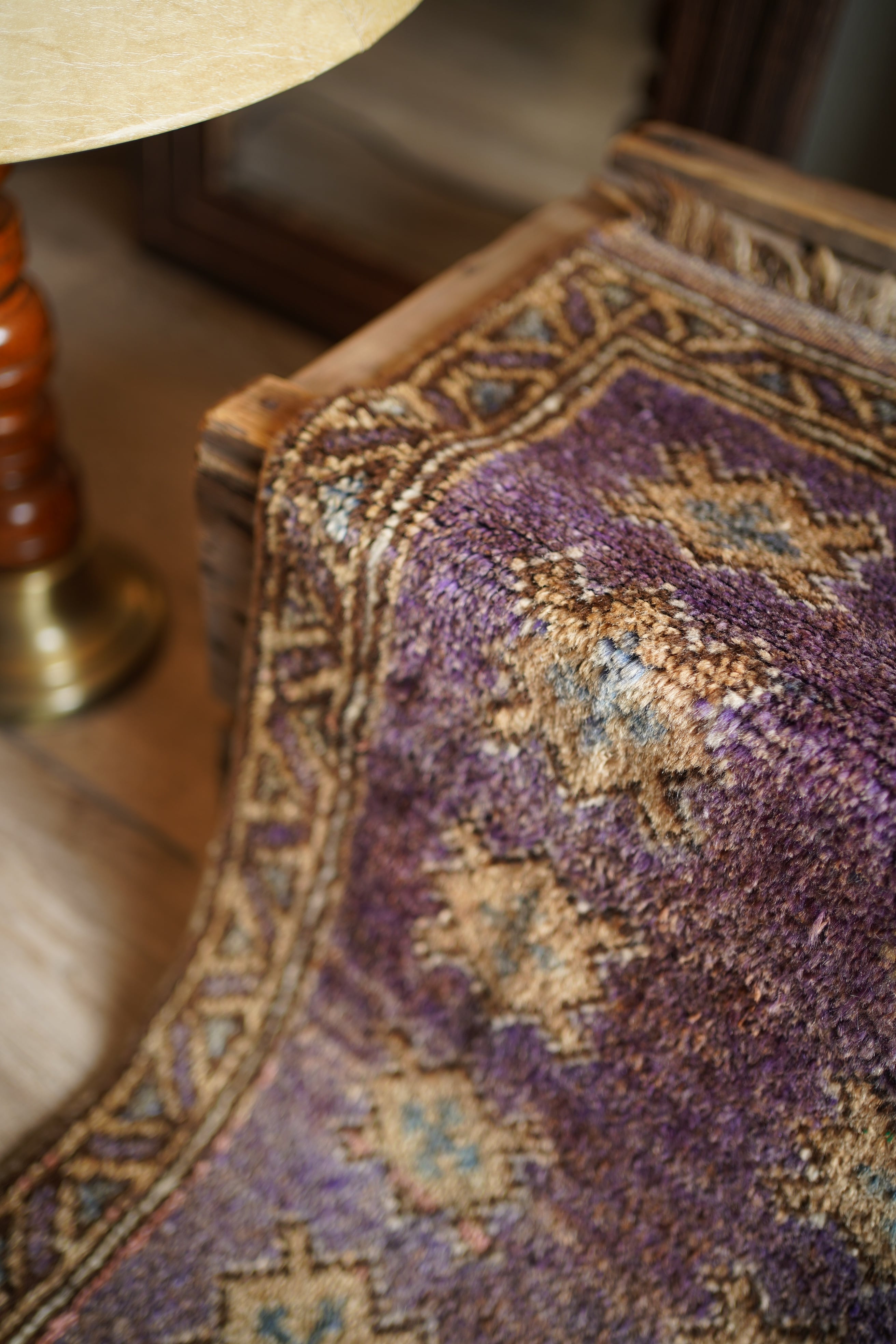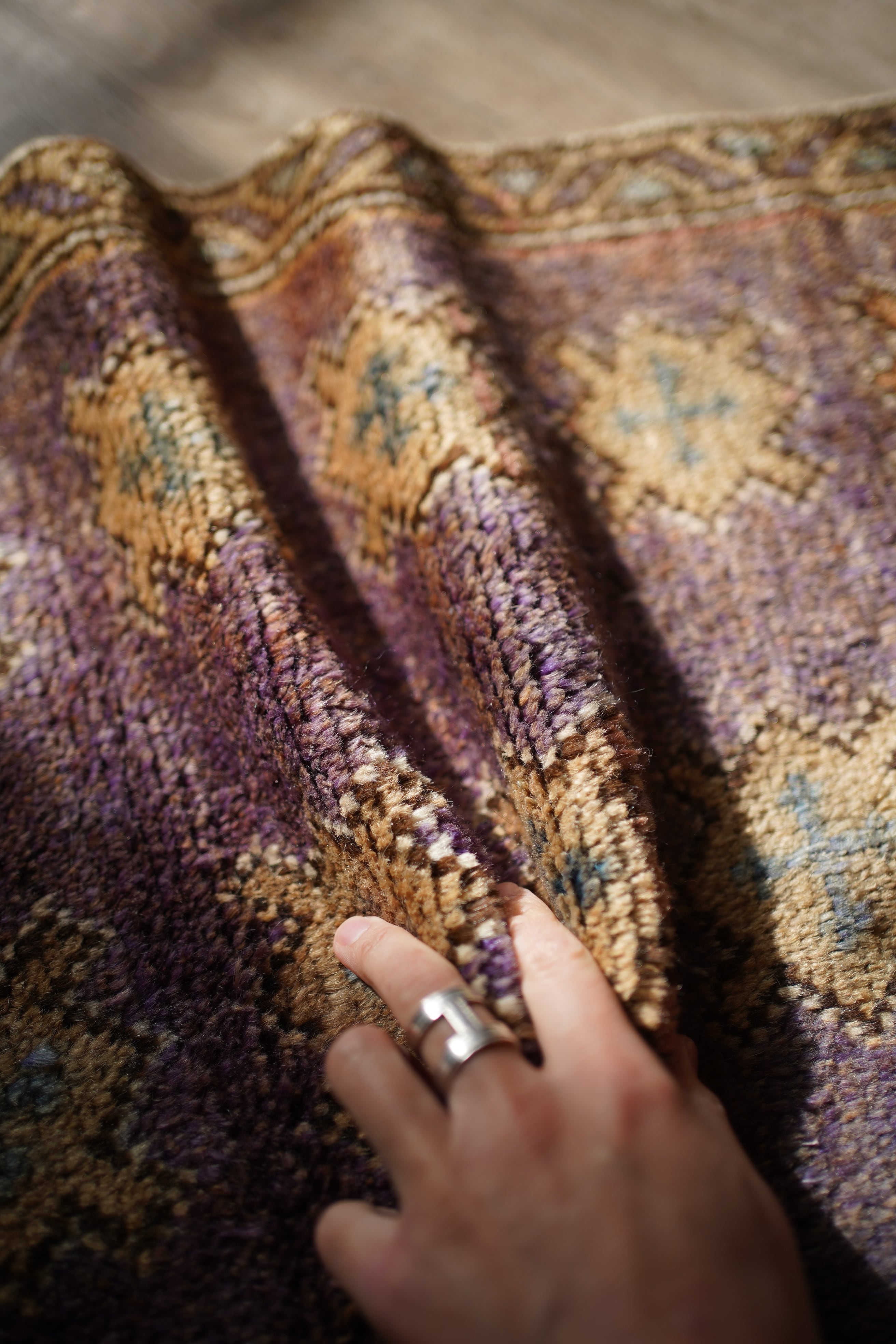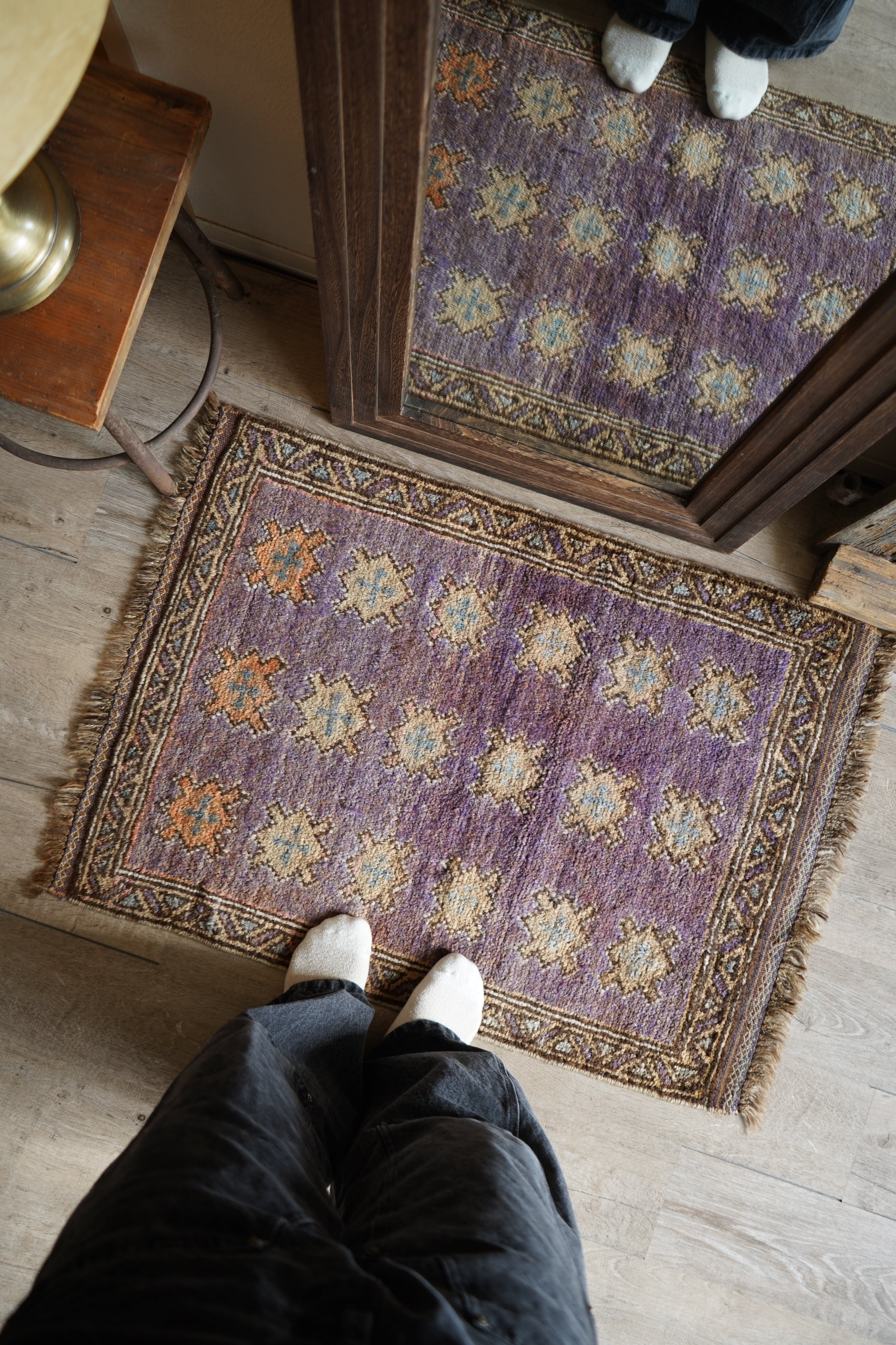 アフガニスタン西部を拠点とするタイマニ族によって、今から約50年前に織られたヴィンテージラグです。とても珍しい藤色(ライラック)のような柔らかな色合いが目を惹き、そこに淡いオレンジ、ベージュ、ブラウンがほどよく調和した雰囲気のある一枚。フリンジ部分はキリムエンドの作りとなっています。表面はふわっとした優しいタッチで、踏んだときの柔らかい質感が心地よいです。厚みはおよそ8mm程度。目立つダメージもなく大変良好なコンディションです。玄関はもちろん、洗面スペース、ラック前、ワークスペースなど、さまざまな場所で取り入れやすい万能サイズ。お部屋にそっと彩りと温もりを添えてくれる上品な配色の一枚です。